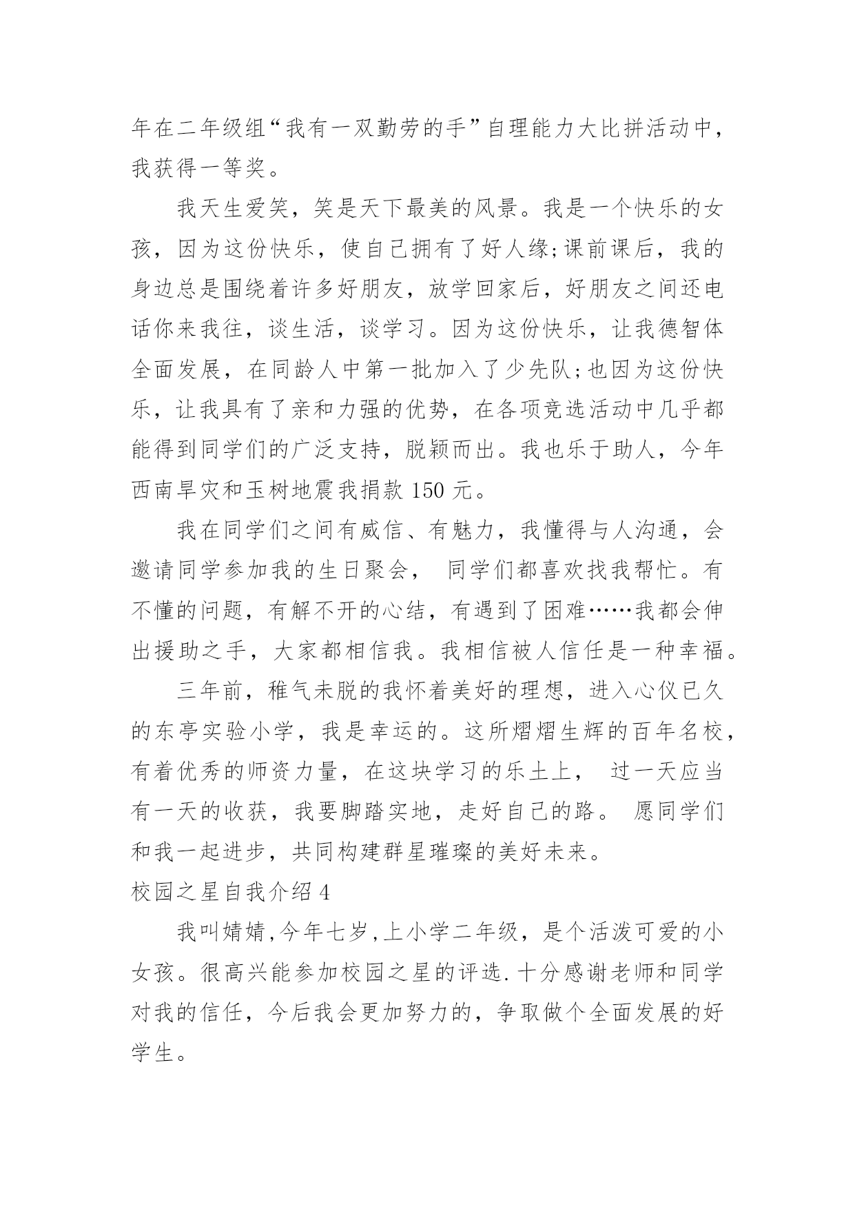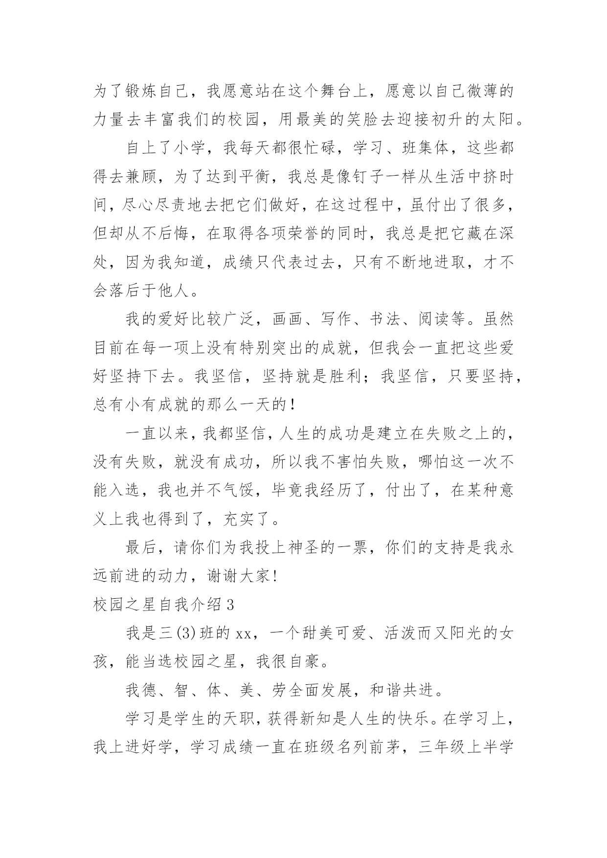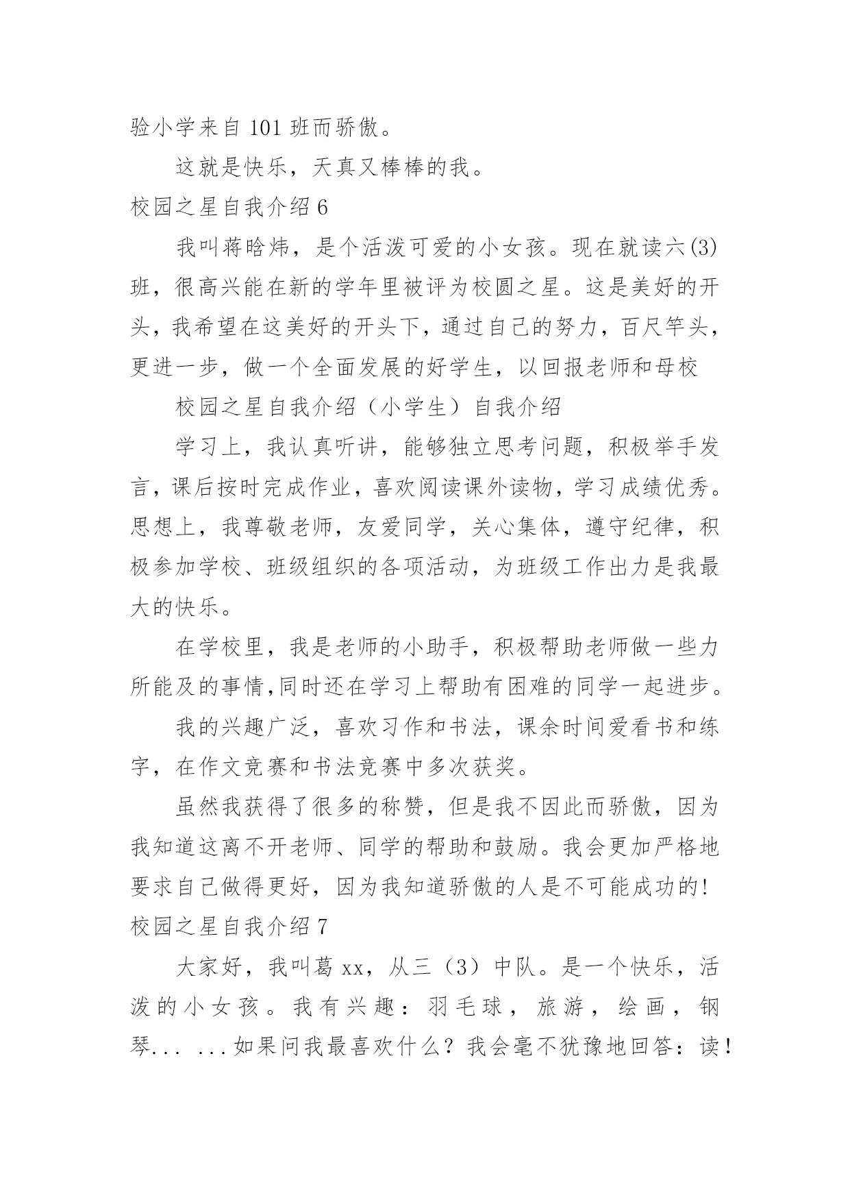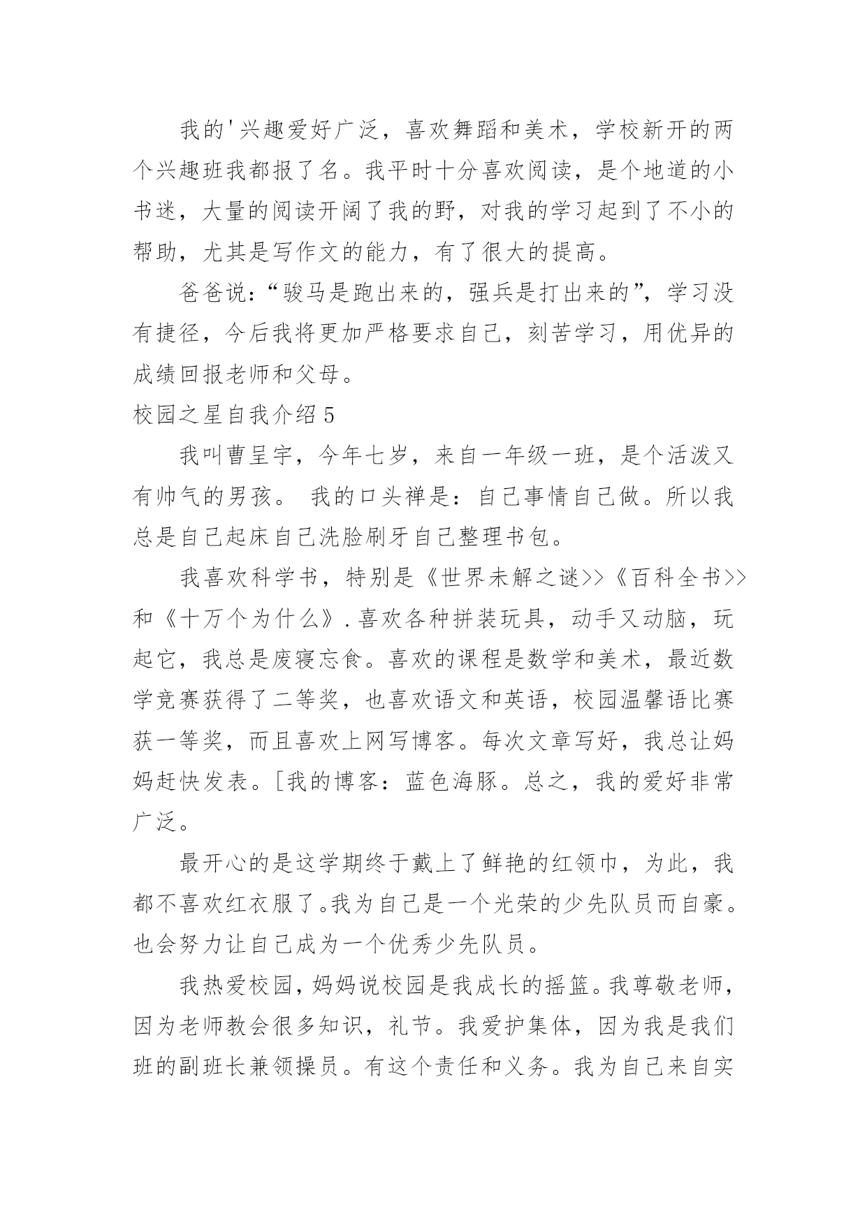 校园之星自我介绍校园之星自我介绍当我们在一个新环境中,我们有必要对自己进行适当的介绍,自我介绍是认识自我的手段。如何写出一个与众不同的自我介绍?下面是小编精心整理的校园之星自我介绍,欢迎大家分享。校园之星自我介绍1我叫康雨欣,是一(3)班学生,在学校,能够坚持遵守学校的校纪校规,看到地上有垃圾我自觉的捡起来。见到老师,我也会主动问好。下课期间,不追逐不打闹。团结同学,热心帮助学习上有困难的同学,很有同情心、有爱心,在学习上苦下功夫,上课认真听讲,积极举手发言,不懂就问。回到家,主动帮助父母干家务,认真、独立完成家庭作业,还坚持读书,坚持自己的事情自己做,并坚持做好。校园之星自我介绍2尊敬的各位领导、老师,亲爱的同学们:大家好!我是来自六(1)班的崔雨馨同学,今年我11岁了。这次有幸参加校园之星的竞选活动,承载着老师的期望和同学们的支持,虽然我并不是所有学生中最优秀的一个,但我有一颗积极向上、热情奉献的心,为了班集体的荣誉,为了锻炼自己,我愿意站在这个舞台上,愿意以自己微薄的力量去丰富我们的校园,用最美的笑脸去迎接初升的太阳。自上了小学,我每天都很忙碌,学习、班集体,这些都得去兼顾,为了达到平衡,我总是像钉子一样从生活中挤时间,尽心尽责地去把它们做好,在这过程中,虽付出了很多,但却从不后悔,在取得各项荣誉的同时,我总是把它藏在深处,因为我知道,成绩只代表过去,只有不断地进取,才不会落后于他人。我的爱好比较广泛,画画、写作、书法、阅读等。虽然目前在每一项上没有特别突出的成就,但我会一直把这些爱好坚持下去。我坚信,坚持就是胜利;我坚信,只要坚持,总有小有成就的那么一天的!一直以来,我都坚信,人生的成功是建立在失败之上的,没有失败,就没有成功,所以我不害怕失败,哪怕这一次不能入选,我也并不气馁,毕竟我经历了,付出了,在某种意义上我也得到了,充实了。最后,请你们为我投上神圣的一票,你们的支持是我永远前进的动力,谢谢大家!校园之星自我介绍3我是三(3)班的xx,一个甜美可爱、活泼而又阳光的女孩,能当选校园之星,我很自豪。我德、智、体、美、劳全面发展,和谐共进。学习是学生的天职,获得新知是人生的快乐。在学习上,我上进好学,学习成绩一直在班级名列前茅,三年级上半学期期末考试,总分班级第一名。作为班级的英语课代表,我对英语厚爱三分,在xx市东亭辅导区第四届英语节一分钟说单词比赛中,我获得一等奖。我还获得过“本月优秀生”、“班级进步奖”、口算比赛班级一等奖、学校“口算小能手”以及多次被评为班级的“学习之星”、“三好学生”。在雏鹰争章活动中,我目前已获11枚章,其中星星章4枚,鲁迅章4枚,刘翔章1枚,贝多芬章1枚,章1枚。腹有诗书气自华。作为小学生,亲近母语很重要,书籍已成为我进步的阶梯,捧书默诵是我最美表情。广泛的阅读开阔了我的视野,提高了我的写作水平。学校网站也发表了《玉树地震感想》、《天上的“笑脸”》《音乐喷泉》等我的作品。我订阅了《幽默小读者》、《科普世界》等杂志。每月我都期盼它们快点到来,因为那是我可口的知识食粮。在第十五届校园读书节“成语书画比赛”中,我荣获优秀创意奖。我还喜欢在我的QQ空间里写点文章。作为一名大队委,我注重仪容仪表,圆圆的小脸蛋上,眼睛里总是装满浅浅的笑意。大方、得体的仪表让我成为了一名升旗仪式手。在庄重的升旗仪式上,在全校师生的目光中,望着国旗在晨光中徐徐升起,心中便油然产生一种自豪感,也默默感受到一份责任。作为一名大队委,我也获得了更多的锻炼机会,让我具有比较强的组织策划能力,班级的每期黑板报是我精心主编、主画、主创。我的成长离不开体育,离不开美育。我参加学校过跳绳,踢毽子比赛,虽然没获得名次,但我重在参与,赛后仍勤练不辍。现在跳绳会跳双蹦蹦,毽子踢得上下翻飞。东亭市民广场运动区留下了我攀援云梯的矫健身影,体育强健了我的体魄,更磨练了我的意志,让我在学习和生活中不怕困难,争先创优。我家有一台美国进口的Baldwin品牌钢琴,学钢琴的我,受音乐的熏陶,是一个浪漫,有激情和热情的女孩。我会弹奏《湖上天鹅》、《钟》、《蓝鸟》等曲子,每当我坐在钢琴边,就像融入了另一个世界,我在行云流水般的音符里畅游,尽情的、自由的、快乐的在琴音的怀抱中甘甜休憩。书画方面,我在学校举行的“快乐的校园”儿童画比赛中获得二年级组一等奖。还获得了硬笔书法水平等级一级证书。学校的舞蹈、合唱、朗诵、英文小星星等场合都能看到我活跃的身影。我最喜欢跳舞:我有柔美的身段,有亮丽的双眸,有似水的梦怀,在校外又学过民族舞,跳舞自有甜美风格。作为一名少先队员,我曾组织过“绿色环保活动”,以组长的身份,用最朴实的行动实践文明。在学校“文明礼仪伴我行”活动中,我被评为“文明小标兵”。班级擦讲台,一份小小的责任,我一直坚守了2年,就因为劳动快乐了自己。因此我被评为