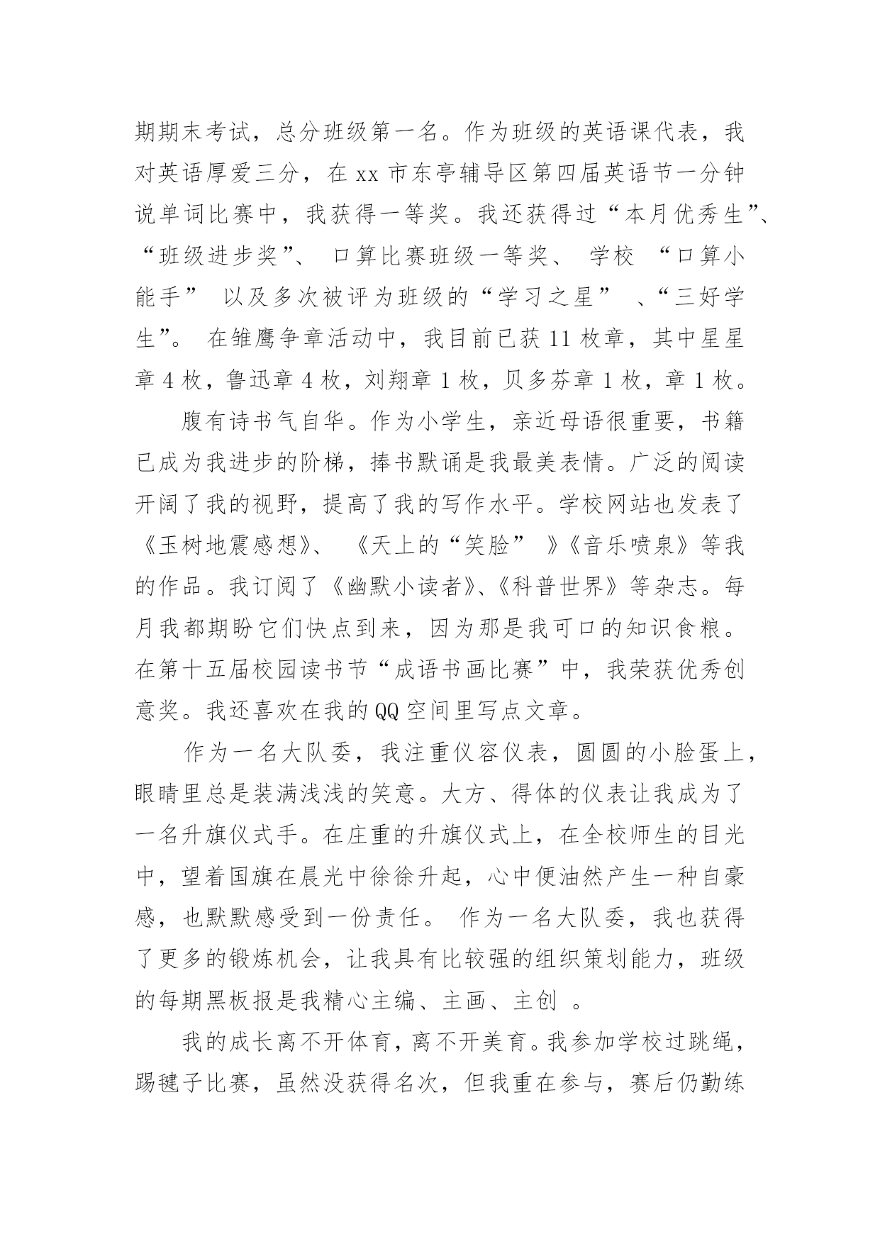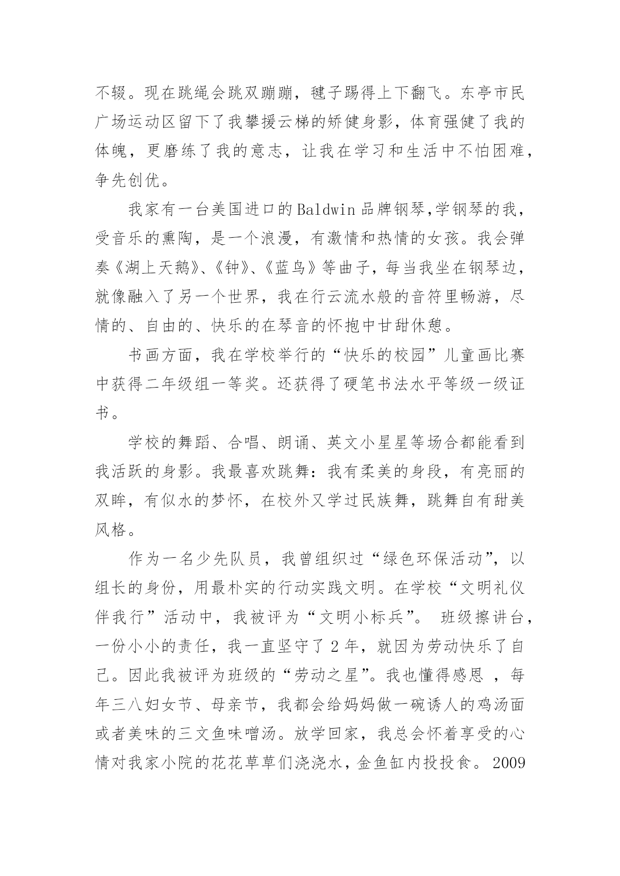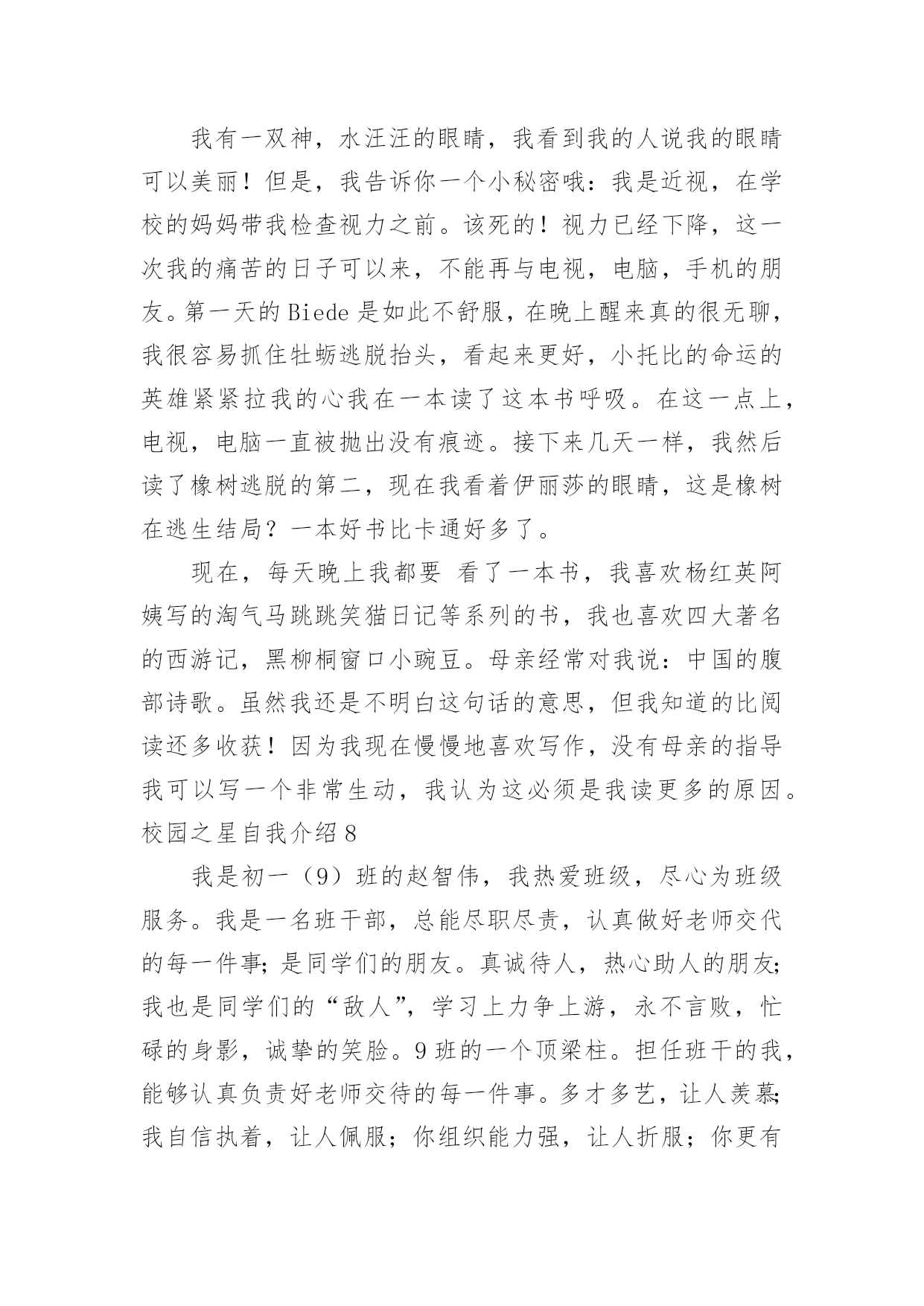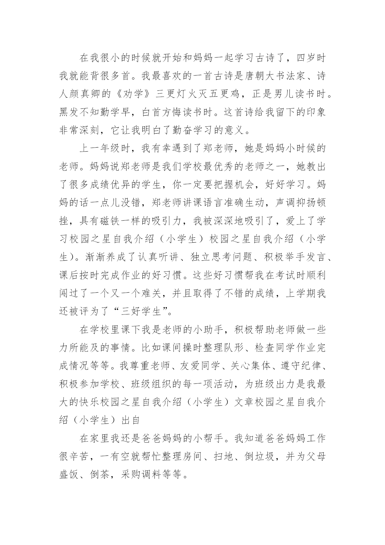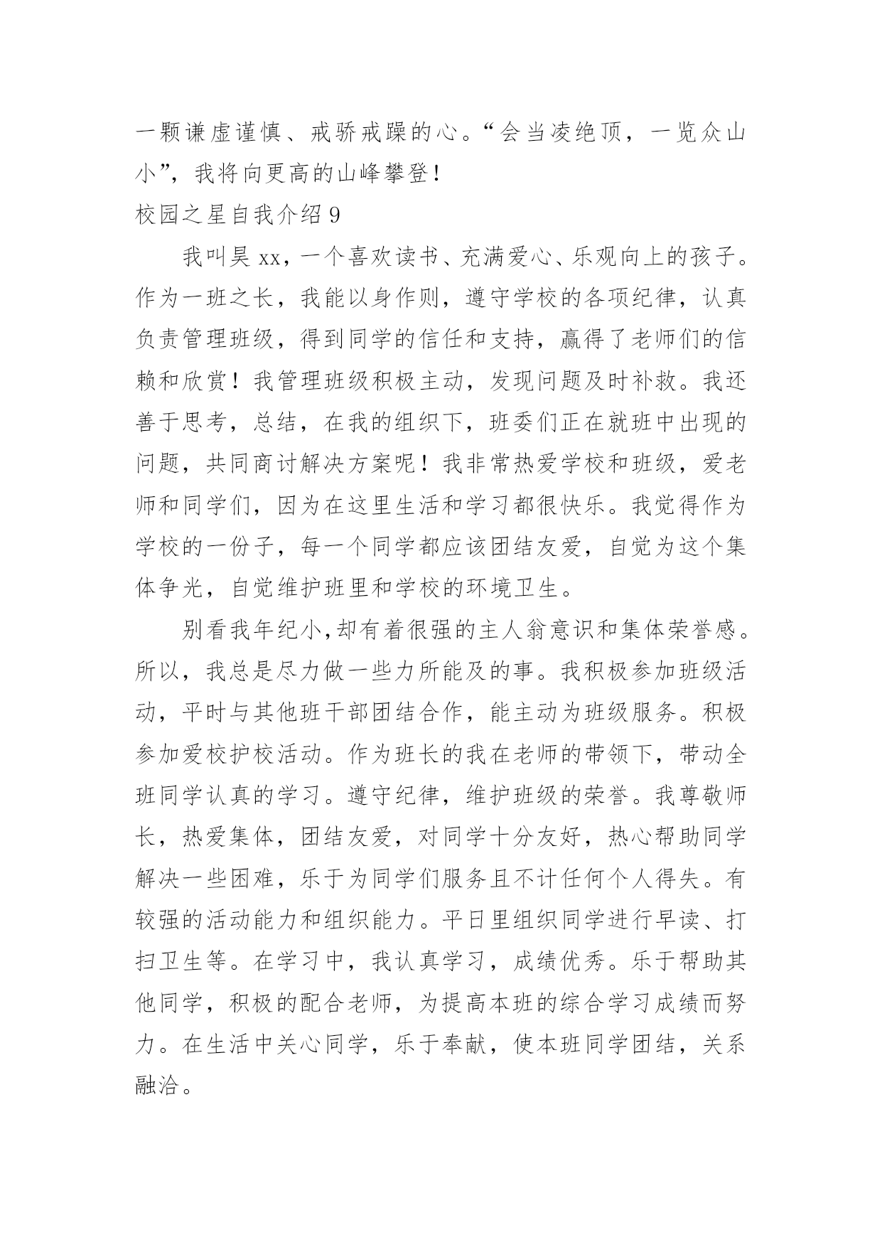 校园之星自我介绍校园之星自我介绍当我们在一个新环境中,我们有必要对自己进行适当的介绍,自我介绍是认识自我的手段。如何写出一个与众不同的自我介绍?下面是小编精心整理的校园之星自我介绍,欢迎大家分享。校园之星自我介绍1我叫康雨欣,是一(3)班学生,在学校,能够坚持遵守学校的校纪校规,看到地上有垃圾我自觉的捡起来。见到老师,我也会主动问好。下课期间,不追逐不打闹。团结同学,热心帮助学习上有困难的同学,很有同情心、有爱心,在学习上苦下功夫,上课认真听讲,积极举手发言,不懂就问。回到家,主动帮助父母干家务,认真、独立完成家庭作业,还坚持读书,坚持自己的事情自己做,并坚持做好。校园之星自我介绍2尊敬的各位领导、老师,亲爱的同学们:大家好!我是来自六(1)班的崔雨馨同学,今年我11岁了。这次有幸参加校园之星的竞选活动,承载着老师的期望和同学们的支持,虽然我并不是所有学生中最优秀的一个,但我有一颗积极向上、热情奉献的心,为了班集体的荣誉,为了锻炼自己,我愿意站在这个舞台上,愿意以自己微薄的力量去丰富我们的校园,用最美的笑脸去迎接初升的太阳。自上了小学,我每天都很忙碌,学习、班集体,这些都得去兼顾,为了达到平衡,我总是像钉子一样从生活中挤时间,尽心尽责地去把它们做好,在这过程中,虽付出了很多,但却从不后悔,在取得各项荣誉的同时,我总是把它藏在深处,因为我知道,成绩只代表过去,只有不断地进取,才不会落后于他人。我的爱好比较广泛,画画、写作、书法、阅读等。虽然目前在每一项上没有特别突出的成就,但我会一直把这些爱好坚持下去。我坚信,坚持就是胜利;我坚信,只要坚持,总有小有成就的那么一天的!一直以来,我都坚信,人生的成功是建立在失败之上的,没有失败,就没有成功,所以我不害怕失败,哪怕这一次不能入选,我也并不气馁,毕竟我经历了,付出了,在某种意义上我也得到了,充实了。最后,请你们为我投上神圣的一票,你们的支持是我永远前进的动力,谢谢大家!校园之星自我介绍3我是三(3)班的xx,一个甜美可爱、活泼而又阳光的女孩,能当选校园之星,我很自豪。我德、智、体、美、劳全面发展,和谐共进。学习是学生的天职,获得新知是人生的快乐。在学习上,我上进好学,学习成绩一直在班级名列前茅,三年级上半学期期末考试,总分班级第一名。作为班级的英语课代表,我对英语厚爱三分,在xx市东亭辅导区第四届英语节一分钟说单词比赛中,我获得一等奖。我还获得过“本月优秀生”、“班级进步奖”、口算比赛班级一等奖、学校“口算小能手”以及多次被评为班级的“学习之星”、“三好学生”。在雏鹰争章活动中,我目前已获11枚章,其中星星章4枚,鲁迅章4枚,刘翔章1枚,贝多芬章1枚,章1枚。腹有诗书气自华。作为小学生,亲近母语很重要,书籍已成为我进步的阶梯,捧书默诵是我最美表情。广泛的阅读开阔了我的视野,提高了我的写作水平。学校网站也发表了《玉树地震感想》、《天上的“笑脸”》《音乐喷泉》等我的作品。我订阅了《幽默小读者》、《科普世界》等杂志。每月我都期盼它们快点到来,因为那是我可口的知识食粮。在第十五届校园读书节“成语书画比赛”中,我荣获优秀创意奖。我还喜欢在我的QQ空间里写点文章。作为一名大队委,我注重仪容仪表,圆圆的小脸蛋上,眼睛里总是装满浅浅的笑意。大方、得体的仪表让我成为了一名升旗仪式手。在庄重的升旗仪式上,在全校师生的目光中,望着国旗在晨光中徐徐升起,心中便油然产生一种自豪感,也默默感受到一份责任。作为一名大队委,我也获得了更多的锻炼机会,让我具有比较强的组织策划能力,班级的每期黑板报是我精心主编、主画、主创。我的成长离不开体育,离不开美育。我参加学校过跳绳,踢毽子比赛,虽然没获得名次,但我重在参与,赛后仍勤练不辍。现在跳绳会跳双蹦蹦,毽子踢得上下翻飞。东亭市民广场运动区留下了我攀援云梯的矫健身影,体育强健了我的体魄,更磨练了我的意志,让我在学习和生活中不怕困难,争先创优。我家有一台美国进口的Baldwin品牌钢琴,学钢琴的我,受音乐的熏陶,是一个浪漫,有激情和热情的女孩。我会弹奏《湖上天鹅》、《钟》、《蓝鸟》等曲子,每当我坐在钢琴边,就像融入了另一个世界,我在行云流水般的音符里畅游,尽情的、自由的、快乐的在琴音的怀抱中甘甜休憩。书画方面,我在学校举行的“快乐的校园”儿童画比赛中获得二年级组一等奖。还获得了硬笔书法水平等级一级证书。学校的舞蹈、合唱、朗诵、英文小星星等场合都能看到我活跃的身影。我最喜欢跳舞:我有柔美的身段,有亮丽的双眸,有似水的梦怀,在校外又学过民族舞,跳舞自有甜美风格。作为一名少先队员,我曾组织过“绿色环保活动”,以组长的身份,用最朴实的行动实践文明。在学校“文明礼仪伴我行”活动中,我被评为“文明小标兵”。班级擦讲台,一份小小的责任,我一直坚守了2年,就因为劳动快乐了自己。因此我被评为
