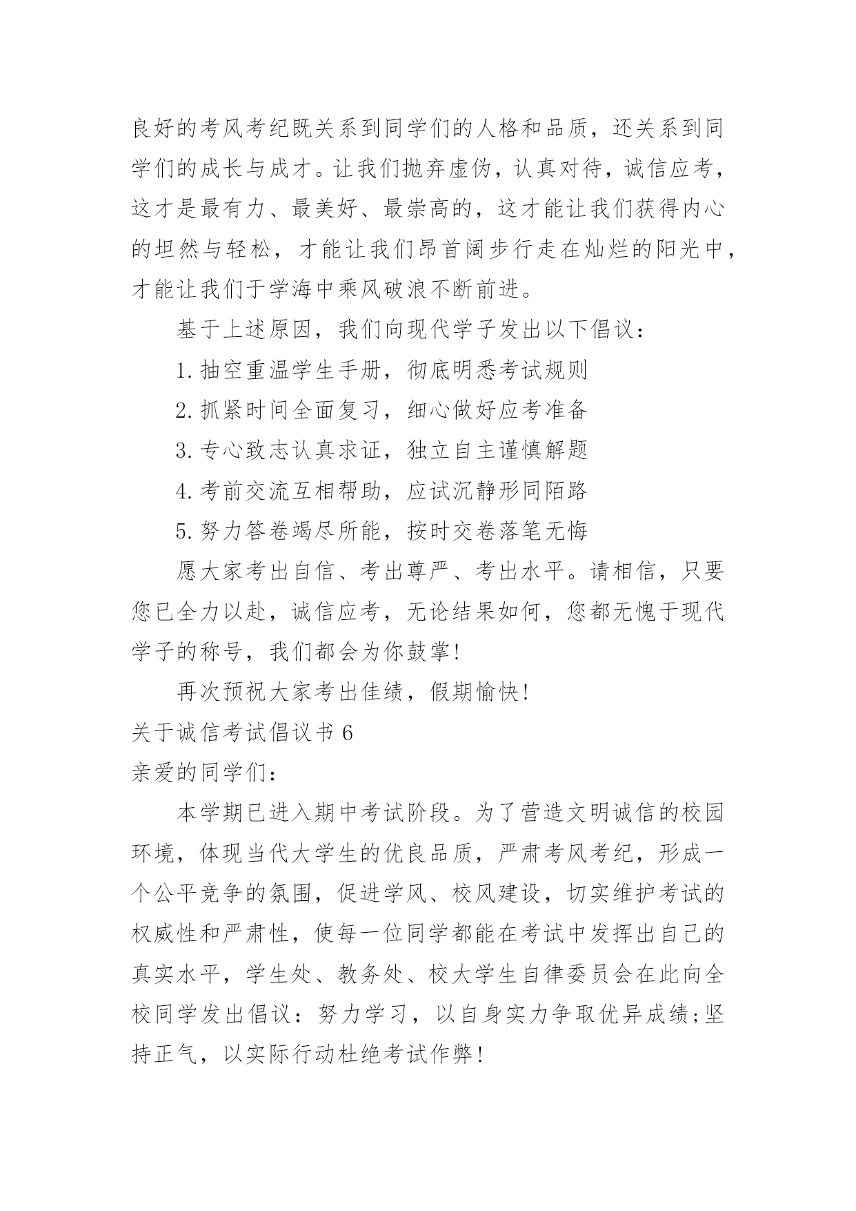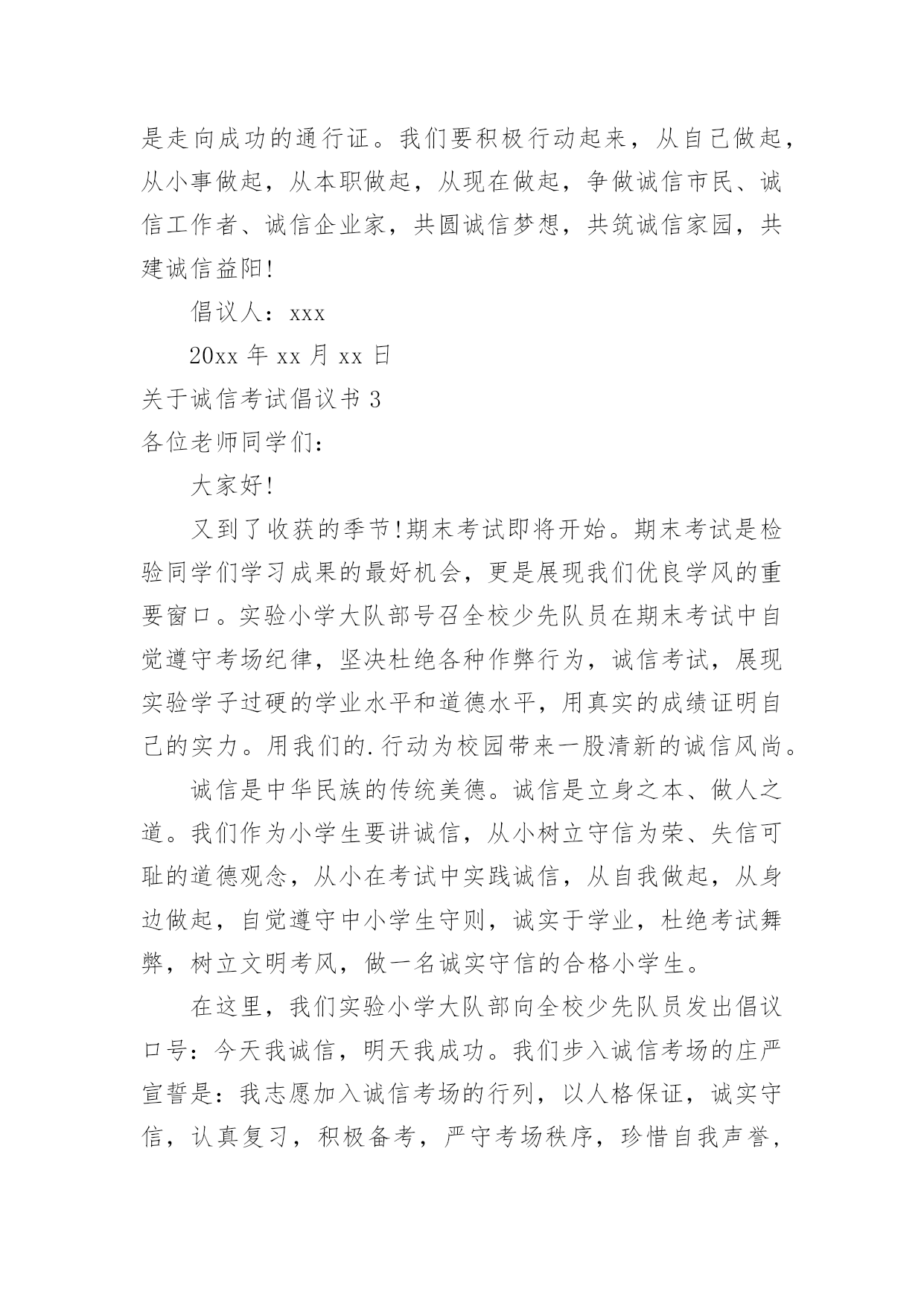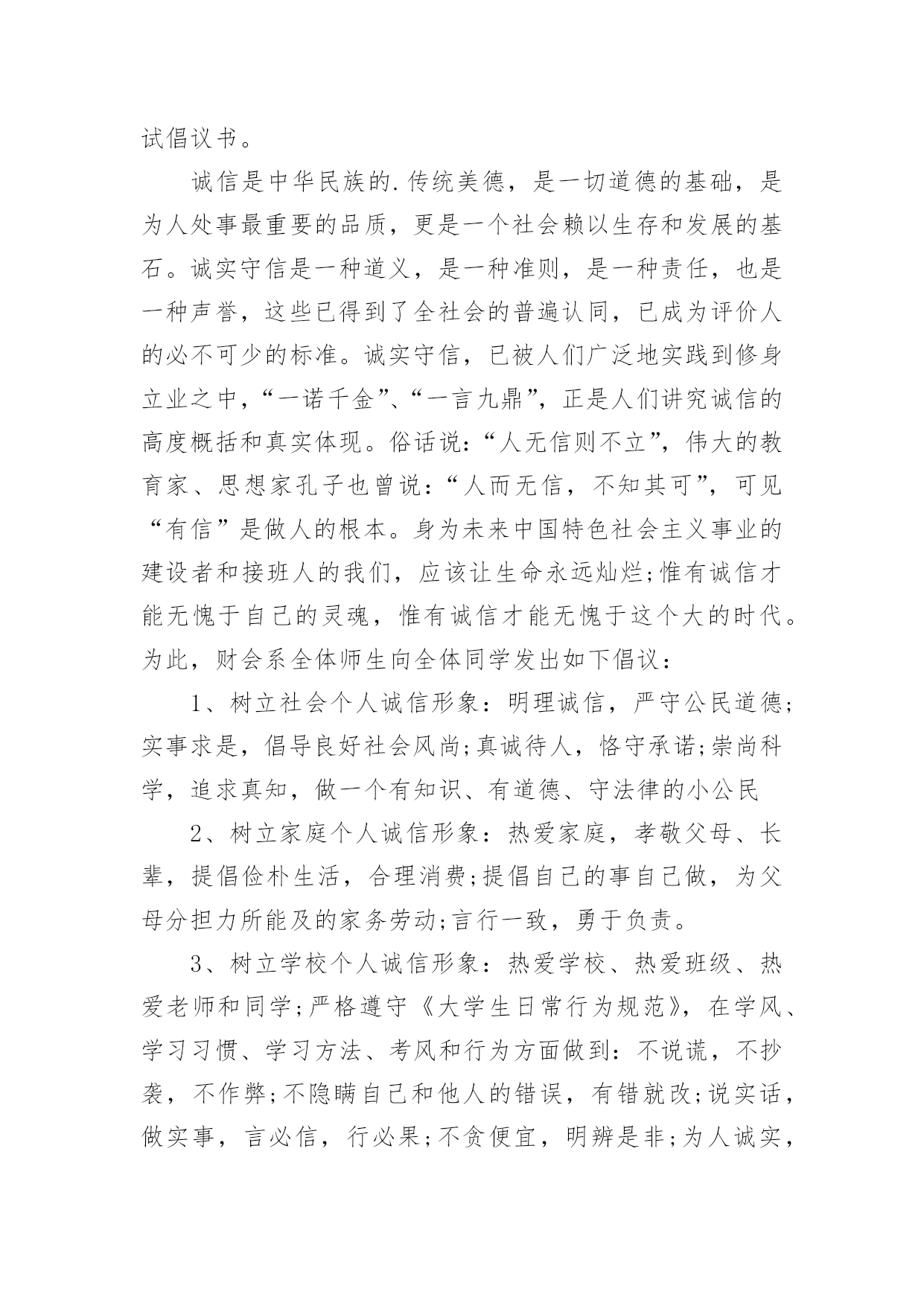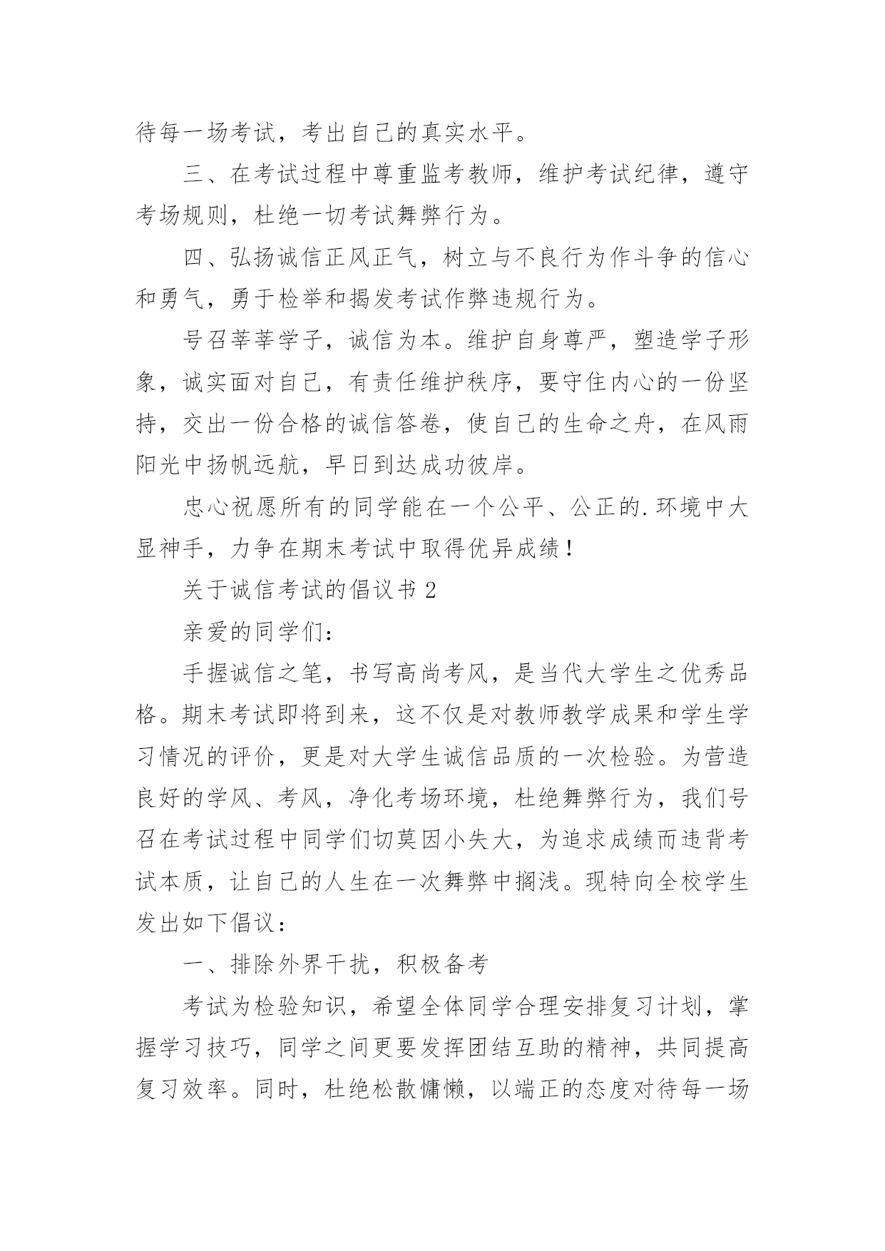 诚信考试倡议书关于诚信考试倡议书(精选15篇)随着社会一步步向前发展,用到倡议书的地方越来越多,通过倡议书倡议者可以更好地申明发布倡议的目的。倡议书的注意事项有许多,你确定会写吗?以下是小编为大家收集的关于诚信考试倡议书,欢迎大家分享。关于诚信考试倡议书1亲爱的同学们:孟子有云:“车无辕而不行,人无信则不立”。诚信不仅是一种品行,更是一种责任;不仅是一种道义,更是一个准则;不仅是一种声誉,更是一种资源。就个人而言,诚实更是高尚的人格力量。诚实、诚信是当代大学生必须具备的优良品质,我们只有具备诚实守信的品德,才能在激烈的社会竞争中立于不败之地。值此期末考试即将开始之际,为树立良好学风,严肃考风考纪,努力创建“三无学院”,积极营造公平公正的考试秩序,使考试得以顺利进行,特向全体同学发出倡议。一、排除各种干扰,端正考试态度,充分利用一切时间,认真复习功课,满怀信心地迎接考试。二、提高自身修养,做一名诚信大学生,以守信之责对待每一场考试,考出自己的真实水平。三、在考试过程中尊重监考教师,维护考试纪律,遵守考场规则,杜绝一切考试舞弊行为。四、弘扬诚信正风正气,树立与不良行为作斗争的信心和勇气,勇于检举和揭发考试作弊违规行为。号召莘莘学子,诚信为本。维护自身尊严,塑造学子形象,诚实面对自己,有责任维护秩序,要守住内心的一份坚持,交出一份合格的诚信答卷,使自己的生命之舟,在风雨阳光中扬帆远航,早日到达成功彼岸。忠心祝愿所有的同学能在一个公平、公正的.环境中大显神手,力争在期末考试中取得优异成绩!关于诚信考试的倡议书2亲爱的同学们:手握诚信之笔,书写高尚考风,是当代大学生之优秀品格。期末考试即将到来,这不仅是对教师教学成果和学生学习情况的评价,更是对大学生诚信品质的一次检验。为营造良好的学风、考风,净化考场环境,杜绝舞弊行为,我们号召在考试过程中同学们切莫因小失大,为追求成绩而违背考试本质,让自己的人生在一次舞弊中搁浅。现特向全校学生发出如下倡议:一、排除外界干扰,积极备考考试为检验知识,希望全体同学合理安排复习计划,掌握学习技巧,同学之间更要发挥团结互助的精神,共同提高复习效率。同时,杜绝松散慵懒,以端正的态度对待每一场考试。二、严守考纪,诚信应考做人在于诚,考试在于真,诚信考试不仅是对自己的信任,也是对他人的尊重。严格遵守考试规章制度,实事求是,不夹带、不抄袭,不携带通讯工具进入考场,不协助他人作弊。请同学们切记:“宁可错的懵懂,也不抄得精准”。三、互相监督,弘扬诚信正义尊重监考老师,自觉维护考场秩序。在考试过程中,若发现其他考生有作弊行为,要敢于检举和揭发。文明考风,从我做起。希望同学们能积极行动起来,响应学校的号召,认真备考,诚信应考;教师们能履行职责,加强考场规范管理。让我们共同营造文明、严谨的考场之风,交出一份合格的诚信答卷。关于诚信考试倡议书2亲爱的市民朋友们:诚者,天之道也;思诚者,人之道也。诚实守信,是中华民族的传统美德,是和谐社会的道德基础,是每个公民的立身之本,更是经济社会赖以生存和发展的基石。国家倡导诚信,社会呼吁诚信,个人需要诚信。在此,我们特向广大市民朋友发出如下倡议:1.树立诚实守信观念,争做“诚信益阳”的倡导者。我们要牢固树立诚信促发展、失信受惩戒的观念,积极宣传倡导诚实守信的良好社会风尚,深入践行尊崇诚信友善的社会主义核心价值观,自觉遵循唯信唯实的行为规范,积极投身社会信用体系建设活动,自觉抵制各种失信行为,共同创造“诚信益阳”的美好愿景。2.弘扬诚实守信精神,争做“诚信益阳”的传播者。我们要以高昂的热情传播诚信理念,以有力的行动弘扬诚实守信精神,爱护自己的信誉,信守自己的承诺,以自己的诚信行为,带动和影响我们的家人和身边的每一位朋友,以诚待人,以信立业,形成人人重信用、个个讲诚信的社会氛围和信用环境,共同缔造“诚信益阳”的美好文化。3.坚守诚实守信信仰,争做“诚信益阳”的践行者。我们要通过身边的点滴行为捍卫诚实守信信仰,珍爱自己的'信用记录,不小看一次银行卡逾期、一次按揭贷款未还、一次水电气欠费等失信行为。良好的信用记录比金钱还珍贵!“一个人最大的破产是信用破产,哪怕是一无所有,只要信用还在,就有翻身的本金”!让我们携起手来,共同塑造“诚信益阳”的美好形象。4.规范诚实守信行为,争做“诚信益阳”的建设者。我们要讲诚信话,办诚信事,做诚信人。在工作中做到诚信处事、诚信立业,反对营私舞弊、欺上瞒下;在生活中做到真诚待人、恪守承诺,反对虚情假意、背信弃义;在学习中做到脚踏实地、求实进取,反对形式主义、弄虚作假;在商务活动中做到守合同重信用、恪守不渝,反对言而无信、见利忘义,共同打造“诚信益阳”的美好环境。千里始足下,高山起微尘。珍爱信用记录,享受幸福人生。朋友们,诚信是人生的航标,是我们的第二张身份证,是走向