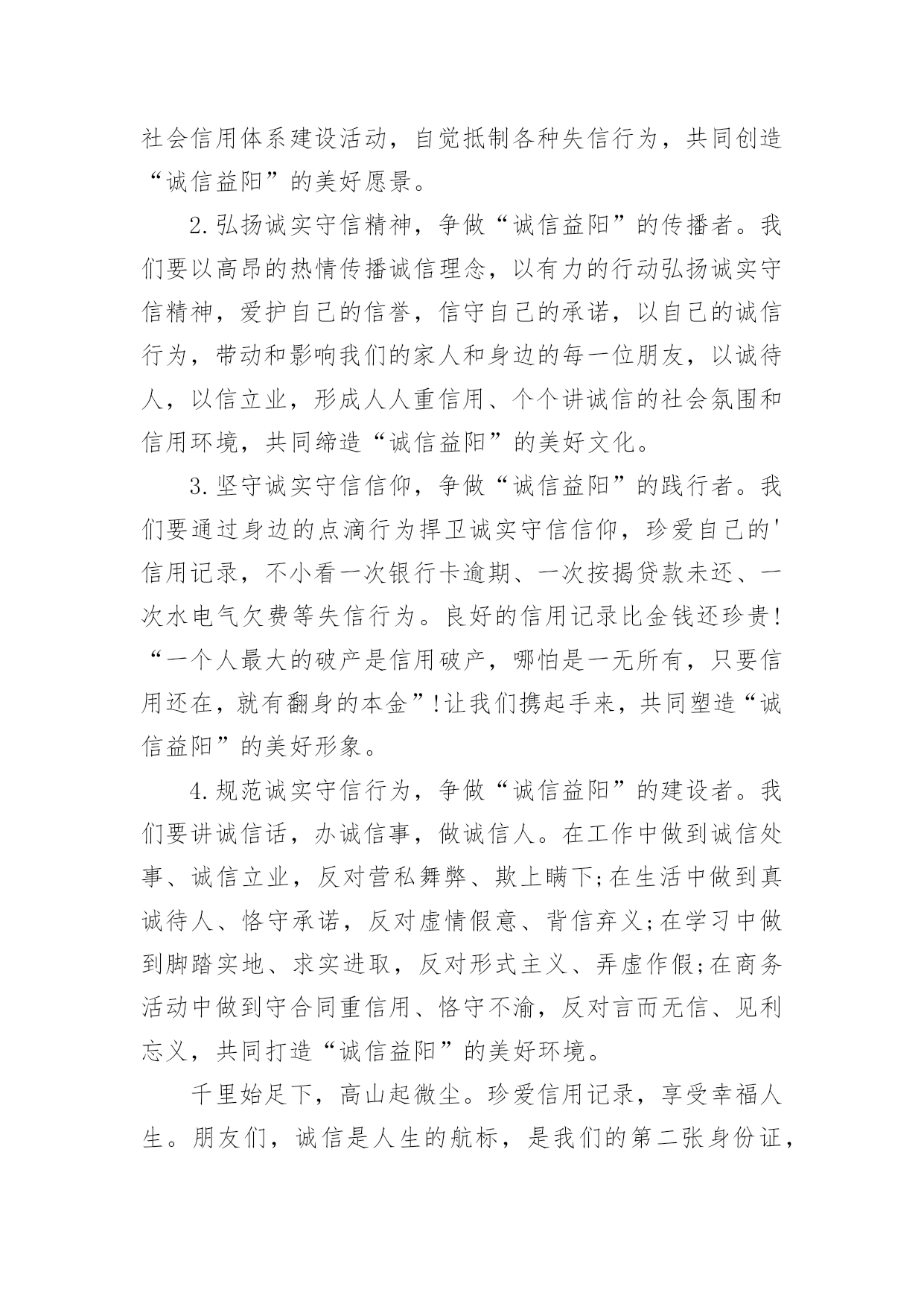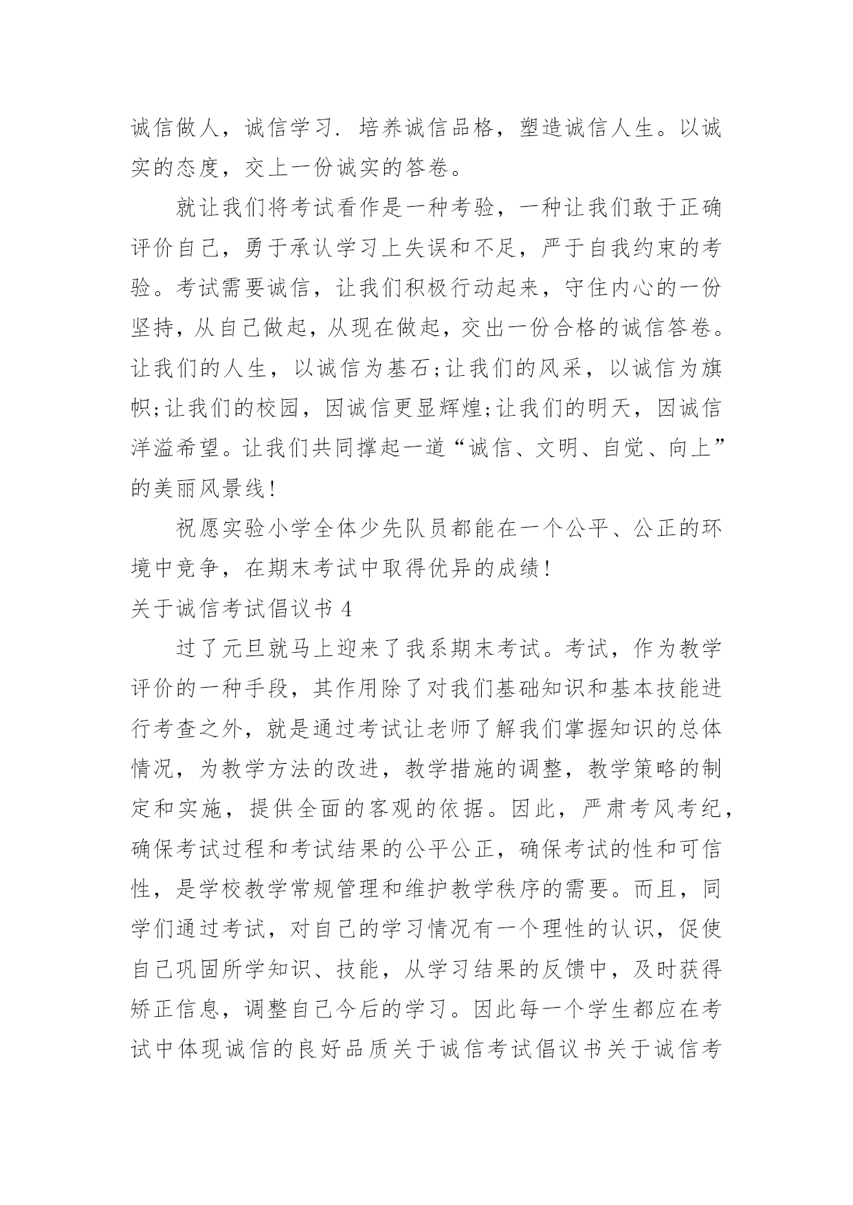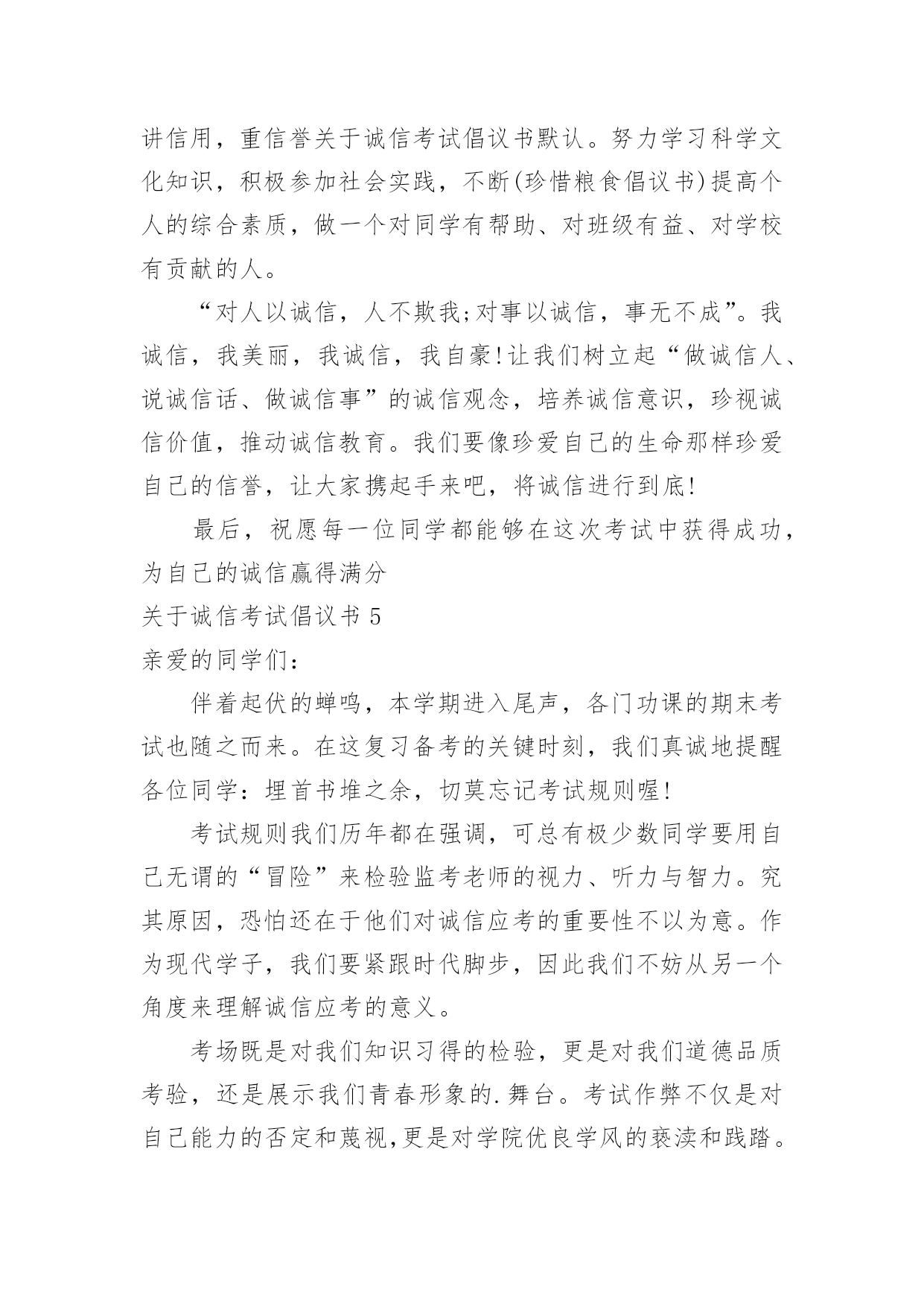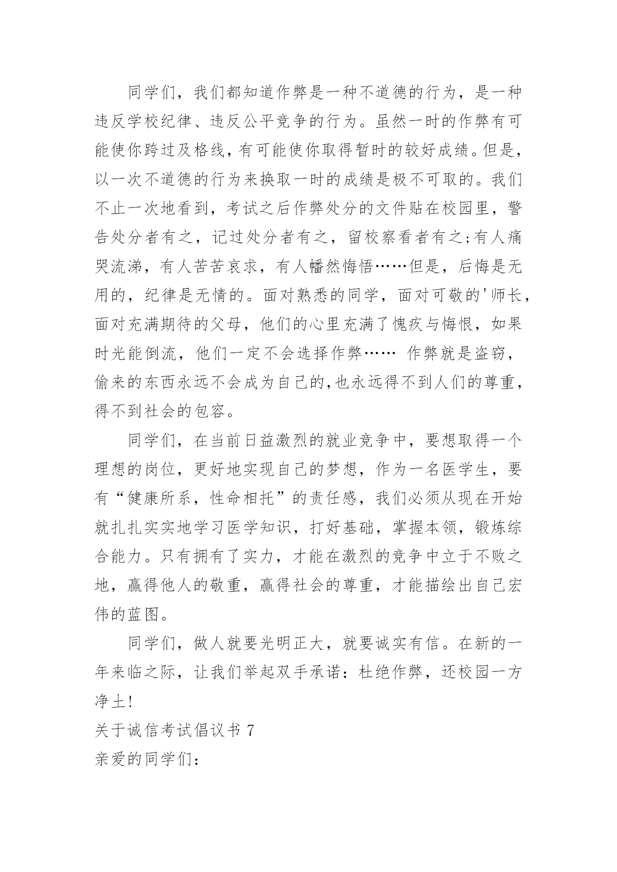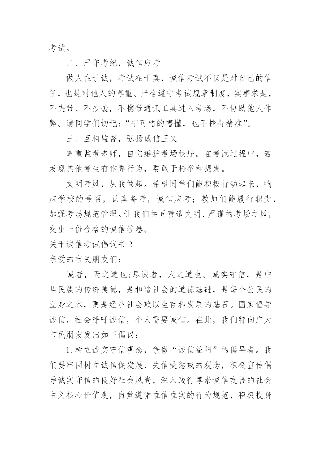 诚信考试倡议书关于诚信考试倡议书(精选15篇)随着社会一步步向前发展,用到倡议书的地方越来越多,通过倡议书倡议者可以更好地申明发布倡议的目的。倡议书的注意事项有许多,你确定会写吗?以下是小编为大家收集的关于诚信考试倡议书,欢迎大家分享。关于诚信考试倡议书1亲爱的同学们:孟子有云:“车无辕而不行,人无信则不立”。诚信不仅是一种品行,更是一种责任;不仅是一种道义,更是一个准则;不仅是一种声誉,更是一种资源。就个人而言,诚实更是高尚的人格力量。诚实、诚信是当代大学生必须具备的优良品质,我们只有具备诚实守信的品德,才能在激烈的社会竞争中立于不败之地。值此期末考试即将开始之际,为树立良好学风,严肃考风考纪,努力创建“三无学院”,积极营造公平公正的考试秩序,使考试得以顺利进行,特向全体同学发出倡议。一、排除各种干扰,端正考试态度,充分利用一切时间,认真复习功课,满怀信心地迎接考试。二、提高自身修养,做一名诚信大学生,以守信之责对待每一场考试,考出自己的真实水平。三、在考试过程中尊重监考教师,维护考试纪律,遵守考场规则,杜绝一切考试舞弊行为。四、弘扬诚信正风正气,树立与不良行为作斗争的信心和勇气,勇于检举和揭发考试作弊违规行为。号召莘莘学子,诚信为本。维护自身尊严,塑造学子形象,诚实面对自己,有责任维护秩序,要守住内心的一份坚持,交出一份合格的诚信答卷,使自己的生命之舟,在风雨阳光中扬帆远航,早日到达成功彼岸。忠心祝愿所有的同学能在一个公平、公正的.环境中大显神手,力争在期末考试中取得优异成绩!关于诚信考试的倡议书2亲爱的同学们:手握诚信之笔,书写高尚考风,是当代大学生之优秀品格。期末考试即将到来,这不仅是对教师教学成果和学生学习情况的评价,更是对大学生诚信品质的一次检验。为营造良好的学风、考风,净化考场环境,杜绝舞弊行为,我们号召在考试过程中同学们切莫因小失大,为追求成绩而违背考试本质,让自己的人生在一次舞弊中搁浅。现特向全校学生发出如下倡议:一、排除外界干扰,积极备考考试为检验知识,希望全体同学合理安排复习计划,掌握学习技巧,同学之间更要发挥团结互助的精神,共同提高复习效率。同时,杜绝松散慵懒,以端正的态度对待每一场考试。二、严守考纪,诚信应考做人在于诚,考试在于真,诚信考试不仅是对自己的信任,也是对他人的尊重。严格遵守考试规章制度,实事求是,不夹带、不抄袭,不携带通讯工具进入考场,不协助他人作弊。请同学们切记:“宁可错的懵懂,也不抄得精准”。三、互相监督,弘扬诚信正义尊重监考老师,自觉维护考场秩序。在考试过程中,若发现其他考生有作弊行为,要敢于检举和揭发。文明考风,从我做起。希望同学们能积极行动起来,响应学校的号召,认真备考,诚信应考;教师们能履行职责,加强考场规范管理。让我们共同营造文明、严谨的考场之风,交出一份合格的诚信答卷。关于诚信考试倡议书2亲爱的市民朋友们:诚者,天之道也;思诚者,人之道也。诚实守信,是中华民族的传统美德,是和谐社会的道德基础,是每个公民的立身之本,更是经济社会赖以生存和发展的基石。国家倡导诚信,社会呼吁诚信,个人需要诚信。在此,我们特向广大市民朋友发出如下倡议:1.树立诚实守信观念,争做“诚信益阳”的倡导者。我们要牢固树立诚信促发展、失信受惩戒的观念,积极宣传倡导诚实守信的良好社会风尚,深入践行尊崇诚信友善的社会主义核心价值观,自觉遵循唯信唯实的行为规范,积极投身社会信用体系建设活动,自觉抵制各种失信行为,共同创造“诚信益阳”的美好愿景。2.弘扬诚实守信精神,争做“诚信益阳”的传播者。我们要以高昂的热情传播诚信理念,以有力的行动弘扬诚实守信精神,爱护自己的信誉,信守自己的承诺,以自己的诚信行为,带动和影响我们的家人和身边的每一位朋友,以诚待人,以信立业,形成人人重信用、个个讲诚信的社会氛围和信用环境,共同缔造“诚信益阳”的美好文化。3.坚守诚实守信信仰,争做“诚信益阳”的践行者。我们要通过身边的点滴行为捍卫诚实守信信仰,珍爱自己的'信用记录,不小看一次银行卡逾期、一次按揭贷款未还、一次水电气欠费等失信行为。良好的信用记录比金钱还珍贵!“一个人最大的破产是信用破产,哪怕是一无所有,只要信用还在,就有翻身的本金”!让我们携起手来,共同塑造“诚信益阳”的美好形象。4.规范诚实守信行为,争做“诚信益阳”的建设者。我们要讲诚信话,办诚信事,做诚信人。在工作中做到诚信处事、诚信立业,反对营私舞弊、欺上瞒下;在生活中做到真诚待人、恪守承诺,反对虚情假意、背信弃义;在学习中做到脚踏实地、求实进取,反对形式主义、弄虚作假;在商务活动中做到守合同重信用、恪守不渝,反对言而无信、见利忘义,共同打造“诚信益阳”的美好环境。千里始足下,高山起微尘。珍爱信用记录,享受幸福人生。朋友们,诚信是人生的航标,是我们的第二张身份证,是走向