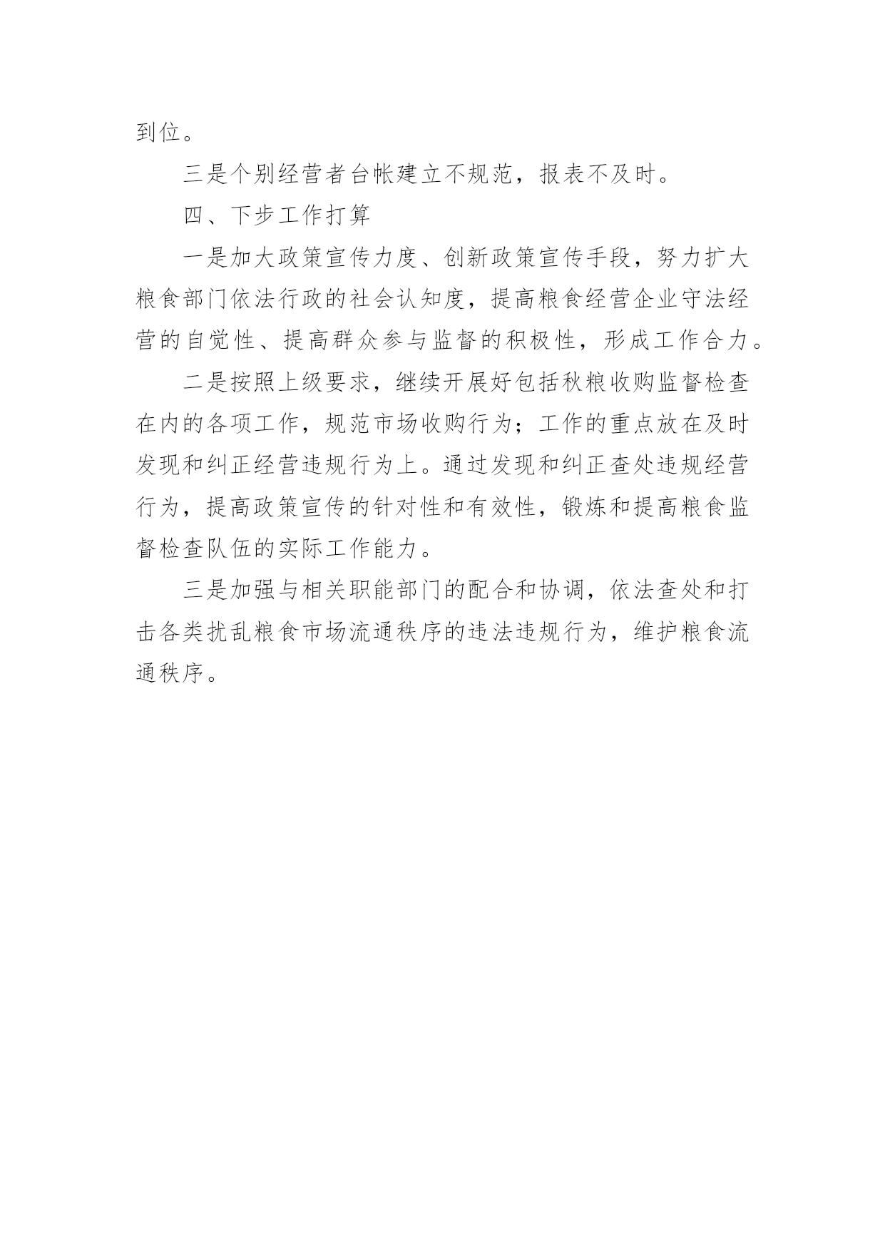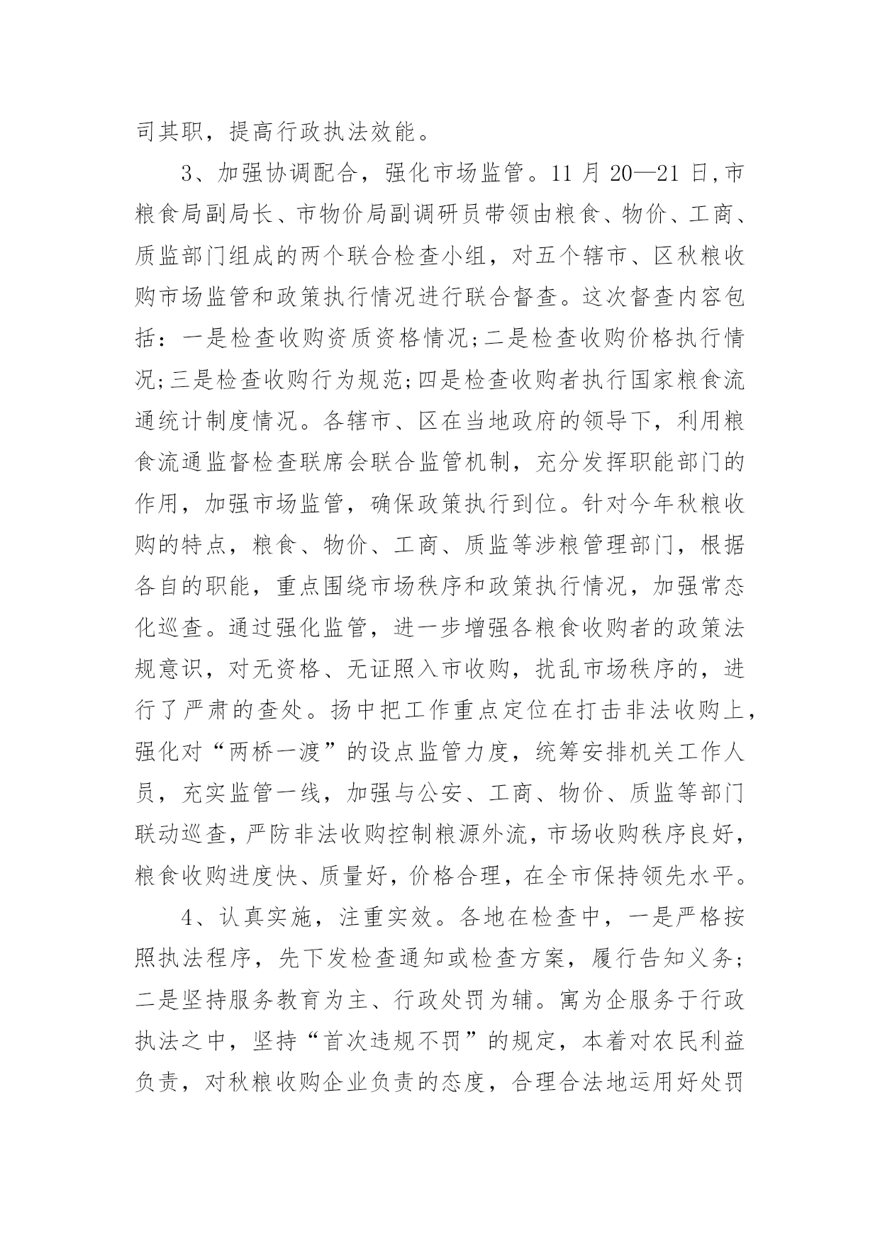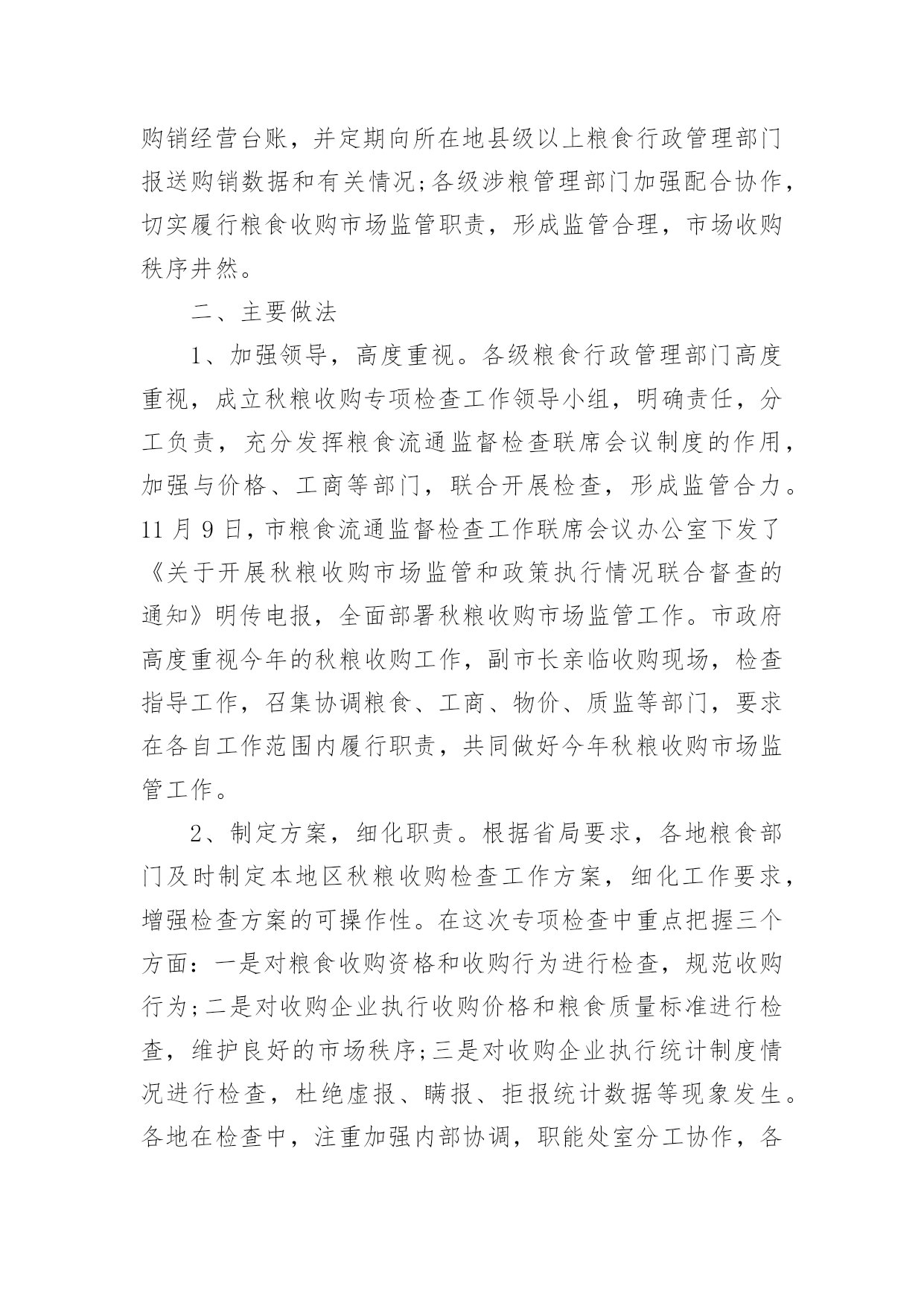 粮收购检查工作报告粮收购检查工作报告在当下这个社会中,报告对我们来说并不陌生,报告包含标题、正文、结尾等。你还在对写报告感到一筹莫展吗?下面是小编整理的粮收购检查工作报告,希望能够帮助到大家。粮收购检查工作报告1一、检查基本情况我市在本辖区内从事粮食收购活动的经营者数有215个,其中:政策性粮食委托收储库点数26个。从10月至12月底,开展专项检查16次,出动检查人员383人次,检查粮食收购主体数155个,占总数72.1%。实施责令改正处罚2例,暂停收购资格8例,罚款1例,罚款金额1000元。从检查情况来看,各辖市、区粮食部门对今年的秋粮收购工作十分重视,在仓容、资金、器材、人员等方面都做了充分准备,收购库点在收购场所公示稻谷收购品种、质量标准和收购价格,收购者的收购行为趋于理性,晚粳稻收购价格一般在每百斤142-145元左右,比去年的收购价格有提高,收购质量也好于去年,没有发现有压级压价或抬级抬价以及拒收农民交售的符合质量标准粮食等行为;收购组织和服务工作做得比较到位;粮食经营者按照统计制度要求建立粮食购销经营台账,并定期向所在地县级以上粮食行政管理部门报送购销数据和有关情况;各级涉粮管理部门加强配合协作,切实履行粮食收购市场监管职责,形成监管合理,市场收购秩序井然。二、主要做法1、加强领导,高度重视。各级粮食行政管理部门高度重视,成立秋粮收购专项检查工作领导小组,明确责任,分工负责,充分发挥粮食流通监督检查联席会议制度的作用,加强与价格、工商等部门,联合开展检查,形成监管合力。11月9日,市粮食流通监督检查工作联席会议办公室下发了《关于开展秋粮收购市场监管和政策执行情况联合督查的通知》明传电报,全面部署秋粮收购市场监管工作。市政府高度重视今年的秋粮收购工作,副市长亲临收购现场,检查指导工作,召集协调粮食、工商、物价、质监等部门,要求在各自工作范围内履行职责,共同做好今年秋粮收购市场监管工作。2、制定方案,细化职责。根据省局要求,各地粮食部门及时制定本地区秋粮收购检查工作方案,细化工作要求,增强检查方案的可操作性。在这次专项检查中重点把握三个方面:一是对粮食收购资格和收购行为进行检查,规范收购行为;二是对收购企业执行收购价格和粮食质量标准进行检查,维护良好的市场秩序;三是对收购企业执行统计制度情况进行检查,杜绝虚报、瞒报、拒报统计数据等现象发生。各地在检查中,注重加强内部协调,职能处室分工协作,各司其职,提高行政执法效能。3、加强协调配合,强化市场监管。11月20—21日,市粮食局副局长、市物价局副调研员带领由粮食、物价、工商、质监部门组成的两个联合检查小组,对五个辖市、区秋粮收购市场监管和政策执行情况进行联合督查。这次督查内容包括:一是检查收购资质资格情况;二是检查收购价格执行情况;三是检查收购行为规范;四是检查收购者执行国家粮食流通统计制度情况。各辖市、区在当地政府的领导下,利用粮食流通监督检查联席会联合监管机制,充分发挥职能部门的作用,加强市场监管,确保政策执行到位。针对今年秋粮收购的特点,粮食、物价、工商、质监等涉粮管理部门,根据各自的职能,重点围绕市场秩序和政策执行情况,加强常态化巡查。通过强化监管,进一步增强各粮食收购者的政策法规意识,对无资格、无证照入市收购,扰乱市场秩序的,进行了严肃的查处。扬中把工作重点定位在打击非法收购上,强化对“两桥一渡”的设点监管力度,统筹安排机关工作人员,充实监管一线,加强与公安、工商、物价、质监等部门联动巡查,严防非法收购控制粮源外流,市场收购秩序良好,粮食收购进度快、质量好,价格合理,在全市保持领先水平。4、认真实施,注重实效。各地在检查中,一是严格按照执法程序,先下发检查通知或检查方案,履行告知义务;二是坚持服务教育为主、行政处罚为辅。寓为企服务于行政执法之中,坚持“首次违规不罚”的规定,本着对农民利益负责,对秋粮收购企业负责的态度,合理合法地运用好处罚自由裁量权;三是规范使用行政处罚文书。我们按照省局要求规范文书制作,完善监督检查工作档案,做好现场笔录和检查日志,发现的各类涉粮违法违规行为,要依法严肃查处,并及时将有关违法违规信息录入监管对象信息库。三、存在的问题在这次秋粮专项检查中,主要存在以下问题:一是少数企业收购现场价格和质量标准公示项目不够规范,收购按质论价和扣量执行不够严格;二是由于粮食收购企业烘干设施不足,粳稻收购水分偏高,既影响粮食收购进度,又存在储存安全隐患;三是少数企业未能及时提供计量器具在有效期内的检定证书;四是收购资金供应滞后,特别是今年粳稻扩储资金和粮食部门自主经营的资金难以满足企业收购的需要;五是粮食经纪人在收购农民粮食占有重要份额,其收购价格、质量和结算等行为仍需进一步引导和规范。针对检查中发现的问题,各地都及时向当地政府和有关部门进行了通报,