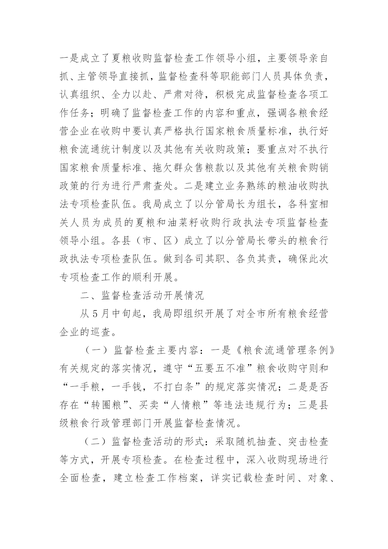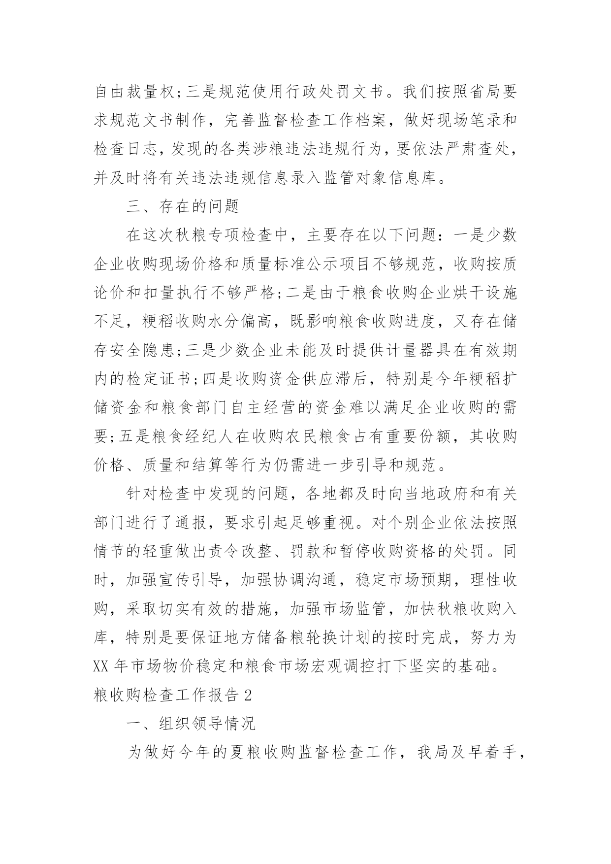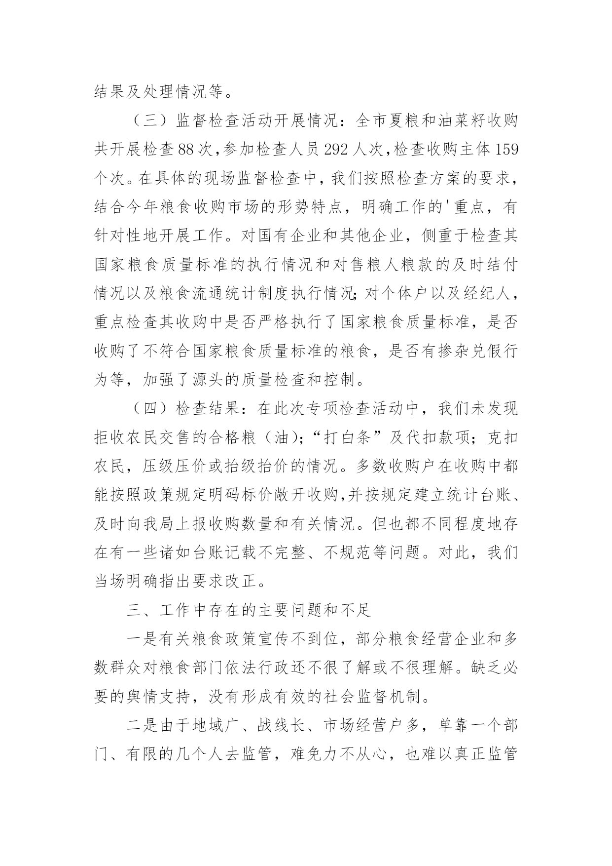 粮收购检查工作报告粮收购检查工作报告在当下这个社会中,报告对我们来说并不陌生,报告包含标题、正文、结尾等。你还在对写报告感到一筹莫展吗?下面是小编整理的粮收购检查工作报告,希望能够帮助到大家。粮收购检查工作报告1一、检查基本情况我市在本辖区内从事粮食收购活动的经营者数有215个,其中:政策性粮食委托收储库点数26个。从10月至12月底,开展专项检查16次,出动检查人员383人次,检查粮食收购主体数155个,占总数72.1%。实施责令改正处罚2例,暂停收购资格8例,罚款1例,罚款金额1000元。从检查情况来看,各辖市、区粮食部门对今年的秋粮收购工作十分重视,在仓容、资金、器材、人员等方面都做了充分准备,收购库点在收购场所公示稻谷收购品种、质量标准和收购价格,收购者的收购行为趋于理性,晚粳稻收购价格一般在每百斤142-145元左右,比去年的收购价格有提高,收购质量也好于去年,没有发现有压级压价或抬级抬价以及拒收农民交售的符合质量标准粮食等行为;收购组织和服务工作做得比较到位;粮食经营者按照统计制度要求建立粮食购销经营台账,并定期向所在地县级以上粮食行政管理部门报送购销数据和有关情况;各级涉粮管理部门加强配合协作,切实履行粮食收购市场监管职责,形成监管合理,市场收购秩序井然。二、主要做法1、加强领导,高度重视。各级粮食行政管理部门高度重视,成立秋粮收购专项检查工作领导小组,明确责任,分工负责,充分发挥粮食流通监督检查联席会议制度的作用,加强与价格、工商等部门,联合开展检查,形成监管合力。11月9日,市粮食流通监督检查工作联席会议办公室下发了《关于开展秋粮收购市场监管和政策执行情况联合督查的通知》明传电报,全面部署秋粮收购市场监管工作。市政府高度重视今年的秋粮收购工作,副市长亲临收购现场,检查指导工作,召集协调粮食、工商、物价、质监等部门,要求在各自工作范围内履行职责,共同做好今年秋粮收购市场监管工作。2、制定方案,细化职责。根据省局要求,各地粮食部门及时制定本地区秋粮收购检查工作方案,细化工作要求,增强检查方案的可操作性。在这次专项检查中重点把握三个方面:一是对粮食收购资格和收购行为进行检查,规范收购行为;二是对收购企业执行收购价格和粮食质量标准进行检查,维护良好的市场秩序;三是对收购企业执行统计制度情况进行检查,杜绝虚报、瞒报、拒报统计数据等现象发生。各地在检查中,注重加强内部协调,职能处室分工协作,各司其职,提高行政执法效能。3、加强协调配合,强化市场监管。11月20—21日,市粮食局副局长、市物价局副调研员带领由粮食、物价、工商、质监部门组成的两个联合检查小组,对五个辖市、区秋粮收购市场监管和政策执行情况进行联合督查。这次督查内容包括:一是检查收购资质资格情况;二是检查收购价格执行情况;三是检查收购行为规范;四是检查收购者执行国家粮食流通统计制度情况。各辖市、区在当地政府的领导下,利用粮食流通监督检查联席会联合监管机制,充分发挥职能部门的作用,加强市场监管,确保政策执行到位。针对今年秋粮收购的特点,粮食、物价、工商、质监等涉粮管理部门,根据各自的职能,重点围绕市场秩序和政策执行情况,加强常态化巡查。通过强化监管,进一步增强各粮食收购者的政策法规意识,对无资格、无证照入市收购,扰乱市场秩序的,进行了严肃的查处。扬中把工作重点定位在打击非法收购上,强化对“两桥一渡”的设点监管力度,统筹安排机关工作人员,充实监管一线,加强与公安、工商、物价、质监等部门联动巡查,严防非法收购控制粮源外流,市场收购秩序良好,粮食收购进度快、质量好,价格合理,在全市保持领先水平。4、认真实施,注重实效。各地在检查中,一是严格按照执法程序,先下发检查通知或检查方案,履行告知义务;二是坚持服务教育为主、行政处罚为辅。寓为企服务于行政执法之中,坚持“首次违规不罚”的规定,本着对农民利益负责,对秋粮收购企业负责的态度,合理合法地运用好处罚自由裁量权;三是规范使用行政处罚文书。我们按照省局要求规范文书制作,完善监督检查工作档案,做好现场笔录和检查日志,发现的各类涉粮违法违规行为,要依法严肃查处,并及时将有关违法违规信息录入监管对象信息库。三、存在的问题在这次秋粮专项检查中,主要存在以下问题:一是少数企业收购现场价格和质量标准公示项目不够规范,收购按质论价和扣量执行不够严格;二是由于粮食收购企业烘干设施不足,粳稻收购水分偏高,既影响粮食收购进度,又存在储存安全隐患;三是少数企业未能及时提供计量器具在有效期内的检定证书;四是收购资金供应滞后,特别是今年粳稻扩储资金和粮食部门自主经营的资金难以满足企业收购的需要;五是粮食经纪人在收购农民粮食占有重要份额,其收购价格、质量和结算等行为仍需进一步引导和规范。针对检查中发现的问题,各地都及时向当地政府和有关部门进行了通报,