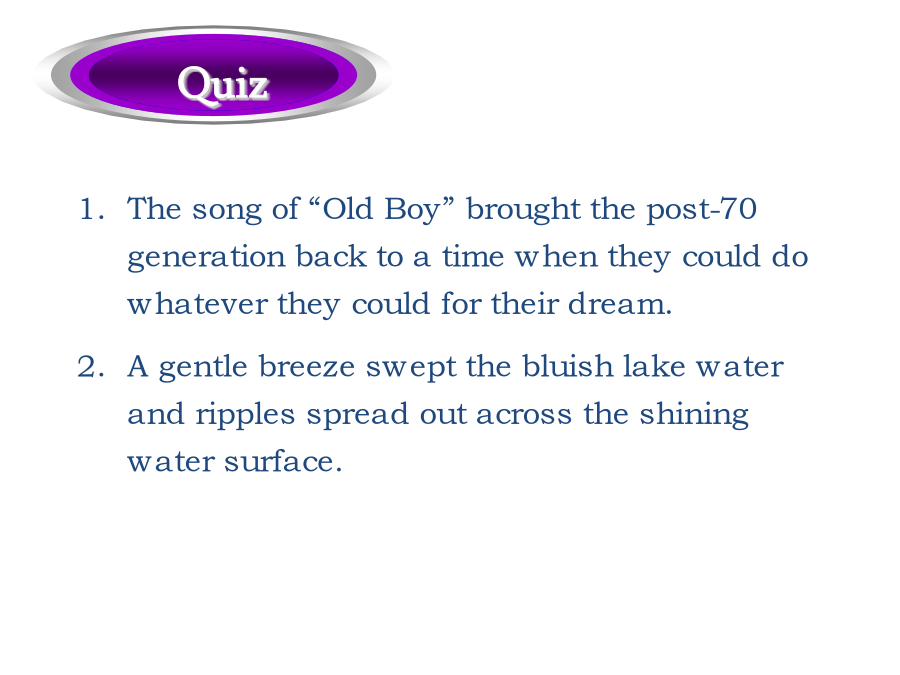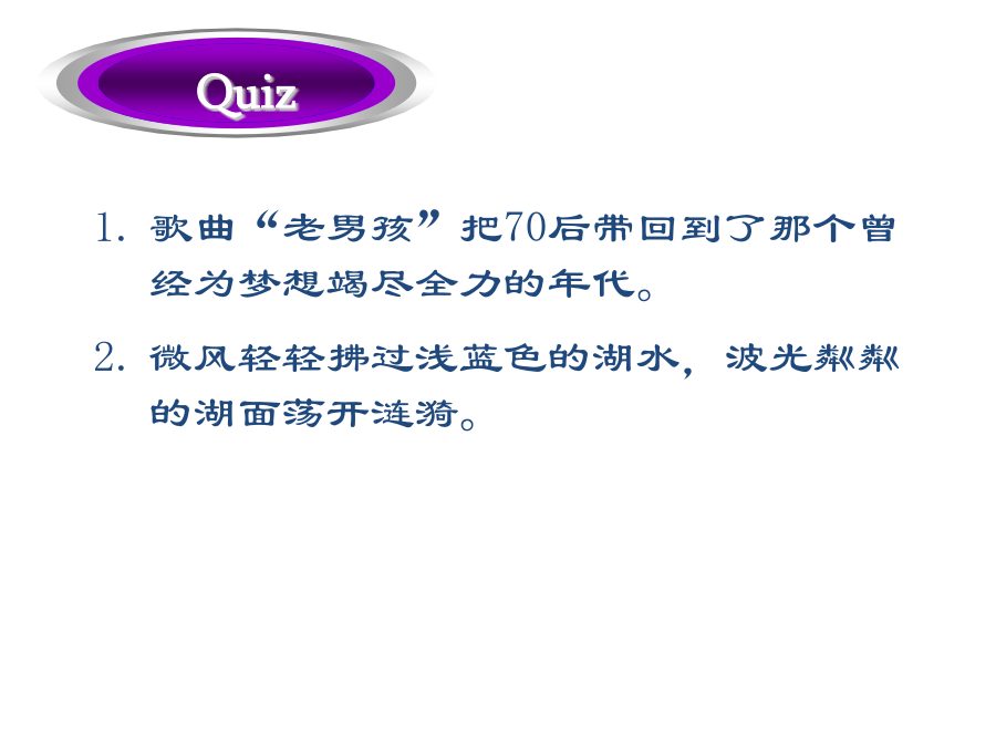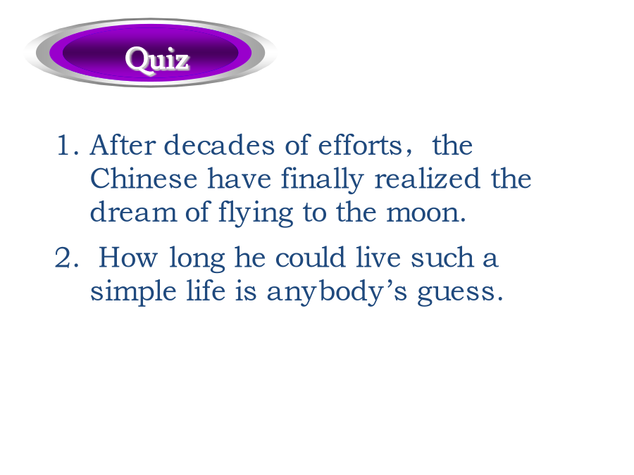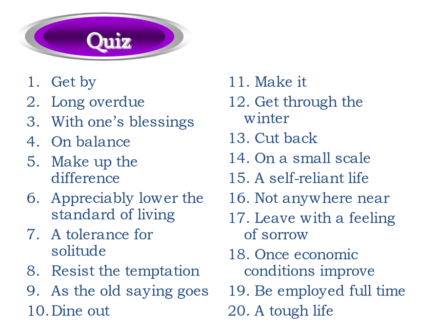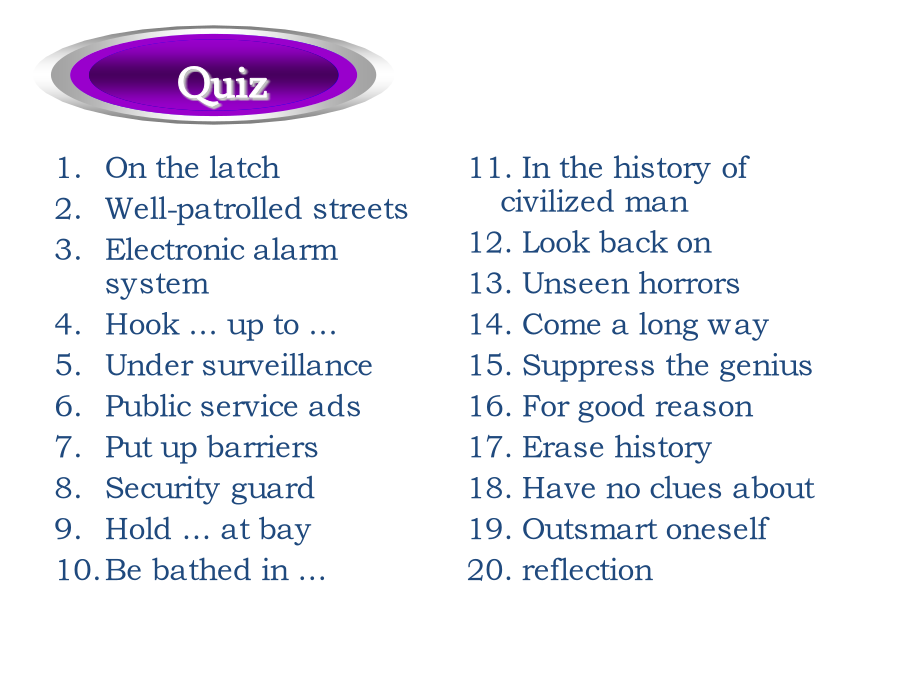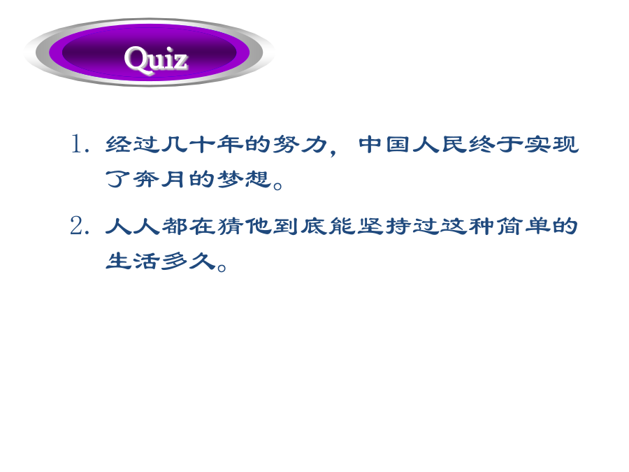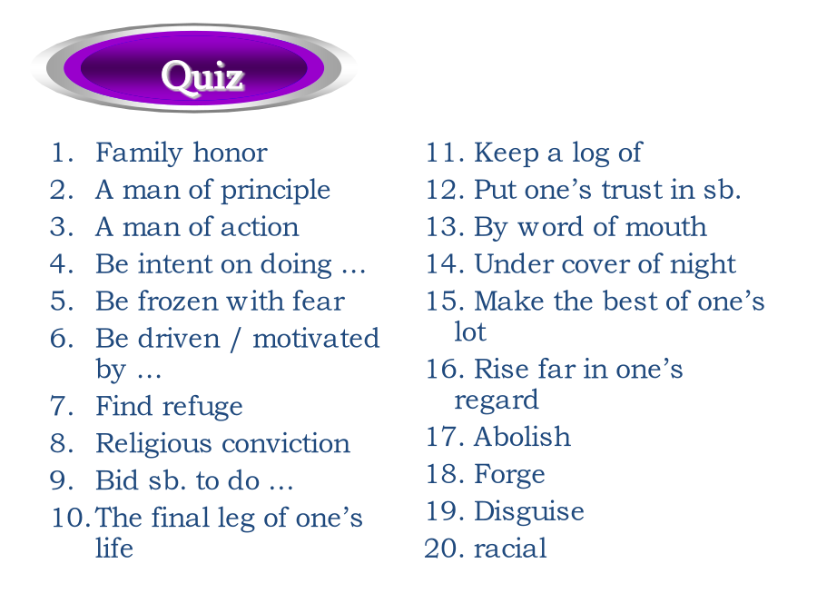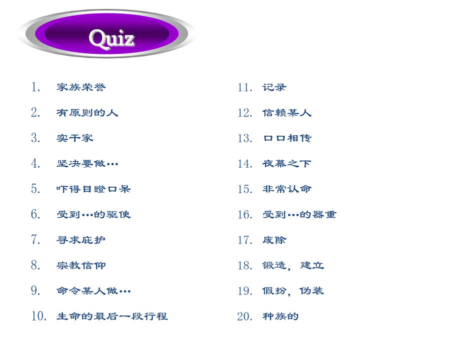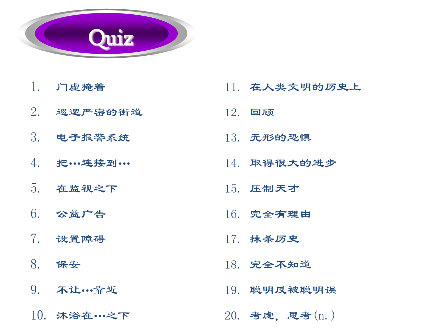 过得去拖了很久的带着某人的祝福总的来说弥补差距明显地降低生活水平忍受寂寞抵制诱惑正如俗话所说的外出吃饭GetbyLongoverdueWithone’sblessingsOnbalanceMakeupthedifferenceAppreciablylowerthestandardoflivingAtoleranceforsolitudeResistthetemptationAstheoldsayinggoesDineout经过几十年的努力,中国人民终于实现了奔月的梦想。人人都在猜他到底能坚持过这种简单的生活多久。Afterdecadesofefforts,theChinesehavefinallyrealizedthedreamofflyingtothemoon.Howlonghecouldlivesuchasimplelifeisanybody’sguess.家族荣誉有原则的人实干家坚决要做…吓得目瞪口呆受到…的驱使寻求庇护宗教信仰命令某人做…生命的最后一段行程FamilyhonorAmanofprincipleAmanofactionBeintentondoing…BefrozenwithfearBedriven/motivatedby…FindrefugeReligiousconvictionBidsb.todo…Thefinallegofone’slife歌曲“老男孩”把70后带回到了那个曾经为梦想竭尽全力的年代。微风轻轻拂过浅蓝色的湖水,波光粼粼的湖面荡开涟漪。Thesongof“OldBoy”broughtthepost-70generationbacktoatimewhentheycoulddowhatevertheycouldfortheirdream.Agentlebreezesweptthebluishlakewaterandripplesspreadoutacrosstheshiningwatersurface.门虚掩着巡逻严密的街道电子报警系统把…连接到…在监视之下公益广告设置障碍保安不让…靠近沐浴在…之下OnthelatchWell-patrolledstreetsElectronicalarmsystemHook…upto…UndersurveillancePublicserviceadsPutupbarriersSecurityguardHold…atbayBebathedin…这座房子太弱不禁风了,以至于连一场台风都没有经历过就坍塌了。我从来不曾想到我的最好朋友会背叛我。这是一个难题,在找到解决办法之前很可能你需要深思熟虑。Thehousewassovulnerablethatitcollapsedwithoutsomuchasenduringatyphoon.Ithasneveroccurredtomethatmybestfriendwouldbetrayme.Thisisaverytoughproblem.Chancesarethatyouneedtoreflectonitbeforeyoucanfindasolutiontoit.出去透一口气如同晨曦初现甚至真挚的言语由衷的感激沉浸于可以与之媲美的东西个人经历最重要的事GooutforabreathofopenairLikeadawn’sbrighteningSomuchasGenuinestatementHeartfeltappreciation(andgratitude)Beimmersedin…Theequalof…PersonalexperienceTopmostpriority那些在成长过程中受到了良好影响的人更可能成功。Thosewhoareinfluencedinapositivewayduringtheprocessofgrowtharemorelikelytoachievesuccess.