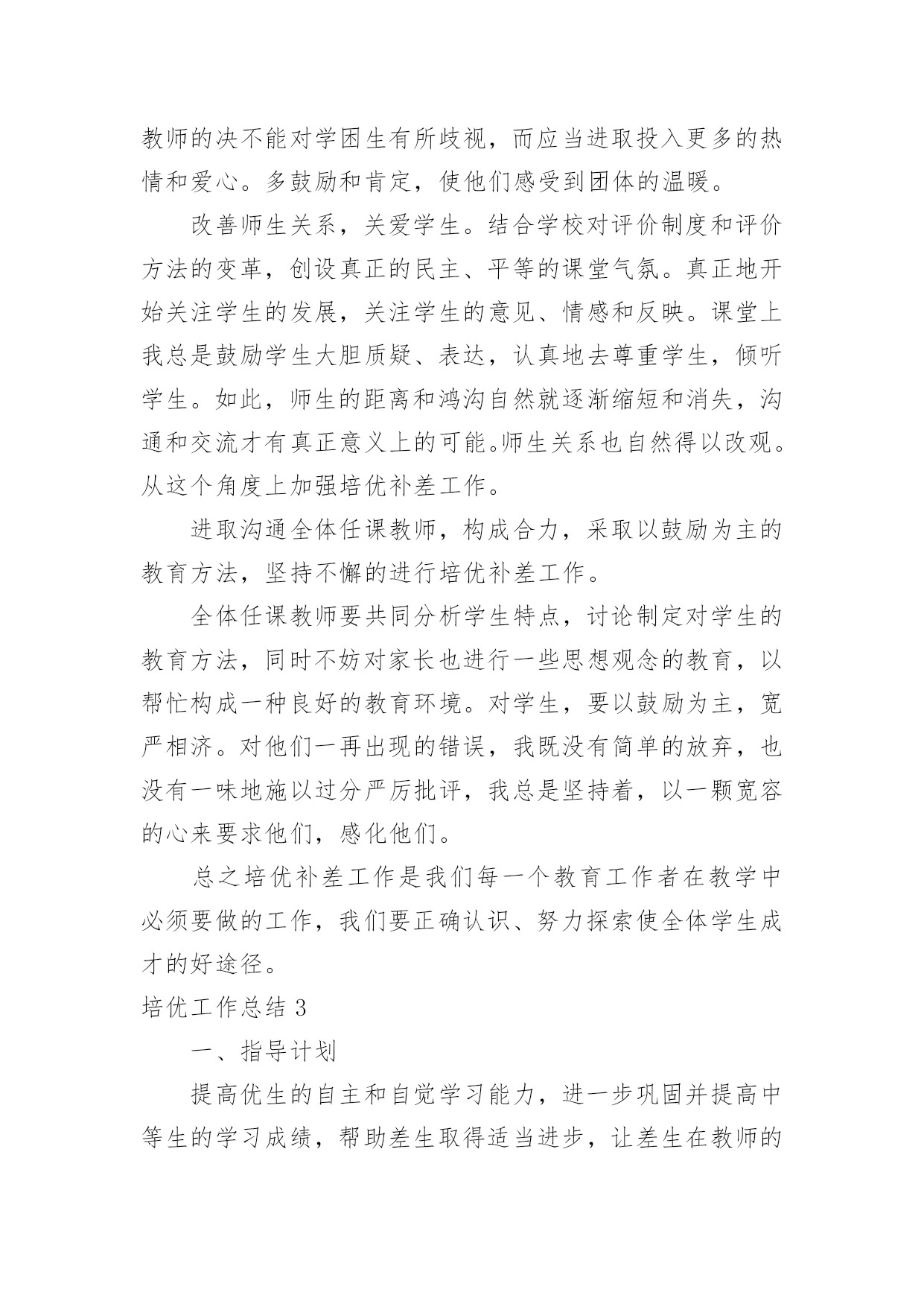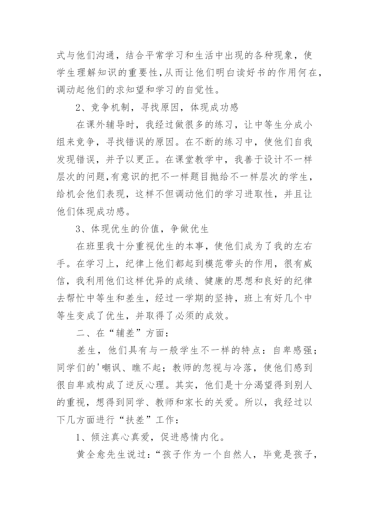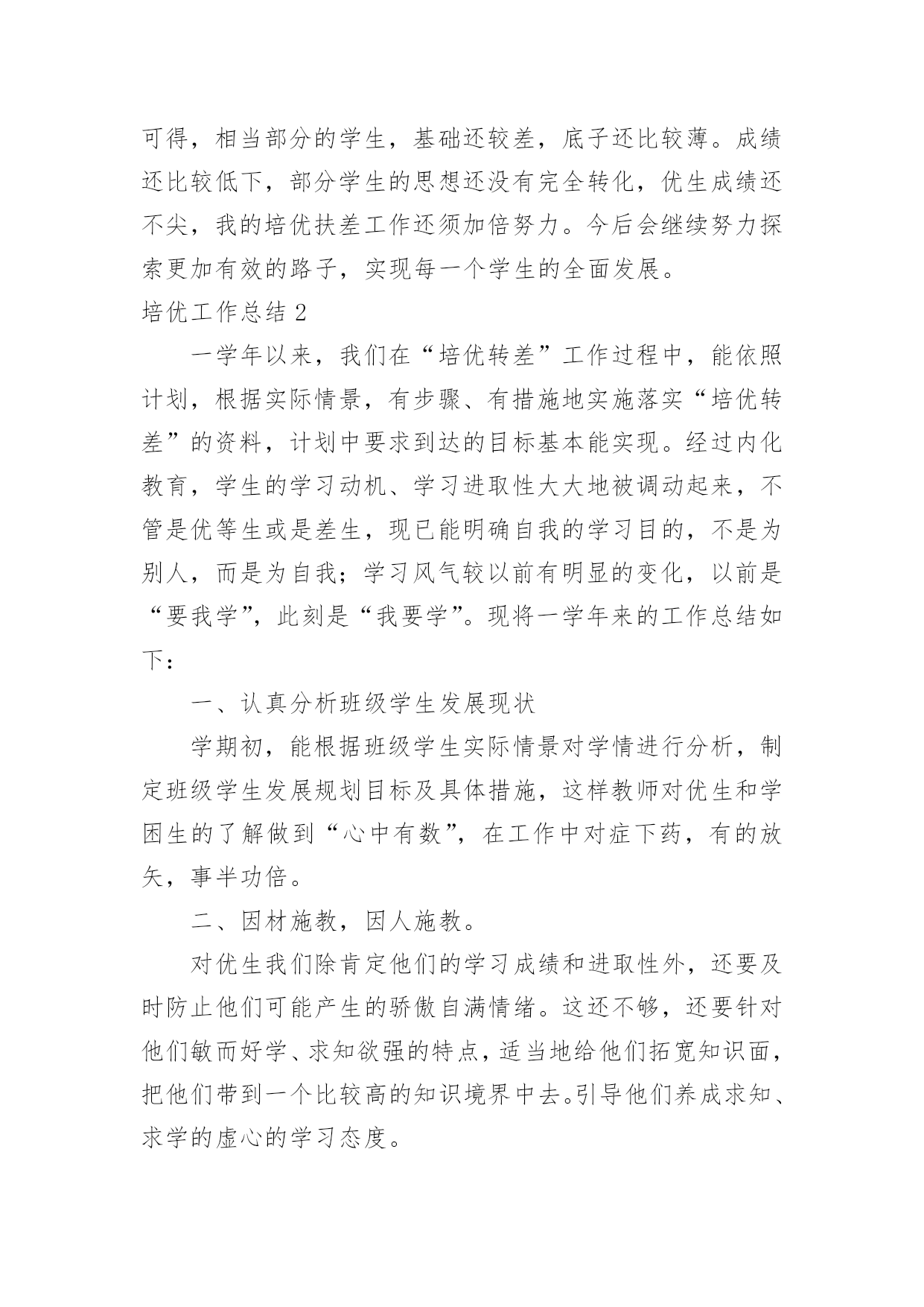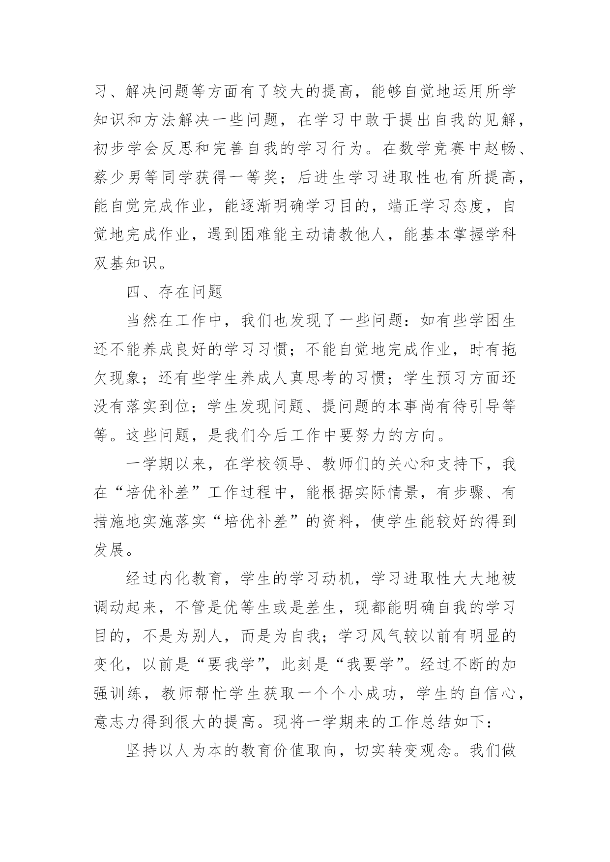 培优工作总结培优工作总结总结是在某一时期、某一项目或某些工作告一段落或者全部完成后进行回顾检查、分析评价,从而得出教训和一些规律性认识的一种书面材料,它能够使头脑更加清醒,目标更加明确,因此我们要做好归纳,写好总结。总结你想好怎么写了吗?下面是小编收集整理的培优工作总结,欢迎阅读,希望大家能够喜欢。培优工作总结1在教育教学工作中,我认识到培优辅差是教学工作的重头戏之一。本年度在“培优扶差”工作过程中,我根据班级的基本情景,针对班上出现的一些具体表现,如:不爱学习、学习习惯不好以及学习时懒惰等情景,有步骤、有措施地实施落实“培优扶差”的资料,现将“培优扶差”工作总结如下:一、在“培优”方面:1、分析中等生的个性,加强思想教育培优,重点不在于优生上,而在于中等生身上。培养他们有要正确的思想,认真的学习态度。因为一个人的思想决定他的态度,而态度又决定了一切。所以,我先了解学生的个性,根据他们不一样的特性,在课余的时间采取不一样方式与他们沟通,结合平常学习和生活中出现的各种现象,使学生理解知识的重要性,从而让他们明白读好书的作用何在,调动起他们的求知望和学习的自觉性。2、竞争机制,寻找原因,体现成功感在课外辅导时,我经过做很多的练习,让中等生分成小组来竞争,寻找错误的原因。在不断的练习中,使他们自我发现错误,并予以更正。在课堂教学中,我善于设计不一样层次的问题,有意识的把不一样题目抛给不一样层次的学生,给机会他们表现,这样不但调动他们的学习进取性,并且让他们体现成功感。3、体现优生的价值,争做优生在班里我十分重视优生的本事,使他们成为了我的左右手。在学习上,纪律上他们都起到模范带头的作用,很有威信,我利用他们这样优异的成绩、健康的思想和良好的纪律去帮忙中等生和差生,经过一学期的坚持,班上有好几个中等生变成了优生,并取得了必须的成效。二、在“辅差”方面:差生,他们具有与一般学生不一样的特点:自卑感强;同学们的'嘲讽、瞧不起;教师的忽视与冷落,使他们感到很自卑或构成了逆反心理。其实,他们是十分渴望得到别人的重视,想得到同学、教师和家长的关爱。所以,我经过以下几方面进行“扶差”工作:1、倾注真心真爱,促进感情内化。黄全愈先生说过:“孩子作为一个自然人,毕竟是孩子,但孩子又是一个有独立人格的社会人,他们是有自我的尊严,自我的感情,自我的思考,自我的独立意志和独立追求的人。”所以,作为教师,不应一味地去挑剔、埋怨、责备,应更多地去发现,去欣赏,发现他们的提高,欣赏他们的点滴成功,并且让他们学会自我发现和自我欣赏。2、多鼓励,多表扬。差生同样期望受到别人的尊重和表扬,如果这种期待总得不到满足,他们就会对自我也越来越失望。所以我在他们取得提高或是成功时,给予及时肯定,借此增加其自尊心,确立其自信心,强化其正确行为,并且将这方面的优势或提高迁移到其他方面使他们慢慢的走出困境,找到前进的方向。如在平时的听写中,只要有一点提高,我就会及时表扬。我对差生的要求都是从低提出,让他们每前进一步都得到及时表扬,产生成功感。从而使他们更加有信心实现教师提出的更高要求,以此来唤起他们的自信心和求知欲。3、设立目标,让其感受成功。在鼓励、表扬后进生的同时,我还让他们也感受成功的愉悦。因为成功的愉悦是有力的推进器,能催人奋发前进。根据后进生的实际情景,设立合理的目标,让他们能够到达。只要他们在原有的基础上有所提高,我就给予奖励,让他们感到成功并不难,感到有成就感。三、存在的不足及努力的方向尽管我做了很多努力,做了许多有益的探索,在培优补差的工作中,虽然取得了必须的成绩,但从期末的成绩分析可得,相当部分的学生,基础还较差,底子还比较薄。成绩还比较低下,部分学生的思想还没有完全转化,优生成绩还不尖,我的培优扶差工作还须加倍努力。今后会继续努力探索更加有效的路子,实现每一个学生的全面发展。培优工作总结2一学年以来,我们在“培优转差”工作过程中,能依照计划,根据实际情景,有步骤、有措施地实施落实“培优转差”的资料,计划中要求到达的目标基本能实现。经过内化教育,学生的学习动机、学习进取性大大地被调动起来,不管是优等生或是差生,现已能明确自我的学习目的,不是为别人,而是为自我;学习风气较以前有明显的变化,以前是“要我学”,此刻是“我要学”。现将一学年来的工作总结如下:一、认真分析班级学生发展现状学期初,能根据班级学生实际情景对学情进行分析,制定班级学生发展规划目标及具体措施,这样教师对优生和学困生的了解做到“心中有数”,在工作中对症下药,有的放矢,事半功倍。二、因材施教,因人施教。对优生我们除肯定他们的学习成绩和进取性外,还要及时防止他们可能产生的骄傲自满情绪。这还不够,还要针对他们敏而好学、求知欲强的特点,适当地给他们拓宽知识面,把他们带到一个比较高的知识境界中去。引导他们养