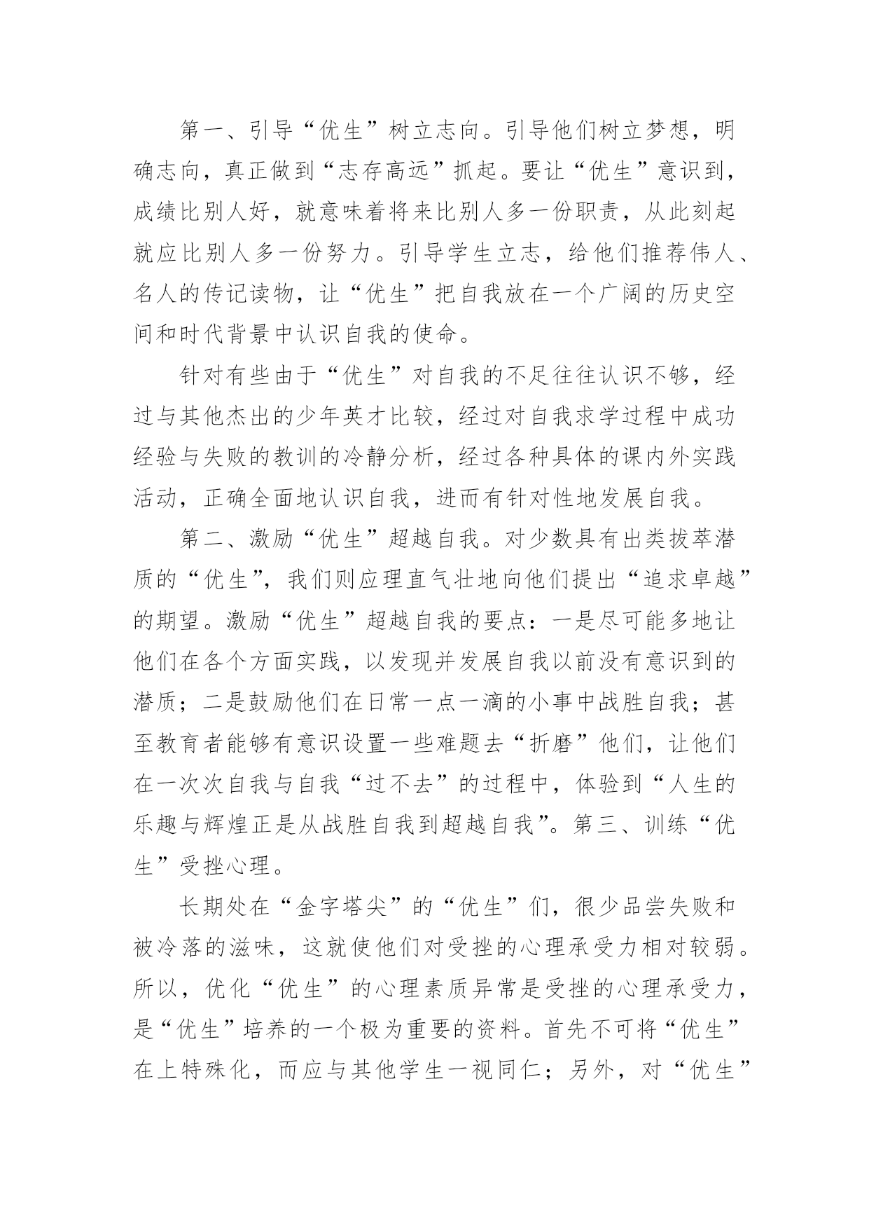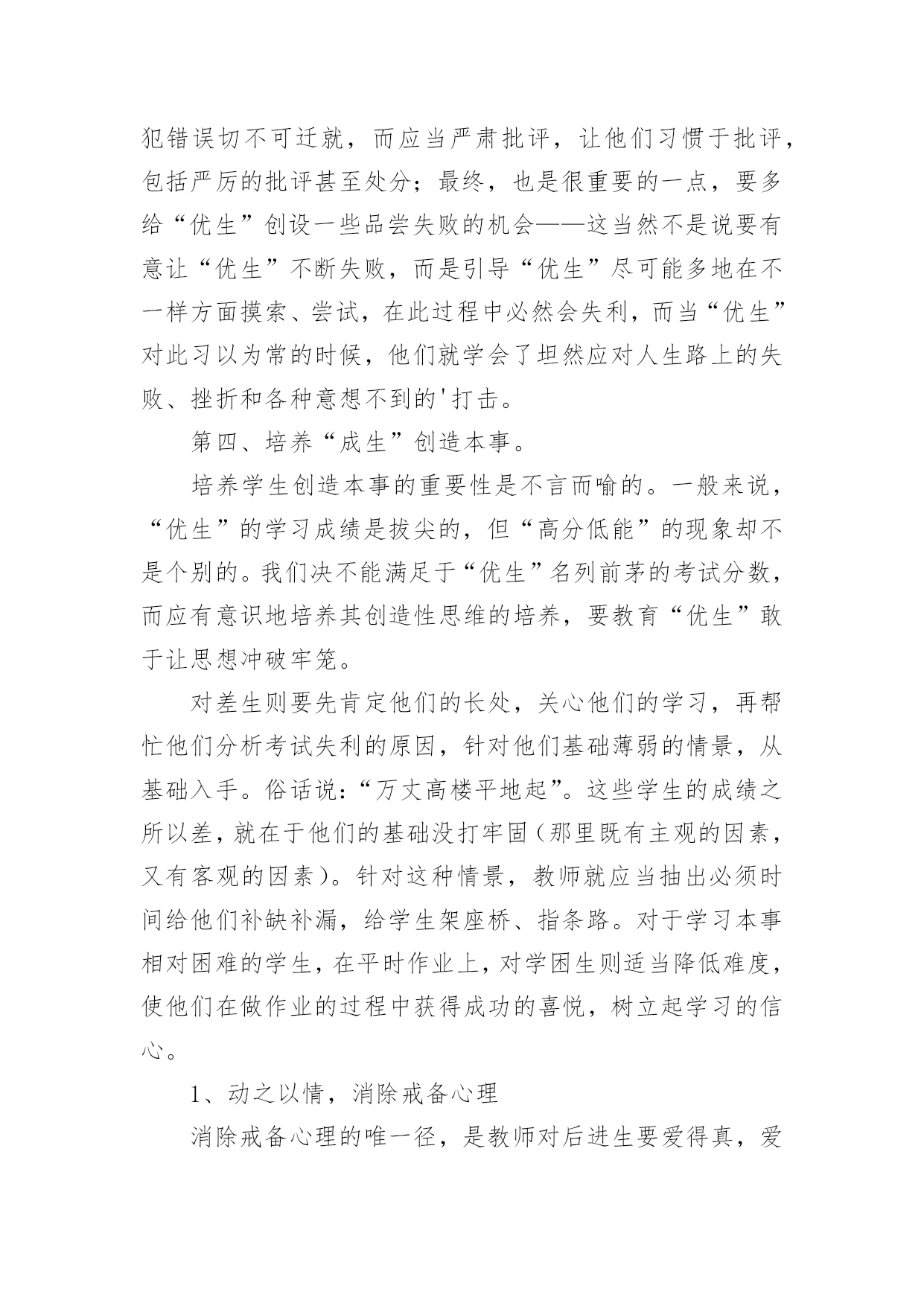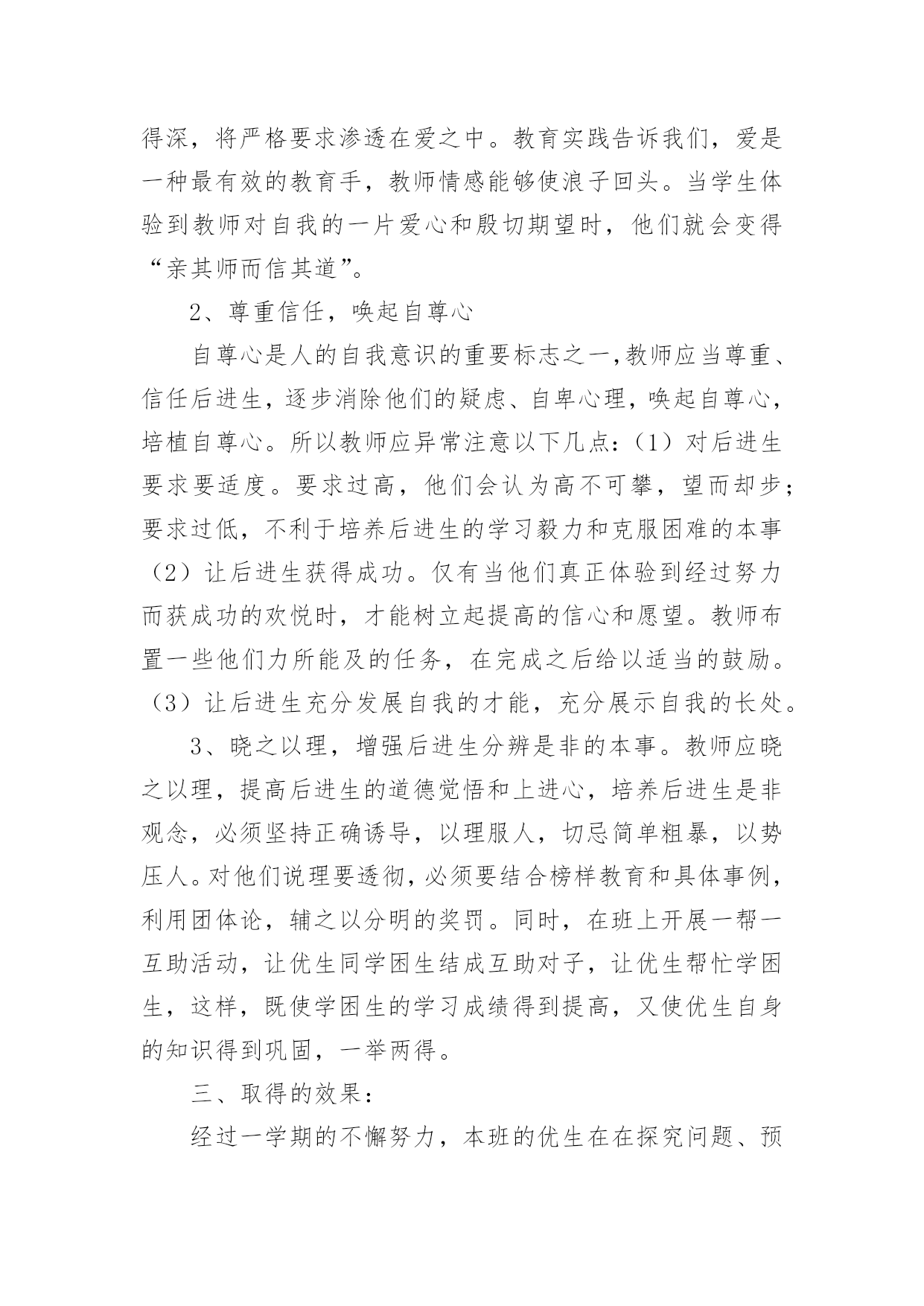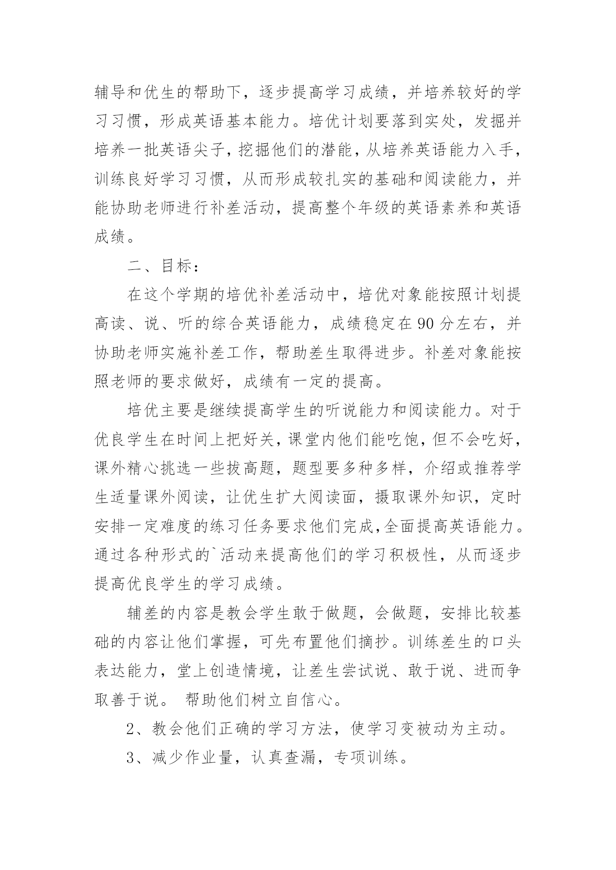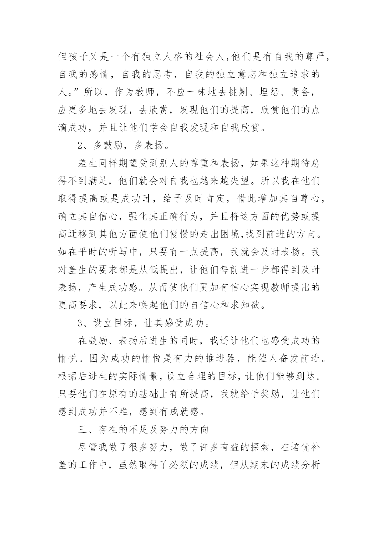 培优工作总结培优工作总结总结是在某一时期、某一项目或某些工作告一段落或者全部完成后进行回顾检查、分析评价,从而得出教训和一些规律性认识的一种书面材料,它能够使头脑更加清醒,目标更加明确,因此我们要做好归纳,写好总结。总结你想好怎么写了吗?下面是小编收集整理的培优工作总结,欢迎阅读,希望大家能够喜欢。培优工作总结1在教育教学工作中,我认识到培优辅差是教学工作的重头戏之一。本年度在“培优扶差”工作过程中,我根据班级的基本情景,针对班上出现的一些具体表现,如:不爱学习、学习习惯不好以及学习时懒惰等情景,有步骤、有措施地实施落实“培优扶差”的资料,现将“培优扶差”工作总结如下:一、在“培优”方面:1、分析中等生的个性,加强思想教育培优,重点不在于优生上,而在于中等生身上。培养他们有要正确的思想,认真的学习态度。因为一个人的思想决定他的态度,而态度又决定了一切。所以,我先了解学生的个性,根据他们不一样的特性,在课余的时间采取不一样方式与他们沟通,结合平常学习和生活中出现的各种现象,使学生理解知识的重要性,从而让他们明白读好书的作用何在,调动起他们的求知望和学习的自觉性。2、竞争机制,寻找原因,体现成功感在课外辅导时,我经过做很多的练习,让中等生分成小组来竞争,寻找错误的原因。在不断的练习中,使他们自我发现错误,并予以更正。在课堂教学中,我善于设计不一样层次的问题,有意识的把不一样题目抛给不一样层次的学生,给机会他们表现,这样不但调动他们的学习进取性,并且让他们体现成功感。3、体现优生的价值,争做优生在班里我十分重视优生的本事,使他们成为了我的左右手。在学习上,纪律上他们都起到模范带头的作用,很有威信,我利用他们这样优异的成绩、健康的思想和良好的纪律去帮忙中等生和差生,经过一学期的坚持,班上有好几个中等生变成了优生,并取得了必须的成效。二、在“辅差”方面:差生,他们具有与一般学生不一样的特点:自卑感强;同学们的'嘲讽、瞧不起;教师的忽视与冷落,使他们感到很自卑或构成了逆反心理。其实,他们是十分渴望得到别人的重视,想得到同学、教师和家长的关爱。所以,我经过以下几方面进行“扶差”工作:1、倾注真心真爱,促进感情内化。黄全愈先生说过:“孩子作为一个自然人,毕竟是孩子,但孩子又是一个有独立人格的社会人,他们是有自我的尊严,自我的感情,自我的思考,自我的独立意志和独立追求的人。”所以,作为教师,不应一味地去挑剔、埋怨、责备,应更多地去发现,去欣赏,发现他们的提高,欣赏他们的点滴成功,并且让他们学会自我发现和自我欣赏。2、多鼓励,多表扬。差生同样期望受到别人的尊重和表扬,如果这种期待总得不到满足,他们就会对自我也越来越失望。所以我在他们取得提高或是成功时,给予及时肯定,借此增加其自尊心,确立其自信心,强化其正确行为,并且将这方面的优势或提高迁移到其他方面使他们慢慢的走出困境,找到前进的方向。如在平时的听写中,只要有一点提高,我就会及时表扬。我对差生的要求都是从低提出,让他们每前进一步都得到及时表扬,产生成功感。从而使他们更加有信心实现教师提出的更高要求,以此来唤起他们的自信心和求知欲。3、设立目标,让其感受成功。在鼓励、表扬后进生的同时,我还让他们也感受成功的愉悦。因为成功的愉悦是有力的推进器,能催人奋发前进。根据后进生的实际情景,设立合理的目标,让他们能够到达。只要他们在原有的基础上有所提高,我就给予奖励,让他们感到成功并不难,感到有成就感。三、存在的不足及努力的方向尽管我做了很多努力,做了许多有益的探索,在培优补差的工作中,虽然取得了必须的成绩,但从期末的成绩分析可得,相当部分的学生,基础还较差,底子还比较薄。成绩还比较低下,部分学生的思想还没有完全转化,优生成绩还不尖,我的培优扶差工作还须加倍努力。今后会继续努力探索更加有效的路子,实现每一个学生的全面发展。培优工作总结2一学年以来,我们在“培优转差”工作过程中,能依照计划,根据实际情景,有步骤、有措施地实施落实“培优转差”的资料,计划中要求到达的目标基本能实现。经过内化教育,学生的学习动机、学习进取性大大地被调动起来,不管是优等生或是差生,现已能明确自我的学习目的,不是为别人,而是为自我;学习风气较以前有明显的变化,以前是“要我学”,此刻是“我要学”。现将一学年来的工作总结如下:一、认真分析班级学生发展现状学期初,能根据班级学生实际情景对学情进行分析,制定班级学生发展规划目标及具体措施,这样教师对优生和学困生的了解做到“心中有数”,在工作中对症下药,有的放矢,事半功倍。二、因材施教,因人施教。对优生我们除肯定他们的学习成绩和进取性外,还要及时防止他们可能产生的骄傲自满情绪。这还不够,还要针对他们敏而好学、求知欲强的特点,适当地给他们拓宽知识面,把他们带到一个比较高的知识境界中去。引导他们养