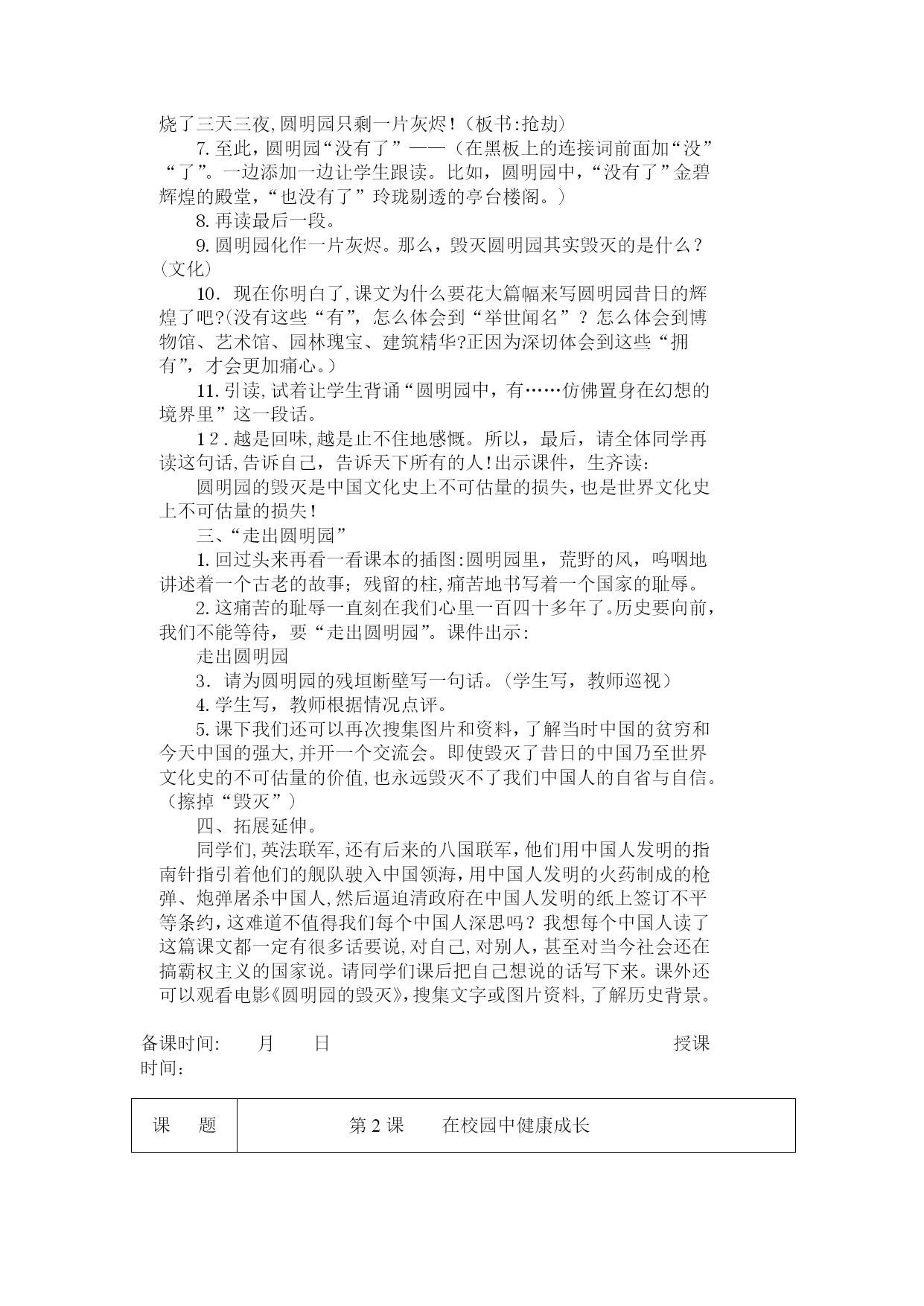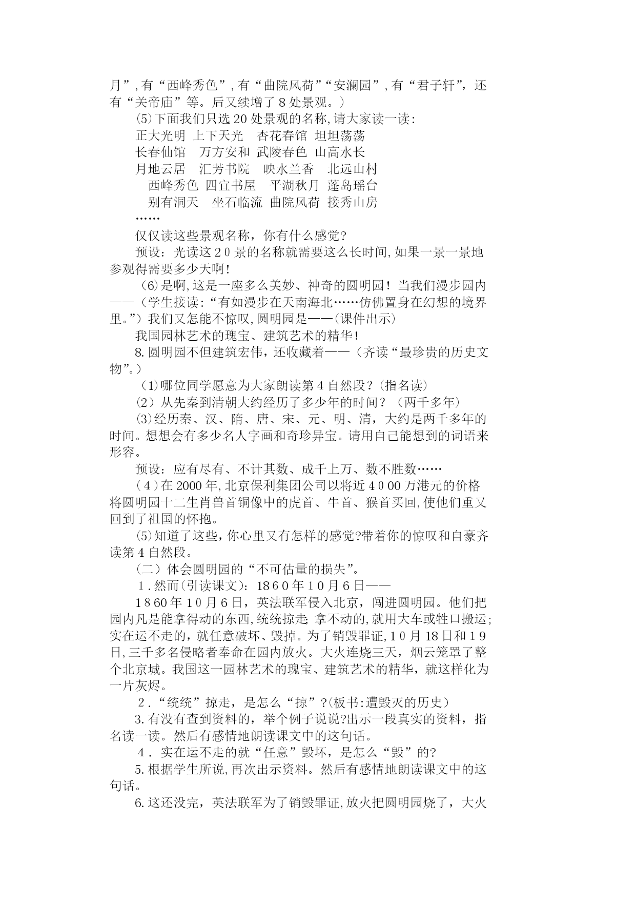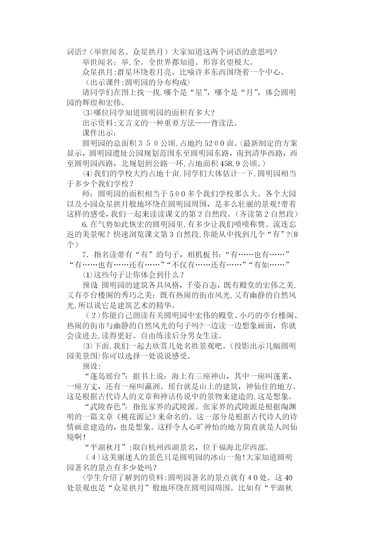 A7技术支持的《圆明园的毁灭》总结提升教学主题激发学生热爱祖国文化的情感,增强学生振兴中华的责任感和使命感。教学目标1.继续学习课文,了解圆明园辉煌的过去和被毁灭的经过,激发学生热爱祖国文化的情感,增强学生振兴中华的责任感和使命感。2.体会文章所要表达的感情,感受情感的变化;领悟文章的表达特点,学习与运用整理资料的方法。教学方法:运用多媒体教学。教学过程一、走近圆明园。1.这节课我们将继续学习《圆明园的毁灭》这一课。让我们一起写下课题:“圆”是“圆满无缺”的“圆”,“明”是“光明普照”的“明”,“园”是“皇家园林”的“园”。齐读“圆明园”。打开课本,看这一幅废墟图,你会有怎样的感受?这些感受源于一个词——毁灭(板书,指导学生注意笔顺)。从题目看,重点写的是“毁灭”。再读课题2.从最后一段课文引入:这片废墟已经在风雨中伫立一百五十多年。文中的哪句话概括了圆明园损失的程度?(提示连接词“是……也是……”和“文化”)3.到底是一座怎样的园林,让人说毁灭的是“不可估量的价值”?让我们再一次一起走进“圆明园”。二、走进圆明园。(一)体会圆明园“不可估量”的价值。1.请同学们边读课文边思考:为什么英法联军毁了一座圆明园,就会激起我们这么大的愤恨,这么大的怒火?2.一边读,一边思考,要静心、专心读书。3.根据学生回答,课件出示:因为它是当时世界上最大的博物馆、艺术馆。因为圆明园不但建筑宏伟,而且收藏着许多珍贵的历史文物。4.这就是第2、3、4自然段告诉我们的。它不但建筑宏伟而且是最大的博物馆、艺术馆,收藏着最珍贵的历史文物。所以,它的毁灭,使每一个中国人痛心,会激起每一个中国人对英法联军、对当时腐败无能的清政府的痛恨,读一读,想想圆明园到底有什么“不可估量的价值”?(生读第2、3自然段)(板书:昔日的辉煌)5.指名读第2自然段。课件出示:圆明园在北京西北郊,是一座举世闻名的皇家园林。它由圆明园、万春园和长春园组成,所以也叫圆明三园。此外,还有许多小园,分布在圆明园东、西、南三面,众星拱月般环绕在圆明园周围。(1)这段话介绍了圆明园的什么?(位置和结构)(2)如果让你带着自己的理解和感受来读这段话,你会强调哪些词语?(举世闻名、众星拱月)大家知道这两个词语的意思吗?举世闻名:举,全。全世界都知道。形容名望极大。众星拱月:群星环绕着月亮。比喻许多东西围绕着一个中心。(出示课件:圆明园的分布构成)请同学们在图上找一找,哪个是“星”,哪个是“月”,体会圆明园的辉煌和宏伟。(3)哪位同学知道圆明园的面积有多大?出示资料:文言文的一种重要方法——背读法。课件出示:圆明园的总面积350公顷,占地约5200亩。(最新制定的方案显示,圆明园遗址公园规划范围东至圆明园东路,南到清华西路,西至圆明园西路,北规划到公路一环,占地面积458.9公顷。)(4)我们的学校大约占地十亩,同学们大体估计一下,圆明园相当于多少个我们学校?师:圆明园的面积相当于500多个我们学校那么大。各个大园以及小园众星拱月般地环绕在圆明园周围,是多么壮丽的景观!带着这样的感受,我们一起来读读课文的第2自然段。(齐读第2自然段)6.在气势如此恢宏的圆明园里,有多少让我们啧啧称赞、流连忘返的美景呢?快速浏览课文第3自然段,你能从中找到几个“有”?(8个)7.指名读带有“有”的句子,相机板书:“有……也有……”“有……也有……还有……”“不仅有……还有……”“有如……”(1)这些句子让你体会到什么?预设:圆明园的建筑各具风格,千姿百态,既有殿堂的宏伟之美,又有亭台楼阁的秀巧之美;既有热闹的街市风光,又有幽静的自然风光,所以说它是建筑艺术的精华。(2)你能自己朗读有关圆明园中宏伟的殿堂、小巧的亭台楼阁、热闹的街市与幽静的自然风光的句子吗?一边读一边想象画面,你就会读进去,读得更好。自由练读后分男女生读。(3)下面,我们一起去欣赏几处名胜景观吧。(投影出示几幅圆明园美景图)你可以选择一处说说感受。预设:“蓬岛瑶台”:据书上说:海上有三座神山,其中一座叫蓬莱,一座方丈,还有一座叫瀛洲。瑶台就是山上的建筑,神仙住的地方。这是根据古代诗人的文章和神话传说中的景物来建造的,这是想象。“武陵春色”:指张家界的武陵源。张家界的武陵源是根据陶渊明的一篇文章《桃花源记》来命名的。这一部分是根据古代诗人的诗情画意建造的,也是想象。这样令人心旷神怡的地方简直就是人间仙境啊!“平湖秋月”:取自杭州西湖景名,位于福海北岸西部。(4)这美丽迷人的景色只是圆明园的冰山一角!大家知道圆明园著名的景点有多少处吗?(学生介绍了解到的资料:圆明园著名的景点就有40处。这40处景观也是“众星拱月”般地环绕在圆明园周围。比如有“平湖秋月”,有