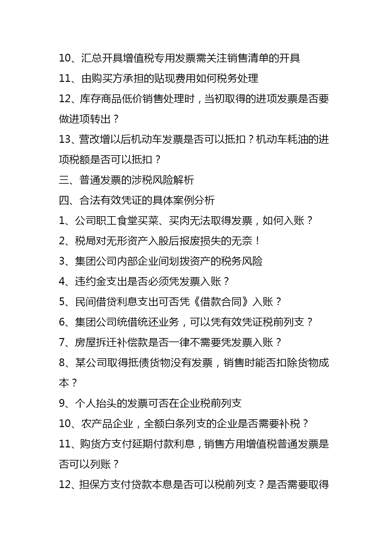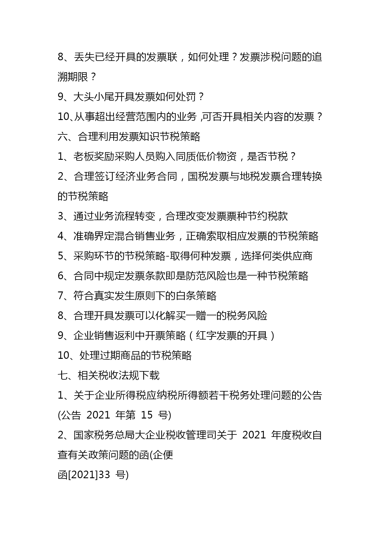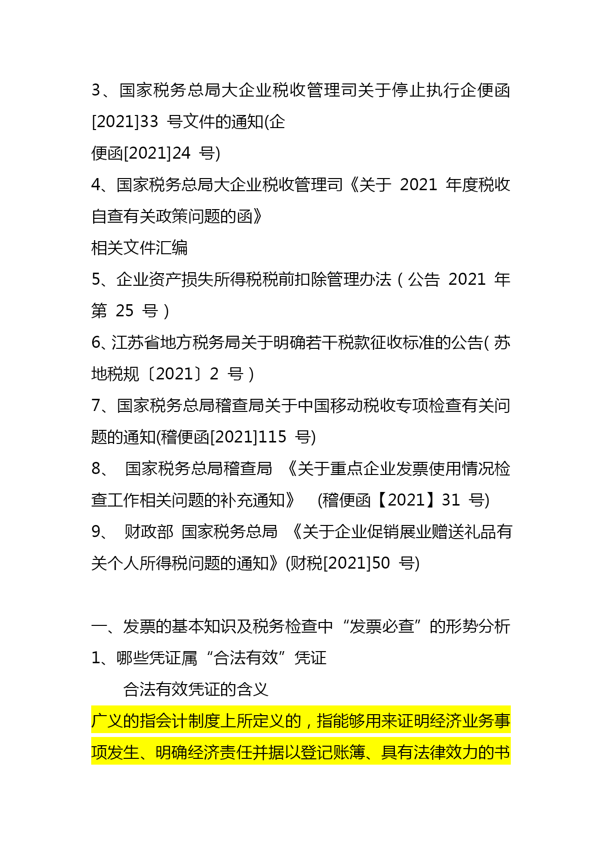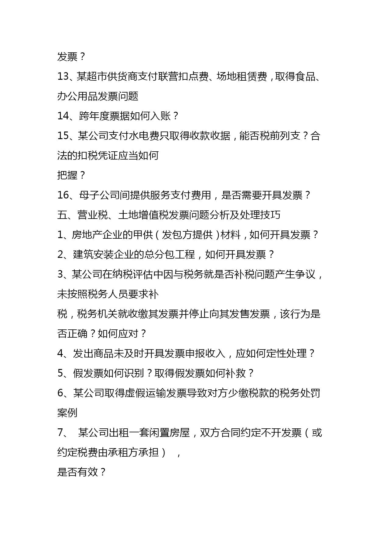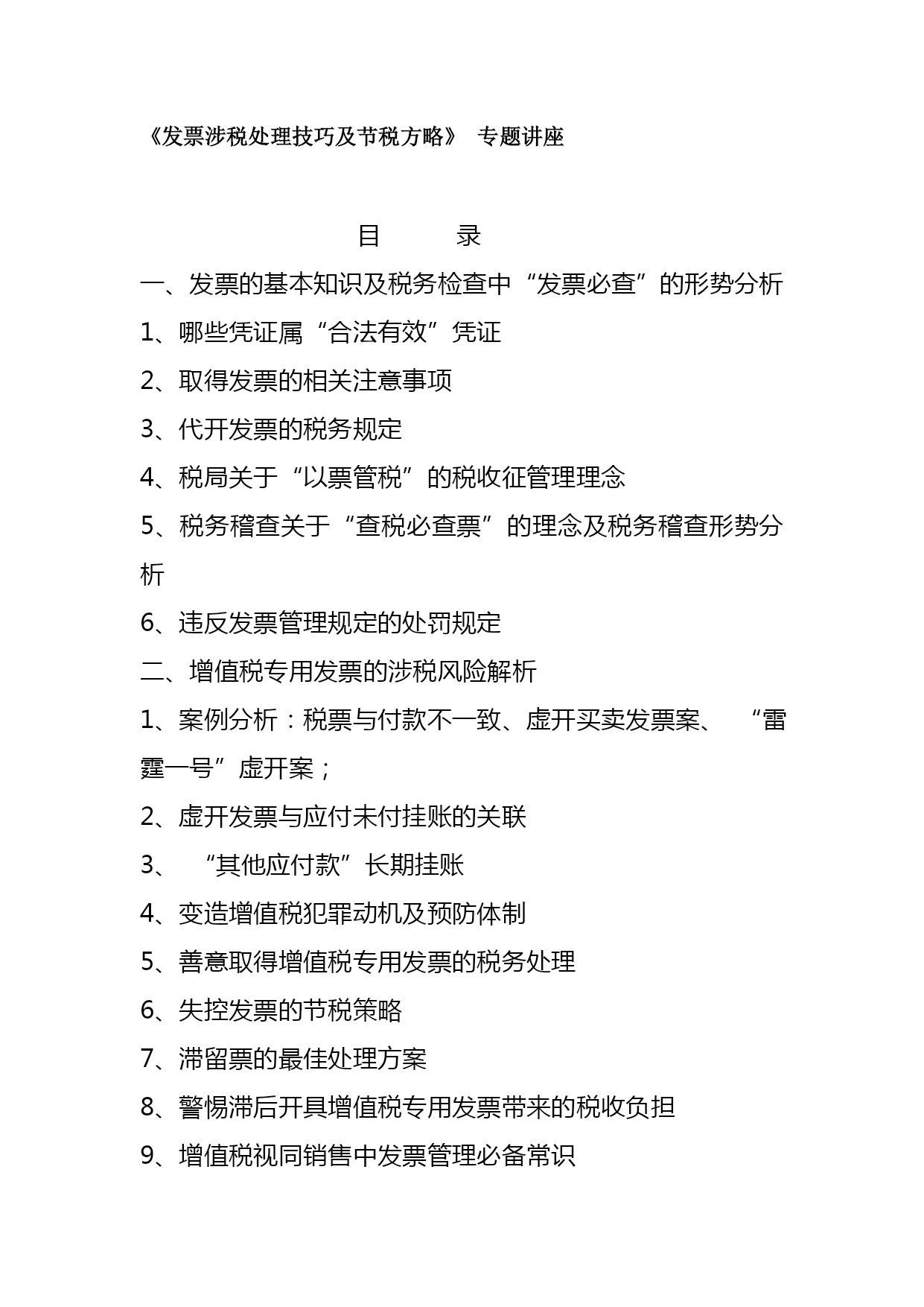 发票培训学习资料(完整版)资料(可以直接使用,可编辑优秀版资料,欢迎下载)《发票涉税处理技巧及节税方略》专题讲座目录一、发票的基本知识及税务检查中“发票必查”的形势分析1、哪些凭证属“合法有效”凭证2、取得发票的相关注意事项3、代开发票的税务规定4、税局关于“以票管税”的税收征管理理念5、税务稽查关于“查税必查票”的理念及税务稽查形势分析6、违反发票管理规定的处罚规定二、增值税专用发票的涉税风险解析1、案例分析:税票与付款不一致、虚开买卖发票案、“雷霆一号”虚开案;2、虚开发票与应付未付挂账的关联3、“其他应付款”长期挂账4、变造增值税犯罪动机及预防体制5、善意取得增值税专用发票的税务处理6、失控发票的节税策略7、滞留票的最佳处理方案8、警惕滞后开具增值税专用发票带来的税收负担9、增值税视同销售中发票管理必备常识10、汇总开具增值税专用发票需关注销售清单的开具11、由购买方承担的贴现费用如何税务处理12、库存商品低价销售处理时,当初取得的进项发票是否要做进项转出?13、营改增以后机动车发票是否可以抵扣?机动车耗油的进项税额是否可以抵扣?三、普通发票的涉税风险解析四、合法有效凭证的具体案例分析1、公司职工食堂买菜、买肉无法取得发票,如何入账?2、税局对无形资产入股后报废损失的无奈!3、集团公司内部企业间划拨资产的税务风险4、违约金支出是否必须凭发票入账?5、民间借贷利息支出可否凭《借款合同》入账?6、集团公司统借统还业务,可以凭有效凭证税前列支?7、房屋拆迁补偿款是否一律不需要凭发票入账?8、某公司取得抵债货物没有发票,销售时能否扣除货物成本?9、个人抬头的发票可否在企业税前列支10、农产品企业,全额白条列支的企业是否需要补税?11、购货方支付延期付款利息,销售方用增值税普通发票是否可以列账?12、担保方支付贷款本息是否可以税前列支?是否需要取得发票?13、某超市供货商支付联营扣点费、场地租赁费,取得食品、办公用品发票问题14、跨年度票据如何入账?15、某公司支付水电费只取得收款收据,能否税前列支?合法的扣税凭证应当如何把握?16、母子公司间提供服务支付费用,是否需要开具发票?五、营业税、土地增值税发票问题分析及处理技巧1、房地产企业的甲供(发包方提供)材料,如何开具发票?2、建筑安装企业的总分包工程,如何开具发票?3、某公司在纳税评估中因与税务就是否补税问题产生争议,未按照税务人员要求补税,税务机关就收缴其发票并停止向其发售发票,该行为是否正确?如何应对?4、发出商品未及时开具发票申报收入,应如何定性处理?5、假发票如何识别?取得假发票如何补救?6、某公司取得虚假运输发票导致对方少缴税款的税务处罚案例7、某公司出租一套闲置房屋,双方合同约定不开发票(或约定税费由承租方承担),是否有效?8、丢失已经开具的发票联,如何处理?发票涉税问题的追溯期限?9、大头小尾开具发票如何处罚?10、从事超出经营范围内的业务,可否开具相关内容的发票?六、合理利用发票知识节税策略1、老板奖励采购人员购入同质低价物资,是否节税?2、合理签订经济业务合同,国税发票与地税发票合理转换的节税策略3、通过业务流程转变,合理改变发票票种节约税款4、准确界定混合销售业务,正确索取相应发票的节税策略5、采购环节的节税策略-取得何种发票,选择何类供应商6、合同中规定发票条款即是防范风险也是一种节税策略7、符合真实发生原则下的白条策略8、合理开具发票可以化解买一赠一的税务风险9、企业销售返利中开票策略(红字发票的开具)10、处理过期商品的节税策略七、相关税收法规下载1、关于企业所得税应纳税所得额若干税务处理问题的公告(公告2021年第15号)2、国家税务总局大企业税收管理司关于2021年度税收自查有关政策问题的函(企便函[2021]33号)3、国家税务总局大企业税收管理司关于停止执行企便函[2021]33号文件的通知(企便函[2021]24号)4、国家税务总局大企业税收管理司《关于2021年度税收自查有关政策问题的函》相关文件汇编5、企业资产损失所得税税前扣除管理办法(公告2021年第25号)6、江苏省地方税务局关于明确若干税款征收标准的公告(苏地税规〔2021〕2号)7、国家税务总局稽查局关于中国移动税收专项检查有关问题的通知(稽便函[2021]115号)8、国家税务总局稽查局《关于重点企业发票使用情况检查工作相关问题的补充通知》(稽便函【2021】31号)9、财政部国家税务总局《关于企业促销展业赠送礼品有关个人所得税问题的通知》(财税[2021]50号)一、发票的基本知识及税务