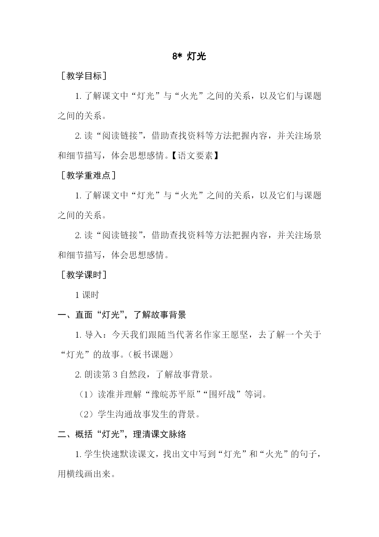 8*灯光[教学目标]1.了解课文中“灯光”与“火光”之间的关系,以及它们与课题之间的关系。2.读“阅读链接”,借助查找资料等方法把握内容,并关注场景和细节描写,体会思想感情。【语文要素】[教学重难点]1.了解课文中“灯光”与“火光”之间的关系,以及它们与课题之间的关系。2.读“阅读链接”,借助查找资料等方法把握内容,并关注场景和细节描写,体会思想感情。[教学课时]1课时一、直面“灯光”,了解故事背景1.导入:今天我们跟随当代著名作家王愿坚,去了解一个关于“灯光”的故事。(板书课题)2.朗读第3自然段,了解