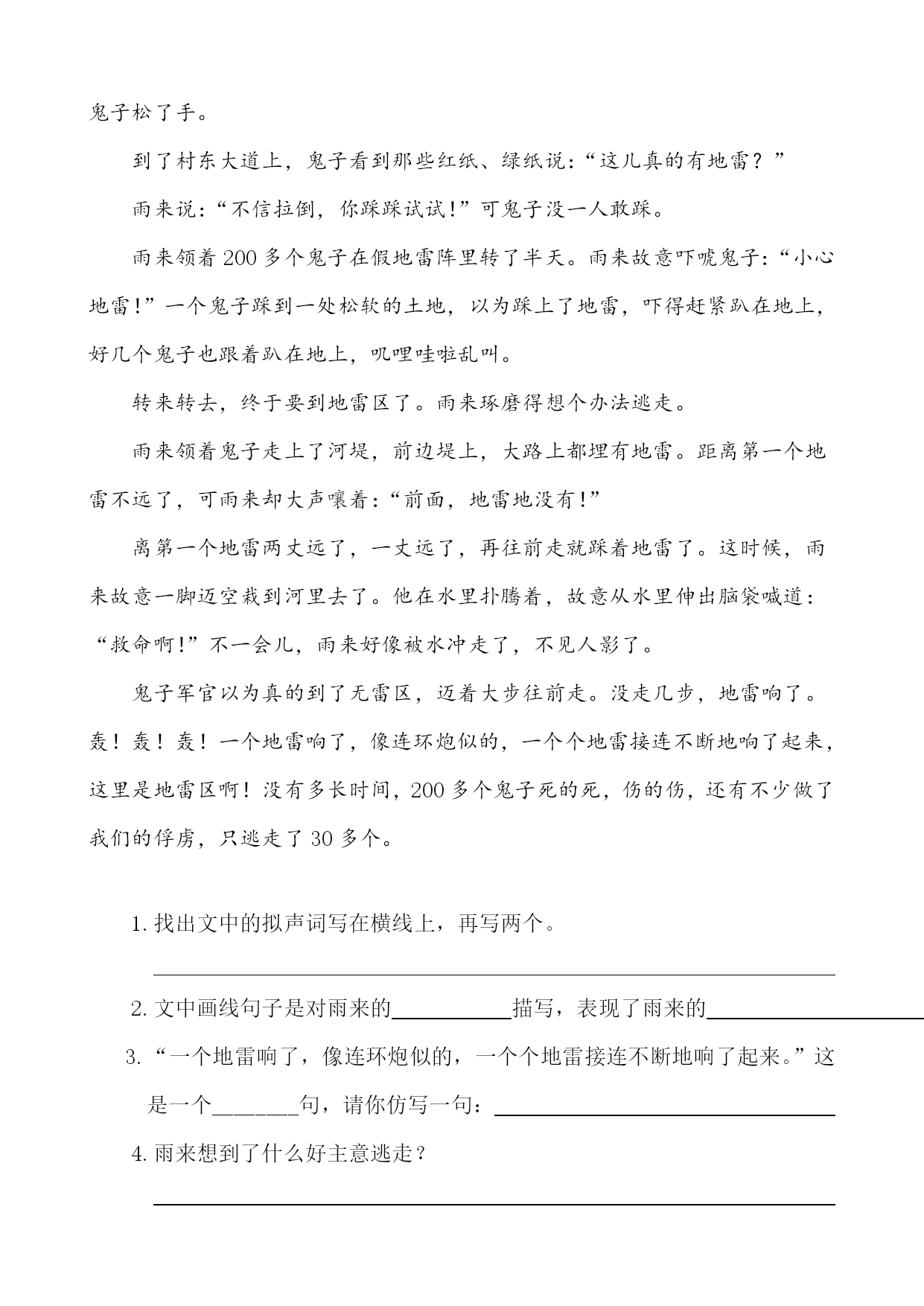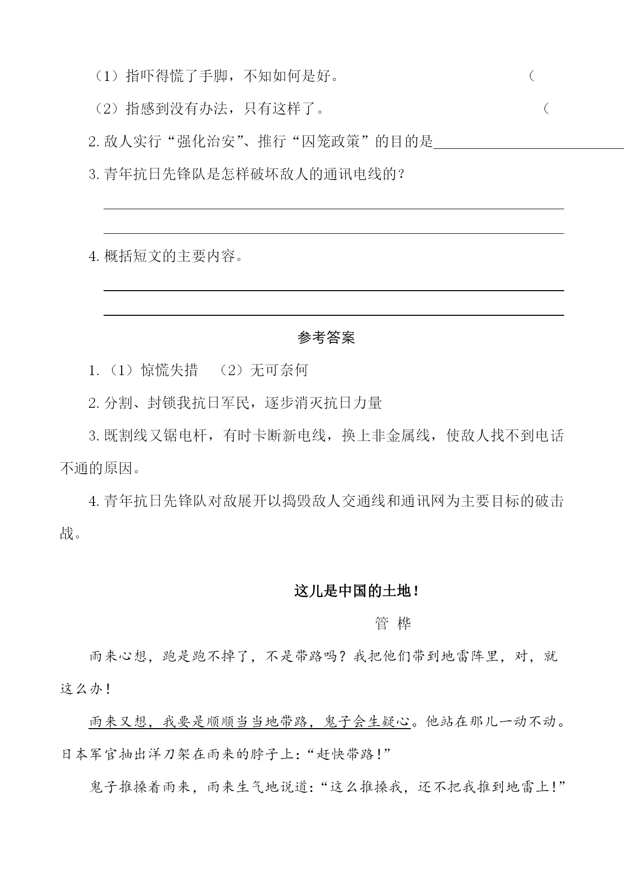 类文阅读-8*灯光晋察冀边区的青年抗日先锋队(节选)陶诗秀1939年,敌人实行“强化治安”、推行“囚笼政策”,强迫群众修公路、挖壕沟、筑围墙、建炮楼,企图分割、封锁我抗日军民,达到逐步消灭抗日力量的目的。在这种情况下,青抗先带头对敌展开以捣毁敌人交通线和通讯网为主要目标的破击战,在这场破铁路、割电线、炸桥梁的特殊战斗中大显身手。当年,冀中献县的几名青抗先队员,将自制炸药装入箩筐,在火药上插支引燃的香,箩筐上绑好纵横交叉的长竿,趁夜色放入河中,让其顺流飘向敌人守卫的商家村桥。当箩筐飘近桥边,长竿即被桥墩所阻