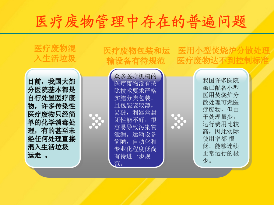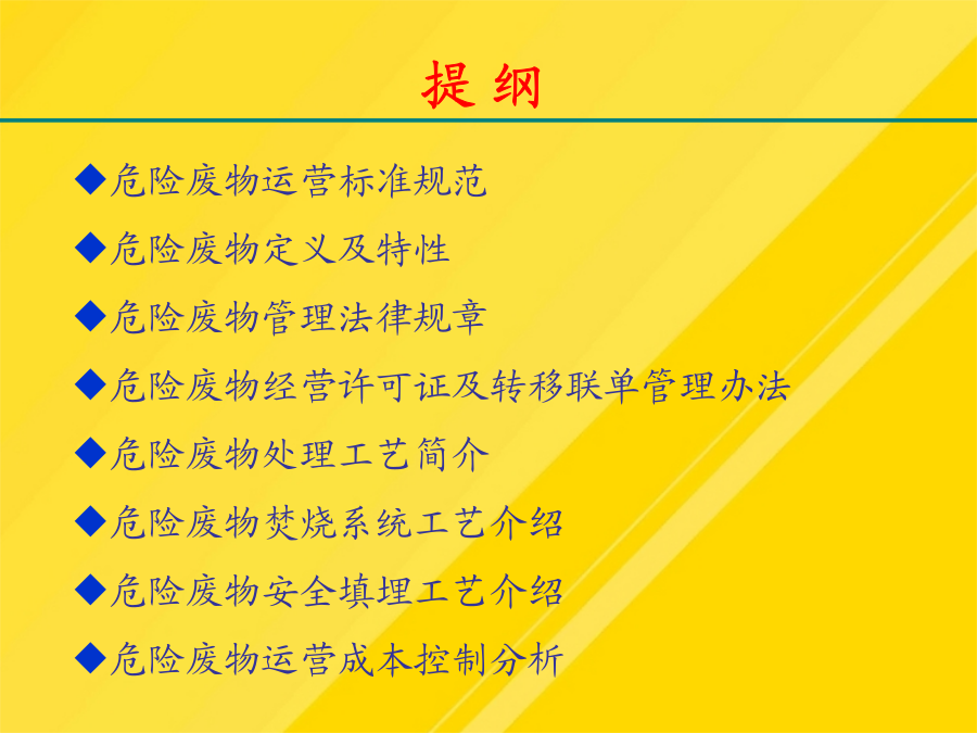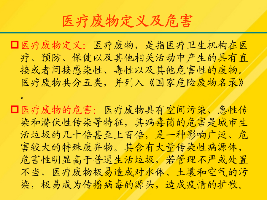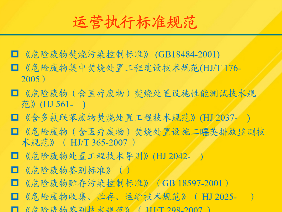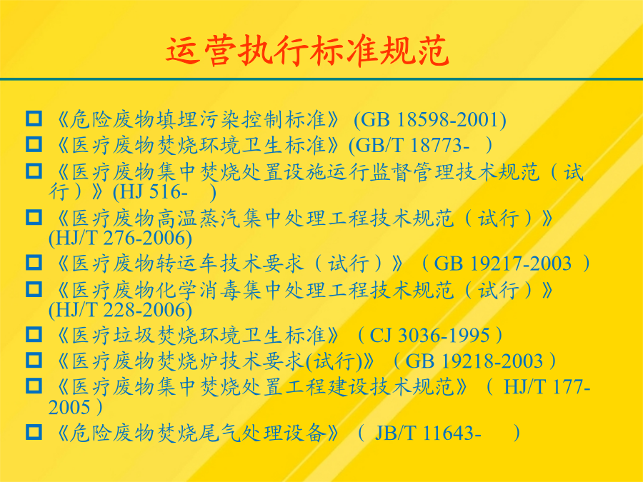 提纲《危险废物焚烧污染控制标准》(GB18484-2001)《危险废物集中焚烧处置工程建设技术规范(HJ/T176-2005)《危险废物(含医疗废物)焚烧处置设施性能测试技术规范》(HJ561-)《含多氯联苯废物焚烧处置工程技术规范》(HJ2037-)《危险废物(含医疗废物)焚烧处置设施二噁英排放监测技术规范》(HJ/T365-2007)《危险废物处置工程技术导则》(HJ2042-)《危险废物鉴别标准》()《危险废物贮存污染控制标准》(GB18597-2001)《危险废物收集、贮存、运输技术规范》(HJ2025-)《危险废物鉴别技术规范》(HJ/T298-2007)《危险废物填埋污染控制标准》(GB18598-2001)《医疗废物焚烧环境卫生标准》(GB/T18773-)《医疗废物集中焚烧处置设施运行监督管理技术规范(试行)》(HJ516-)《医疗废物高温蒸汽集中处理工程技术规范(试行)》(HJ/T276-2006)《医疗废物转运车技术要求(试行)》(GB19217-2003)《医疗废物化学消毒集中处理工程技术规范(试行)》(HJ/T228-2006)《医疗垃圾焚烧环境卫生标准》(CJ3036-1995)《医疗废物焚烧炉技术要求(试行)》(GB19218-2003)《医疗废物集中焚烧处置工程建设技术规范》(HJ/T177-2005)《危险废物焚烧尾气处理设备》(JB/T11643-)医疗废物定义:医疗废物,是指医疗卫生机构在医疗、预防、保健以及其他相关活动中产生的具有直接或者间接感染性、毒性以及其他危害性的废物。医疗废物共分五类,并列入《国家危险废物名录》。医疗废物的危害:医疗废物具有空间污染、急性传染和潜伏性传染等特征,其病毒菌的危害是城市生活垃圾的几十倍甚至上百倍,是一种影响广泛、危害较大的特殊废弃物。其含有大量传染性病源体,危害性明显高于普通生活垃圾,若管理不严或处置不当,医疗废物极易造成对水体、土壤和空气的污染,极易成为传播病毒的源头,造成疫情的扩散。医疗废物损伤性医疗废物医疗废物热解气化焚烧炉携带病原微生物具有引发感染性疾病传播危险的医疗废物5、废弃的血液、血清。决定等离子体作用的主要因素:设备功率和所能提供的能量,输出能量越高、产生的温度转换越快,另外必须满足规定的处理时间周期,废物特性对电磁波作用有影响。医疗废物密封收集车及周转箱使用后应在医疗废物处置中心的清洗消毒间冲洗消毒,消毒、清洗的目的是杀灭收集车、周转箱可能携带的各种致病菌,以便再次投入使用。由于医疗废物中混有大量塑料等有机合成物质,因此焚烧时极易产生二恶英、多环芳香族化合物、多氯联苯等剧毒物及氯化氢、氟化氢和二氧化硫等有害气体,需要配置完善的尾气净化系统。决定等离子体作用的主要因素:设备功率和所能提供的能量,输出能量越高、产生的温度转换越快,另外必须满足规定的处理时间周期,废物特性对电磁波作用有影响。控制系统构成包括硬件及软件两部分。这种方法也适用于受污染的工作服、注射器、敷料、微生物培养基等的消毒,但是不适宜处理病理性垃圾,如人体组织和动物尸体等,对药物和化学垃圾的处理效率也不高。携带病原微生物具有引发感染性疾病传播危险的医疗废物决定化学消毒法效果的因素主要有消毒剂浓度和作用温度,根据废物性质选择具有相应pH值的消毒剂,废物和药剂接触混合时间、流体的再循环等也是重要因素。卫生填埋法是医疗废物的最终处置方法,其原理是将垃圾埋入地下,通过微生物长期的分解作用,使之分解为无害的物质。生活垃圾焚烧定义及简介《危险废物填埋污染控制标准》(GB18598-2001)医疗废物热解气化焚烧炉工艺流程冲洗消毒后的污水由单独的排水管道系统收集送至厂区污水处理系统处理。高温蒸汽灭菌法处理流程焚烧法的优点:体积和重量显著减少,废物毁形明显;《危险废物(含医疗废物)焚烧处置设施二噁英排放监测技术规范》(HJ/T365-2007)过期、淘汰、变质或者被污染的废弃的药品灭菌后的物料由灭菌器的后门推出,将小推车推至提升机料斗内,将内车中的物料提升倾倒至破碎机的漏斗内,整个提升机需要设有上下限位行程开关和自动制动系统,破碎机处理能力为1t/h。应用了有机物高温下缺氧热解气化的原理,实现了垃圾先气化后燃烧这一对环境最为有利的处理方式。2、废弃的化学消毒剂等进料系统、焚烧系统、冷却系统、烟气净化系统、自动控制系统、除渣系统。热水或产生蒸汽,适于就《危险废物处置工程技术导则》(HJ2042-)消毒过程迅速一次性少,运行费用低。《危险废物填埋污染控制标准》(GB18598-2001)《医疗废物集中焚烧处置设施运行监督管理技术规范(试行)》(HJ516-)《医疗废物焚烧环境卫生标准》(GB/T187