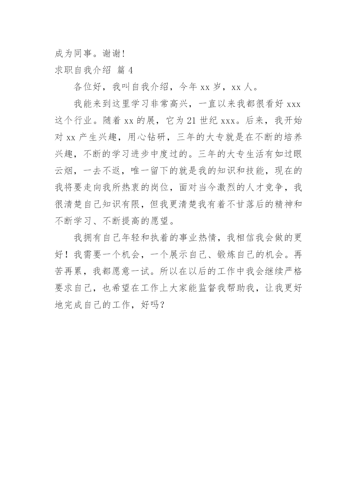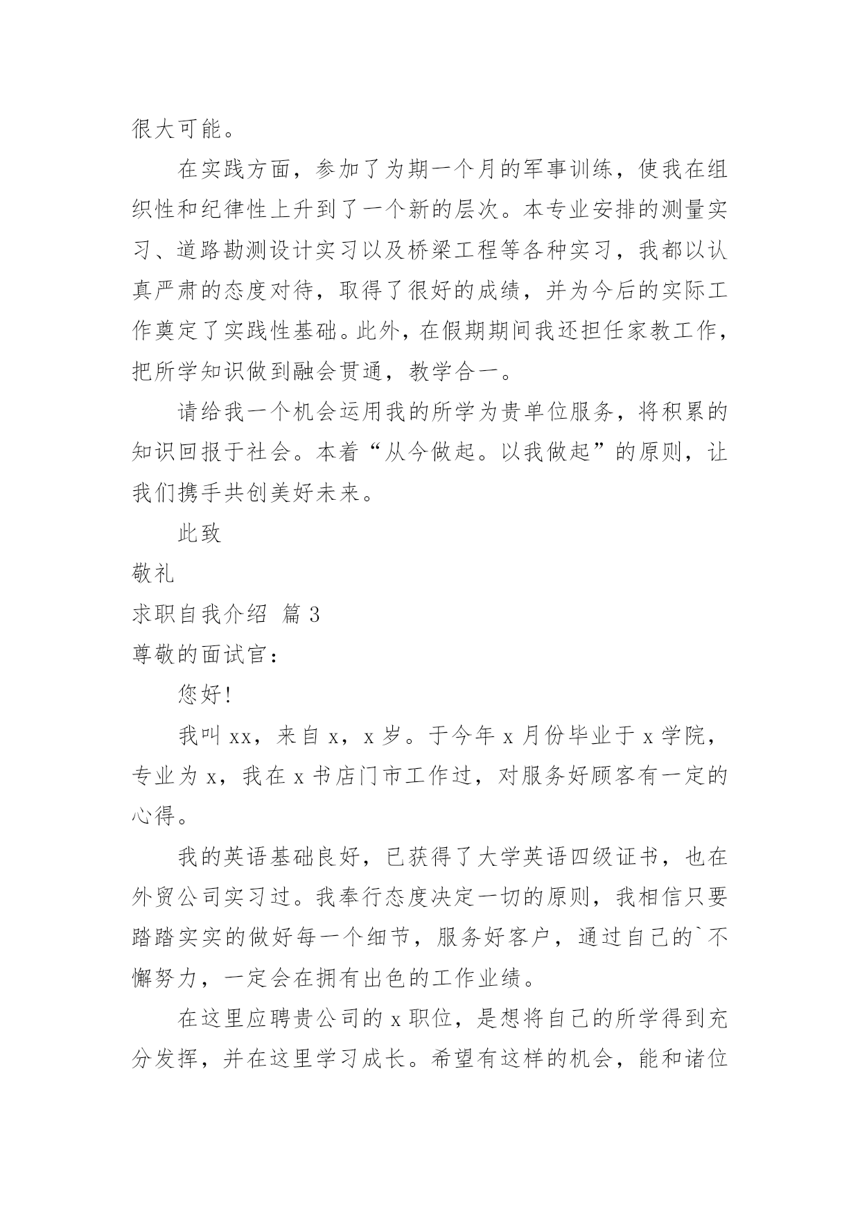 求职自我介绍【实用】求职自我介绍范文4篇当到达一个陌生的环境后,我们有必要对自己进行适当的介绍,自我介绍是人与人进行沟通的出发点。千万不能认为自我介绍随便应付就可以,以下是小编整理的求职自我介绍6篇,希望能够帮助到大家。求职自我介绍篇1各位领导、老师:您们好!很高兴今天能有机会在这里向各位领导、老师请教与学习,我是来自西南大学xx学院的xx。我今天应聘的职位是高中物理教师,我相信经过大学四年师范教育的专业培养,我初步具备了作为一名合格物理教师应该具有的基本素质。在大学期间,我努力学习,物理专业学习成绩不差。平时利用周末带过高二的物理家教。暑期在教育培训机构做过兼职老师,教过初二初三高一高二的物理课程。同时我还在重庆市实验中学实习了四个月,兼任高二国际班的实习班主任和任课教师,协助导师处理了大量的班主任工作,并承担了三个文科班的全部物理教学和两个理科班的部分教学内容,在实习的日子里我的讲课能力、沟通交流能力、组织管理能力得到很大的锻炼和提高。所以,我认为自己在大学四年所学的知识、所掌握的教学技能及所具有的综合能力能够胜任贵校教师的职位。各位领导、各位老师,或许我不是令您们最满意的,但我相信“天道酬勤”,依靠我的努力,我将会是最合适的!或许我不是最优秀的,但我会是最踏实、最负责、最具有潜力的!希望各位领导、老师能够给我这个机会。谢谢!求职自我介绍篇2尊敬的领导:您好!我是xx专业的一名xx级应届本科毕业生,通过四年的学习尤其是两年的专业课学习,我认为自己已基本掌握了道路桥梁施工和设计的一些基本知识,通过在工作岗位上的一段时间实践后能胜任单位安排给我的工作。通过三年多的学习,我的总成绩排在xx专业第三名的位置。各门功课尤其是专业课成绩一般都很优秀,我想这是三年来自己勤奋、好学并刻苦努力的结果。这种敬业精神我认为在今后的工作中对于尽好本职仍能起到很好的作用。我顺利通过大学英语四级和六级考试,并且六级取得xx分的好成绩。本人具有计算机基础知识和使用FORTRAN77、C语言等高级计算机程序设计语言编制程序、上机调试及运用的能力,于20xx年通过全国高等学校计算机考试(CCT)并获得“优秀”证书,同年顺利通过国家二级考试。此外,还学过一年的德语,具有初步会话的能力,并为进一步发展提供很大可能。在实践方面,参加了为期一个月的军事训练,使我在组织性和纪律性上升到了一个新的层次。本专业安排的测量实习、道路勘测设计实习以及桥梁工程等各种实习,我都以认真严肃的态度对待,取得了很好的成绩,并为今后的实际工作奠定了实践性基础。此外,在假期期间我还担任家教工作,把所学知识做到融会贯通,教学合一。请给我一个机会运用我的所学为贵单位服务,将积累的知识回报于社会。本着“从今做起。以我做起”的原则,让我们携手共创美好未来。此致敬礼求职自我介绍篇3尊敬的面试官:您好!我叫xx,来自x,x岁。于今年x月份毕业于x学院,专业为x,我在x书店门市工作过,对服务好顾客有一定的心得。我的英语基础良好,已获得了大学英语四级证书,也在外贸公司实习过。我奉行态度决定一切的原则,我相信只要踏踏实实的做好每一个细节,服务好客户,通过自己的`不懈努力,一定会在拥有出色的工作业绩。在这里应聘贵公司的x职位,是想将自己的所学得到充分发挥,并在这里学习成长。希望有这样的机会,能和诸位成为同事。谢谢!求职自我介绍篇4各位好,我叫自我介绍,今年xx岁,xx人。我能来到这里学习非常高兴,一直以来我都很看好xxx这个行业。随着xx的展,它为21世纪xxx。后来,我开始对xx产生兴趣,用心钻研,三年的大专就是在不断的培养兴趣,不断的学习进步中度过的。三年的大专生活有如过眼云烟,一去不返,唯一留下的就是我的知识和技能,现在的我将要走向我所热衷的岗位,面对当今激烈的人才竞争,我很清楚自己知识有限,但我更清楚我有着不甘落后的精神和不断学习、不断提高的愿望。我拥有自己年轻和执着的事业热情,我相信我会做的更好!我需要一个机会,一个展示自己、锻炼自己的机会。再苦再累,我都愿意一试。所以在以后的工作中我会继续严格要求自己,也希望在工作上大家能监督我帮助我,让我更好地完成自己的工作,好吗?