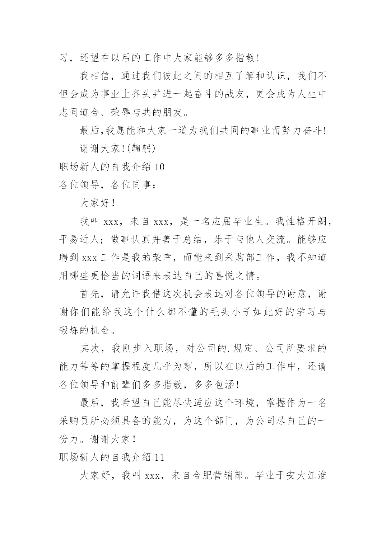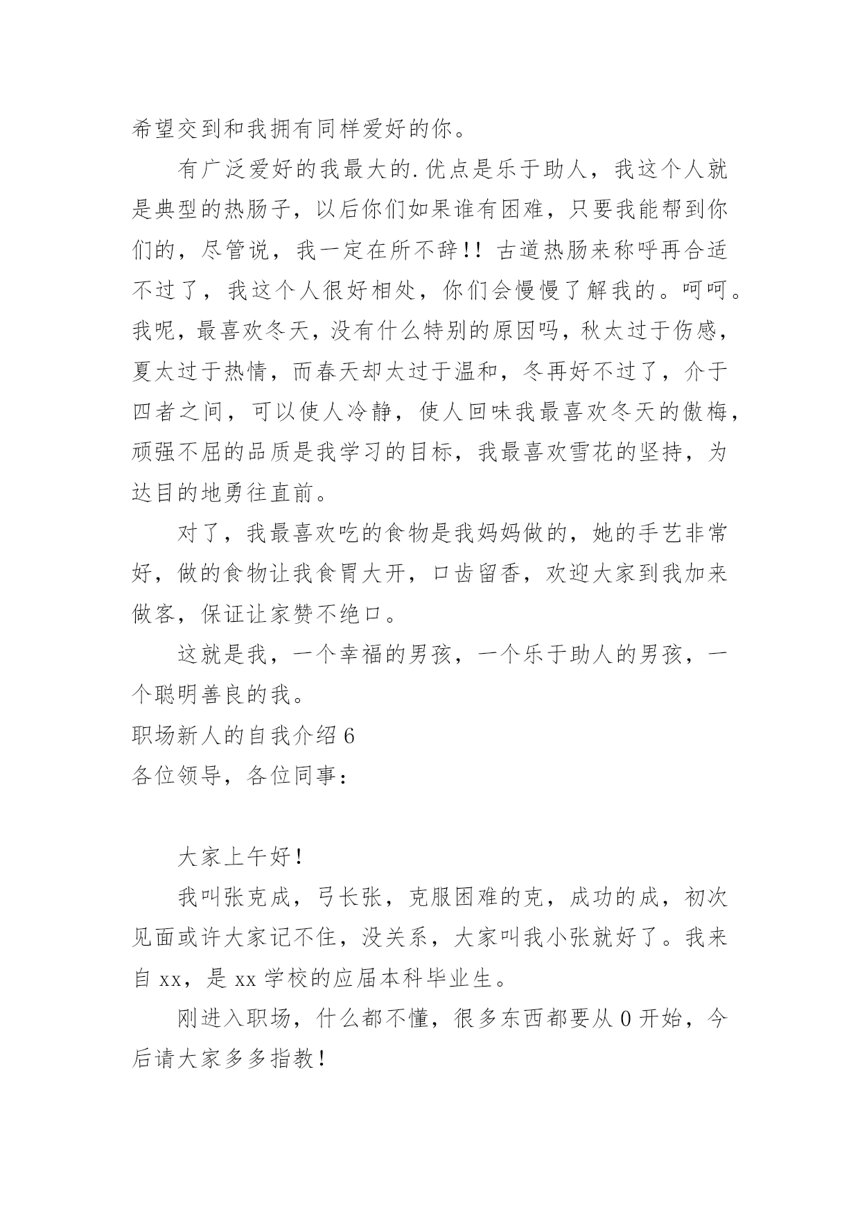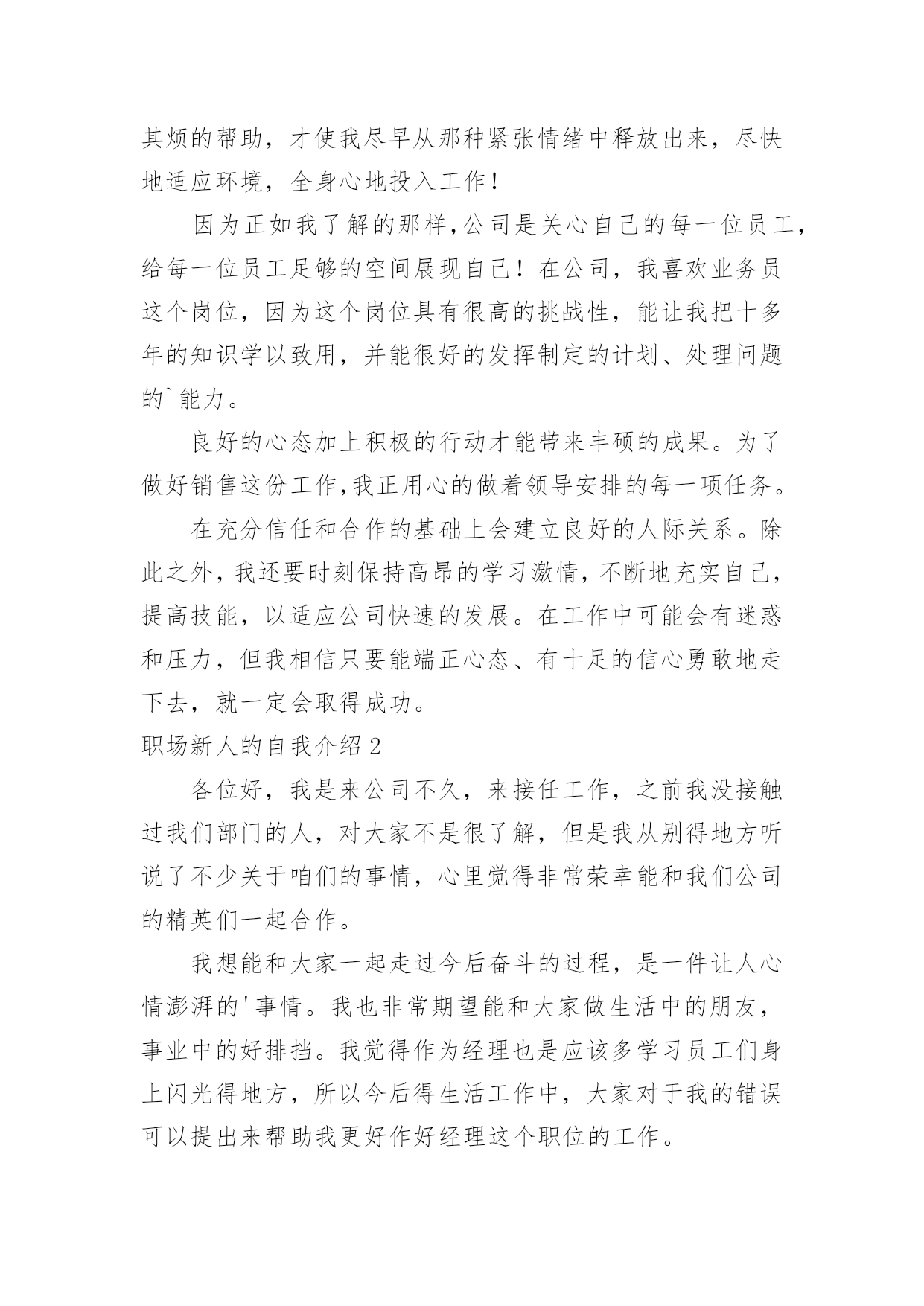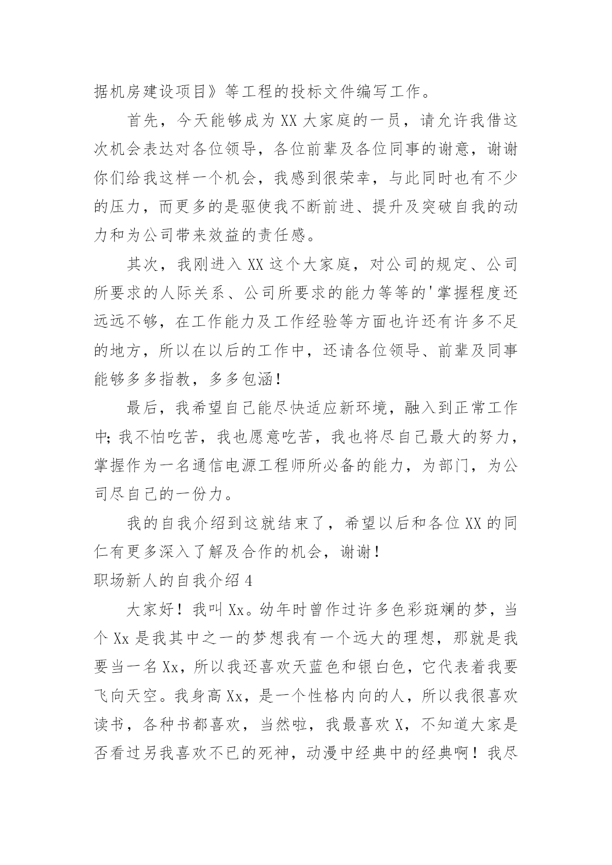 职场新人的自我介绍职场新人的自我介绍15篇当来到一个陌生环境中,时常要进行自我介绍,自我介绍是让陌生人彼此认识的好方法。那么我们该怎么去写自我介绍呢?下面是小编精心整理的职场新人的自我介绍,仅供参考,大家一起来看看吧。职场新人的自我介绍1各位同事:上午好!我来到公司虽然只有一个月的时间,但在这短短的一个月里。却让我感到公司领导对工作的精益求精、不断创新以及培养团队的合作精神,让我感到加入公司是一次职场生涯的正确选择;能荣幸成为公司大家庭的一份子,我感到无比自豪。相信这种自豪感将使我更有激情的投入到工作中作为一名进入一个全新工作环境的新员工来说,尽管在过去的工作中积累了一定的工作经验。但刚入公司,难免还是有一个适应期。为了能让自己尽入工作状态和适应新的环境,有问题及时请教同事。积极学习工作所需要的各项专业知识,努力提高自己的业务水平,在这里我要特别感谢在这段时间帮助过我的领导和同事。正是因为有了他们无微不至的关怀和不厌其烦的帮助,才使我尽早从那种紧张情绪中释放出来,尽快地适应环境,全身心地投入工作!因为正如我了解的那样,公司是关心自己的每一位员工,给每一位员工足够的空间展现自己!在公司,我喜欢业务员这个岗位,因为这个岗位具有很高的挑战性,能让我把十多年的知识学以致用,并能很好的发挥制定的计划、处理问题的`能力。良好的心态加上积极的行动才能带来丰硕的成果。为了做好销售这份工作,我正用心的做着领导安排的每一项任务。在充分信任和合作的基础上会建立良好的人际关系。除此之外,我还要时刻保持高昂的学习激情,不断地充实自己,提高技能,以适应公司快速的发展。在工作中可能会有迷惑和压力,但我相信只要能端正心态、有十足的信心勇敢地走下去,就一定会取得成功。职场新人的自我介绍2各位好,我是来公司不久,来接任工作,之前我没接触过我们部门的人,对大家不是很了解,但是我从别得地方听说了不少关于咱们的事情,心里觉得非常荣幸能和我们公司的精英们一起合作。我想能和大家一起走过今后奋斗的过程,是一件让人心情澎湃的'事情。我也非常期望能和大家做生活中的朋友,事业中的好排挡。我觉得作为经理也是应该多学习员工们身上闪光得地方,所以今后得生活工作中,大家对于我的错误可以提出来帮助我更好作好经理这个职位的工作。我对咱们这边得业务还不是很熟悉,希望大家在以后的工作中多多支持,我也会虚心向大家学习的。希望在我们一块合作的日子里,大家能非常愉快得完成每一项工作任务,谢谢大家。职场新人的自我介绍3尊敬的各位XX的领导,前辈,同事:大家好!我叫陈X,来自广东X,20X年毕业于X大学,所学专业为建筑环境与设备工程专业——建筑电气方向。学业方面,成绩在班级排名前20%,并担任班级组织委员及秘书部副部长等职,多次获得XX大学奖学金;性格方面,我动得起又静得下,容易与人相处;做事方面,秉持踏实、严谨及负责的工作作风,并能与同事交流协作。在过去的近一年时间里,我就职于X一家计算机机房工程公司,担任技术部助理电气工程师一职。在职期间,凭借扎实的专业基础知识,秉持谦虚、踏实、负责及严谨的态度,在公司领导及同事的协作下迅速完成从一名刚毕业的毛头小子到一名职业人的转变。具体工作方面,我主要协助电气工程师(高级职称)完成机房UPS系统及其它相关电气系统的设计工作,参与电气工程前期设计、预算及投标等阶段工作。主要业绩:参与完成《长城宽带X路数据中心机房建设项目》、《X开发区地税局数据机房建设项目》、《X职业技术学院监控机房建设项目》、《X市中心医院网络中心建设项目》及《X科技大学数据机房建设项目》等工程的投标文件编写工作。首先,今天能够成为XX大家庭的一员,请允许我借这次机会表达对各位领导,各位前辈及各位同事的谢意,谢谢你们给我这样一个机会,我感到很荣幸,与此同时也有不少的压力,而更多的是驱使我不断前进、提升及突破自我的动力和为公司带来效益的责任感。其次,我刚进入XX这个大家庭,对公司的规定、公司所要求的人际关系、公司所要求的能力等等的'掌握程度还远远不够,在工作能力及工作经验等方面也许还有许多不足的地方,所以在以后的工作中,还请各位领导、前辈及同事能够多多指教,多多包涵!最后,我希望自己能尽快适应新环境,融入到正常工作中;我不怕吃苦,我也愿意吃苦,我也将尽自己最大的努力,掌握作为一名通信电源工程师所必备的能力,为部门,为公司尽自己的一份力。我的自我介绍到这就结束了,希望以后和各位XX的同仁有更多深入了解及合作的机会,谢谢!职场新人的自我介绍4大家好!我叫Xx。幼年时曾作过许多色彩斑斓的梦,当个Xx是我其中之一的梦想我有一个远大的理想,那就是我要当一名Xx,所以我还喜欢天蓝色和银白色,它代表着我要飞向天空。我身高Xx,是一个性格内向的人,所以我很喜欢读书,各种书都喜欢,当然啦,我最喜欢X,不知道大家是