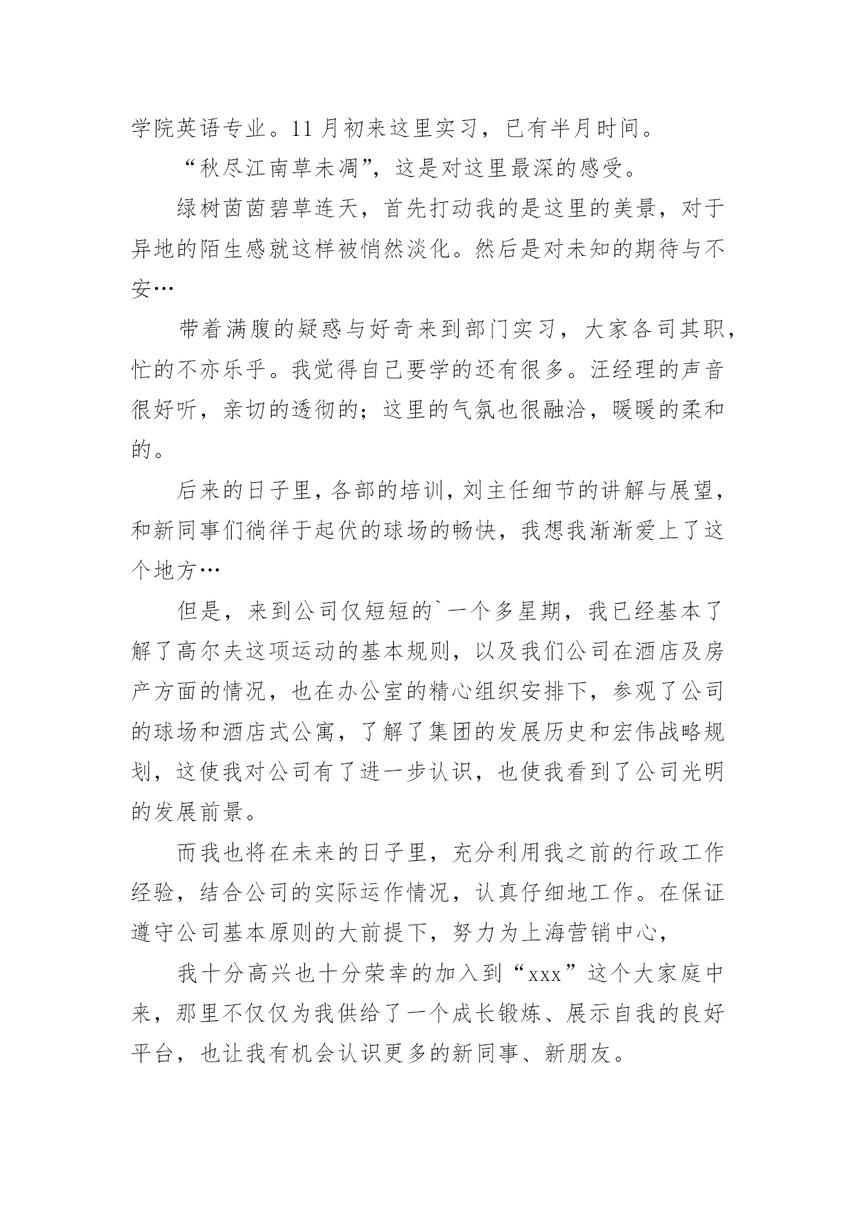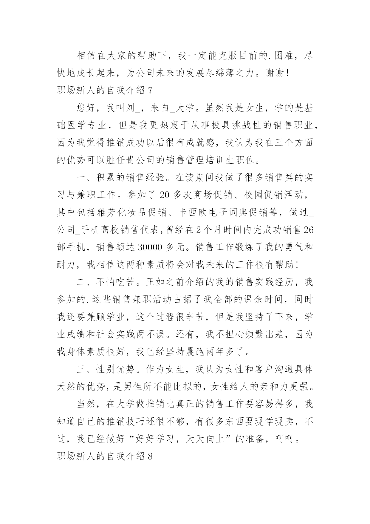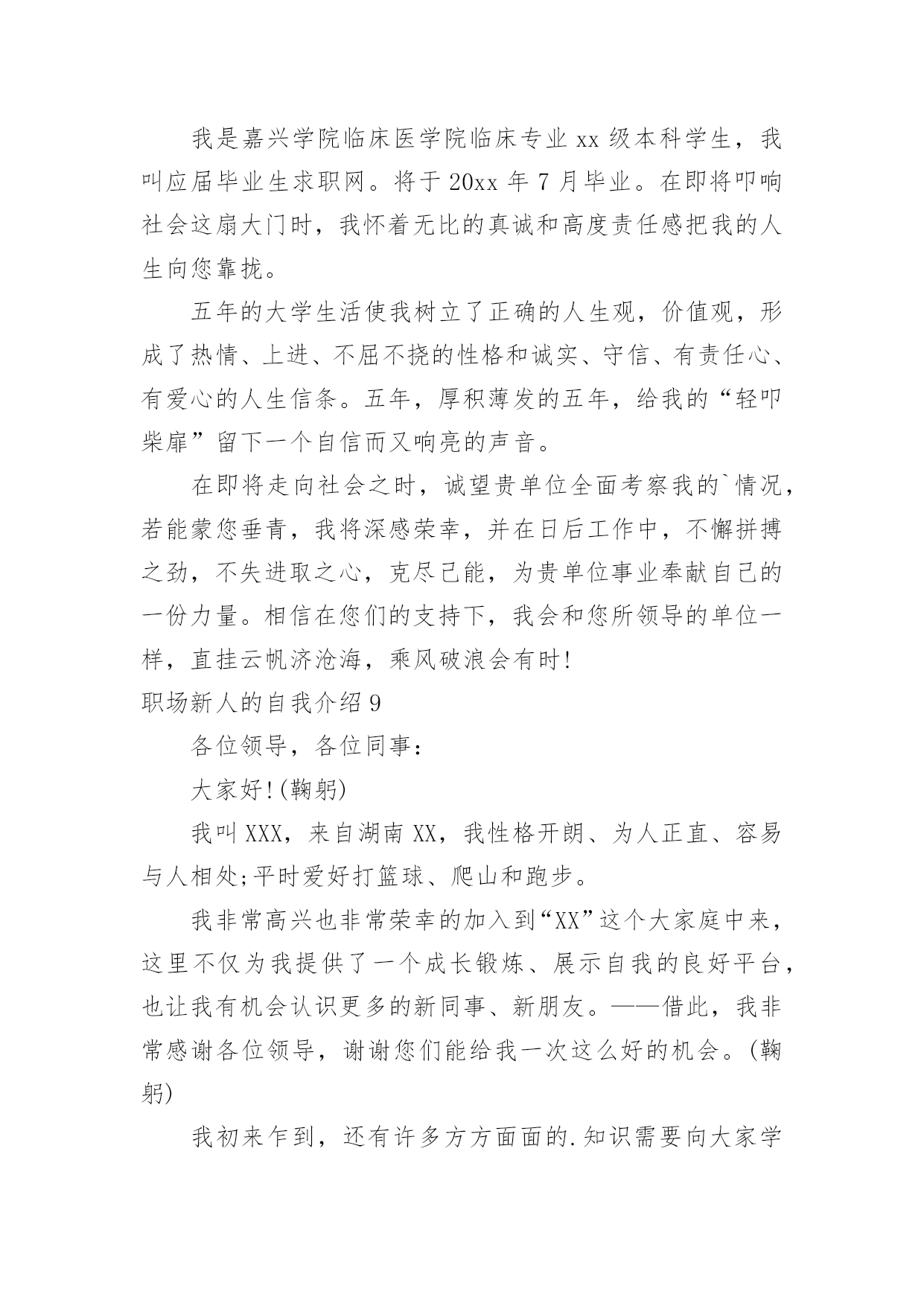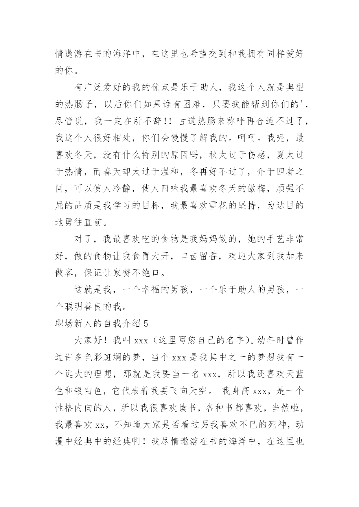 职场新人的自我介绍职场新人的自我介绍15篇当来到一个陌生环境中,时常要进行自我介绍,自我介绍是让陌生人彼此认识的好方法。那么我们该怎么去写自我介绍呢?下面是小编精心整理的职场新人的自我介绍,仅供参考,大家一起来看看吧。职场新人的自我介绍1各位同事:上午好!我来到公司虽然只有一个月的时间,但在这短短的一个月里。却让我感到公司领导对工作的精益求精、不断创新以及培养团队的合作精神,让我感到加入公司是一次职场生涯的正确选择;能荣幸成为公司大家庭的一份子,我感到无比自豪。相信这种自豪感将使我更有激情的投入到工作中作为一名进入一个全新工作环境的新员工来说,尽管在过去的工作中积累了一定的工作经验。但刚入公司,难免还是有一个适应期。为了能让自己尽入工作状态和适应新的环境,有问题及时请教同事。积极学习工作所需要的各项专业知识,努力提高自己的业务水平,在这里我要特别感谢在这段时间帮助过我的领导和同事。正是因为有了他们无微不至的关怀和不厌其烦的帮助,才使我尽早从那种紧张情绪中释放出来,尽快地适应环境,全身心地投入工作!因为正如我了解的那样,公司是关心自己的每一位员工,给每一位员工足够的空间展现自己!在公司,我喜欢业务员这个岗位,因为这个岗位具有很高的挑战性,能让我把十多年的知识学以致用,并能很好的发挥制定的计划、处理问题的`能力。良好的心态加上积极的行动才能带来丰硕的成果。为了做好销售这份工作,我正用心的做着领导安排的每一项任务。在充分信任和合作的基础上会建立良好的人际关系。除此之外,我还要时刻保持高昂的学习激情,不断地充实自己,提高技能,以适应公司快速的发展。在工作中可能会有迷惑和压力,但我相信只要能端正心态、有十足的信心勇敢地走下去,就一定会取得成功。职场新人的自我介绍2各位好,我是来公司不久,来接任工作,之前我没接触过我们部门的人,对大家不是很了解,但是我从别得地方听说了不少关于咱们的事情,心里觉得非常荣幸能和我们公司的精英们一起合作。我想能和大家一起走过今后奋斗的过程,是一件让人心情澎湃的'事情。我也非常期望能和大家做生活中的朋友,事业中的好排挡。我觉得作为经理也是应该多学习员工们身上闪光得地方,所以今后得生活工作中,大家对于我的错误可以提出来帮助我更好作好经理这个职位的工作。我对咱们这边得业务还不是很熟悉,希望大家在以后的工作中多多支持,我也会虚心向大家学习的。希望在我们一块合作的日子里,大家能非常愉快得完成每一项工作任务,谢谢大家。职场新人的自我介绍3尊敬的各位XX的领导,前辈,同事:大家好!我叫陈X,来自广东X,20X年毕业于X大学,所学专业为建筑环境与设备工程专业——建筑电气方向。学业方面,成绩在班级排名前20%,并担任班级组织委员及秘书部副部长等职,多次获得XX大学奖学金;性格方面,我动得起又静得下,容易与人相处;做事方面,秉持踏实、严谨及负责的工作作风,并能与同事交流协作。在过去的近一年时间里,我就职于X一家计算机机房工程公司,担任技术部助理电气工程师一职。在职期间,凭借扎实的专业基础知识,秉持谦虚、踏实、负责及严谨的态度,在公司领导及同事的协作下迅速完成从一名刚毕业的毛头小子到一名职业人的转变。具体工作方面,我主要协助电气工程师(高级职称)完成机房UPS系统及其它相关电气系统的设计工作,参与电气工程前期设计、预算及投标等阶段工作。主要业绩:参与完成《长城宽带X路数据中心机房建设项目》、《X开发区地税局数据机房建设项目》、《X职业技术学院监控机房建设项目》、《X市中心医院网络中心建设项目》及《X科技大学数据机房建设项目》等工程的投标文件编写工作。首先,今天能够成为XX大家庭的一员,请允许我借这次机会表达对各位领导,各位前辈及各位同事的谢意,谢谢你们给我这样一个机会,我感到很荣幸,与此同时也有不少的压力,而更多的是驱使我不断前进、提升及突破自我的动力和为公司带来效益的责任感。其次,我刚进入XX这个大家庭,对公司的规定、公司所要求的人际关系、公司所要求的能力等等的'掌握程度还远远不够,在工作能力及工作经验等方面也许还有许多不足的地方,所以在以后的工作中,还请各位领导、前辈及同事能够多多指教,多多包涵!最后,我希望自己能尽快适应新环境,融入到正常工作中;我不怕吃苦,我也愿意吃苦,我也将尽自己最大的努力,掌握作为一名通信电源工程师所必备的能力,为部门,为公司尽自己的一份力。我的自我介绍到这就结束了,希望以后和各位XX的同仁有更多深入了解及合作的机会,谢谢!职场新人的自我介绍4大家好!我叫Xx。幼年时曾作过许多色彩斑斓的梦,当个Xx是我其中之一的梦想我有一个远大的理想,那就是我要当一名Xx,所以我还喜欢天蓝色和银白色,它代表着我要飞向天空。我身高Xx,是一个性格内向的人,所以我很喜欢读书,各种书都喜欢,当然啦,我最喜欢X,不知道大家是