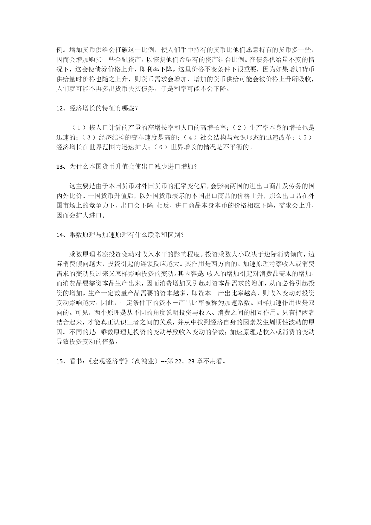 复习:在浮动汇率情况下,国际收支平衡机制如何?在浮动汇率情况下,国际收支平衡的机制是汇率变动。逆差导致本币贬值,净出口增加,逆差减少,趋国际收支平衡;顺差则导致本币升值,进行反方向的调整。在固定汇率情况下,国际收支平衡机制如何?在固定汇率情况下,国际收支平衡的机制是货币供给量的变化。顺差导致本币升值的压力,为了维持固定汇率,中央银行必须投放本币、回收外币。货币扩张一方面使利率下降,资本流出增加,顺差减少;另一方面使需求增加,收入增加,进口增加,顺差减少。这样,顺差逐渐趋于国际收支平衡。逆差则会导致货币收缩,以及进一步的调整,最后使逆差减少,趋于国际收支平衡。在顺差的萧条经济情况下,应该采取怎样的宏观经济政策?(1)扩张货币一方面使顺差减少,但同时使净出口减少,需求减少,产出减少,所以可取;(2)本币升值固然可以使顺差减少,但同时使净出口减少,需求减少,产出减少,所以不可取。4、在顺差的过热经济情况下,应该采取怎样的宏观经济政策?(1)紧缩货币可以使需求减少。同时,紧缩货币导致收入减少,进口减少,顺差增加;另一方面紧缩货币导致利息率提高,资本净流出减少,顺差增加。因此,紧缩货币政策不具有兼容性;(2)本币升值一方面使顺差减少,另一方面使净出口减少,需求减少。所以,本币升值政策具有兼容性。为什么边际消费倾向越大,边际税率越小,财政政策的效果越小?边际消费倾向越大,边际税率越小,投资乘数越大。因此,当扩张财政使利率上升并挤出私人部门投资时,国民收入减少得越多,即挤出效应越大,因而财政政策效果越小。在IS-LM模型中,边际消费倾向越大,边际税率越小,IS曲线就越平缓,这时财政政策就越小。6、简述经济增长的含义。(1)经济增长集中体现在经济实力的增长上,而这种增长就是商品和劳务总量的增加。(2)技术进步是实现经济增长的必要条件。(3)经济增长的条件是制度与意识的相应调整。7、为什么国际收支平衡表总是平衡的?为什么一国国际收支还存在着顺差或逆差?(1)一国的国际收支平衡表从形式上看总是平衡的,这主要是因为国际收支平衡表是依据复式簿记原理编制的。(2)虽然平衡表本身总是平衡的,但这并不是说一国的国际收支总平衡的。因为一国国际收支平衡与否是针对国际收支平衡表中的某些账户而言的。一国的国际收支平衡是指自主性交易账户的平衡,不包括非自主性交易如:官方储备账户所记录的国际经济交易活动。当自主性交易账户总余额出现顺差或逆差时,一国国际收支就处于不平衡状态。8、新古典模型怎样论述一致性条件的实现机制?新古典模型认为市场经济的价格机制可以保证一致性条件的实现。一致性条件实际上就是等于合意增长率的资本增长率等于自然增长率(即劳动增长率)。当二者不相等时,价格机制会促使二者相等。具体地:(1)资本增长率大于劳动增长率,会使资本价格下降,劳动价格上升。这样企业会增加资本投入,减少劳动投入,从而使单位资本的劳动投入减少。随着这种投入替代,资本产出比率提高,合意增长率下降。与其相符的资本增长率下降,逐渐与劳动增长率趋于一致。(2)资本增长率小于劳动增长率会促使资本价格上升,劳动价格下降。这样企业会减少资本投入,增加劳动投入,从而使单位资本的劳动投入增加。随着这种投入替代,资本产出比率下降,合意增长率提高。与其相符的资本增长率提高,逐渐与劳动增长率趋于一致。试述经济周期四个阶段的主要特征。从经济增长的正常水平扩张至谷顶称为繁荣。其主要特征是:就业率不断提高、资源充分利用、工资物价不断上涨。从谷顶至经济增长的正常水平称为衰退。其主要特征是:需求下降、产品积压、失业率上升、价格下降。从经济增长的正常水平至谷底称为危机。其主要特征:工人大量失业、工厂大量倒闭、价格水平很低、生产下降至最低点。从谷底扩张至经济增长的正常水平称为复苏。其主要特征是:大量机器开始更新、企业利润有所增加、经济开始回升。实际增长率、合意增长率和自然增长率不相等会出现什么情况?(1)如果G>Gw,说明社会总需求超过厂商所合意的生产能力,这时厂商将增加投资,投资的增加在乘数的作用下,使实际增长率更高,显得资本存量不足。其结果是需求膨胀,引起累积性持续扩张;(2)如果G<Gw,说明社会总需求不足,厂商拥有的资本过剩,厂商将削减投资,由于乘数作用,实际增长率更低,显得资本更过剩。结果是收入下降,经济持续收缩;(3)如果Gw>Gn,说明储蓄和投资的增长率超过了人口增长和技术水平条件下所能允许的程度,增长受劳动力不足和技术投机倒把的限制,出现资本闲置,厂商将削减投资,引起经济的长期停滞;(4)如果Gw<Gn,说明储蓄和投资的增长率未达到人口增长和技术条件所要求的水平,因劳动力过多而使工资低廉,刺激经济形成长期高涨。因此,只有当G=Gw