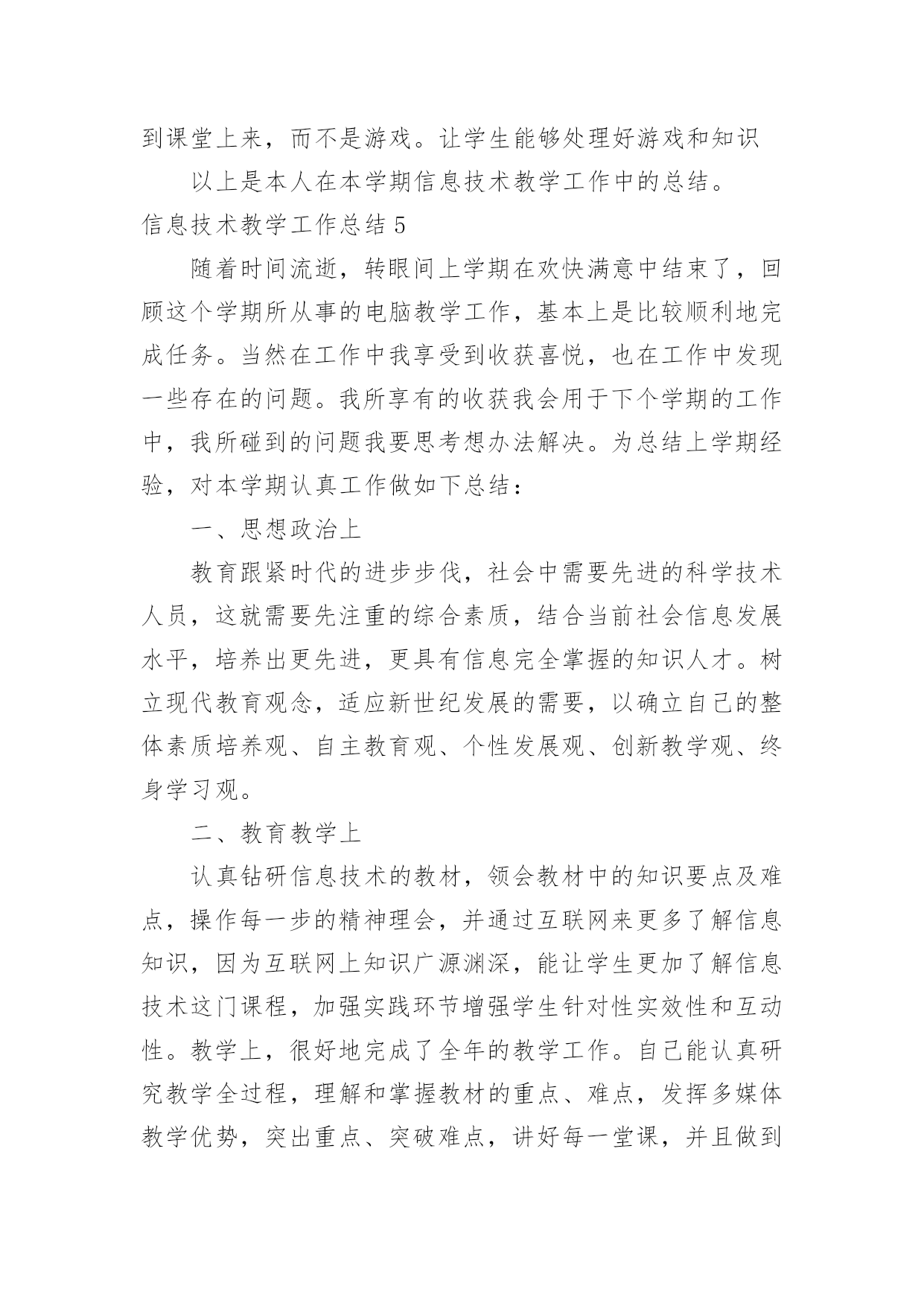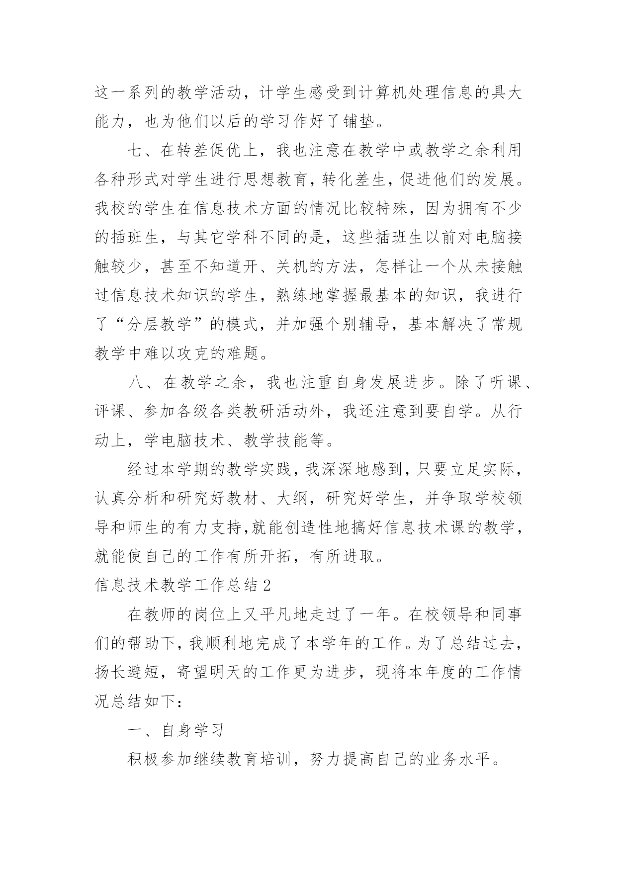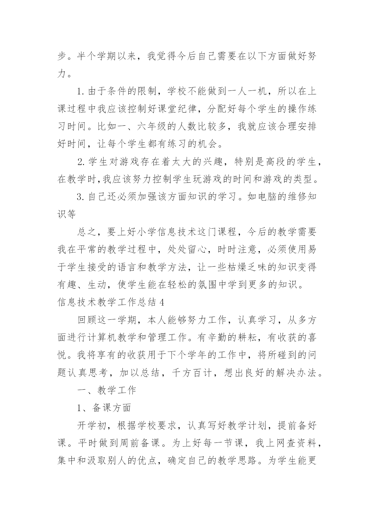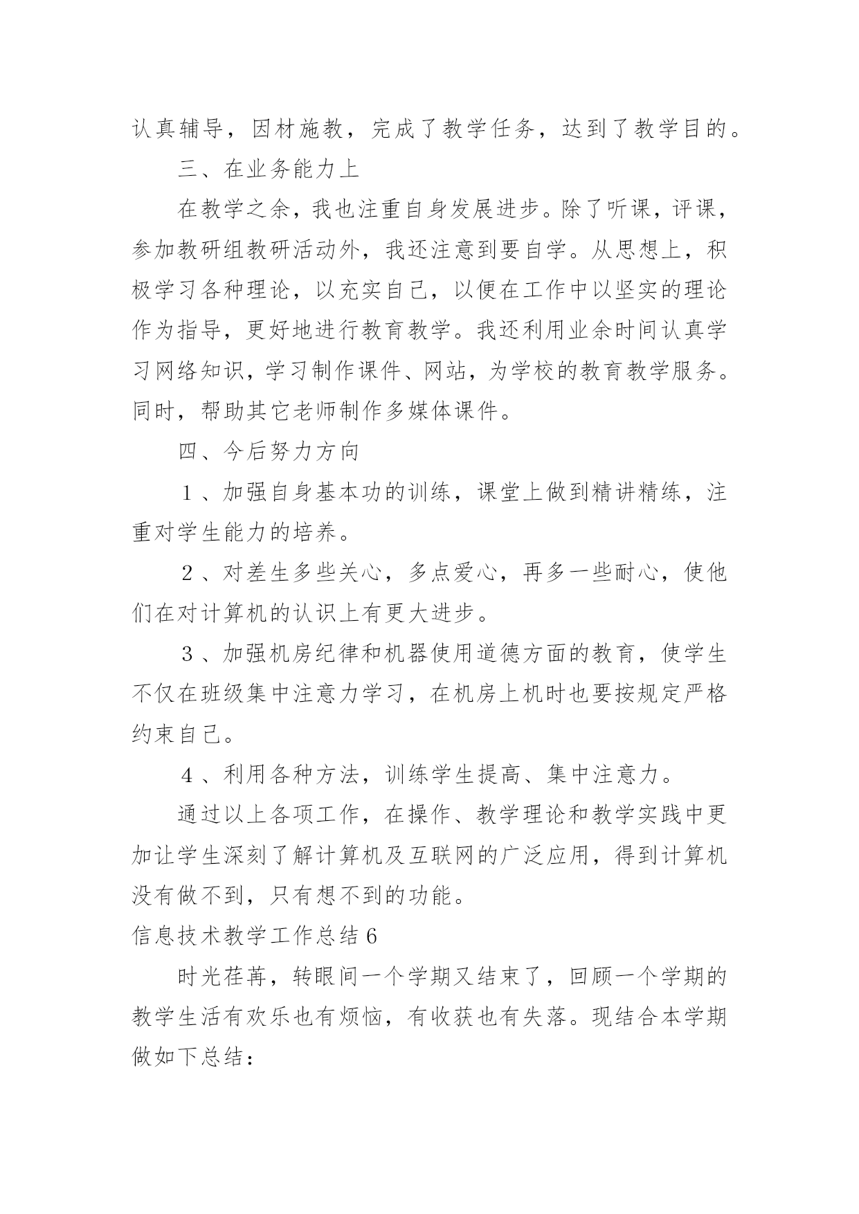 信息技术教学工作总结信息技术教学工作总结总结是对某一特定时间段内的学习和工作生活等表现情况加以回顾和分析的一种书面材料,它能使我们及时找出错误并改正,因此好好准备一份总结吧。那么你真的懂得怎么写总结吗?以下是小编为大家收集的信息技术教学工作总结,欢迎大家分享。信息技术教学工作总结1一、积极加强教学理论素养,努力搞好教学工作。在这学期的教学工作中,我围绕努力培养学生信息素养这个中心目标,着重抓了提高学生获取、处理信息能力的工作。二、做到期初有计划,有教学进度,使教学工作能有条不紊地顺利进行下去,使得信息技术理论知识和操作要领得以传授给学生。三、按照学校工作管理规定,认真备好课、写好教案、努力上好每一节课。信息技术学科学校安排的课时比较少(五六年级一周每班一节)这对于学生来讲是很重要的一节课;对老师来讲是比较难上的一节课。所以上好每节课对于老师,对于学生都是很关键的。除了备好课、写好教案外,我还要查阅各种资料,上网寻找好的教学资料、教学课件,把它们和我所从事的工作结合起来,为我所用。四、继续培养学生学习电脑的兴趣、提高动手能力。在讲课中善于使用“启发式”和“探索式”的教学方法,形式灵活多样,切忌“呆板”、“枯燥”。“练习”是一节课中学生掌握知识和巩固知识的主要渠道,练习的时间要充足,练习的内容要能充分体现本节课的教学内容,练习的形式要做到多样化,最终达到提高学生动手能力的目的。“用”是教学的最终目的,所谓“学以致用”,它可以是对某一节课所学知识的运用,也可以是对几节课,一个单元所学知识的综合运用。它可以穿插在“练习”之中,但又是在“练习”基础上的一次升华。五、注重因材施教,让不同程度的学生得到不同的发展。在教学的同时,我注重于不同能力的学生得到不同的发展,比如,在操作时,如果完成的可以看一下还可以怎样做,或者可否做得更好;有些时候我设计多个任务,有简单的、一般的、稍难的,学生可以根据自己的情况去选做。这样不单使学生在不同程序得到发展,更让他们体会到成功的喜悦,提高了学生对计算机的兴趣和利用计算机开展创新实践的能力。除了在课堂上这样,在课外我还选拔一些好的学生进行辅导,培养尖子生方面下了一定的功夫,通过对他们的辅导,使他们的能力进一步提升。六、提高了学生运用计算机进行信息处理的能力。本学期进行了因特网的教学,让学生了解了因特网的发展,掌握了搜索引擎的作用,然后教会了学生保存网页、图片的方法之后,要求学生选定主题进行简单的多媒体作品制作,这一个制作包括了信息的筛选、文本的编辑、图片的处理,通过这一系列的教学活动,计学生感受到计算机处理信息的具大能力,也为他们以后的学习作好了铺垫。七、在转差促优上,我也注意在教学中或教学之余利用各种形式对学生进行思想教育,转化差生,促进他们的发展。我校的学生在信息技术方面的情况比较特殊,因为拥有不少的插班生,与其它学科不同的是,这些插班生以前对电脑接触较少,甚至不知道开、关机的方法,怎样让一个从未接触过信息技术知识的学生,熟练地掌握最基本的知识,我进行了“分层教学”的模式,并加强个别辅导,基本解决了常规教学中难以攻克的难题。八、在教学之余,我也注重自身发展进步。除了听课、评课、参加各级各类教研活动外,我还注意到要自学。从行动上,学电脑技术、教学技能等。经过本学期的教学实践,我深深地感到,只要立足实际,认真分析和研究好教材、大纲,研究好学生,并争取学校领导和师生的有力支持,就能创造性地搞好信息技术课的教学,就能使自己的工作有所开拓,有所进取。信息技术教学工作总结2在教师的岗位上又平凡地走过了一年。在校领导和同事们的帮助下,我顺利地完成了本学年的工作。为了总结过去,扬长避短,寄望明天的工作更为进步,现将本年度的工作情况总结如下:一、自身学习积极参加继续教育培训,努力提高自己的业务水平。1。20xx年元月至4月,圆满完成了全市中小学幼儿园教师“有效学习评价”继续教育24学时的学习,成绩优秀,并被评为“优秀学员”。2。20xx年5月,圆满完成了全市专业技术人员“传统文化与法治中国”继续教育30学时的学习。二、教学工作系学校的信息技术专职教师,担任了学校三、四年级共8个班的信息技术课程的教学工作。在信息技术教学过程中,我始终要求自己做到:课前精心准备、课堂认真教学、课后细细反思,并结合学校信息技术教学设施的实际情况,针对性地选择教学内容对学生进行教学。备课笔记、教学反思、教研活动全部实现电子化。三、其他工作1。本学期,我还负责学校学生电子学籍的管理工作。能做到一人一籍,生籍一致,变动数据的及时更新。另还负责学校机房电脑的日常维护工作,保证机器运行正常。四、教育教学及教研成绩1。辅导学生参加区第八届小学生汉字录入竞赛获区级一等奖3人,二等奖2人。2。参与编写省小学信息技术教师用书(第三册),教学案例《分门别类建