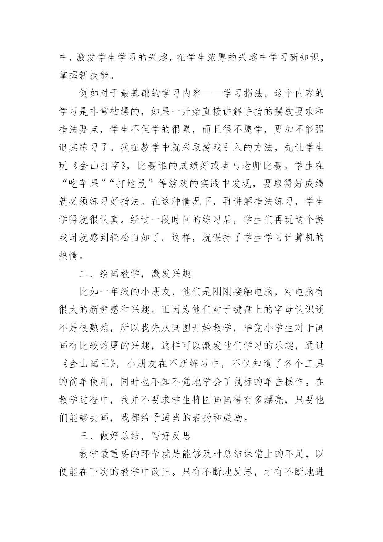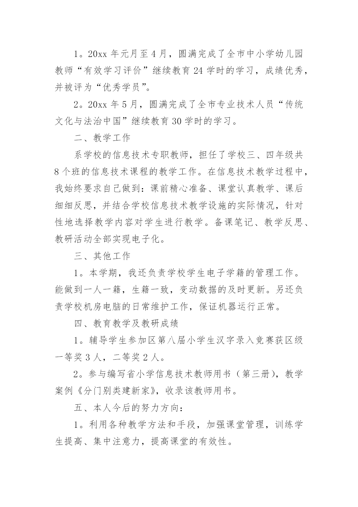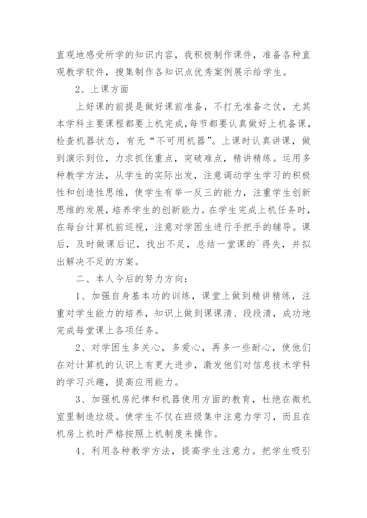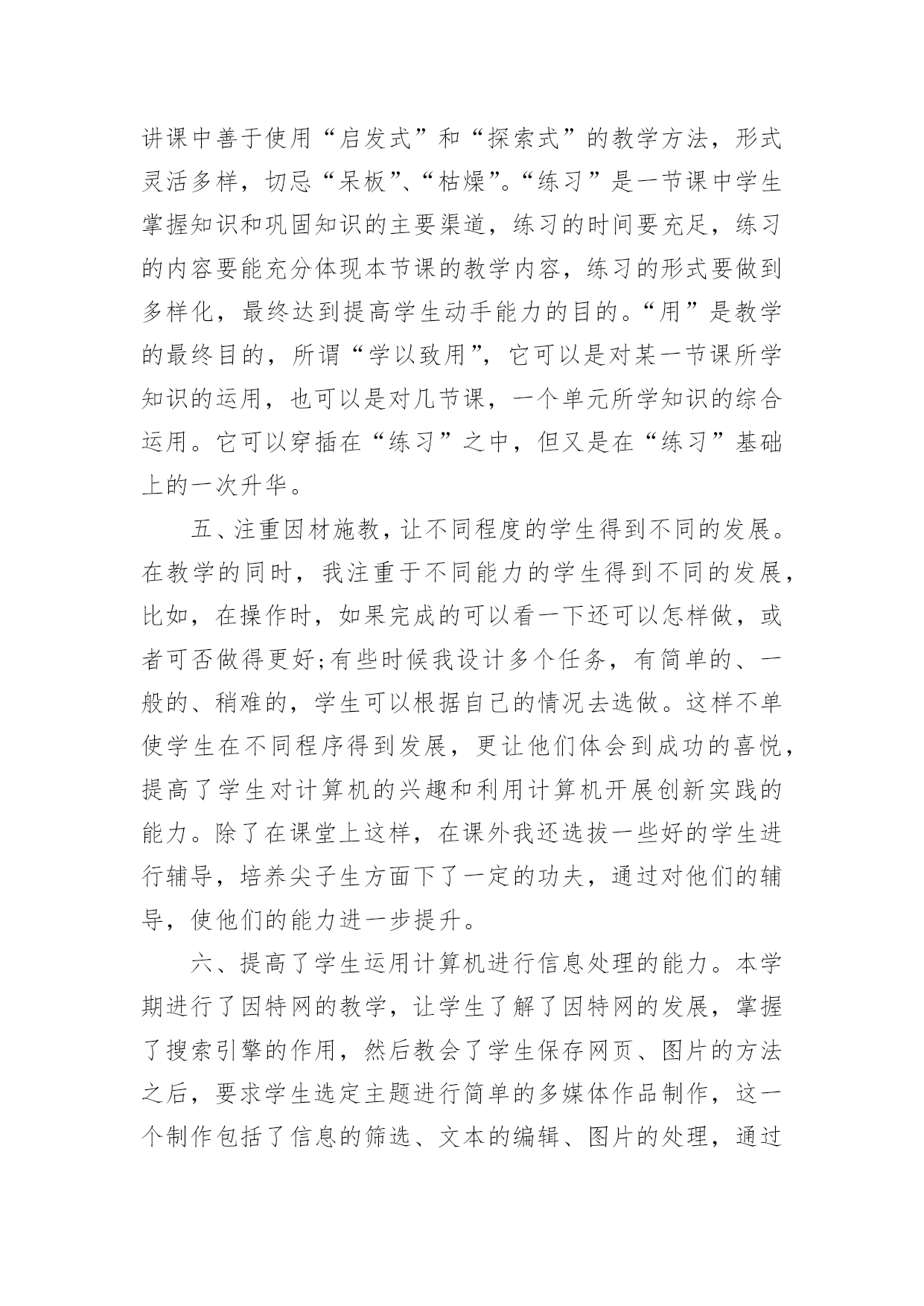 信息技术教学工作总结信息技术教学工作总结总结是对某一特定时间段内的学习和工作生活等表现情况加以回顾和分析的一种书面材料,它能使我们及时找出错误并改正,因此好好准备一份总结吧。那么你真的懂得怎么写总结吗?以下是小编为大家收集的信息技术教学工作总结,欢迎大家分享。信息技术教学工作总结1一、积极加强教学理论素养,努力搞好教学工作。在这学期的教学工作中,我围绕努力培养学生信息素养这个中心目标,着重抓了提高学生获取、处理信息能力的工作。二、做到期初有计划,有教学进度,使教学工作能有条不紊地顺利进行下去,使得信息技术理论知识和操作要领得以传授给学生。三、按照学校工作管理规定,认真备好课、写好教案、努力上好每一节课。信息技术学科学校安排的课时比较少(五六年级一周每班一节)这对于学生来讲是很重要的一节课;对老师来讲是比较难上的一节课。所以上好每节课对于老师,对于学生都是很关键的。除了备好课、写好教案外,我还要查阅各种资料,上网寻找好的教学资料、教学课件,把它们和我所从事的工作结合起来,为我所用。四、继续培养学生学习电脑的兴趣、提高动手能力。在讲课中善于使用“启发式”和“探索式”的教学方法,形式灵活多样,切忌“呆板”、“枯燥”。“练习”是一节课中学生掌握知识和巩固知识的主要渠道,练习的时间要充足,练习的内容要能充分体现本节课的教学内容,练习的形式要做到多样化,最终达到提高学生动手能力的目的。“用”是教学的最终目的,所谓“学以致用”,它可以是对某一节课所学知识的运用,也可以是对几节课,一个单元所学知识的综合运用。它可以穿插在“练习”之中,但又是在“练习”基础上的一次升华。五、注重因材施教,让不同程度的学生得到不同的发展。在教学的同时,我注重于不同能力的学生得到不同的发展,比如,在操作时,如果完成的可以看一下还可以怎样做,或者可否做得更好;有些时候我设计多个任务,有简单的、一般的、稍难的,学生可以根据自己的情况去选做。这样不单使学生在不同程序得到发展,更让他们体会到成功的喜悦,提高了学生对计算机的兴趣和利用计算机开展创新实践的能力。除了在课堂上这样,在课外我还选拔一些好的学生进行辅导,培养尖子生方面下了一定的功夫,通过对他们的辅导,使他们的能力进一步提升。六、提高了学生运用计算机进行信息处理的能力。本学期进行了因特网的教学,让学生了解了因特网的发展,掌握了搜索引擎的作用,然后教会了学生保存网页、图片的方法之后,要求学生选定主题进行简单的多媒体作品制作,这一个制作包括了信息的筛选、文本的编辑、图片的处理,通过这一系列的教学活动,计学生感受到计算机处理信息的具大能力,也为他们以后的学习作好了铺垫。七、在转差促优上,我也注意在教学中或教学之余利用各种形式对学生进行思想教育,转化差生,促进他们的发展。我校的学生在信息技术方面的情况比较特殊,因为拥有不少的插班生,与其它学科不同的是,这些插班生以前对电脑接触较少,甚至不知道开、关机的方法,怎样让一个从未接触过信息技术知识的学生,熟练地掌握最基本的知识,我进行了“分层教学”的模式,并加强个别辅导,基本解决了常规教学中难以攻克的难题。八、在教学之余,我也注重自身发展进步。除了听课、评课、参加各级各类教研活动外,我还注意到要自学。从行动上,学电脑技术、教学技能等。经过本学期的教学实践,我深深地感到,只要立足实际,认真分析和研究好教材、大纲,研究好学生,并争取学校领导和师生的有力支持,就能创造性地搞好信息技术课的教学,就能使自己的工作有所开拓,有所进取。信息技术教学工作总结2在教师的岗位上又平凡地走过了一年。在校领导和同事们的帮助下,我顺利地完成了本学年的工作。为了总结过去,扬长避短,寄望明天的工作更为进步,现将本年度的工作情况总结如下:一、自身学习积极参加继续教育培训,努力提高自己的业务水平。1。20xx年元月至4月,圆满完成了全市中小学幼儿园教师“有效学习评价”继续教育24学时的学习,成绩优秀,并被评为“优秀学员”。2。20xx年5月,圆满完成了全市专业技术人员“传统文化与法治中国”继续教育30学时的学习。二、教学工作系学校的信息技术专职教师,担任了学校三、四年级共8个班的信息技术课程的教学工作。在信息技术教学过程中,我始终要求自己做到:课前精心准备、课堂认真教学、课后细细反思,并结合学校信息技术教学设施的实际情况,针对性地选择教学内容对学生进行教学。备课笔记、教学反思、教研活动全部实现电子化。三、其他工作1。本学期,我还负责学校学生电子学籍的管理工作。能做到一人一籍,生籍一致,变动数据的及时更新。另还负责学校机房电脑的日常维护工作,保证机器运行正常。四、教育教学及教研成绩1。辅导学生参加区第八届小学生汉字录入竞赛获区级一等奖3人,二等奖2人。2。参与编写省小学信息技术教师用书(第三册),教学案例《分门别类建
