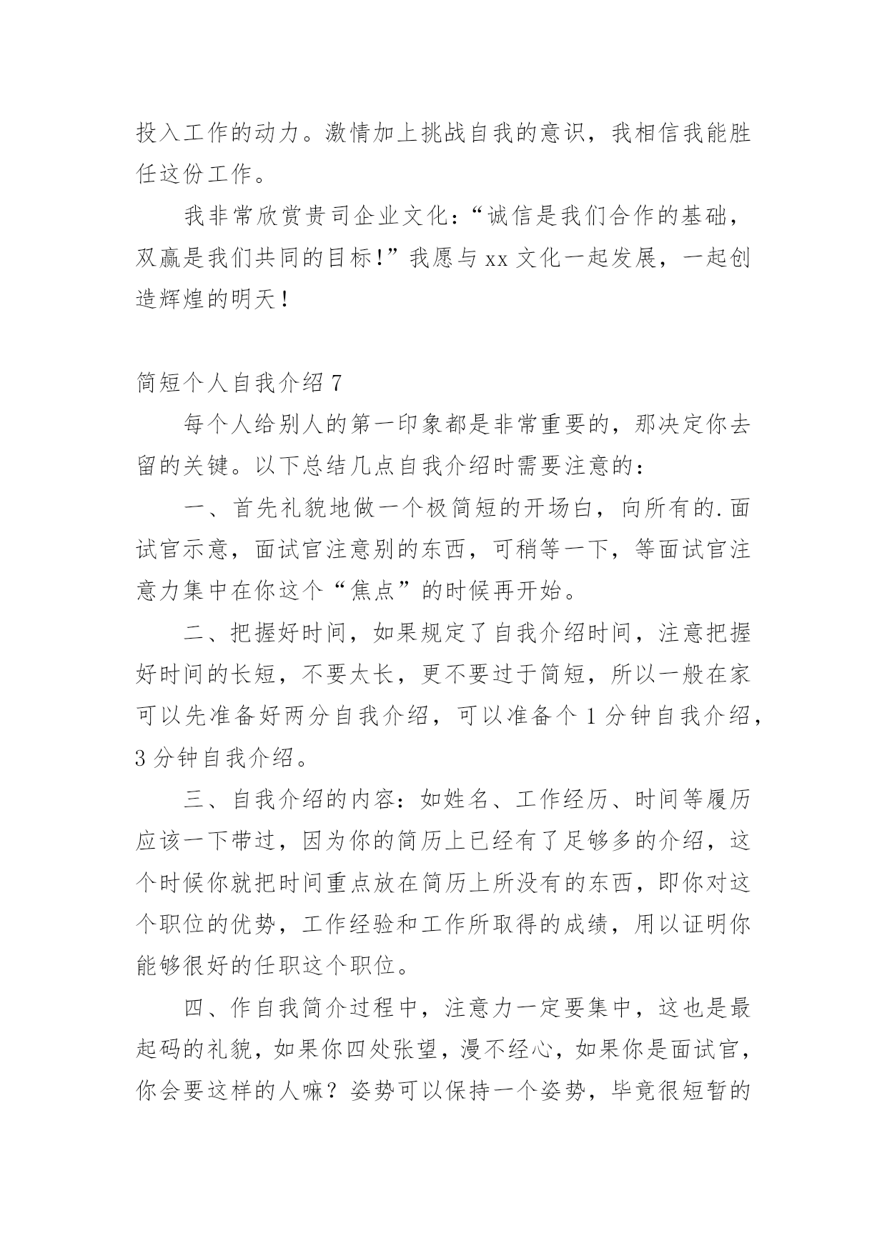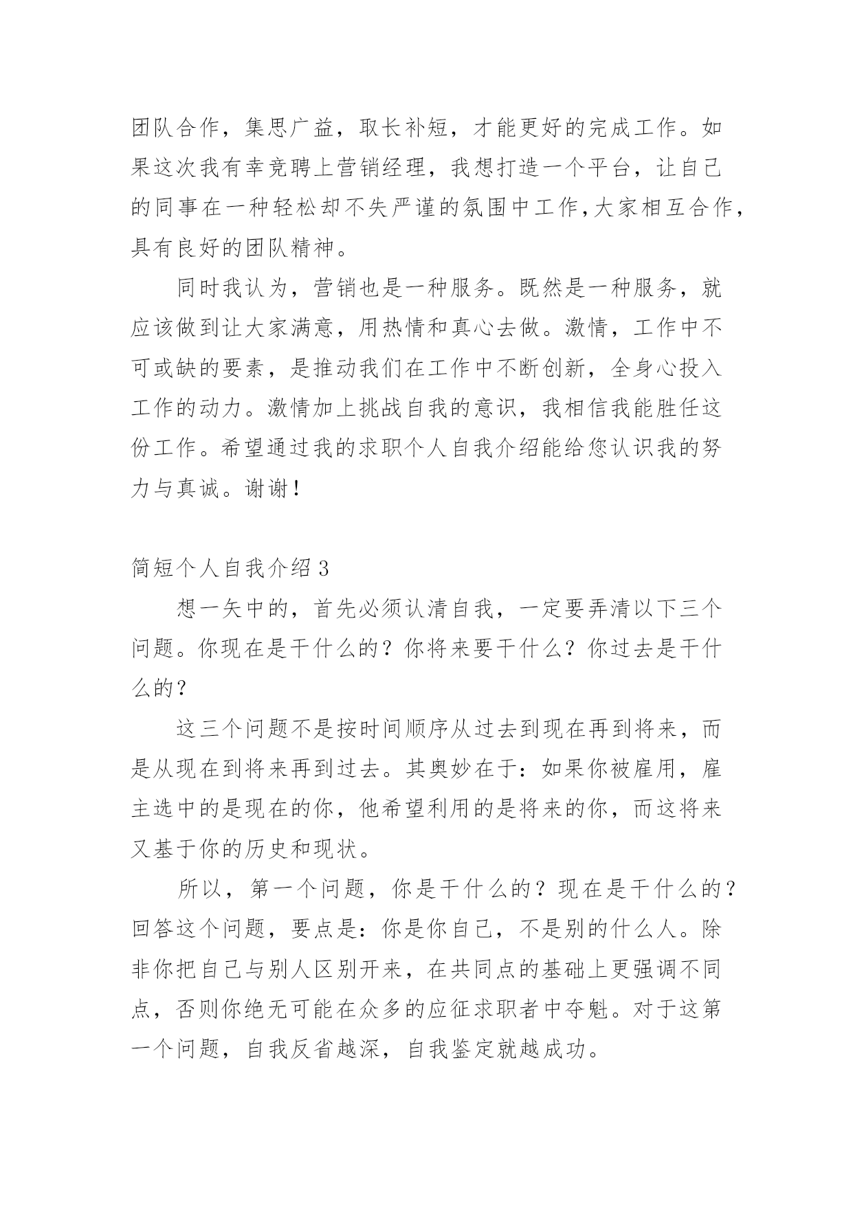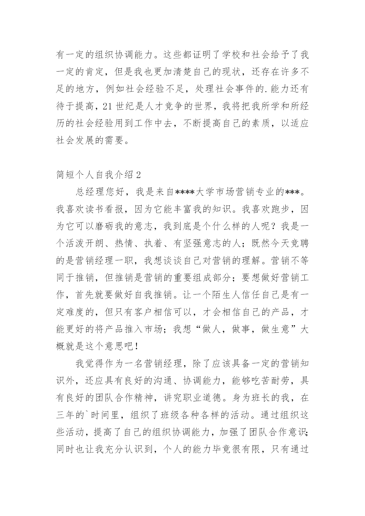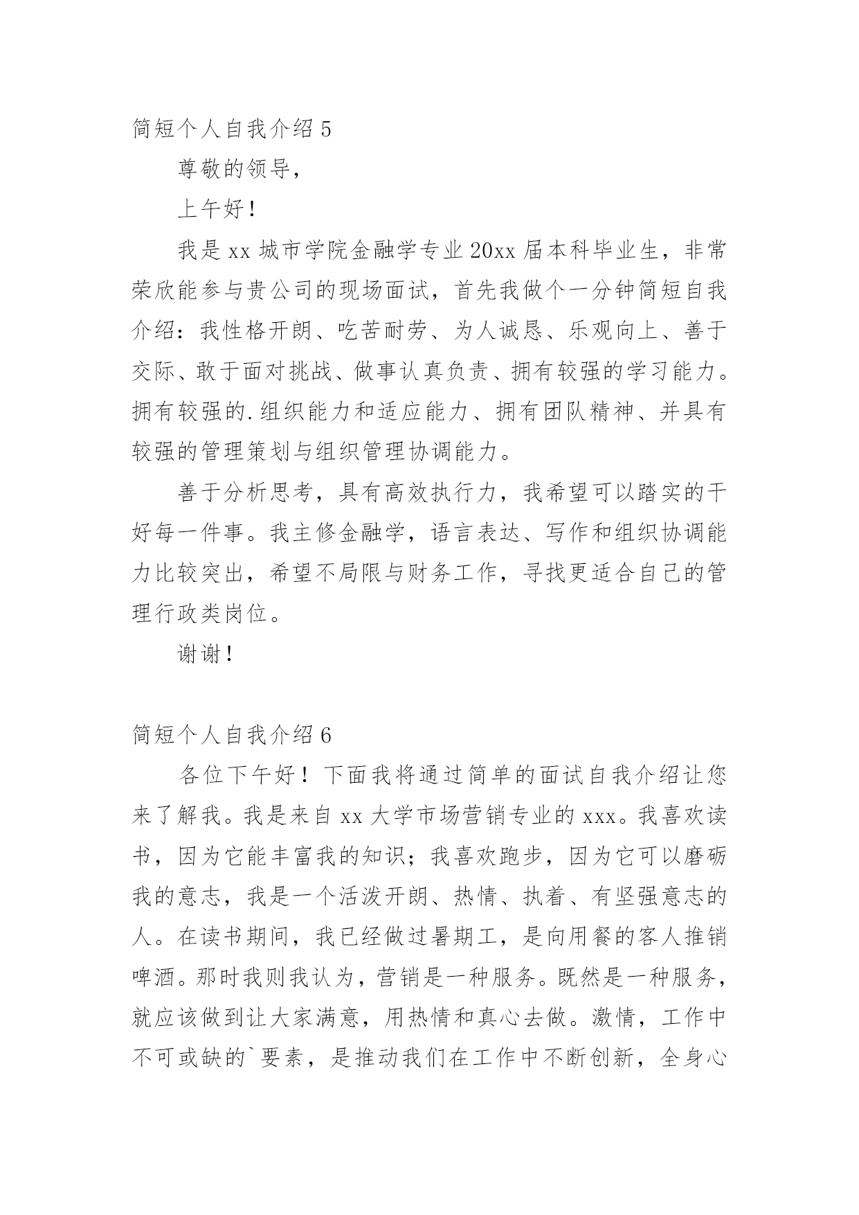 简短个人自我介绍简短个人自我介绍通用15篇当进入一个陌生环境,我们通常会被要求作自我介绍,通过自我介绍可以让别人认识自己。相信许多人会觉得自我介绍很难写吧,以下是小编整理的简短个人自我介绍,仅供参考,希望能够帮助到大家。简短个人自我介绍1我出生在广西,在广东长大,并在那里完成了我大学以前的学习和生活,现在我又将在贵州完成我的大学学业,这样的经历锻炼了我适应不同的生活环境和与不同的地域的打交道的能力。这是我和别人不一样的地方。这个更加有利于我从事各种交际更加广泛的工作。正是在不同的环境长大,造就了我能讲广州话。四川和贵州话,客家话,性格活泼开朗,热爱体育活动,喜欢参加各种社会活动。在大学期间我不断的提高自己的各方面的能力,获得了许多的奖励,学院优秀学生干部和三好学生更是多次获得。还多次受到学院以上级的表彰,如黔南周庆工作先进个人。中国第六届摄影艺术节服务工作先进个人和优秀青年志愿者称号。贵州省大学生心理知识竞赛第二名。大学时我曾经担任系学生会主席和学生党支部副书记等学生干部职务,对工作认真负责,勤奋努力,团队意识强,有一定的组织协调能力。这些都证明了学校和社会给予了我一定的肯定,但是我也更加清楚自己的现状,还存在许多不足的地方,例如社会经验不足,处理社会事件的.能力还有待于提高,21世纪是人才竞争的世界,我将把我所学和所经历的社会经验用到工作中去,不断提高自己的素质,以适应社会发展的需要。简短个人自我介绍2总经理您好,我是来自****大学市场营销专业的***。我喜欢读书看报,因为它能丰富我的知识。我喜欢跑步,因为它可以磨砺我的意志,我到底是个什么样的人呢?我是一个活泼开朗、热情、执着、有坚强意志的人;既然今天竞聘的是营销经理一职,我想谈谈自己对营销的理解。营销不等同于推销,但推销是营销的重要组成部分;要想做好营销工作,首先就要做好自我推销。让一个陌生人信任自己是有一定难度的,但只有客户相信可以,才会相信自己的产品,才能更好的将产品推入市场;我想“做人,做事,做生意”大概就是这个意思吧!我觉得作为一名营销经理,除了应该具备一定的营销知识外,还应具有良好的沟通、协调能力,能够吃苦耐劳,具有良好的团队合作精神,讲究职业道德。身为班长的我,在三年的`时间里,组织了班级各种各样的活动。通过组织这些活动,提高了自己的组织协调能力,加强了团队合作意识;同时也让我充分认识到,个人的能力毕竟很有限,只有通过团队合作,集思广益,取长补短,才能更好的完成工作。如果这次我有幸竞聘上营销经理,我想打造一个平台,让自己的同事在一种轻松却不失严谨的氛围中工作,大家相互合作,具有良好的团队精神。同时我认为,营销也是一种服务。既然是一种服务,就应该做到让大家满意,用热情和真心去做。激情,工作中不可或缺的要素,是推动我们在工作中不断创新,全身心投入工作的动力。激情加上挑战自我的意识,我相信我能胜任这份工作。希望通过我的求职个人自我介绍能给您认识我的努力与真诚。谢谢!简短个人自我介绍3想一矢中的,首先必须认清自我,一定要弄清以下三个问题。你现在是干什么的?你将来要干什么?你过去是干什么的?这三个问题不是按时间顺序从过去到现在再到将来,而是从现在到将来再到过去。其奥妙在于:如果你被雇用,雇主选中的是现在的你,他希望利用的是将来的你,而这将来又基于你的历史和现状。所以,第一个问题,你是干什么的?现在是干什么的?回答这个问题,要点是:你是你自己,不是别的什么人。除非你把自己与别人区别开来,在共同点的基础上更强调不同点,否则你绝无可能在众多的应征求职者中夺魁。对于这第一个问题,自我反省越深,自我鉴定就越成功。随后,着手回答第二个问题:你将来要干什么?如果你申请的是一份举足轻重的工作,雇主肯定很关注你对未来的'自我设计。你的回答要具体,合理,并符合你现在的身份,要有一个更别致的风格。然后,再着手回答最后一个问题:你过去是干什么的?你的过去当然都在履历上已有反映。你在面试中再度回答这个问题时,不可忽略之处是:不要抖落一个与你的将来毫不相干的过去。如果你中途彻底改行,更要在描述你的执着、职业目标的一贯性上下些功夫。要做到这一点,又要忠实于事实和本人,最简单的方法是:找到过去与将来的联系点,收集过去的资料,再按目标主次排列。用这样的方法,以现在为出发点,以将来为目标,以过去为证实,最重要的是加深了你的自我分析和理解。其实,在面试的时候不一定有机会或者有必要照搬你的大作,但这三个问题的内在联系点一定会体现在自我表述的整体感觉中,使你的形象栩栩如生。投其所好清楚自己的强项后,便可以开始准备自我介绍的内容:包括工作模式、优点、技能,突出成就、专业知识、学术背景等。好处众多,但只有短短一分钟,所以一切还是与该公司有关的好。如果是一间电脑公司,应说些电脑的话题;如是一间金融财务公司,便可