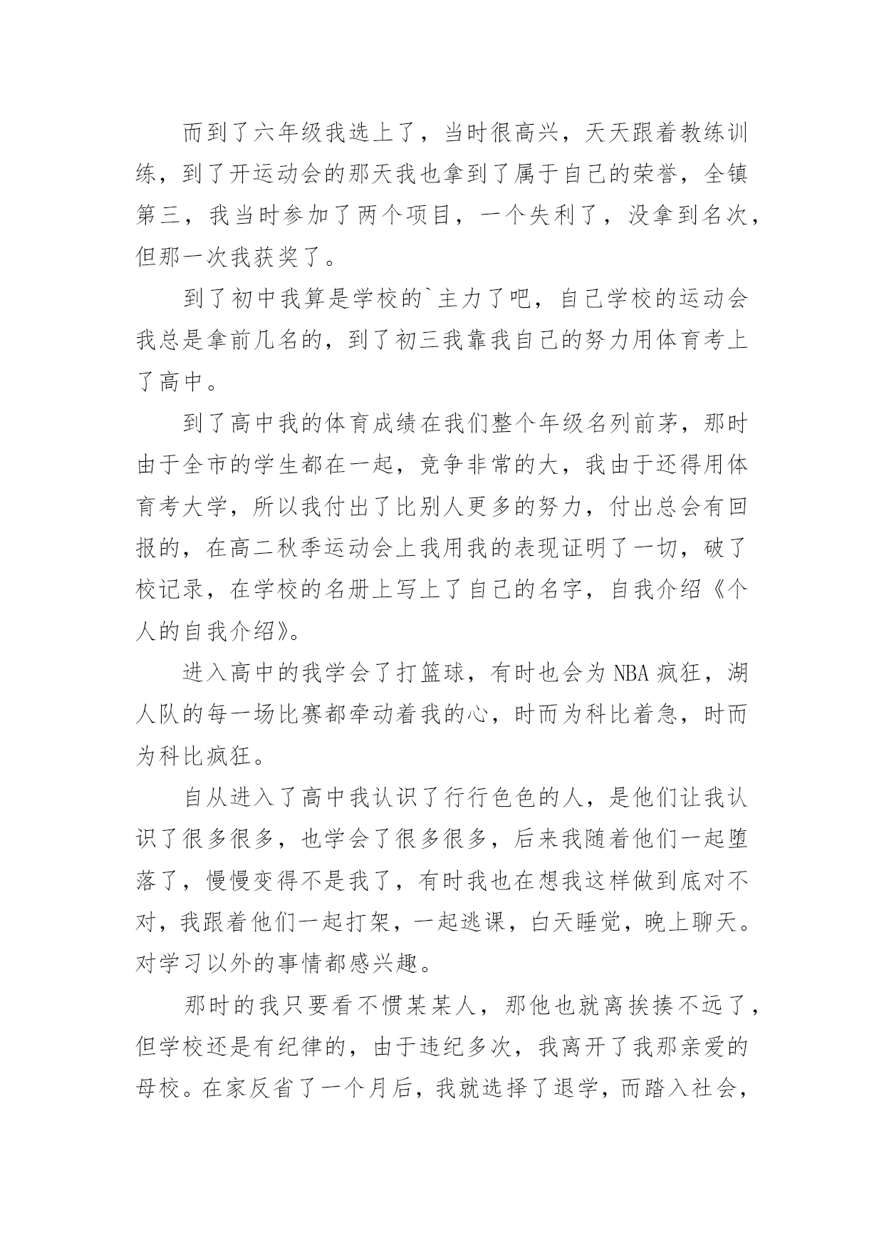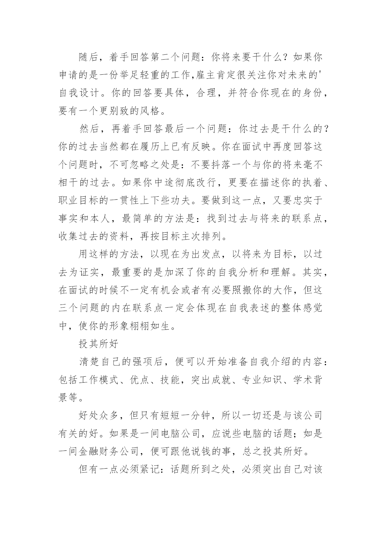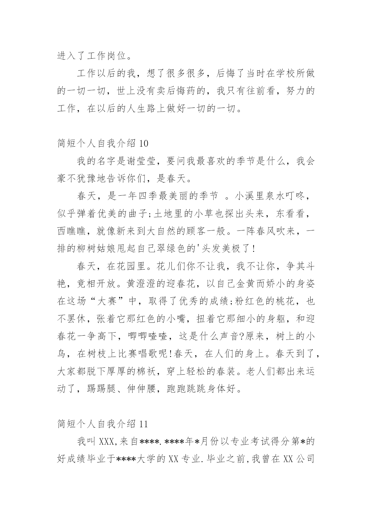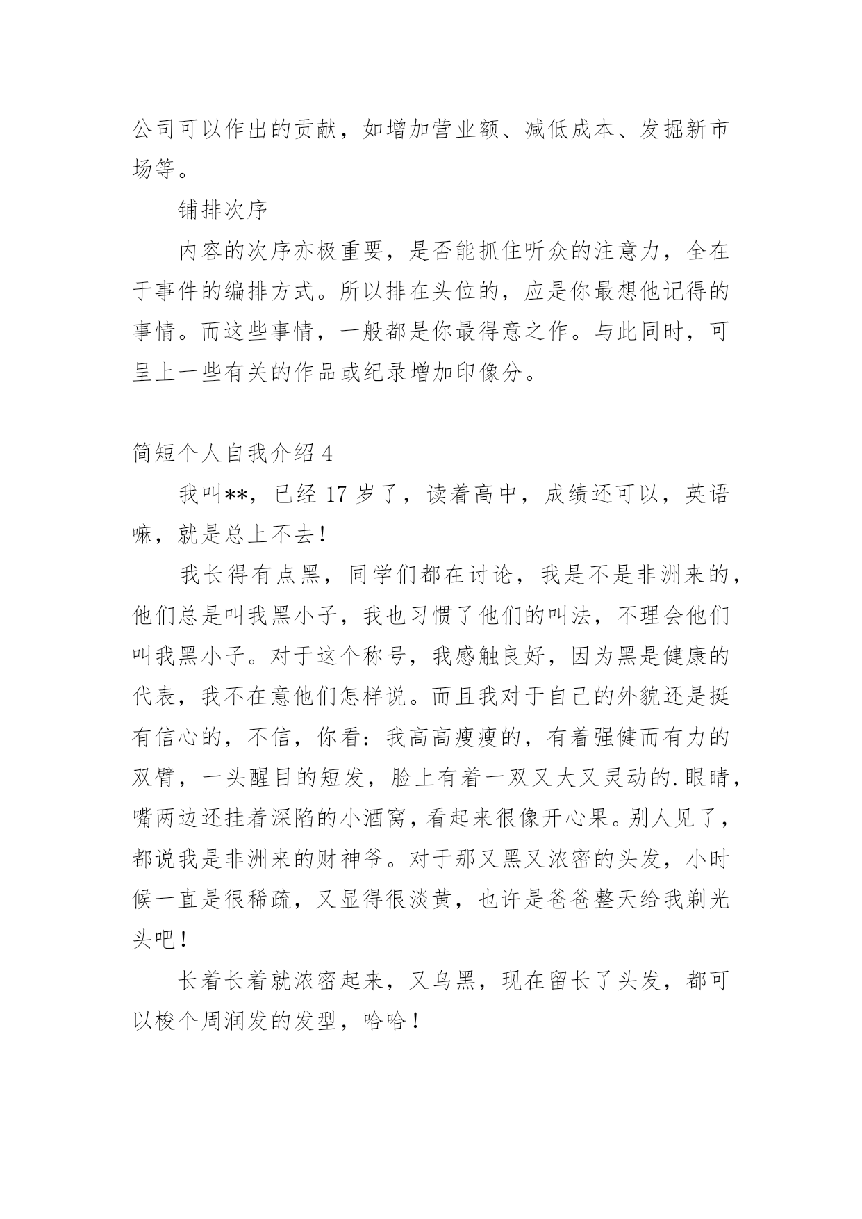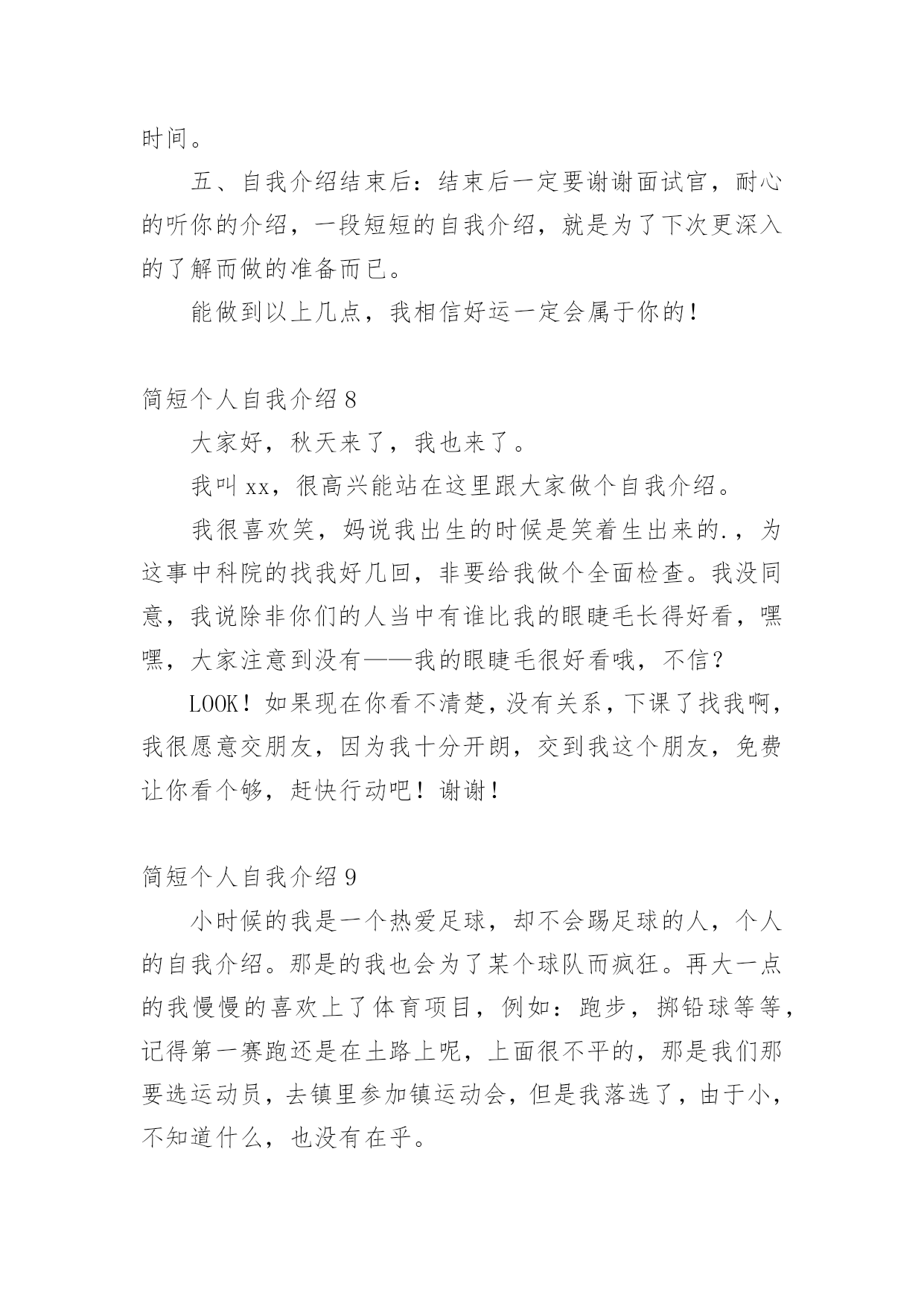 简短个人自我介绍简短个人自我介绍通用15篇当进入一个陌生环境,我们通常会被要求作自我介绍,通过自我介绍可以让别人认识自己。相信许多人会觉得自我介绍很难写吧,以下是小编整理的简短个人自我介绍,仅供参考,希望能够帮助到大家。简短个人自我介绍1我出生在广西,在广东长大,并在那里完成了我大学以前的学习和生活,现在我又将在贵州完成我的大学学业,这样的经历锻炼了我适应不同的生活环境和与不同的地域的打交道的能力。这是我和别人不一样的地方。这个更加有利于我从事各种交际更加广泛的工作。正是在不同的环境长大,造就了我能讲广州话。四川和贵州话,客家话,性格活泼开朗,热爱体育活动,喜欢参加各种社会活动。在大学期间我不断的提高自己的各方面的能力,获得了许多的奖励,学院优秀学生干部和三好学生更是多次获得。还多次受到学院以上级的表彰,如黔南周庆工作先进个人。中国第六届摄影艺术节服务工作先进个人和优秀青年志愿者称号。贵州省大学生心理知识竞赛第二名。大学时我曾经担任系学生会主席和学生党支部副书记等学生干部职务,对工作认真负责,勤奋努力,团队意识强,有一定的组织协调能力。这些都证明了学校和社会给予了我一定的肯定,但是我也更加清楚自己的现状,还存在许多不足的地方,例如社会经验不足,处理社会事件的.能力还有待于提高,21世纪是人才竞争的世界,我将把我所学和所经历的社会经验用到工作中去,不断提高自己的素质,以适应社会发展的需要。简短个人自我介绍2总经理您好,我是来自****大学市场营销专业的***。我喜欢读书看报,因为它能丰富我的知识。我喜欢跑步,因为它可以磨砺我的意志,我到底是个什么样的人呢?我是一个活泼开朗、热情、执着、有坚强意志的人;既然今天竞聘的是营销经理一职,我想谈谈自己对营销的理解。营销不等同于推销,但推销是营销的重要组成部分;要想做好营销工作,首先就要做好自我推销。让一个陌生人信任自己是有一定难度的,但只有客户相信可以,才会相信自己的产品,才能更好的将产品推入市场;我想“做人,做事,做生意”大概就是这个意思吧!我觉得作为一名营销经理,除了应该具备一定的营销知识外,还应具有良好的沟通、协调能力,能够吃苦耐劳,具有良好的团队合作精神,讲究职业道德。身为班长的我,在三年的`时间里,组织了班级各种各样的活动。通过组织这些活动,提高了自己的组织协调能力,加强了团队合作意识;同时也让我充分认识到,个人的能力毕竟很有限,只有通过团队合作,集思广益,取长补短,才能更好的完成工作。如果这次我有幸竞聘上营销经理,我想打造一个平台,让自己的同事在一种轻松却不失严谨的氛围中工作,大家相互合作,具有良好的团队精神。同时我认为,营销也是一种服务。既然是一种服务,就应该做到让大家满意,用热情和真心去做。激情,工作中不可或缺的要素,是推动我们在工作中不断创新,全身心投入工作的动力。激情加上挑战自我的意识,我相信我能胜任这份工作。希望通过我的求职个人自我介绍能给您认识我的努力与真诚。谢谢!简短个人自我介绍3想一矢中的,首先必须认清自我,一定要弄清以下三个问题。你现在是干什么的?你将来要干什么?你过去是干什么的?这三个问题不是按时间顺序从过去到现在再到将来,而是从现在到将来再到过去。其奥妙在于:如果你被雇用,雇主选中的是现在的你,他希望利用的是将来的你,而这将来又基于你的历史和现状。所以,第一个问题,你是干什么的?现在是干什么的?回答这个问题,要点是:你是你自己,不是别的什么人。除非你把自己与别人区别开来,在共同点的基础上更强调不同点,否则你绝无可能在众多的应征求职者中夺魁。对于这第一个问题,自我反省越深,自我鉴定就越成功。随后,着手回答第二个问题:你将来要干什么?如果你申请的是一份举足轻重的工作,雇主肯定很关注你对未来的'自我设计。你的回答要具体,合理,并符合你现在的身份,要有一个更别致的风格。然后,再着手回答最后一个问题:你过去是干什么的?你的过去当然都在履历上已有反映。你在面试中再度回答这个问题时,不可忽略之处是:不要抖落一个与你的将来毫不相干的过去。如果你中途彻底改行,更要在描述你的执着、职业目标的一贯性上下些功夫。要做到这一点,又要忠实于事实和本人,最简单的方法是:找到过去与将来的联系点,收集过去的资料,再按目标主次排列。用这样的方法,以现在为出发点,以将来为目标,以过去为证实,最重要的是加深了你的自我分析和理解。其实,在面试的时候不一定有机会或者有必要照搬你的大作,但这三个问题的内在联系点一定会体现在自我表述的整体感觉中,使你的形象栩栩如生。投其所好清楚自己的强项后,便可以开始准备自我介绍的内容:包括工作模式、优点、技能,突出成就、专业知识、学术背景等。好处众多,但只有短短一分钟,所以一切还是与该公司有关的好。如果是一间电脑公司,应说些电脑的话题;如是一间金融财务公司,便可