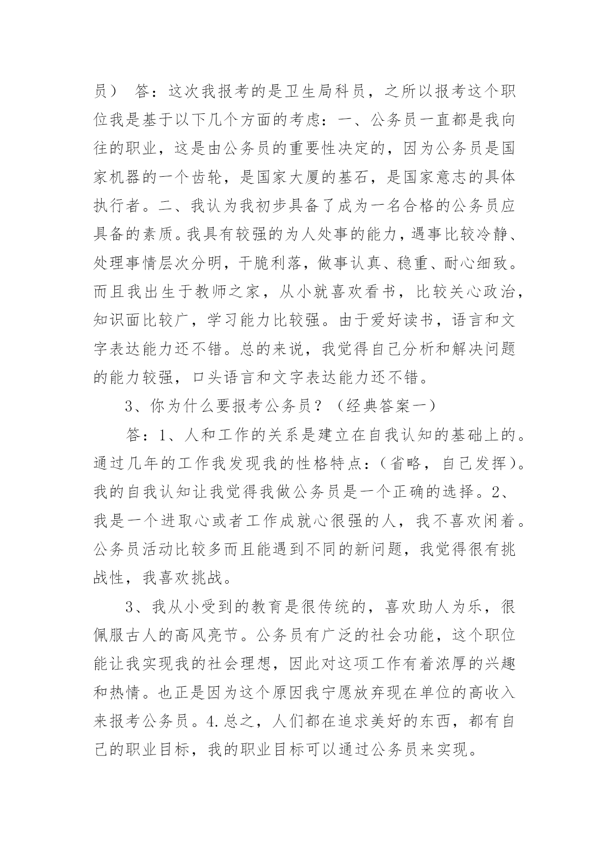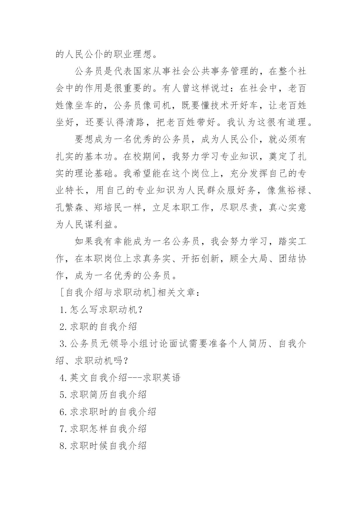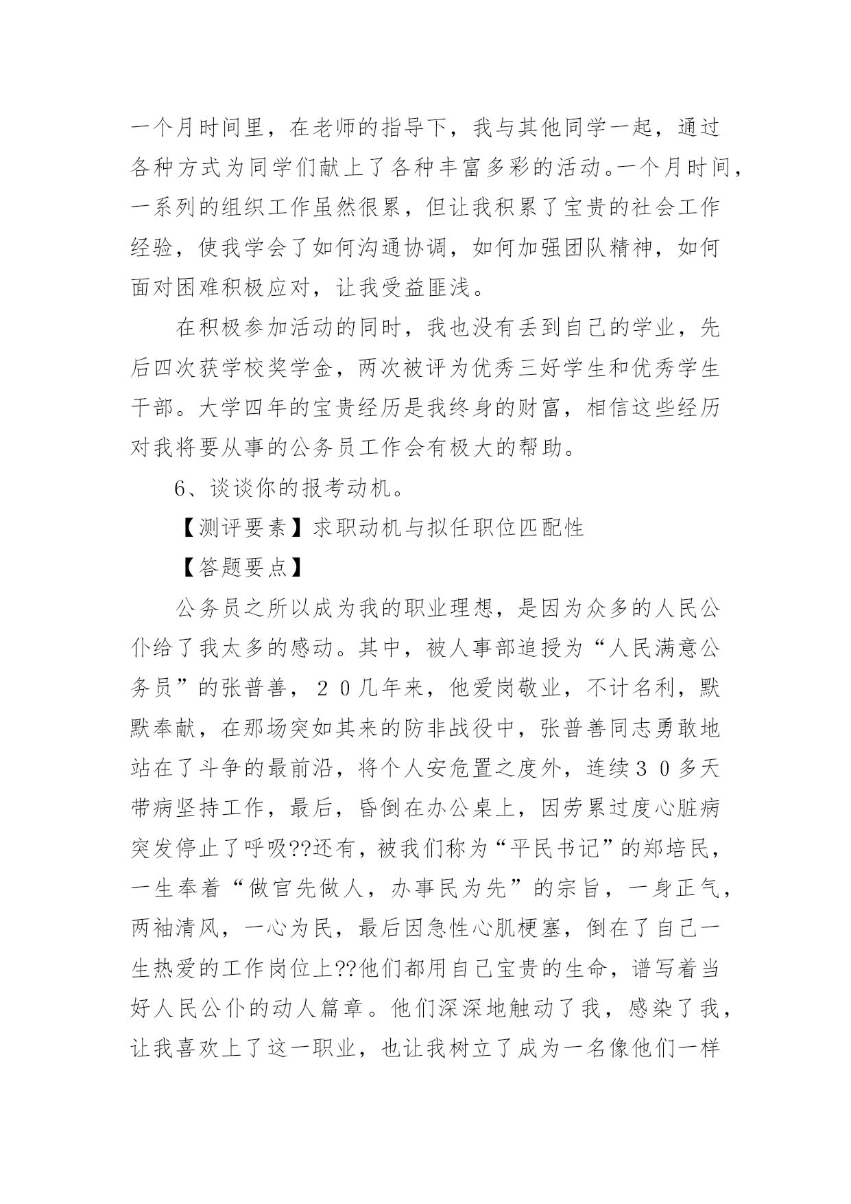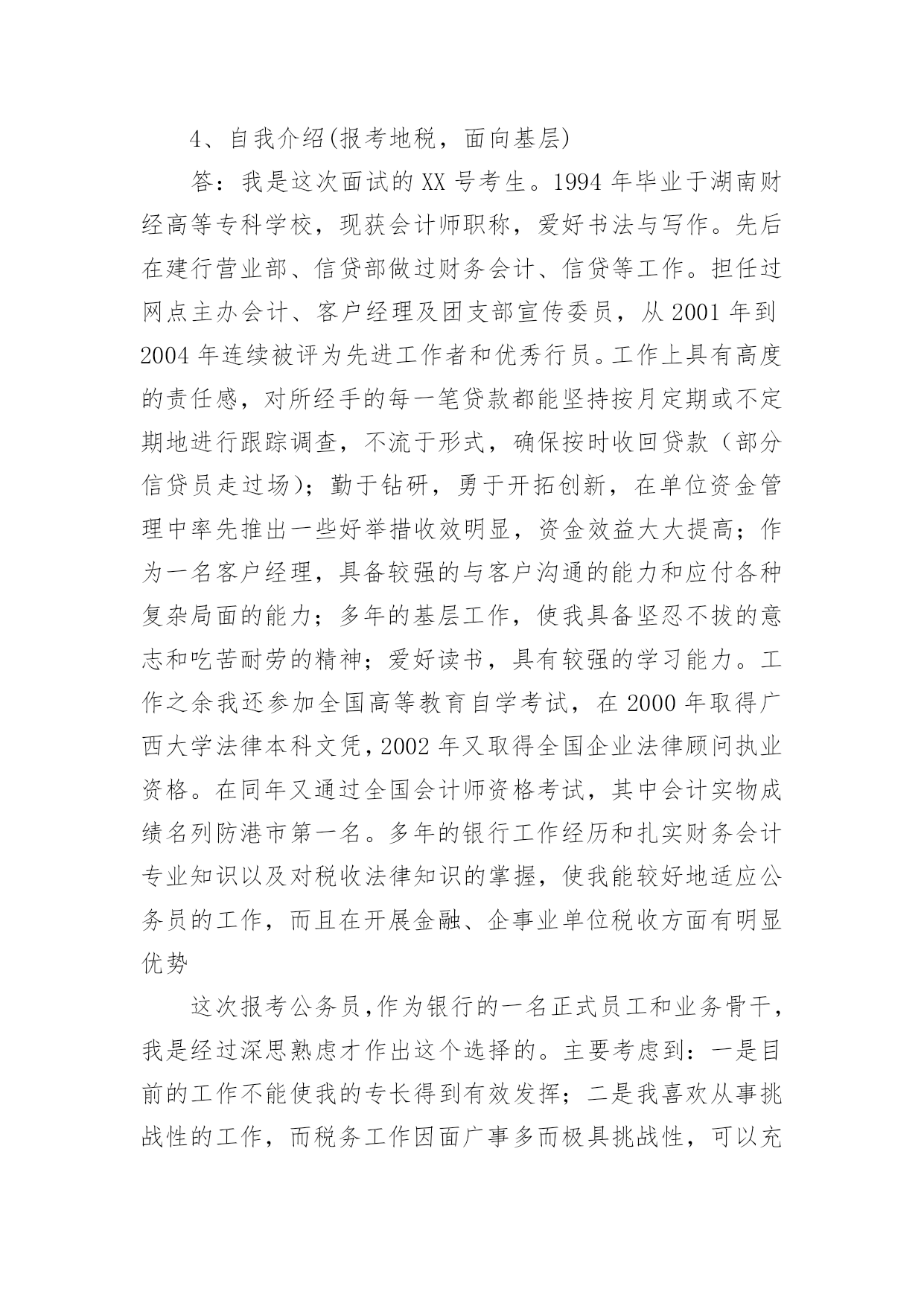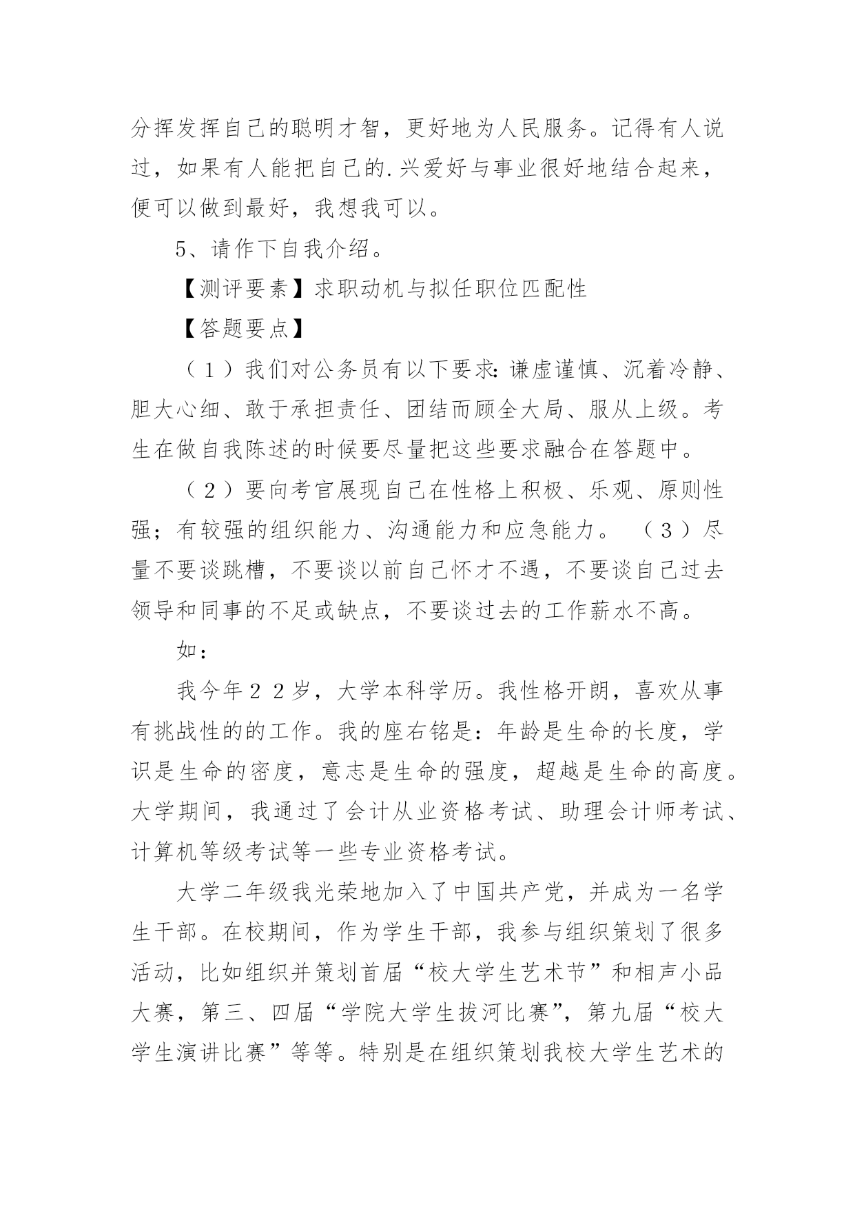 自我介绍与求职动机自我介绍与求职动机自我介绍与求职动机1、假如我们对你在面试中的表现不是很满意。再给你一次机会,请你说服各位考官改变对你的印象。答:各位考官,各位老师,大家好,感谢您们能再次给我这样一次宝贵的机会。对于这次面试。我想讲三点:1、我紧张,是由于我太珍惜。考上公务员,借助公务员这样一个平台,为国家、为百姓做点力所能及的事情,在为人民服务的崇高理想与信念中升华自己,实现自身价值,这一直是我多年来的梦想与追求,今天,面对马上可以实现自己梦想的一道门槛,我突然有些紧张,我怕自己跨越太远,仆倒在地,跨越太近,被档在门外,我紧张,是由于我太珍惜。2、有暇疵,是由于我太真实。真实、自然是我的一贯风格,真诚待人,真情接物,真实答题,因为真实,所以可能不那么完美,因为真实,所以可能会有暇疵,但即便如此,我还是选择了真实。3、有不足,但我更有自信。面试时间虽短,意义重大,各位考官如此辛苦,目的就是想通过多方面的观察,把真正有志于当公务员,愿意为国家、为人民贡献青春和热血,品德好、思想纯的年轻人选拔进国家公务员队伍。因此,尽管我在这次面试中表现出了这样那样的不足,但我还是自信各位考官能做出最科学的决策。2、你为什么要报考公务员?(考生报考的是卫生局科员)答:这次我报考的是卫生局科员,之所以报考这个职位我是基于以下几个方面的考虑:一、公务员一直都是我向往的职业,这是由公务员的重要性决定的,因为公务员是国家机器的一个齿轮,是国家大厦的基石,是国家意志的具体执行者。二、我认为我初步具备了成为一名合格的公务员应具备的素质。我具有较强的为人处事的能力,遇事比较冷静、处理事情层次分明,干脆利落,做事认真、稳重、耐心细致。而且我出生于教师之家,从小就喜欢看书,比较关心政治,知识面比较广,学习能力比较强。由于爱好读书,语言和文字表达能力还不错。总的来说,我觉得自己分析和解决问题的能力较强,口头语言和文字表达能力还不错。3、你为什么要报考公务员?(经典答案一)答:1、人和工作的关系是建立在自我认知的基础上的。通过几年的工作我发现我的性格特点:(省略,自己发挥)。我的自我认知让我觉得我做公务员是一个正确的选择。2、我是一个进取心或者工作成就心很强的人,我不喜欢闲着。公务员活动比较多而且能遇到不同的新问题,我觉得很有挑战性,我喜欢挑战。3、我从小受到的教育是很传统的,喜欢助人为乐,很佩服古人的高风亮节。公务员有广泛的社会功能,这个职位能让我实现我的社会理想,因此对这项工作有着浓厚的兴趣和热情。也正是因为这个原因我宁愿放弃现在单位的高收入来报考公务员。4.总之,人们都在追求美好的东西,都有自己的职业目标,我的职业目标可以通过公务员来实现。4、自我介绍(报考地税,面向基层)答:我是这次面试的XX号考生。1994年毕业于湖南财经高等专科学校,现获会计师职称,爱好书法与写作。先后在建行营业部、信贷部做过财务会计、信贷等工作。担任过网点主办会计、客户经理及团支部宣传委员,从2001年到2004年连续被评为先进工作者和优秀行员。工作上具有高度的责任感,对所经手的每一笔贷款都能坚持按月定期或不定期地进行跟踪调查,不流于形式,确保按时收回贷款(部分信贷员走过场);勤于钻研,勇于开拓创新,在单位资金管理中率先推出一些好举措收效明显,资金效益大大提高;作为一名客户经理,具备较强的与客户沟通的能力和应付各种复杂局面的能力;多年的基层工作,使我具备坚忍不拔的意志和吃苦耐劳的精神;爱好读书,具有较强的学习能力。工作之余我还参加全国高等教育自学考试,在2000年取得广西大学法律本科文凭,2002年又取得全国企业法律顾问执业资格。在同年又通过全国会计师资格考试,其中会计实物成绩名列防港市第一名。多年的银行工作经历和扎实财务会计专业知识以及对税收法律知识的掌握,使我能较好地适应公务员的工作,而且在开展金融、企事业单位税收方面有明显优势这次报考公务员,作为银行的一名正式员工和业务骨干,我是经过深思熟虑才作出这个选择的。主要考虑到:一是目前的工作不能使我的专长得到有效发挥;二是我喜欢从事挑战性的工作,而税务工作因面广事多而极具挑战性,可以充分挥发挥自己的聪明才智,更好地为人民服务。记得有人说过,如果有人能把自己的.兴爱好与事业很好地结合起来,便可以做到最好,我想我可以。5、请作下自我介绍。【测评要素】求职动机与拟任职位匹配性【答题要点】(1)我们对公务员有以下要求:谦虚谨慎、沉着冷静、胆大心细、敢于承担责任、团结而顾全大局、服从上级。考生在做自我陈述的时候要尽量把这些要求融合在答题中。(2)要向考官展现自己在性格上积极、乐观、原则性强;有较强的组织能力、沟通能力和应急能力。(3)尽量不要谈跳槽,不要谈以前自己怀才不遇,不要谈自己过去领导和同事的不足或缺点,不要谈过去的工作薪水不高。如:我
