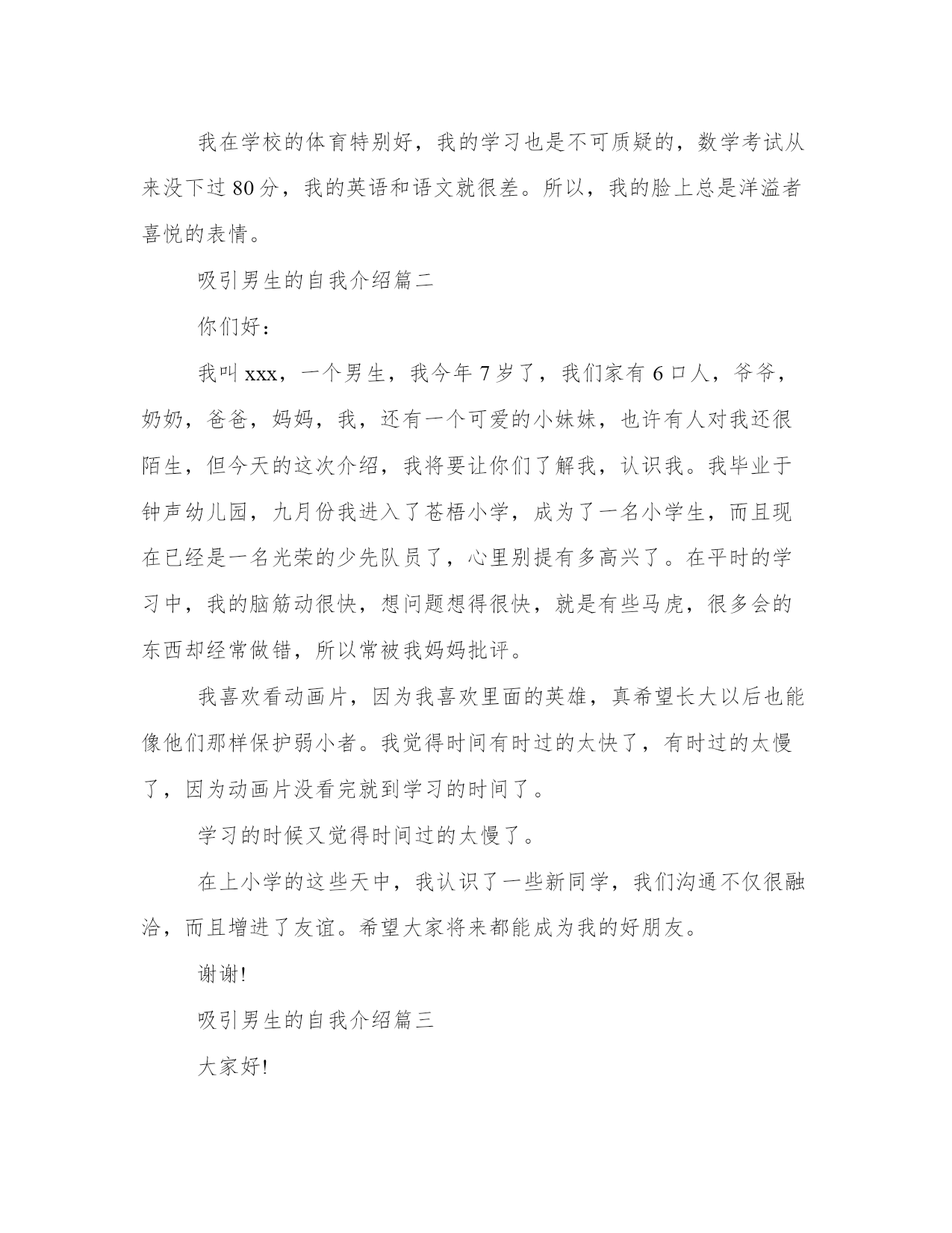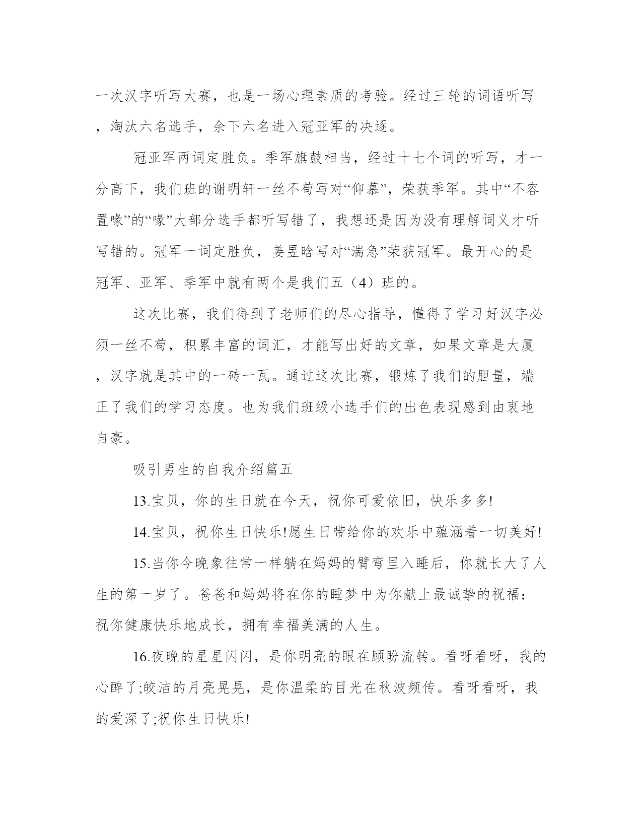 最新吸引男生的自我介绍男生的自我介绍(模板15篇)人的记忆力会随着岁月的流逝而衰退,写作可以弥补记忆的不足,将曾经的人生经历和感悟记录下来,也便于保存一份美好的回忆。范文怎么写才能发挥它最大的作用呢?以下是小编为大家收集的优秀范文,欢迎大家分享阅读。吸引男生的自我介绍篇一大家好,我叫陈宇恒,小名月月。今天就来介绍下我。我爱好有许多,但琴棋书画样样不通,不过唯一通的就是打篮球了和电脑了,只见赛场上我双手握球,三步投篮,嘿,球进了,虽然是我练习的第一百次才进的。说起玩电脑我可是资深很高的,自从才玩时被高手打的弱花流水,就下定决心练,后来我发扬不怕热不怕苦的精神,终于成了新一代玩神。我呢,也比节约了,买个爆米花,那了50个一角,人家数了半天才ok的。我有一个理想就当个总统什么的,不说啦,去做白日梦了。嗨,大家好!我叫xxx,来自某某小学是一个活泼开朗的男孩,我的身材有点胖,很多人给我起来外号,但我一点也不生气,因为谁叫我那么胖。我的性格是很喜欢帮助别人因此别人对我的印象都很好,我的爱好是喜欢和朋友们一起玩耍,我的优点不算多但也不少其中帮助人是我的优点之一。我在学校的体育特别好,我的学习也是不可质疑的,数学考试从来没下过80分,我的英语和语文就很差。所以,我的脸上总是洋溢者喜悦的表情。吸引男生的自我介绍篇二你们好:我叫xxx,一个男生,我今年7岁了,我们家有6口人,爷爷,奶奶,爸爸,妈妈,我,还有一个可爱的小妹妹,也许有人对我还很陌生,但今天的这次介绍,我将要让你们了解我,认识我。我毕业于钟声幼儿园,九月份我进入了苍梧小学,成为了一名小学生,而且现在已经是一名光荣的少先队员了,心里别提有多高兴了。在平时的学习中,我的脑筋动很快,想问题想得很快,就是有些马虎,很多会的东西却经常做错,所以常被我妈妈批评。我喜欢看动画片,因为我喜欢里面的英雄,真希望长大以后也能像他们那样保护弱小者。我觉得时间有时过的太快了,有时过的太慢了,因为动画片没看完就到学习的时间了。学习的时候又觉得时间过的太慢了。在上小学的这些天中,我认识了一些新同学,我们沟通不仅很融洽,而且增进了友谊。希望大家将来都能成为我的好朋友。谢谢!吸引男生的自我介绍篇三大家好!我叫吴佳宜,今年十二岁,生日是四月十七日,可爱的白羊座,万能的o型血。我是那种“静如处女,动如脱兔”的类型,鼻梁上架着一副眼镜,哎!都是电脑惹的祸啊!我个子不算高,不过短小精悍,浓缩就是精华嘛!我的成绩嘛,小学在班上还不错喽,多次获得各科奖项,曾任班长、中队长、大队委和副大队长,也是老师的得意弟子,然而这都已成为过去。在现今这个高手云集的班级里,我已感到了压力。不过我相信,压力就是动力,我一定会努力加油的!我喜欢体育,爱跑步、跳绳和乒乓球,小学还多次在运动会上获奖;我经常参加学校组织的各类活动,表现也比较好,很多时候,都被当成榜样。以前班上的同学和朋友都上了各自不同的中学,到水二中的很少。所以,在新的环境中,我相信我会认识更多的新朋友,希望大家也能愿意和我交朋友。通过我的描述,相信大家对我有所了解了吧,在接下来的三年的学习期间,希望我们愉快相处。吸引男生的自我介绍篇四在20xx年4月2号,我们钱塘外语学校小学部进行了“我是汉字王”的汉字听写大赛。在博大精深的中华文明中,从古到今,中华字海中统计汉字字数达85000个字。常用字大概有六千个字,要学好汉字,要经过长时间的积累才能做到,今天让我们一暏钱塘学子的风采。我们五年级的小选手经过班级海选每个班选出三个人,一共十二个人,初次上台的小选手面对一百多个人,难免有些紧张,这不限是一次汉字听写大赛,也是一场心理素质的考验。经过三轮的词语听写,淘汰六名选手,余下六名进入冠亚军的决逐。冠亚军两词定胜负。季军旗鼓相当,经过十七个词的听写,才一分高下,我们班的谢明轩一丝不苟写对“仰慕”,荣获季军。其中“不容置喙”的“喙”大部分选手都听写错了,我想还是因为没有理解词义才听写错的。冠军一词定胜负,姜昱晗写对“湍急”荣获冠军。最开心的是冠军、亚军、季军中就有两个是我们五(4)班的。这次比赛,我们得到了老师们的尽心指导,懂得了学习好汉字必须一丝不苟,积累丰富的词汇,才能写出好的文章,如果文章是大厦,汉字就是其中的一砖一瓦。通过这次比赛,锻炼了我们的胆量,端正了我们的学习态度。也为我们班级小选手们的出色表现感到由衷地自豪。吸引男生的自我介绍篇五13.宝贝,你的生日就在今天,祝你可爱依旧,快乐多多!14.宝贝,祝你生日快乐!愿生日带给你的欢乐中蕴涵着一切美好!15.当你今晚象往常一样躺在妈妈的臂弯里入睡后,你就长大了人生的第一岁了。爸爸和妈妈将在你的睡梦中为你献上最诚挚的祝福:祝你健康快乐地成长,拥有幸福美满的人生。16.夜晚的星星闪闪