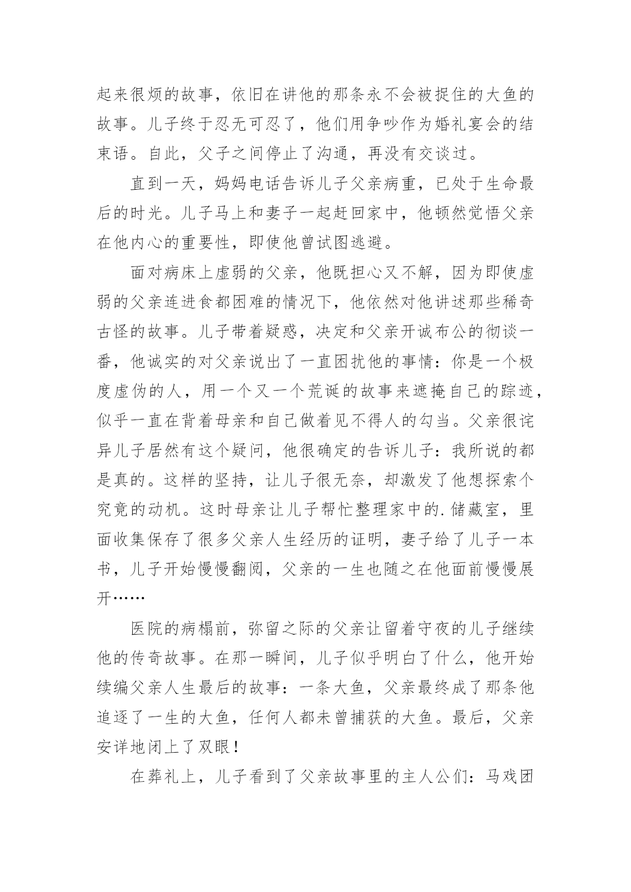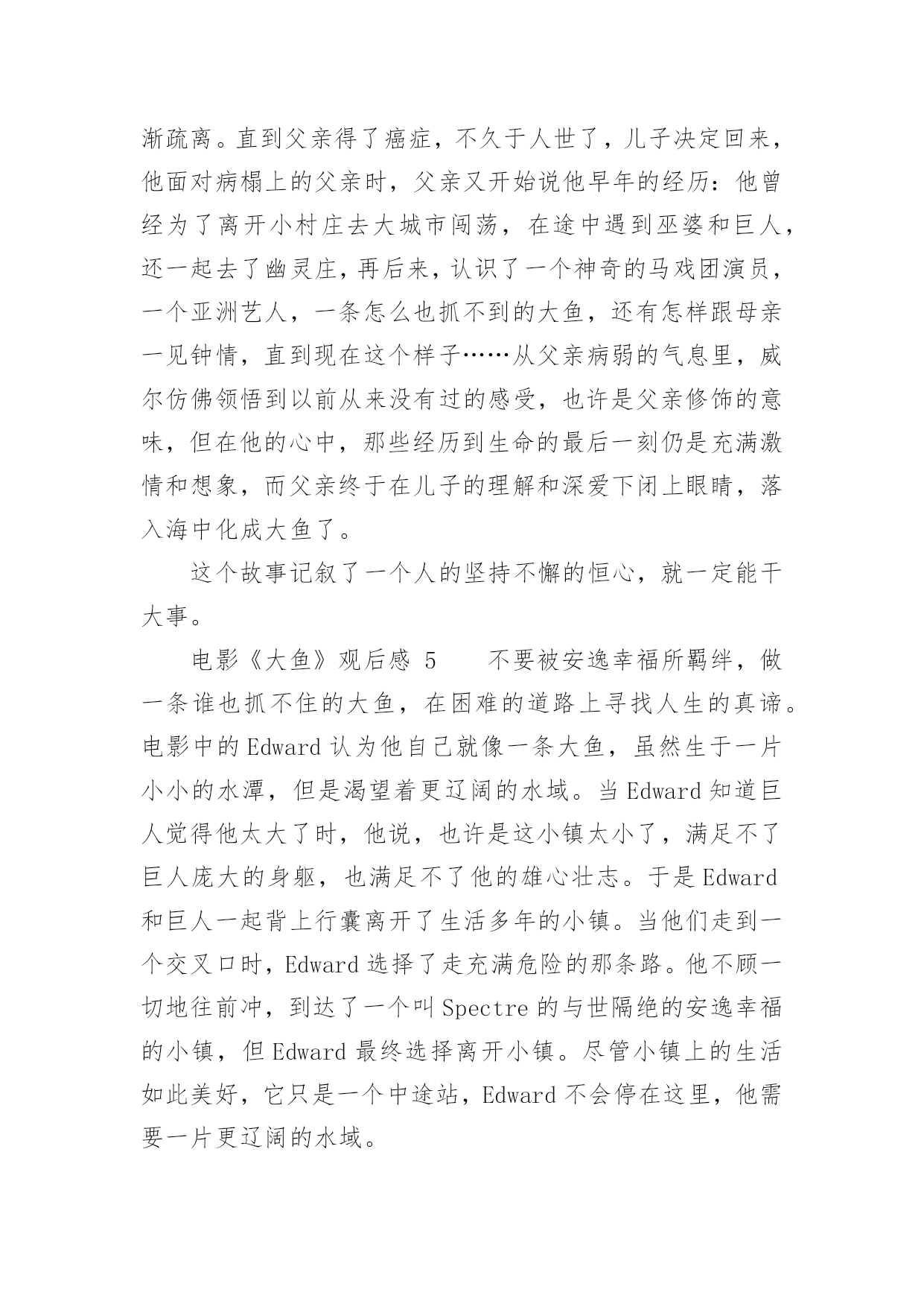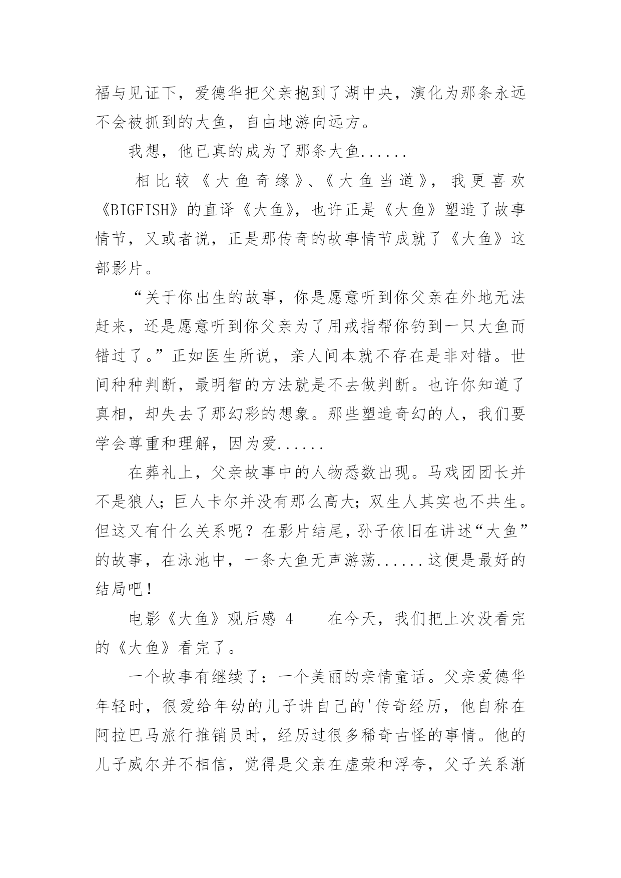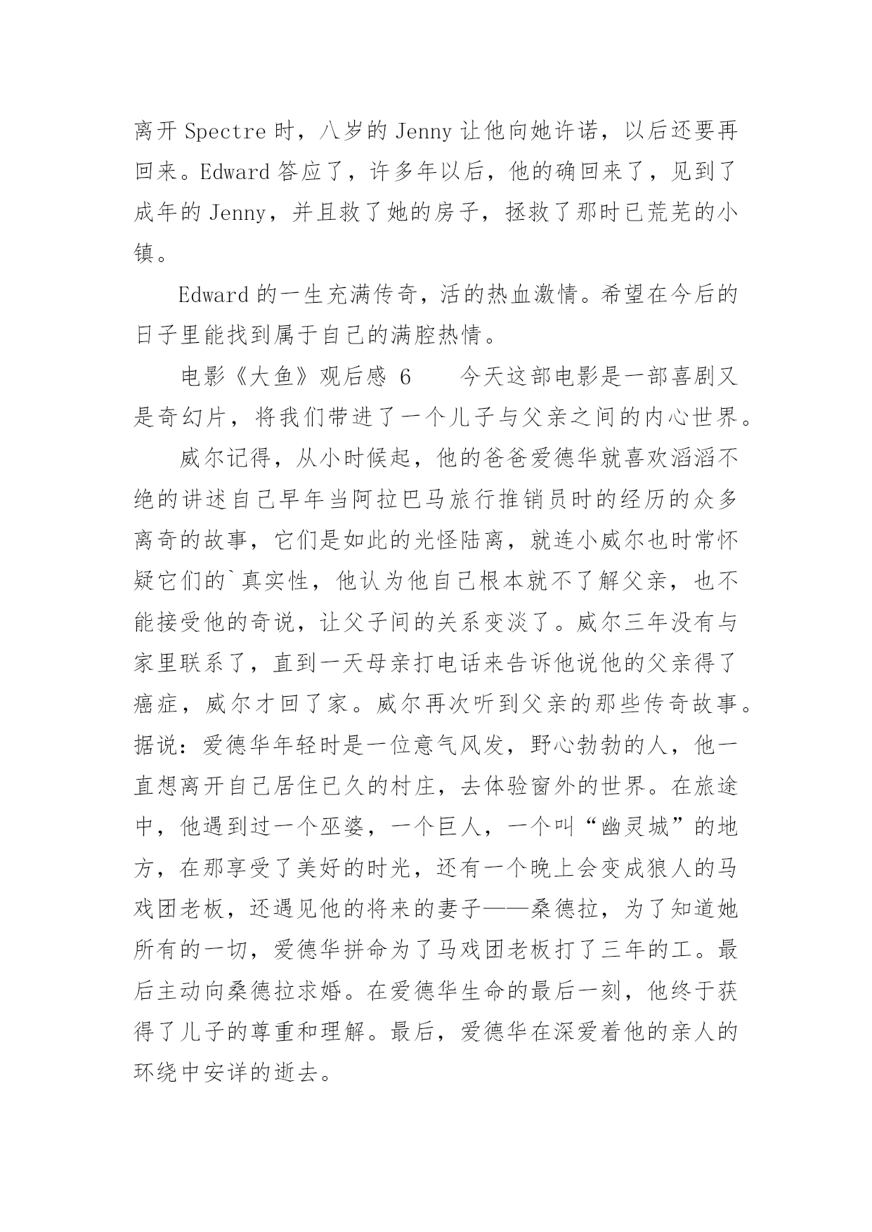 电影《大鱼》观后感电影《大鱼》观后感(通用16篇)认真观看完一部影视作品以后,从中我们收获新的思想,现在就让我们写一篇走心的观后感吧。可是观后感怎么写才合适呢?以下是小编为大家整理的电影《大鱼》观后感,仅供参考,希望能够帮助到大家。电影《大鱼》观后感1看过许多电影,但却最推荐蒂姆·波顿导演的《大鱼》。电影以孩子的口吻来叙述爸爸传奇的一生。爱德华·布鲁姆是个喜欢吹牛的老头,总喜欢炫耀年轻时旅行推销的经历,儿子并不相信,认为父亲很虚荣浮夸,父子关系渐渐疏离。直到父亲不久于人世,儿子决定回去见父亲最后一面,他终于领悟到父亲充满激情和想象的一生。这是一部关于父爱又不仅仅是父爱的电影。男主威尔孩童时期认为自己的父亲无所不能,如高山大海般强大,精心呵护着他。父亲爱德华日日夜夜为他讲述其年轻时的传奇经历,威尔对这些故事充满了好奇,对父亲很是崇拜。然而随着威尔一天天长大,他明白了这些故事不过是父亲编造出来的谎言,并非真实发生,威尔开始产生排斥和不理解。最终在威尔婚礼上,当父亲再次向来宾讲述故事时,他爆发了,带着妻子离开了父亲和家乡。后来父亲得了癌症,威尔回到父亲身边,理解了父亲的所有故事。少年时的爱德华胆量非常大。一个夜黑风高的夜晚,他带着小伙伴来到森林深处的女巫家,据说人们可以在女巫的右眼中看到自己的未来和死亡的方式。当其他孩子们看到自己的死亡方式后恐惧的逃走,只有爱德华看到自己的命中归宿后有了明确的目标,从此无所畏惧,大胆的挑战各种危险,因为他知道自己不会这样死去。这样他成了全村最勇敢的男人。爱德华怂恿镇子里的巨人一起到大城市发展,在途中遇到一个分岔口。一条是平坦的新路,一条是布满荆棘的老路。爱德华选择了老路,路上他意外的发现了一个世外桃源的小镇,镇子的入口处高高系着挂满鞋子的绳子,这里的人们都光着脚,每天载歌载舞,过着无忧无虑的生活。人们热情地招待了爱德华,小女孩珍妮偷走了他的鞋挂到入口处的绳子上。爱德华选择过安逸的生活,永远留在这里。有一天,爱德华在湖水中看到了人鱼的背影,他跳下水中去寻找,却始终触及不到,这才惊觉过来,这里的一切太过虚幻,这并不是自己想要的。于是他不顾人们的挽留光着脚离开了小镇。一路上,爱德华摆脱了树妖的缠绕终于与巨人碰头来到了城市。爱德华在马戏团中遇到了一个女孩,他一见钟情,坠入爱河。为了得知女孩的消息,他决定在马戏团免费做苦力。经过努力,爱德华终于抱得美人归,与狼人老板成为了好朋友,巨人也找了自己的归宿。多年后,爱德华回到荆棘路中遇到的小镇,此时的小镇早已没了世外桃源的景象,破败不堪,人们失去了当年的单纯摸样,小女孩珍妮也已成年。威尔细细回忆着父亲的一生,心中充满触动,他决心寻找父亲故事里的人和事物。威尔来到了父亲故事里的小镇,找到了珍妮。珍妮告诉威尔当年爱德华帮助破败的'小镇恢复原貌后就再也没有回去过。临别时珍妮说:“我是虚构的,而你是他真实的部分”,让威尔开始陷入思考,自己对父亲的了解完全不够。在医院里,医生悄悄跟威尔说了两个关于他出生的版本。第一个:父亲在外地,不能来产房看着孩子出生。即便来了,也因为规定不能进来。这给父亲留下了非常大的遗憾;第二个:父亲在他出生的那天,在大河里用结婚戒指钓鱼,结果戒指被大鱼吃了,他从大鱼的嘴里夺回了戒指。并把戒指送个儿子当礼物。医生问,这两个版本你选择哪个?是我选择就后者。刹那间威尔明白了一切。最后,在爱德华弥留之际,威尔为父亲描述他最后的人生结局:儿子带着父亲逃出医院,坐上他年轻时开过的红色汽车,来到年轻时钓鱼的河边,河边草地站着他一生中所有交往过的朋友。他们微笑的告别,没有任何悲伤。儿子抱着父亲走向河里,妻子穿着红裙子站在河里微笑告别,父亲从嘴里取出戒指交给了他最爱的妻子,然后双臂合抱进入水里,化身为鱼游向远方。父亲听完这个故事后,满足的闭上了眼睛。在父亲的葬礼上,威尔见到了父亲故事中的所有人物。故事里的人都是真实存在的,只是巨人没有那么高,双胞胎姐妹也并非连体,大家聚在一起讲诉曾经和父亲在一起的美妙时光。电影结尾最后出现一句话:“你可曾听过一个笑话,因为听过太多次而忘记了它为何好笑?但是,当你再一次听到的时候,突然之间,它又变成全新的。于是,你想起来你最初为什么喜欢上它。”我想这就是爱德华最后的笑话吧。爱德华因为无数次讲了这个故事,自己也就成为了故事本身。父亲虽然离开,但故事却依然流传于世,他成为了不朽的传奇。小时候都喜欢听童话故事,向往故事中幸福生活的美好结局。但长大后,却再也不相信美丽的童话,因为知道故事都是假的。我们远离了童话,来到污浊的现实世界,开始把那些童话都称之为谎言。生活是平淡的,甚至有着许多磨难,可是爱德华却给生活插上了想象的翅膀,让这些平淡、磨难都变成了一种美丽的经历。他用自己的想象力去美化现实,这样才有继续承受痛苦的勇气,勇敢地生活下去。爱德华