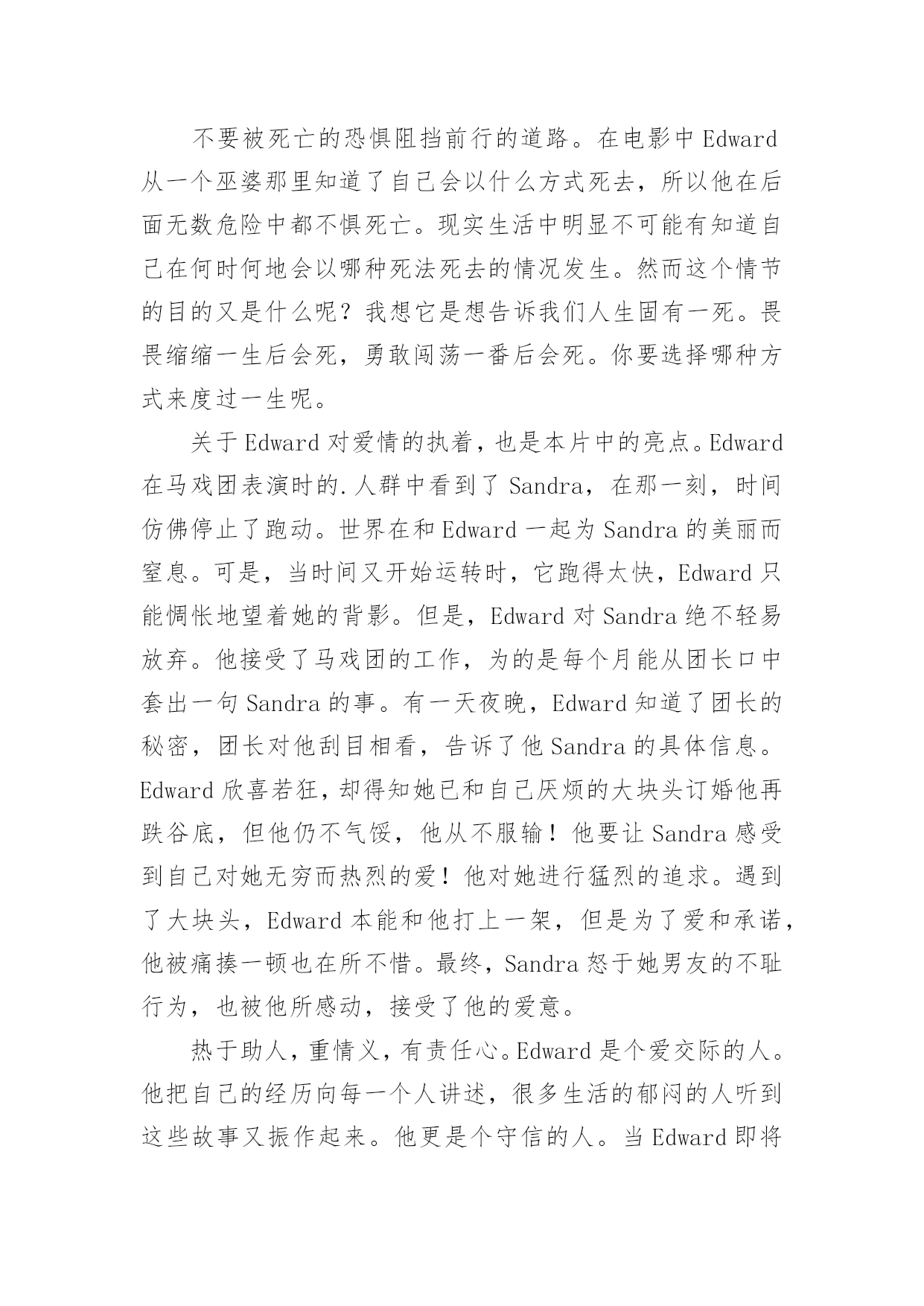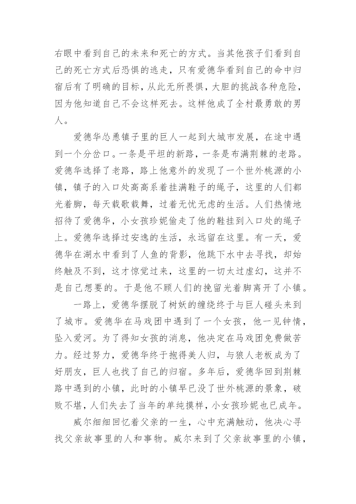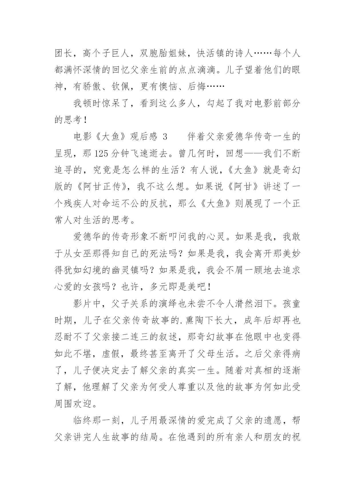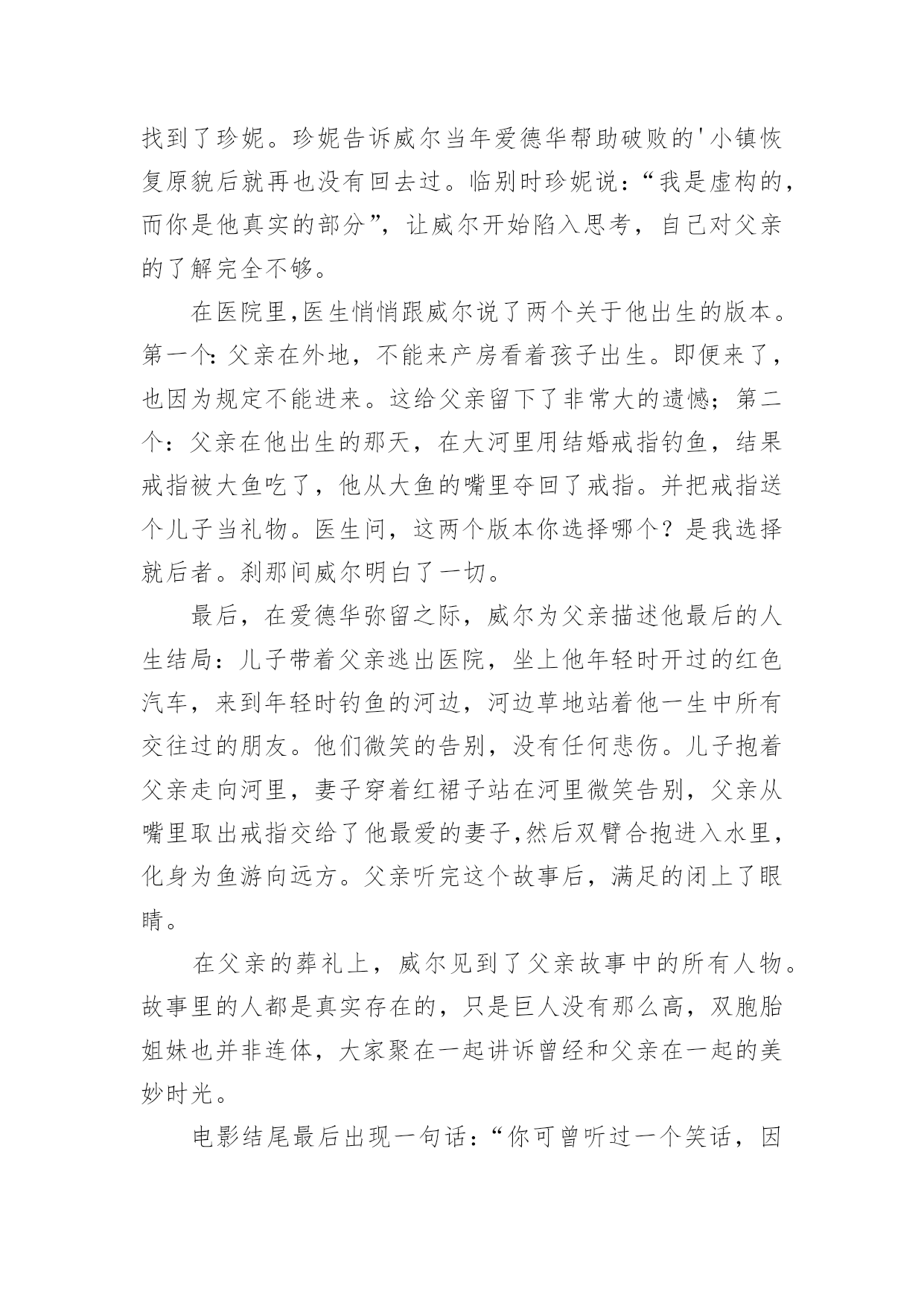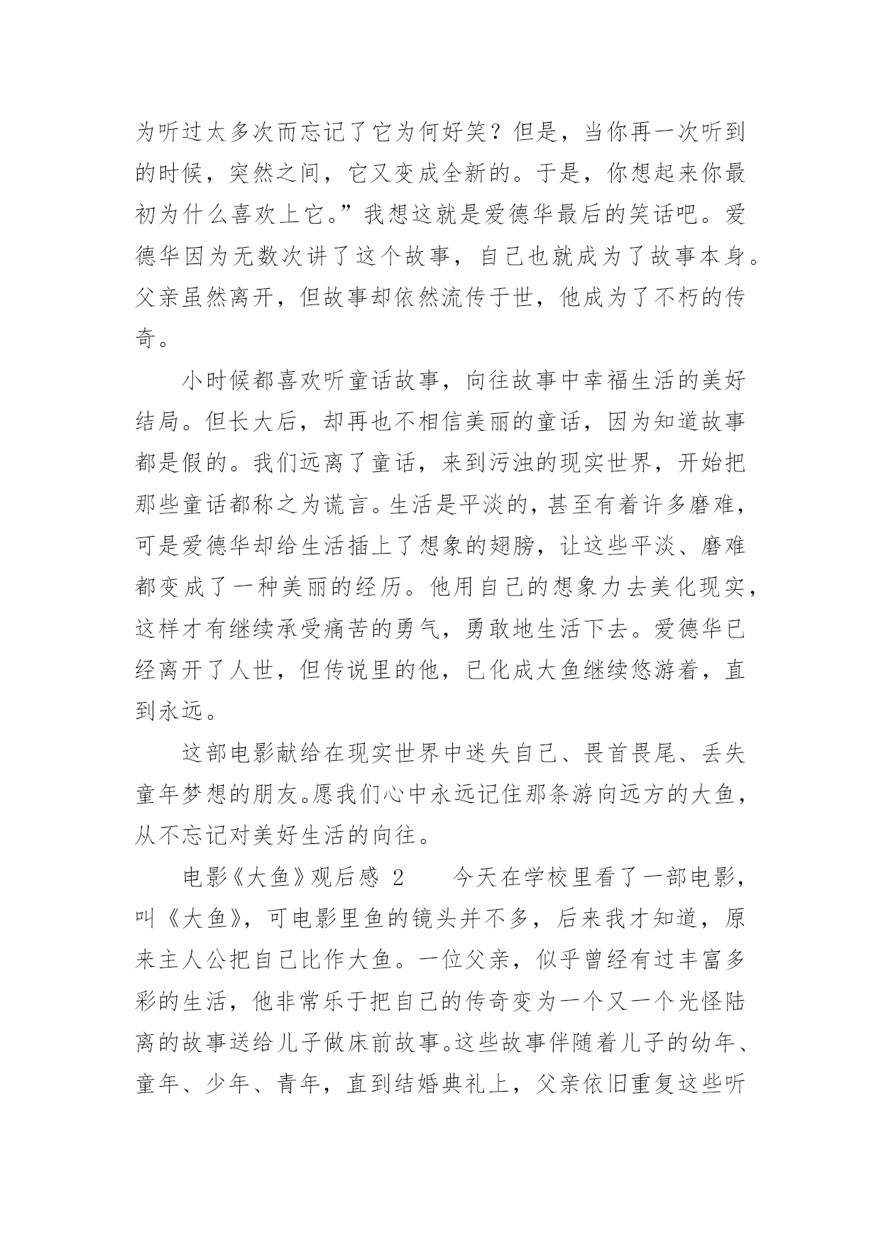 电影《大鱼》观后感电影《大鱼》观后感(通用16篇)认真观看完一部影视作品以后,从中我们收获新的思想,现在就让我们写一篇走心的观后感吧。可是观后感怎么写才合适呢?以下是小编为大家整理的电影《大鱼》观后感,仅供参考,希望能够帮助到大家。电影《大鱼》观后感1看过许多电影,但却最推荐蒂姆·波顿导演的《大鱼》。电影以孩子的口吻来叙述爸爸传奇的一生。爱德华·布鲁姆是个喜欢吹牛的老头,总喜欢炫耀年轻时旅行推销的经历,儿子并不相信,认为父亲很虚荣浮夸,父子关系渐渐疏离。直到父亲不久于人世,儿子决定回去见父亲最后一面,他终于领悟到父亲充满激情和想象的一生。这是一部关于父爱又不仅仅是父爱的电影。男主威尔孩童时期认为自己的父亲无所不能,如高山大海般强大,精心呵护着他。父亲爱德华日日夜夜为他讲述其年轻时的传奇经历,威尔对这些故事充满了好奇,对父亲很是崇拜。然而随着威尔一天天长大,他明白了这些故事不过是父亲编造出来的谎言,并非真实发生,威尔开始产生排斥和不理解。最终在威尔婚礼上,当父亲再次向来宾讲述故事时,他爆发了,带着妻子离开了父亲和家乡。后来父亲得了癌症,威尔回到父亲身边,理解了父亲的所有故事。少年时的爱德华胆量非常大。一个夜黑风高的夜晚,他带着小伙伴来到森林深处的女巫家,据说人们可以在女巫的右眼中看到自己的未来和死亡的方式。当其他孩子们看到自己的死亡方式后恐惧的逃走,只有爱德华看到自己的命中归宿后有了明确的目标,从此无所畏惧,大胆的挑战各种危险,因为他知道自己不会这样死去。这样他成了全村最勇敢的男人。爱德华怂恿镇子里的巨人一起到大城市发展,在途中遇到一个分岔口。一条是平坦的新路,一条是布满荆棘的老路。爱德华选择了老路,路上他意外的发现了一个世外桃源的小镇,镇子的入口处高高系着挂满鞋子的绳子,这里的人们都光着脚,每天载歌载舞,过着无忧无虑的生活。人们热情地招待了爱德华,小女孩珍妮偷走了他的鞋挂到入口处的绳子上。爱德华选择过安逸的生活,永远留在这里。有一天,爱德华在湖水中看到了人鱼的背影,他跳下水中去寻找,却始终触及不到,这才惊觉过来,这里的一切太过虚幻,这并不是自己想要的。于是他不顾人们的挽留光着脚离开了小镇。一路上,爱德华摆脱了树妖的缠绕终于与巨人碰头来到了城市。爱德华在马戏团中遇到了一个女孩,他一见钟情,坠入爱河。为了得知女孩的消息,他决定在马戏团免费做苦力。经过努力,爱德华终于抱得美人归,与狼人老板成为了好朋友,巨人也找了自己的归宿。多年后,爱德华回到荆棘路中遇到的小镇,此时的小镇早已没了世外桃源的景象,破败不堪,人们失去了当年的单纯摸样,小女孩珍妮也已成年。威尔细细回忆着父亲的一生,心中充满触动,他决心寻找父亲故事里的人和事物。威尔来到了父亲故事里的小镇,找到了珍妮。珍妮告诉威尔当年爱德华帮助破败的'小镇恢复原貌后就再也没有回去过。临别时珍妮说:“我是虚构的,而你是他真实的部分”,让威尔开始陷入思考,自己对父亲的了解完全不够。在医院里,医生悄悄跟威尔说了两个关于他出生的版本。第一个:父亲在外地,不能来产房看着孩子出生。即便来了,也因为规定不能进来。这给父亲留下了非常大的遗憾;第二个:父亲在他出生的那天,在大河里用结婚戒指钓鱼,结果戒指被大鱼吃了,他从大鱼的嘴里夺回了戒指。并把戒指送个儿子当礼物。医生问,这两个版本你选择哪个?是我选择就后者。刹那间威尔明白了一切。最后,在爱德华弥留之际,威尔为父亲描述他最后的人生结局:儿子带着父亲逃出医院,坐上他年轻时开过的红色汽车,来到年轻时钓鱼的河边,河边草地站着他一生中所有交往过的朋友。他们微笑的告别,没有任何悲伤。儿子抱着父亲走向河里,妻子穿着红裙子站在河里微笑告别,父亲从嘴里取出戒指交给了他最爱的妻子,然后双臂合抱进入水里,化身为鱼游向远方。父亲听完这个故事后,满足的闭上了眼睛。在父亲的葬礼上,威尔见到了父亲故事中的所有人物。故事里的人都是真实存在的,只是巨人没有那么高,双胞胎姐妹也并非连体,大家聚在一起讲诉曾经和父亲在一起的美妙时光。电影结尾最后出现一句话:“你可曾听过一个笑话,因为听过太多次而忘记了它为何好笑?但是,当你再一次听到的时候,突然之间,它又变成全新的。于是,你想起来你最初为什么喜欢上它。”我想这就是爱德华最后的笑话吧。爱德华因为无数次讲了这个故事,自己也就成为了故事本身。父亲虽然离开,但故事却依然流传于世,他成为了不朽的传奇。小时候都喜欢听童话故事,向往故事中幸福生活的美好结局。但长大后,却再也不相信美丽的童话,因为知道故事都是假的。我们远离了童话,来到污浊的现实世界,开始把那些童话都称之为谎言。生活是平淡的,甚至有着许多磨难,可是爱德华却给生活插上了想象的翅膀,让这些平淡、磨难都变成了一种美丽的经历。他用自己的想象力去美化现实,这样才有继续承受痛苦的勇气,勇敢地生活下去。爱德华