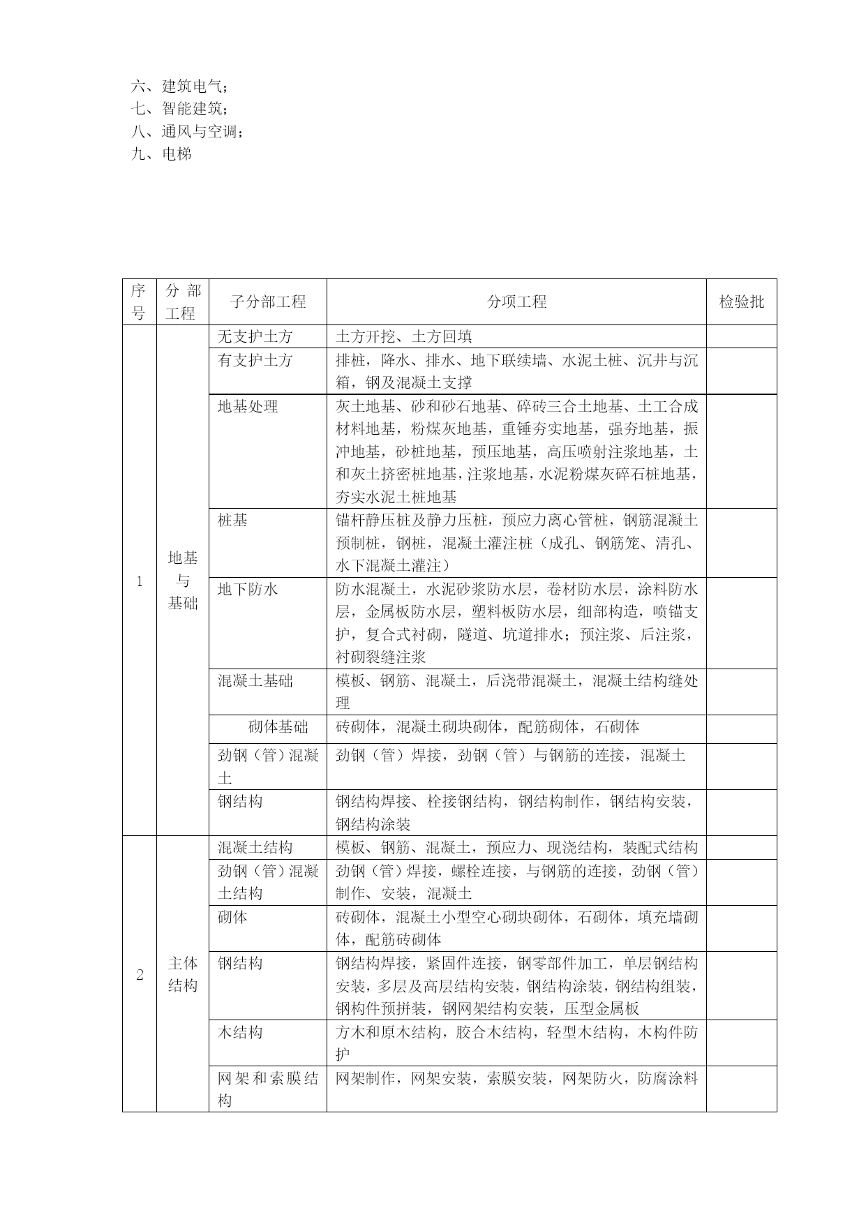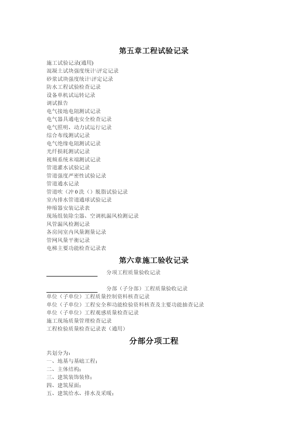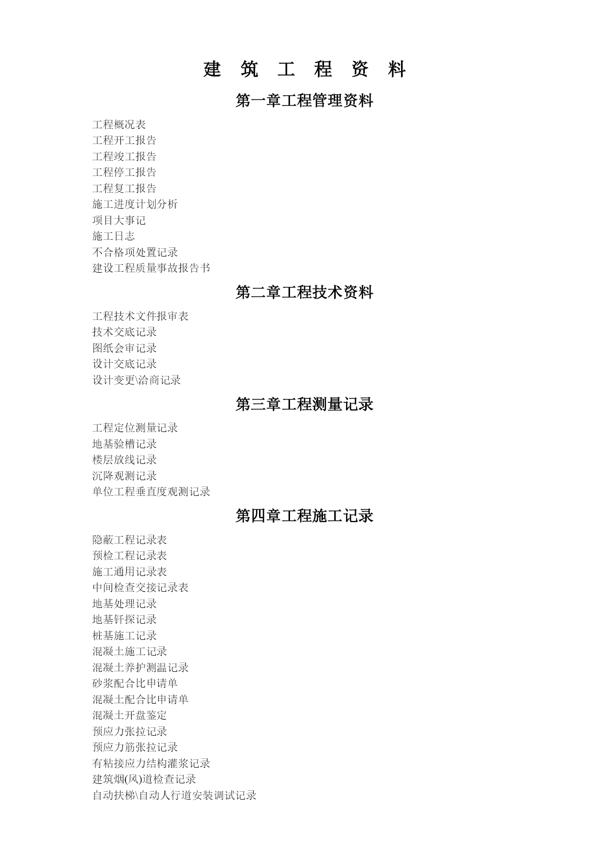 建筑工程资料表优质资料(可以直接使用,可编辑优质资料,欢迎下载)建筑工程资料第一章工程管理资料工程概况表工程开工报告工程竣工报告工程停工报告工程复工报告施工进度计划分析项目大事记施工日志不合格项处置记录建设工程质量事故报告书第二章工程技术资料工程技术文件报审表技术交底记录图纸会审记录设计交底记录设计变更\洽商记录第三章工程测量记录工程定位测量记录地基验槽记录楼层放线记录沉降观测记录单位工程垂直度观测记录第四章工程施工记录隐蔽工程记录表预检工程记录表施工通用记录表中间检查交接记录表地基处理记录地基钎探记录桩基施工记录混凝土施工记录混凝土养护测温记录砂浆配合比申请单混凝土配合比申请单混凝土开盘鉴定预应力张拉记录预应力筋张拉记录有粘接应力结构灌浆记录建筑烟(风)道检查记录自动扶梯\自动人行道安装调试记录第五章工程试验记录施工试验记录(通用)混凝土试块强度统计\评定记录砂浆试块强度统计\评定记录防水工程试验检查记录设备单机试运转记录调试报告电气接地电阻测试记录电气器具通电安全检查记录电气照明、动力试运行记录综合布线测试记录电气绝缘电阻测试记录光纤损耗测试记录视频系统末端测试记录管道灌水试验记录管道强度严密性试验记录管道通水记录管道吹(冲0洗()脱脂试验记录室内排水管道通球试验记录伸缩器安装记录表现场组装除尘器、空调机漏风检测记录风管漏风检测记录各房间室内风量测量记录管网风量平衡记录电梯主要功能检查记录表第六章施工验收记录分项工程质量验收记录分部(子分部)工程质量验收记录单位(子单位)工程质量控制资料核查记录单位(子单位)工程安全和功能检验资料核查及主要功能抽查记录单位(子单位)工程观感质量检查记录施工现场质量管理检查记录工程检验质量检查记录表(通用)分部分项工程共划分为:一、地基与基础工程;二、主体结构;三、建筑装饰装修;四、建筑屋面;五、建筑给水、排水及采暖;六、建筑电气;七、智能建筑;八、通风与空调;九、电梯序号分部工程子分部工程分项工程检验批1地基与基础无支护土方土方开挖、土方回填有支护土方排桩,降水、排水、地下联续墙、水泥土桩、沉井与沉箱,钢及混凝土支撑地基处理灰土地基、砂和砂石地基、碎砖三合土地基、土工合成材料地基,粉煤灰地基,重锤夯实地基,强夯地基,振冲地基,砂桩地基,预压地基,高压喷射注浆地基,土和灰土挤密桩地基,注浆地基,水泥粉煤灰碎石桩地基,夯实水泥土桩地基桩基锚杆静压桩及静力压桩,预应力离心管桩,钢筋混凝土预制桩,钢桩,混凝土灌注桩(成孔、钢筋笼、清孔、水下混凝土灌注)地下防水防水混凝土,水泥砂浆防水层,卷材防水层,涂料防水层,金属板防水层,塑料板防水层,细部构造,喷锚支护,复合式衬砌,隧道、坑道排水;预注浆、后注浆,衬砌裂缝注浆混凝土基础模板、钢筋、混凝土,后浇带混凝土,混凝土结构缝处理砌体基础砖砌体,混凝土砌块砌体,配筋砌体,石砌体劲钢(管)混凝土劲钢(管)焊接,劲钢(管)与钢筋的连接,混凝土钢结构钢结构焊接、栓接钢结构,钢结构制作,钢结构安装,钢结构涂装2主体结构混凝土结构模板、钢筋、混凝土,预应力、现浇结构,装配式结构劲钢(管)混凝土结构劲钢(管)焊接,螺栓连接,与钢筋的连接,劲钢(管)制作、安装,混凝土砌体砖砌体,混凝土小型空心砌块砌体,石砌体,填充墙砌体,配筋砖砌体钢结构钢结构焊接,紧固件连接,钢零部件加工,单层钢结构安装,多层及高层结构安装,钢结构涂装,钢结构组装,钢构件预拼装,钢网架结构安装,压型金属板木结构方木和原木结构,胶合木结构,轻型木结构,木构件防护网架和索膜结构网架制作,网架安装,索膜安装,网架防火,防腐涂料3建筑装饰装修地面整体面层;基层,水泥混凝土面层,水泥砂浆面层,水磨石面层,防油渗面层,水泥钢(铁)屑面层,不发火(防爆的)面层;板块面层:基层,砖面层(陶瓷锦砖、缸砖、陶瓷地砖和水泥花砖面层),大理石面层和花岗岩面层、预制板面层(预制水泥混凝土、水磨石板块面层),料石面层(条石、块石面层),塑料板面层,活动地板面层,地毯面层;木竹面层:基层、实木地板面层(条材、块材面层),实木复合地板面层(条材、块材面层),中密度(强化)复合地板面层(条材面层),竹地板面层抹灰一般抹灰,装饰抹灰,清水砌体勾缝门窗木门窗制作与安装,金属门窗安装,塑料门窗安装,特种门安装,门窗玻璃安装吊顶暗龙骨吊顶,明龙骨吊顶,活动隔墙,玻璃隔墙轻质隔墙板材隔墙,骨架隔墙,活动隔墙,玻璃隔墙饰面板(砖)饰面板安装,饰面板粘贴幕墙玻璃幕墙,金属幕墙,石材幕墙涂饰水性涂料涂饰,溶剂型涂料涂饰,美术涂饰裱糊与软包裱糊、软包细部橱柜制作