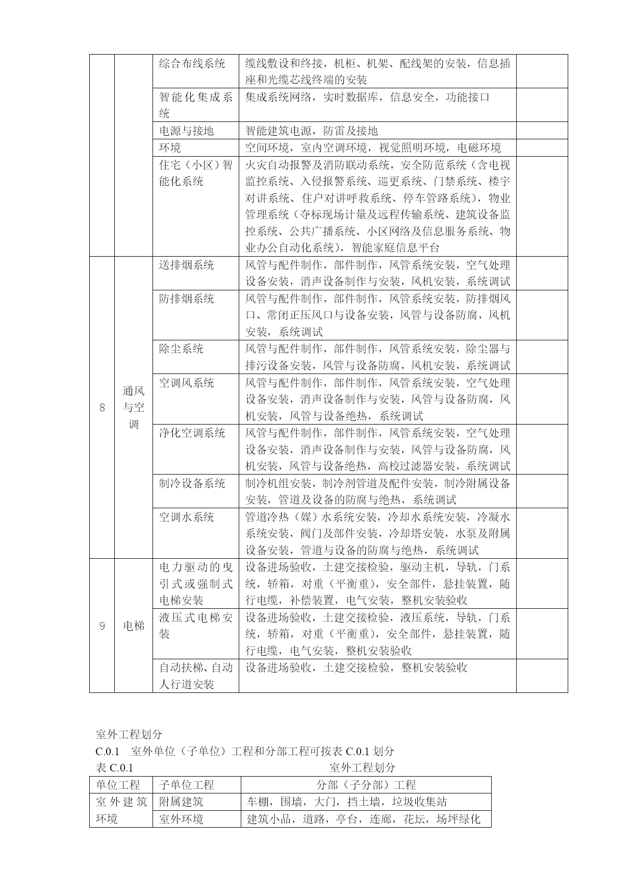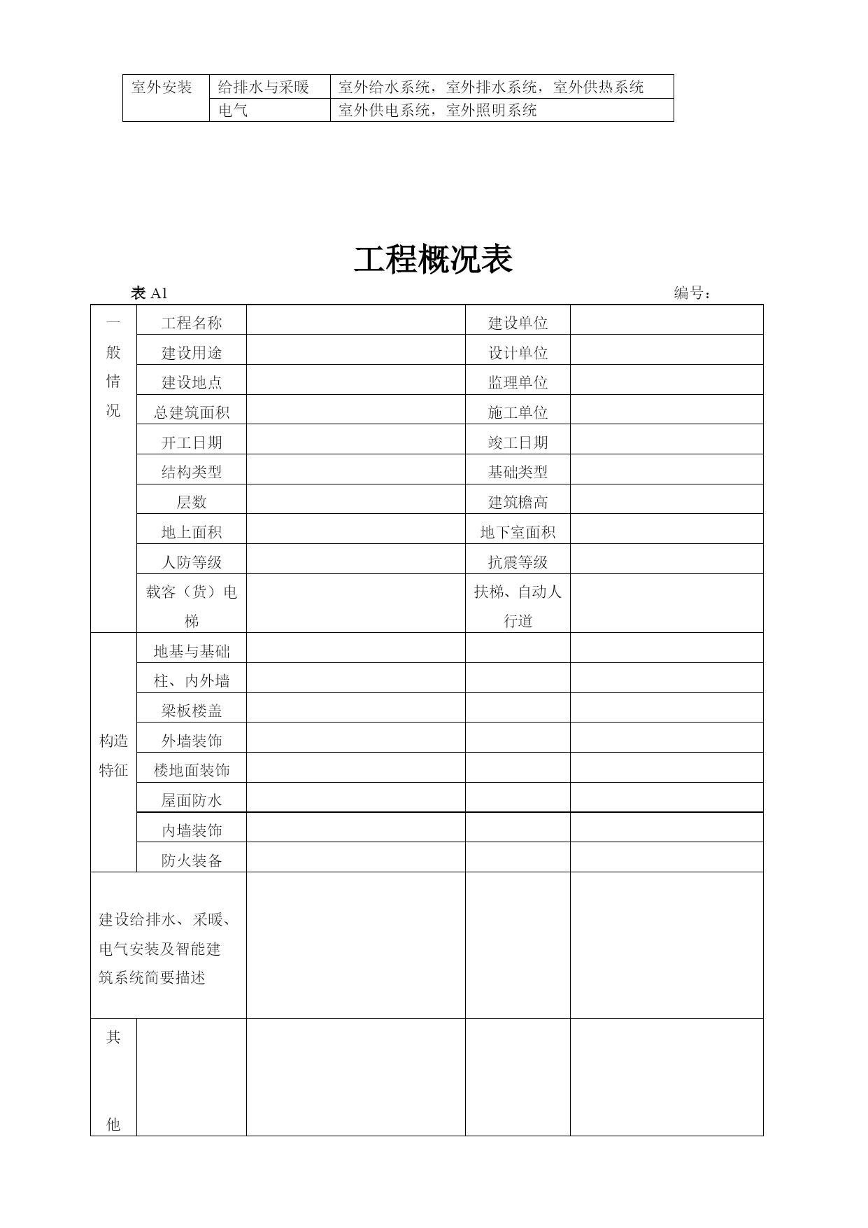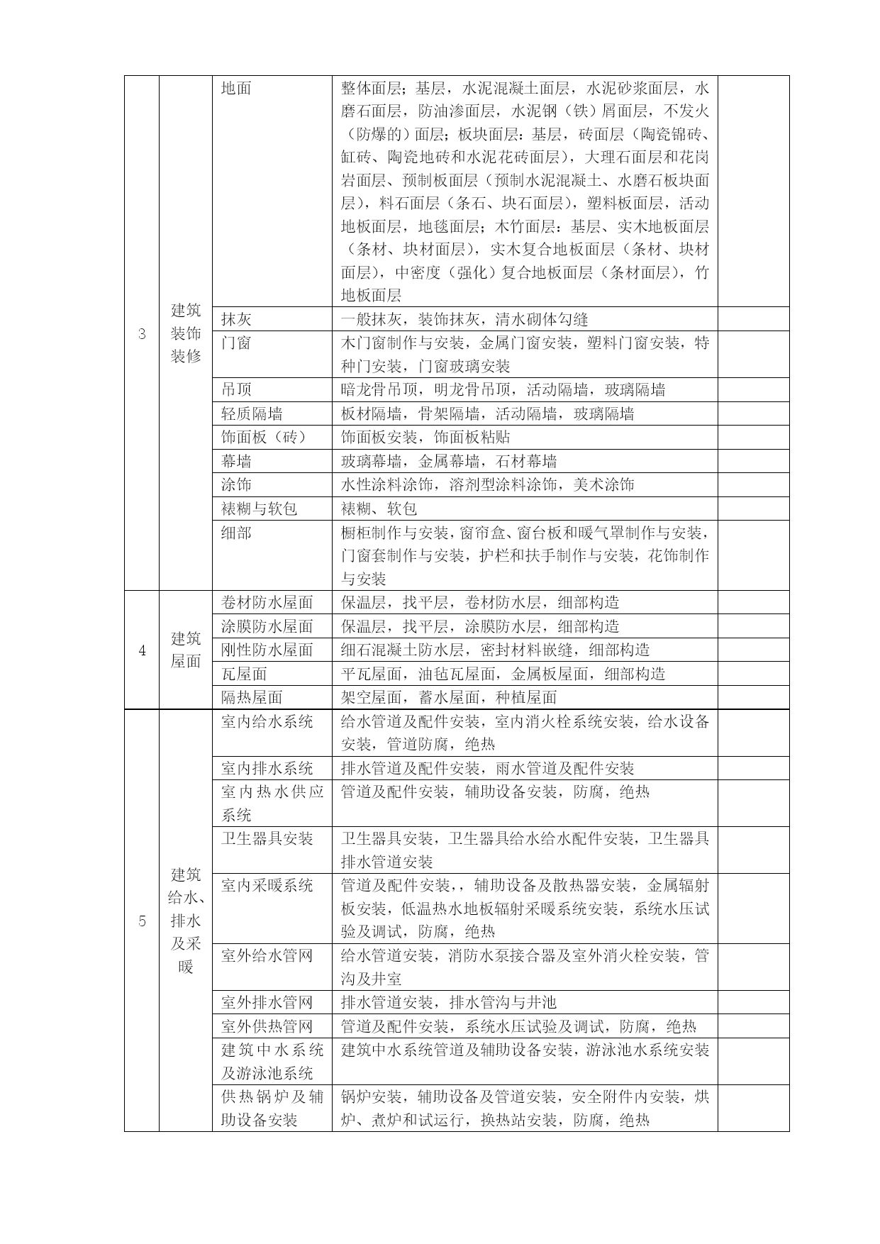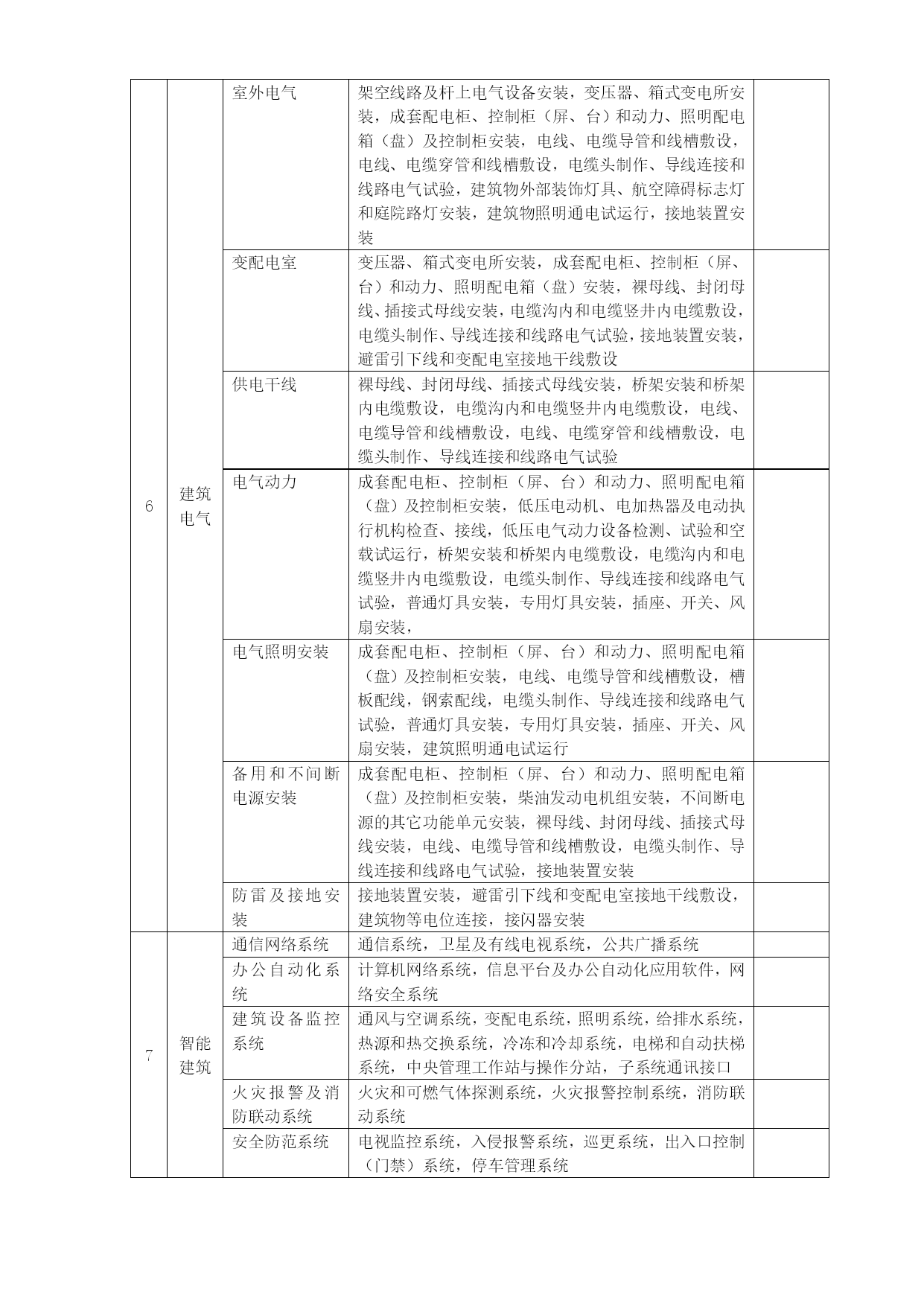 建筑工程资料表优质资料(可以直接使用,可编辑优质资料,欢迎下载)建筑工程资料第一章工程管理资料工程概况表工程开工报告工程竣工报告工程停工报告工程复工报告施工进度计划分析项目大事记施工日志不合格项处置记录建设工程质量事故报告书第二章工程技术资料工程技术文件报审表技术交底记录图纸会审记录设计交底记录设计变更\洽商记录第三章工程测量记录工程定位测量记录地基验槽记录楼层放线记录沉降观测记录单位工程垂直度观测记录第四章工程施工记录隐蔽工程记录表预检工程记录表施工通用记录表中间检查交接记录表地基处理记录地基钎探记录桩基施工记录混凝土施工记录混凝土养护测温记录砂浆配合比申请单混凝土配合比申请单混凝土开盘鉴定预应力张拉记录预应力筋张拉记录有粘接应力结构灌浆记录建筑烟(风)道检查记录自动扶梯\自动人行道安装调试记录第五章工程试验记录施工试验记录(通用)混凝土试块强度统计\评定记录砂浆试块强度统计\评定记录防水工程试验检查记录设备单机试运转记录调试报告电气接地电阻测试记录电气器具通电安全检查记录电气照明、动力试运行记录综合布线测试记录电气绝缘电阻测试记录光纤损耗测试记录视频系统末端测试记录管道灌水试验记录管道强度严密性试验记录管道通水记录管道吹(冲0洗()脱脂试验记录室内排水管道通球试验记录伸缩器安装记录表现场组装除尘器、空调机漏风检测记录风管漏风检测记录各房间室内风量测量记录管网风量平衡记录电梯主要功能检查记录表第六章施工验收记录分项工程质量验收记录分部(子分部)工程质量验收记录单位(子单位)工程质量控制资料核查记录单位(子单位)工程安全和功能检验资料核查及主要功能抽查记录单位(子单位)工程观感质量检查记录施工现场质量管理检查记录工程检验质量检查记录表(通用)分部分项工程共划分为:一、地基与基础工程;二、主体结构;三、建筑装饰装修;四、建筑屋面;五、建筑给水、排水及采暖;六、建筑电气;七、智能建筑;八、通风与空调;九、电梯序号分部工程子分部工程分项工程检验批1地基与基础无支护土方土方开挖、土方回填有支护土方排桩,降水、排水、地下联续墙、水泥土桩、沉井与沉箱,钢及混凝土支撑地基处理灰土地基、砂和砂石地基、碎砖三合土地基、土工合成材料地基,粉煤灰地基,重锤夯实地基,强夯地基,振冲地基,砂桩地基,预压地基,高压喷射注浆地基,土和灰土挤密桩地基,注浆地基,水泥粉煤灰碎石桩地基,夯实水泥土桩地基桩基锚杆静压桩及静力压桩,预应力离心管桩,钢筋混凝土预制桩,钢桩,混凝土灌注桩(成孔、钢筋笼、清孔、水下混凝土灌注)地下防水防水混凝土,水泥砂浆防水层,卷材防水层,涂料防水层,金属板防水层,塑料板防水层,细部构造,喷锚支护,复合式衬砌,隧道、坑道排水;预注浆、后注浆,衬砌裂缝注浆混凝土基础模板、钢筋、混凝土,后浇带混凝土,混凝土结构缝处理砌体基础砖砌体,混凝土砌块砌体,配筋砌体,石砌体劲钢(管)混凝土劲钢(管)焊接,劲钢(管)与钢筋的连接,混凝土钢结构钢结构焊接、栓接钢结构,钢结构制作,钢结构安装,钢结构涂装2主体结构混凝土结构模板、钢筋、混凝土,预应力、现浇结构,装配式结构劲钢(管)混凝土结构劲钢(管)焊接,螺栓连接,与钢筋的连接,劲钢(管)制作、安装,混凝土砌体砖砌体,混凝土小型空心砌块砌体,石砌体,填充墙砌体,配筋砖砌体钢结构钢结构焊接,紧固件连接,钢零部件加工,单层钢结构安装,多层及高层结构安装,钢结构涂装,钢结构组装,钢构件预拼装,钢网架结构安装,压型金属板木结构方木和原木结构,胶合木结构,轻型木结构,木构件防护网架和索膜结构网架制作,网架安装,索膜安装,网架防火,防腐涂料3建筑装饰装修地面整体面层;基层,水泥混凝土面层,水泥砂浆面层,水磨石面层,防油渗面层,水泥钢(铁)屑面层,不发火(防爆的)面层;板块面层:基层,砖面层(陶瓷锦砖、缸砖、陶瓷地砖和水泥花砖面层),大理石面层和花岗岩面层、预制板面层(预制水泥混凝土、水磨石板块面层),料石面层(条石、块石面层),塑料板面层,活动地板面层,地毯面层;木竹面层:基层、实木地板面层(条材、块材面层),实木复合地板面层(条材、块材面层),中密度(强化)复合地板面层(条材面层),竹地板面层抹灰一般抹灰,装饰抹灰,清水砌体勾缝门窗木门窗制作与安装,金属门窗安装,塑料门窗安装,特种门安装,门窗玻璃安装吊顶暗龙骨吊顶,明龙骨吊顶,活动隔墙,玻璃隔墙轻质隔墙板材隔墙,骨架隔墙,活动隔墙,玻璃隔墙饰面板(砖)饰面板安装,饰面板粘贴幕墙玻璃幕墙,金属幕墙,石材幕墙涂饰水性涂料涂饰,溶剂型涂料涂饰,美术涂饰裱糊与软包裱糊、软包细部橱柜制作