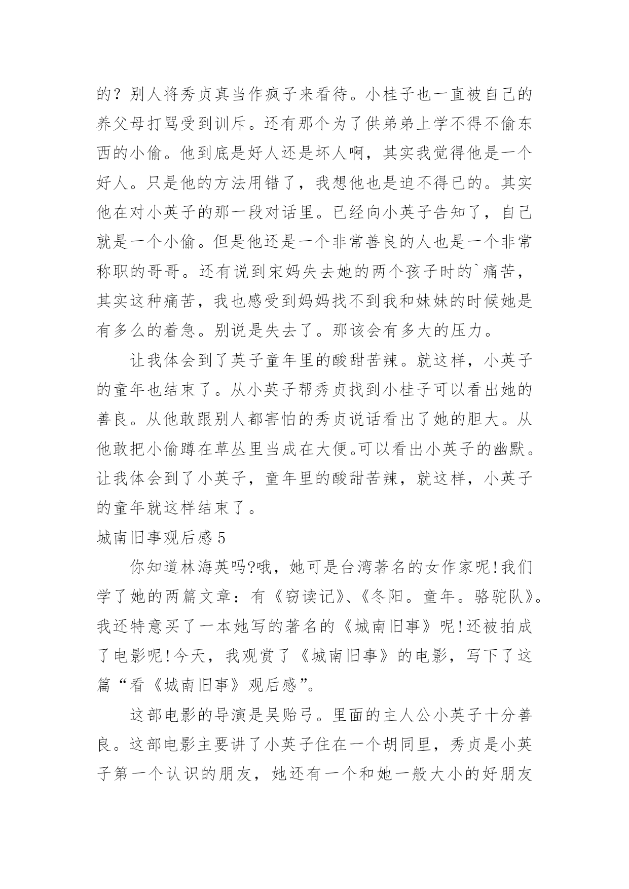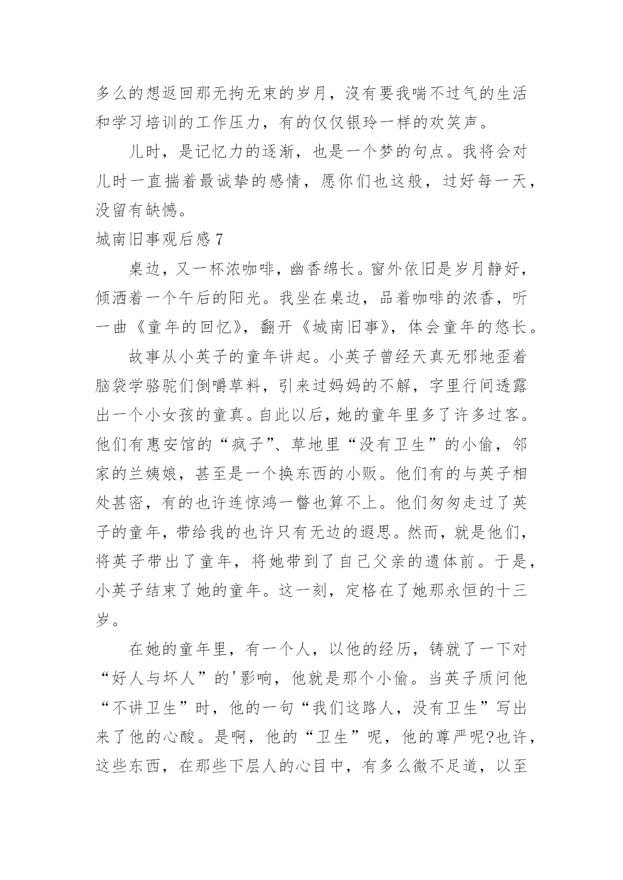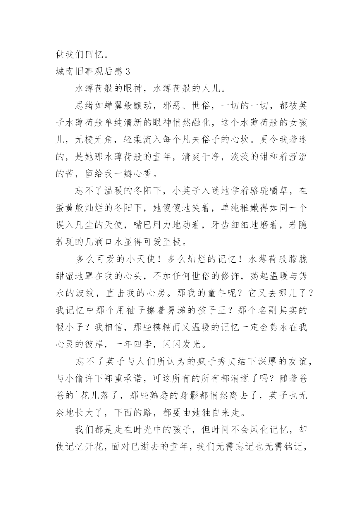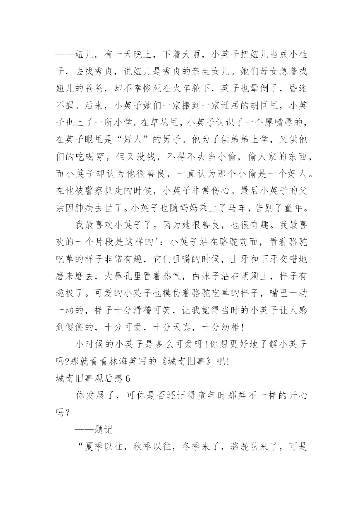 城南旧事观后感城南旧事观后感看完一部经典作品以后,相信大家有很多值得分享的东西吧,观后感需要表达真实的情感,不能虚假刻意。可能你现在毫无头绪吧,以下是小编为大家整理的城南旧事观后感,供大家参考借鉴,希望可以帮助到有需要的朋友。城南旧事观后感1为了让我们更好地理解爸爸的花儿落了一文,老师为我们播放了城南旧事。电影中的主人公小英子记叙了自己在北京度过的童年时光:她结识了惠安馆的疯子秀贞做朋友,其实她并不疯,只是因为丈夫回老家没有回来,孩子又被他妈送人了,所以伤心过度。而小英子呢,帮秀贞找到了孩子,但母女俩在回老家的途中双双丧命在火车轮下;小英子而后又结识了一位小偷,他并不坏,只是为了供成绩优异的弟弟上学才不得已走上犯罪道路的,但小英子不小心说漏了嘴,让便衣把他抓了个正着,使他锒铛入狱。最后,爸爸因为革命运动操劳过度,撒手人寰,宋妈也被她的丈夫接回了家——英子从此长大了。使我印象最深的,还是在电影的结尾,父亲去世可,家里唯一的经济来源没有了。就在这时,屏幕上出现了七次枫叶的变换,配着悲伤的音乐,代表着时间一次次的变迁。宋妈走了,小英子也走了,宋妈骑在毛驴上,英子跪在马车上,扭着头,彼此不舍的望着,直至化作模糊的一点,消失在一片悲哀之中。家人走了,英子父亲的墓并没有冷清,有不少当代进步青年来主动吊唁父亲,在父亲的坟头放上一束花,再郑重的鞠三躬,来表达自己对父亲的尊敬与怀念。可见,当时小英子父亲的信仰与地位,更体现了当时社会的腐朽与黑暗,英子的父亲只能暗暗地帮助热血青年们,鼓励他们,支持他们,直至病死。电影中小偷的角色也让我记忆深刻,那个人(书中代之小偷)在弟弟的.毕业典礼上高高兴兴地抚摸着弟弟的头,一副很满足的样子,弟弟却不知道哥哥供他读书的钱是偷来的。那个人告诉小英子,让她好好学习,不要像自己那样没出息,要干这样的勾当才供得起弟弟读书。其实,从此看出了学习是改变命运的最好途径,学习是为自己而学,并不是为他人而学……电影看完了,看着眼前划过的演职表,心里想了很多很多,这时,同桌又哼起了那首离别歌,曲调中的悲伤又一次涌上了心头……城南旧事观后感2我不是一个喜欢回忆的孩子,因为我的过去平淡得很,没有刻骨铭心的痛,亦没有甜意缠绵的趣——而今日看到《城南旧事》,居然难得地被陷入了回忆——剧头是一行骆驼队,铃铃的响声悠长响远,一个大眼睛的女孩随铃止而止,随骆驼的咀嚼而咀嚼。爸爸,为什么骆驼要挂一个铃铛呀?那是为了阻止狼的偷袭。不对,骆驼翻山越岭不带点响声,那岂不闷死了?呵呵,也许你的想法更美。女孩的善观善问,忽得让我想起了童年的自己——妈妈妈妈,为什么你的眼珠里有我的人像呢?傻孩子,本来就应该有呀,我也能看见你眼珠里的我呢!不对!它是在提醒我们时刻要注意形象,要有自知之明呢!哦,呵,对对对……胡同口有一个女人,一个寻找她女儿的女人——别人都说她疯了,孩子们都怕她,没有人同情她,这时小英子来了,她非但不怕这个疯女人,还和她交成了朋友,小英子听她和她丈夫的故事,听小桂子的长相,一起晾小桂子爸爸的衣裳,一起用指甲草染指甲——红色的指甲红得绚烂——那可是饱含着爱与思念的颜色呀!()我想起了小时候自己染的粉红色指甲,伸开十个指头兴奋地亮给妈妈看。妈妈当时用肥肥的手拢着我的手,对着阳光转来转去,一边说着好漂亮呀,一边又心疼地说,指甲油质量合格吗?对指甲好不好呀?——看到小英子认识的'厚嘴唇的人,我竟有些高兴起来——不是我没心没肺,是因为影片反映了事实,现实生活中有些人是被逼偷窃的,那说明人本性是好的,那我们便有了更多转危为安的机会,社会便会更美好。说到小英子一直不明白宋妈为什么舍下自己的孩子不管,来伺侯别人——我小时候也不明白,爸爸妈妈为什么会把我自己舍在家里在,去为别人执勤。这都是童年的幼稚罢了,现在回想起来,却是美好起来。片尾五分钟内没有任何声音,那丛树反复闪烁了七次,供我们回忆。城南旧事观后感3水薄荷般的眼神,水薄荷般的人儿。思绪如蝉翼般颤动,邪恶、世俗,一切的一切,都被英子水薄荷般单纯清新的眼神悄然融化,这个水薄荷般的女孩儿,无棱无角,轻柔流入每个凡夫俗子的心坎。更令我着迷的,是她那水薄荷般的童年,清爽干净,淡淡的甜和着涩涩的苦,留给我一瓣心香。忘不了温暖的冬阳下,小英子入迷地学着骆驼嚼草,在蛋黄般灿烂的冬阳下,她傻傻地笑着,单纯稚嫩得如同一个误入凡尘的天使,嘴巴用力地动着,牙齿细细地磨着,若隐若现的几滴口水显得可爱至极。多么可爱的小天使!多么灿烂的记忆!水薄荷般朦胧甜蜜地罩在我的心头,不加任何世俗的修饰,荡起温暖与隽永的波纹,直击我的心房。那我的童年呢?它又去哪儿了?我记忆中那个用袖子擦着鼻涕的孩子王?那个名副其实的假小子?我相信,那些模糊而又温暖的记忆一定会隽永在我心灵的彼岸,一年四季,闪闪发光。忘不了英子与人们所认为的疯子秀贞结下深厚的友