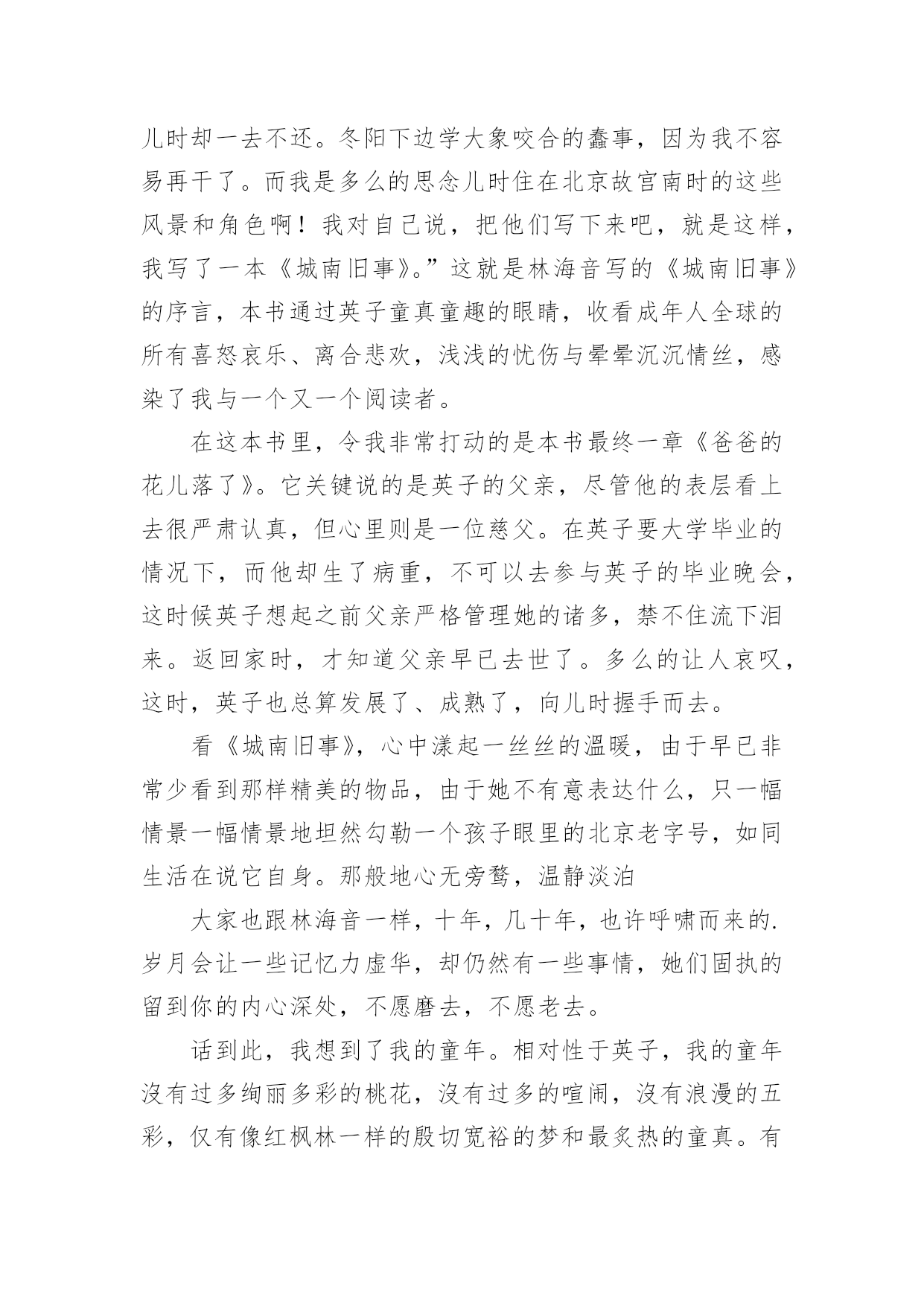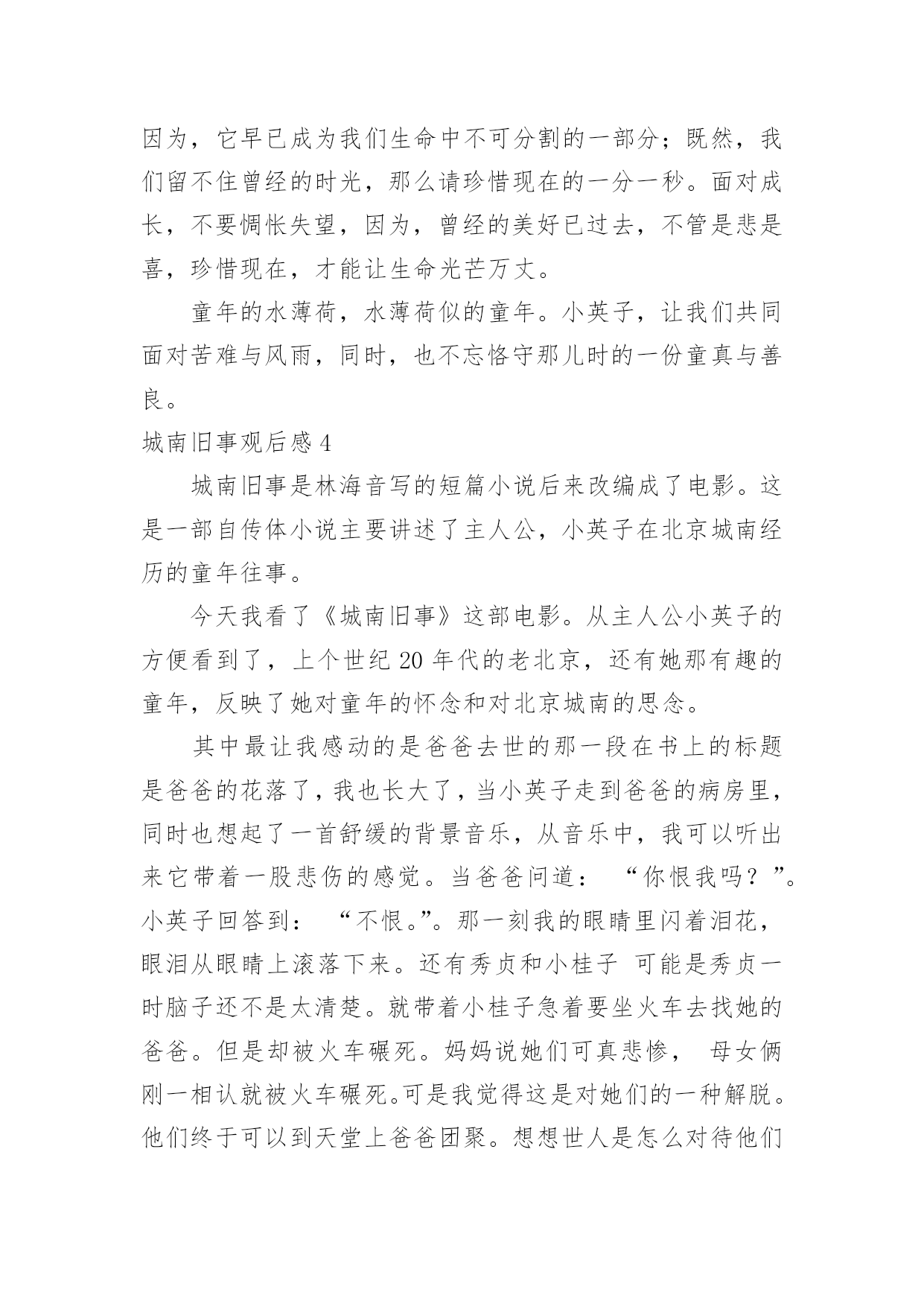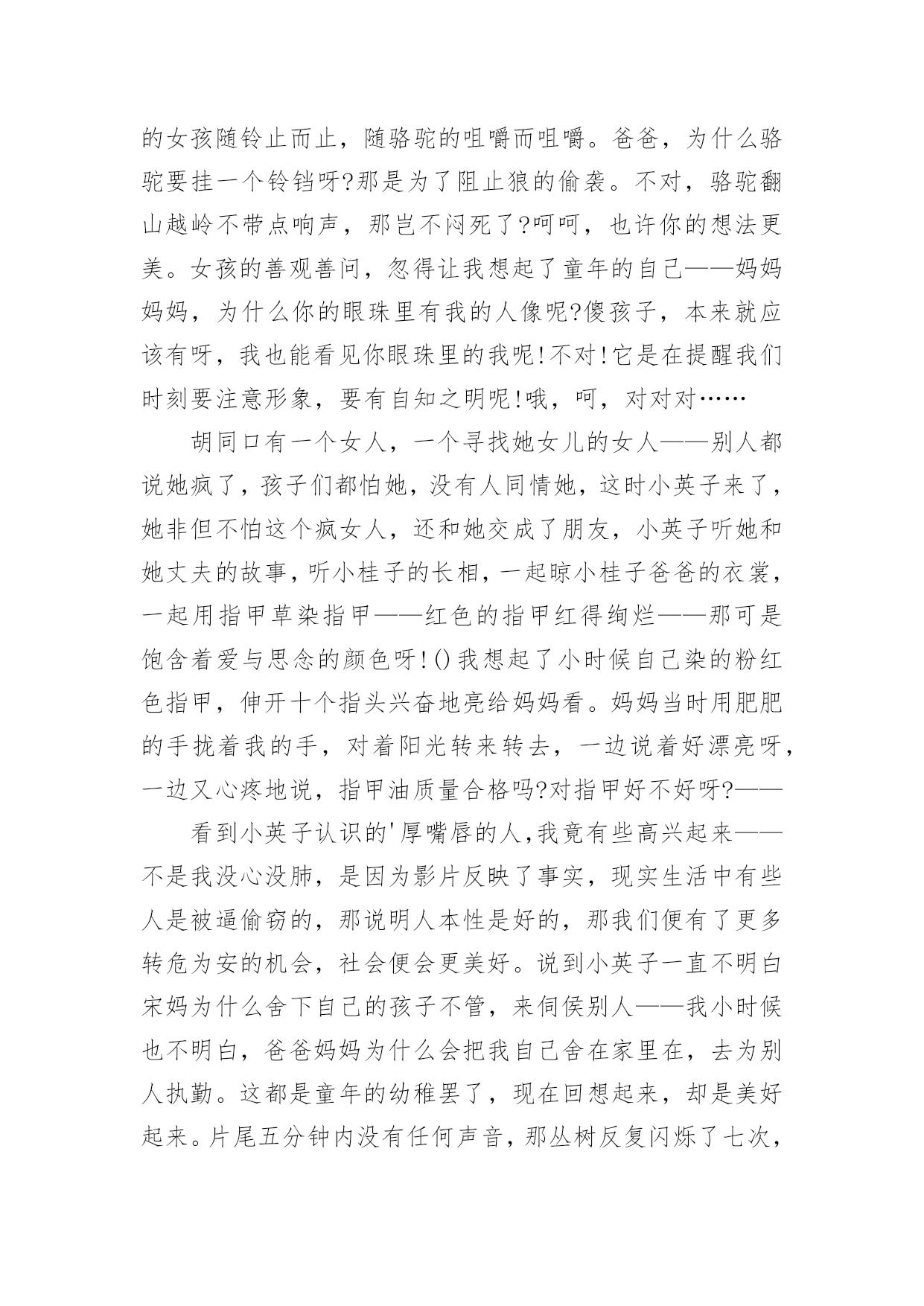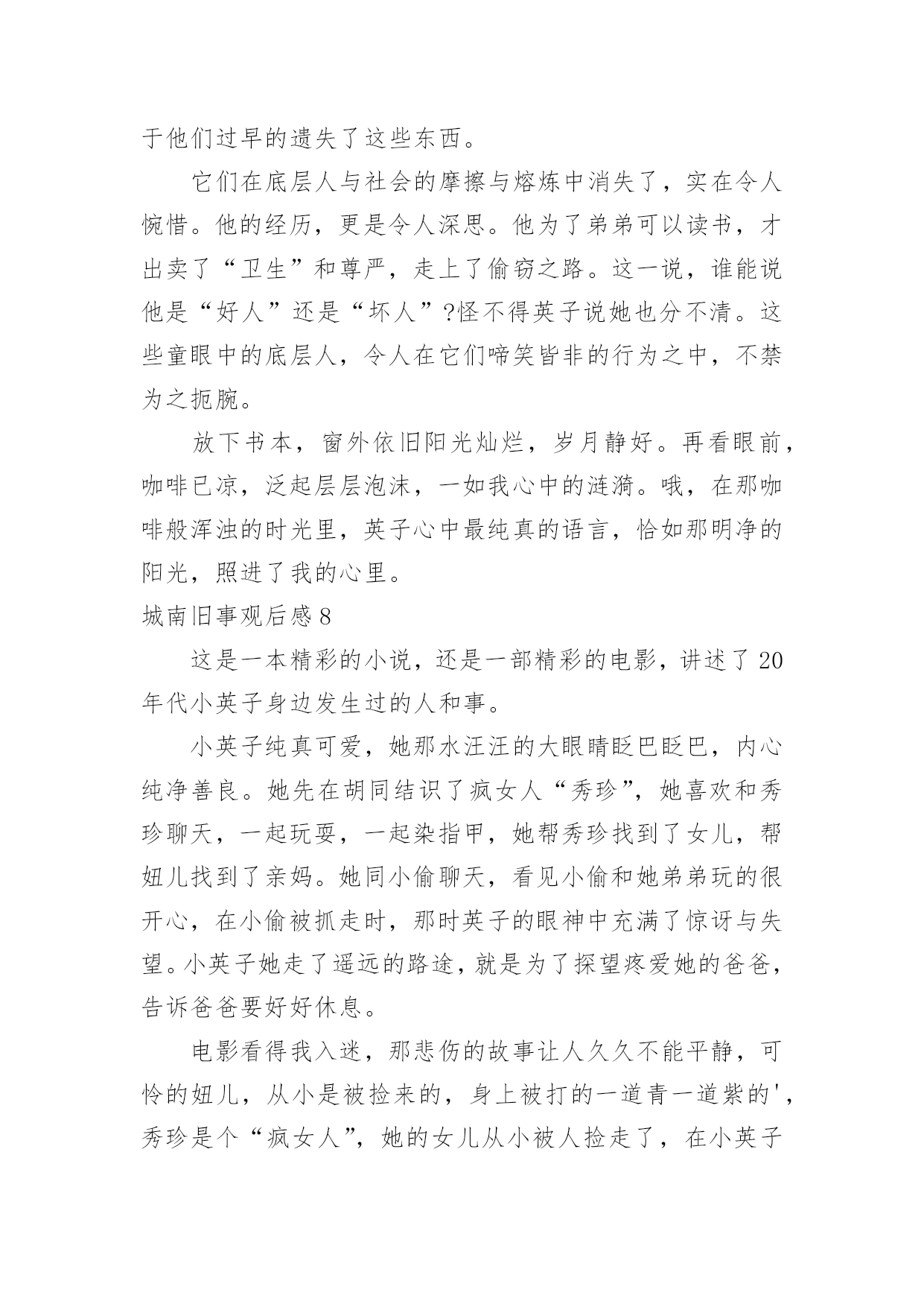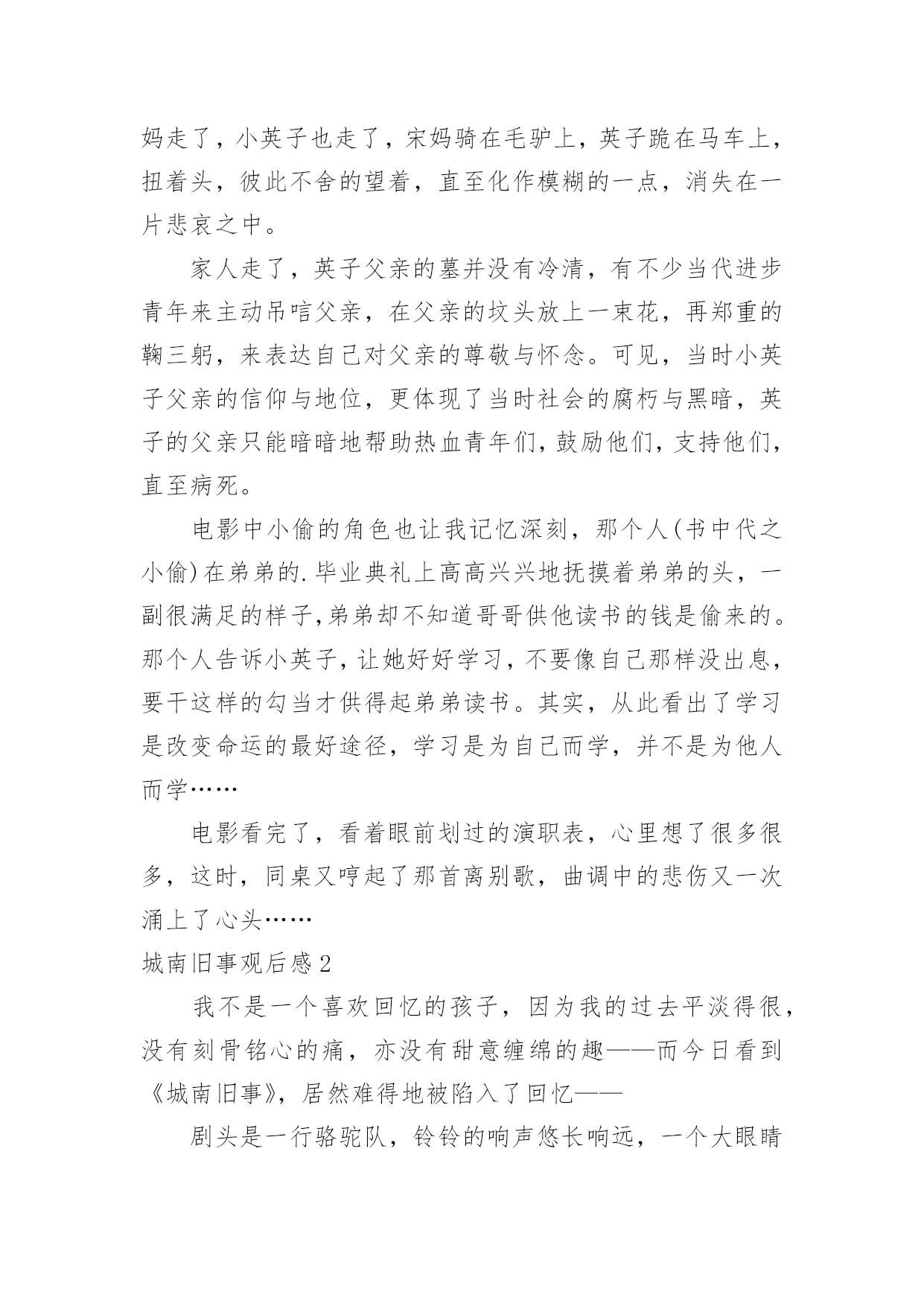 城南旧事观后感城南旧事观后感看完一部经典作品以后,相信大家有很多值得分享的东西吧,观后感需要表达真实的情感,不能虚假刻意。可能你现在毫无头绪吧,以下是小编为大家整理的城南旧事观后感,供大家参考借鉴,希望可以帮助到有需要的朋友。城南旧事观后感1为了让我们更好地理解爸爸的花儿落了一文,老师为我们播放了城南旧事。电影中的主人公小英子记叙了自己在北京度过的童年时光:她结识了惠安馆的疯子秀贞做朋友,其实她并不疯,只是因为丈夫回老家没有回来,孩子又被他妈送人了,所以伤心过度。而小英子呢,帮秀贞找到了孩子,但母女俩在回老家的途中双双丧命在火车轮下;小英子而后又结识了一位小偷,他并不坏,只是为了供成绩优异的弟弟上学才不得已走上犯罪道路的,但小英子不小心说漏了嘴,让便衣把他抓了个正着,使他锒铛入狱。最后,爸爸因为革命运动操劳过度,撒手人寰,宋妈也被她的丈夫接回了家——英子从此长大了。使我印象最深的,还是在电影的结尾,父亲去世可,家里唯一的经济来源没有了。就在这时,屏幕上出现了七次枫叶的变换,配着悲伤的音乐,代表着时间一次次的变迁。宋妈走了,小英子也走了,宋妈骑在毛驴上,英子跪在马车上,扭着头,彼此不舍的望着,直至化作模糊的一点,消失在一片悲哀之中。家人走了,英子父亲的墓并没有冷清,有不少当代进步青年来主动吊唁父亲,在父亲的坟头放上一束花,再郑重的鞠三躬,来表达自己对父亲的尊敬与怀念。可见,当时小英子父亲的信仰与地位,更体现了当时社会的腐朽与黑暗,英子的父亲只能暗暗地帮助热血青年们,鼓励他们,支持他们,直至病死。电影中小偷的角色也让我记忆深刻,那个人(书中代之小偷)在弟弟的.毕业典礼上高高兴兴地抚摸着弟弟的头,一副很满足的样子,弟弟却不知道哥哥供他读书的钱是偷来的。那个人告诉小英子,让她好好学习,不要像自己那样没出息,要干这样的勾当才供得起弟弟读书。其实,从此看出了学习是改变命运的最好途径,学习是为自己而学,并不是为他人而学……电影看完了,看着眼前划过的演职表,心里想了很多很多,这时,同桌又哼起了那首离别歌,曲调中的悲伤又一次涌上了心头……城南旧事观后感2我不是一个喜欢回忆的孩子,因为我的过去平淡得很,没有刻骨铭心的痛,亦没有甜意缠绵的趣——而今日看到《城南旧事》,居然难得地被陷入了回忆——剧头是一行骆驼队,铃铃的响声悠长响远,一个大眼睛的女孩随铃止而止,随骆驼的咀嚼而咀嚼。爸爸,为什么骆驼要挂一个铃铛呀?那是为了阻止狼的偷袭。不对,骆驼翻山越岭不带点响声,那岂不闷死了?呵呵,也许你的想法更美。女孩的善观善问,忽得让我想起了童年的自己——妈妈妈妈,为什么你的眼珠里有我的人像呢?傻孩子,本来就应该有呀,我也能看见你眼珠里的我呢!不对!它是在提醒我们时刻要注意形象,要有自知之明呢!哦,呵,对对对……胡同口有一个女人,一个寻找她女儿的女人——别人都说她疯了,孩子们都怕她,没有人同情她,这时小英子来了,她非但不怕这个疯女人,还和她交成了朋友,小英子听她和她丈夫的故事,听小桂子的长相,一起晾小桂子爸爸的衣裳,一起用指甲草染指甲——红色的指甲红得绚烂——那可是饱含着爱与思念的颜色呀!()我想起了小时候自己染的粉红色指甲,伸开十个指头兴奋地亮给妈妈看。妈妈当时用肥肥的手拢着我的手,对着阳光转来转去,一边说着好漂亮呀,一边又心疼地说,指甲油质量合格吗?对指甲好不好呀?——看到小英子认识的'厚嘴唇的人,我竟有些高兴起来——不是我没心没肺,是因为影片反映了事实,现实生活中有些人是被逼偷窃的,那说明人本性是好的,那我们便有了更多转危为安的机会,社会便会更美好。说到小英子一直不明白宋妈为什么舍下自己的孩子不管,来伺侯别人——我小时候也不明白,爸爸妈妈为什么会把我自己舍在家里在,去为别人执勤。这都是童年的幼稚罢了,现在回想起来,却是美好起来。片尾五分钟内没有任何声音,那丛树反复闪烁了七次,供我们回忆。城南旧事观后感3水薄荷般的眼神,水薄荷般的人儿。思绪如蝉翼般颤动,邪恶、世俗,一切的一切,都被英子水薄荷般单纯清新的眼神悄然融化,这个水薄荷般的女孩儿,无棱无角,轻柔流入每个凡夫俗子的心坎。更令我着迷的,是她那水薄荷般的童年,清爽干净,淡淡的甜和着涩涩的苦,留给我一瓣心香。忘不了温暖的冬阳下,小英子入迷地学着骆驼嚼草,在蛋黄般灿烂的冬阳下,她傻傻地笑着,单纯稚嫩得如同一个误入凡尘的天使,嘴巴用力地动着,牙齿细细地磨着,若隐若现的几滴口水显得可爱至极。多么可爱的小天使!多么灿烂的记忆!水薄荷般朦胧甜蜜地罩在我的心头,不加任何世俗的修饰,荡起温暖与隽永的波纹,直击我的心房。那我的童年呢?它又去哪儿了?我记忆中那个用袖子擦着鼻涕的孩子王?那个名副其实的假小子?我相信,那些模糊而又温暖的记忆一定会隽永在我心灵的彼岸,一年四季,闪闪发光。忘不了英子与人们所认为的疯子秀贞结下深厚的友