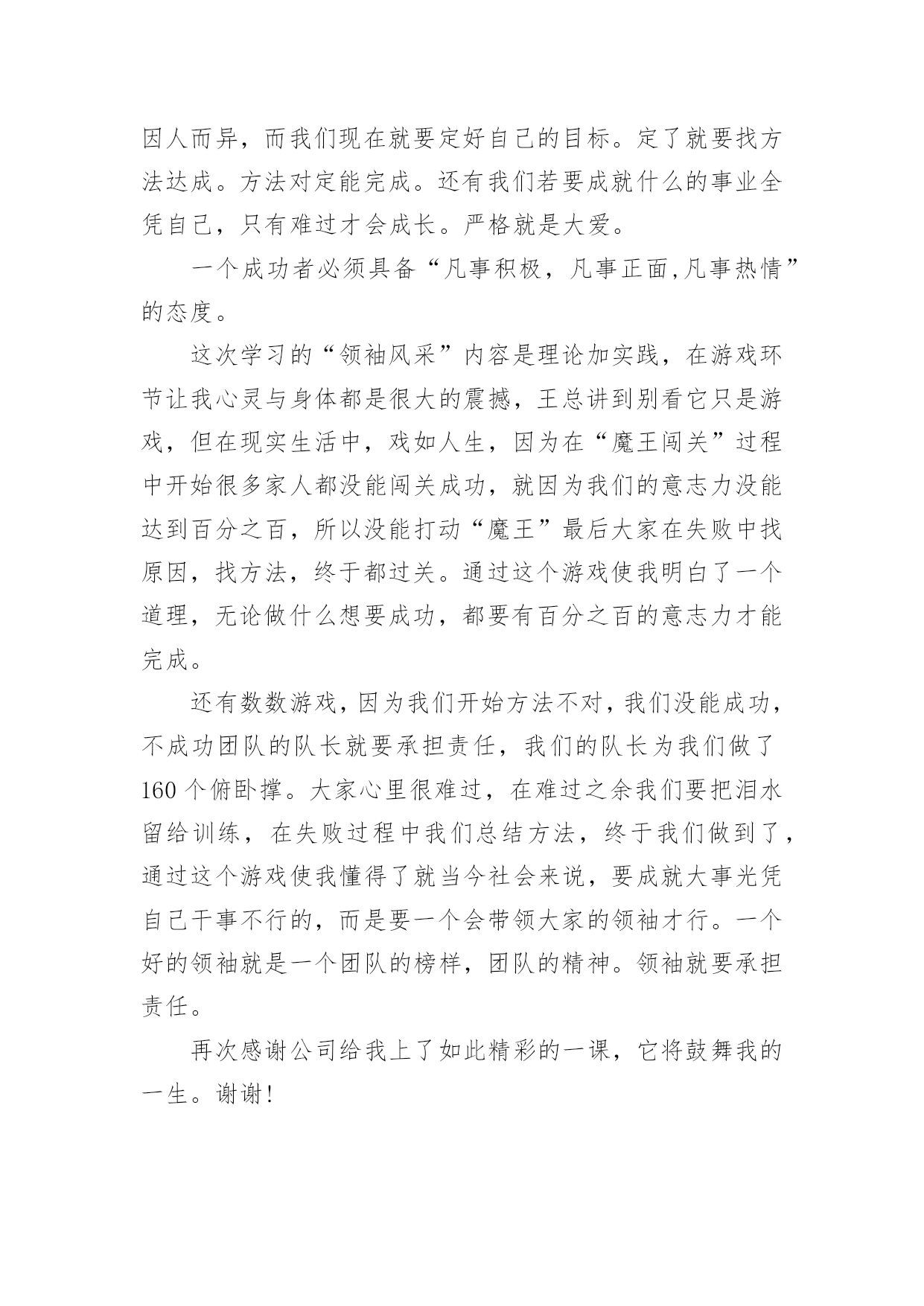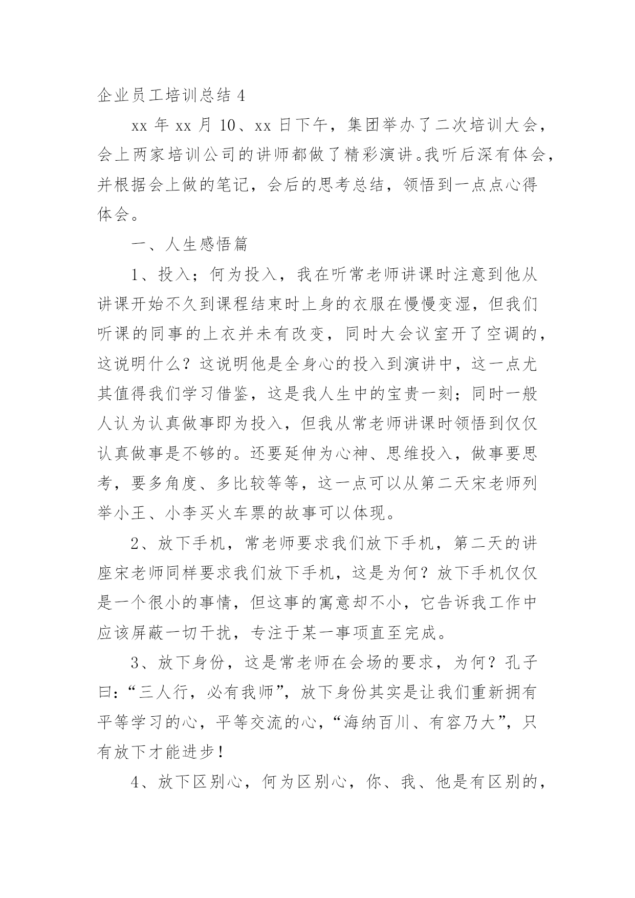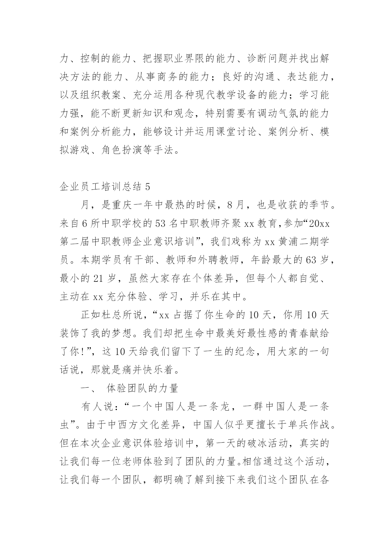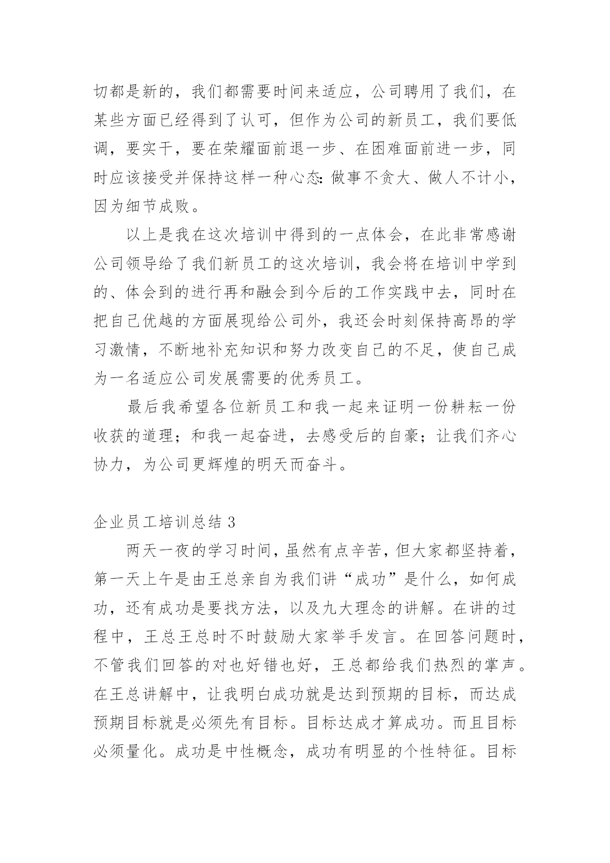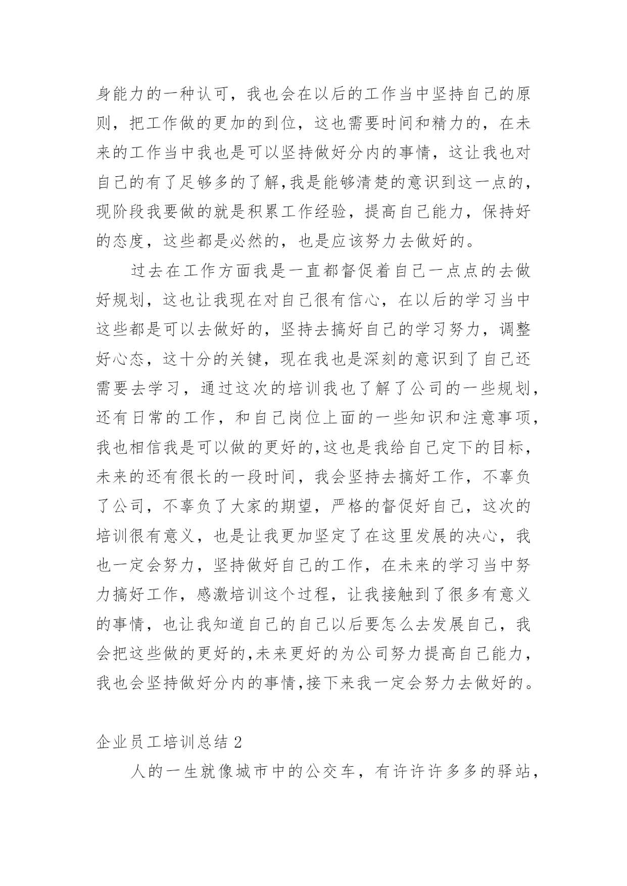 企业员工培训总结总结是对某一阶段的工作、学习或思想中的经验或情况进行分析研究的书面材料,它可以帮助我们有寻找学习和工作中的规律,为此要我们写一份总结。你所见过的总结应该是什么样的?以下是小编为大家整理的企业员工培训总结,仅供参考,希望能够帮助到大家。企业员工培训总结1尊敬的各位领导、各位同事:大家好!这段时间以来的培训让我感觉印象深刻,在这方面我认为自己还是应该主动一点去做好的,保持好的心态是很有必要的,培训过程当中做好了很多事情,我现在坚持做好了很多,这让我感觉自己是有很多进步的,培训过后我确实是做好了很多,持续发挥好的状态这是的很有意义的,我也一定会坚持下去,认真的在培训当中提高自己,这次的培训感觉是一个非常有意义的事情,我在培训方面端正了自己的心态在,只有保持一个好的工作态度,才能够在接下来做好。在培训当中还是有非常多值得学习的东西,虽然自己过去有过工作经验,但是这几天来的培训让我看到了不一样的一面,和自己过去了解的有点不同,这是非常有意义的,也是让我感觉很有成就感的事情,接触了一个新的东西,我认为在以后的工作当中这些都是可以做的更加到位,这是对自身能力的一种认可,我也会在以后的工作当中坚持自己的原则,把工作做的更加的到位,这也需要时间和精力的,在未来的工作当中我也是可以坚持做好分内的事情,这让我也对自己的有了足够多的了解,我是能够清楚的意识到这一点的,现阶段我要做的就是积累工作经验,提高自己能力,保持好的态度,这些都是必然的,也是应该努力去做好的。过去在工作方面我是一直都督促着自己一点点的去做好规划,这也让我现在对自己很有信心,在以后的学习当中这些都是可以去做好的,坚持去搞好自己的学习努力,调整好心态,这十分的关键,现在我也是深刻的意识到了自己还需要去学习,通过这次的培训我也了解了公司的一些规划,还有日常的工作,和自己岗位上面的一些知识和注意事项,我也相信我是可以做的更好的,这也是我给自己定下的目标,未来的还有很长的一段时间,我会坚持去搞好工作,不辜负了公司,不辜负了大家的期望,严格的督促好自己,这次的培训很有意义,也是让我更加坚定了在这里发展的决心,我也一定会努力,坚持做好自己的工作,在未来的学习当中努力搞好工作,感激培训这个过程,让我接触到了很多有意义的事情,也让我知道自己的自己以后要怎么去发展自己,我会把这些做的更好的,未来更好的为公司努力提高自己能力,我也会坚持做好分内的事情,接下来我一定会努力去做好的。企业员工培训总结2人的一生就像城市中的公交车,有许许许多多的驿站,每到一个驿站就意味着一个新的征程。怀着自己美好的希望和从零开始的心态,我加入了公司这样一个充满生机活力的团队中,开始了我的一个新的征程,也是在这样的一个全新的开始中,迎来了维持四天的新员工培训。这次培训的内容主要有团队训练、介绍、公司领导讲座、各部门负责人讲授有关和自身的传授等等,虽然整个培训的时间并不长,但在这短短的几天经历中,我的知识得到了更新、团队精神得到了提高、情操得到了陶冶,使我受益非浅、深有体会。一、要加强同事之间的沟通,努力提高团队精神在培训学习中,我深深地体会到人与人之间的沟通、同事之间的相互学习和团队精神是我们工作取胜的关键。在我们今后的实际工作中,无论自己从事哪个行业,哪个岗位,都离不开同事之间的配合,因为一滴水只有在大海中才能生存。既然需要配合,那么就必须沟通,只有不同部门之间、同时之间相互沟通、相互配合、团结一致,才能提高工作效率,进步更快。二、从改造自己入手,适应企业生存环境当我们进入公司的第一天,我们就应该清楚的认识到自己已经是公司的一名员工,我们最起码的一点就是要通过努力工作来改造自己,当然改造的不仅仅是知识结构,还有素质和道德等方面的改造,因为德才兼备才是人才。三、从细微工作入手,积极调整个人心态从学校到企业,环境变化非常大,所接触的人和事物一切都是新的,我们都需要时间来适应,公司聘用了我们,在某些方面已经得到了认可,但作为公司的新员工,我们要低调,要实干,要在荣耀面前退一步、在困难面前进一步,同时应该接受并保持这样一种心态:做事不贪大、做人不计小,因为细节成败。以上是我在这次培训中得到的一点体会,在此非常感谢公司领导给了我们新员工的这次培训,我会将在培训中学到的、体会到的进行再和融会到今后的工作实践中去,同时在把自己优越的方面展现给公司外,我还会时刻保持高昂的学习激情,不断地补充知识和努力改变自己的不足,使自己成为一名适应公司发展需要的优秀员工。最后我希望各位新员工和我一起来证明一份耕耘一份收获的道理;和我一起奋进,去感受后的自豪;让我们齐心协力,为公司更辉煌的明天而奋斗。企业员工培训总结3两天一夜的学习时间,虽然有点辛苦,但大家都坚持着,第一天上午是由王总亲自为我们讲“成功”是什么,如何成功,还有成功是要找