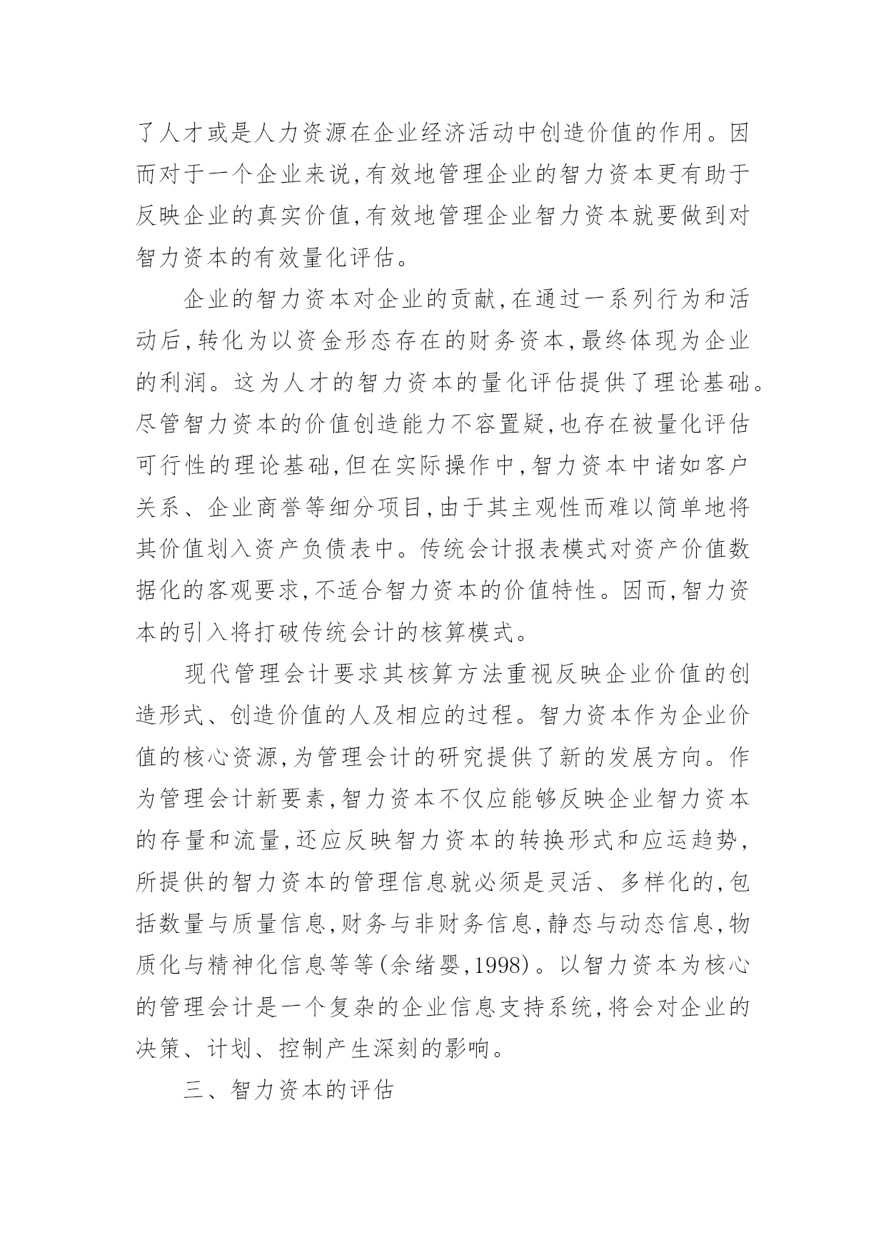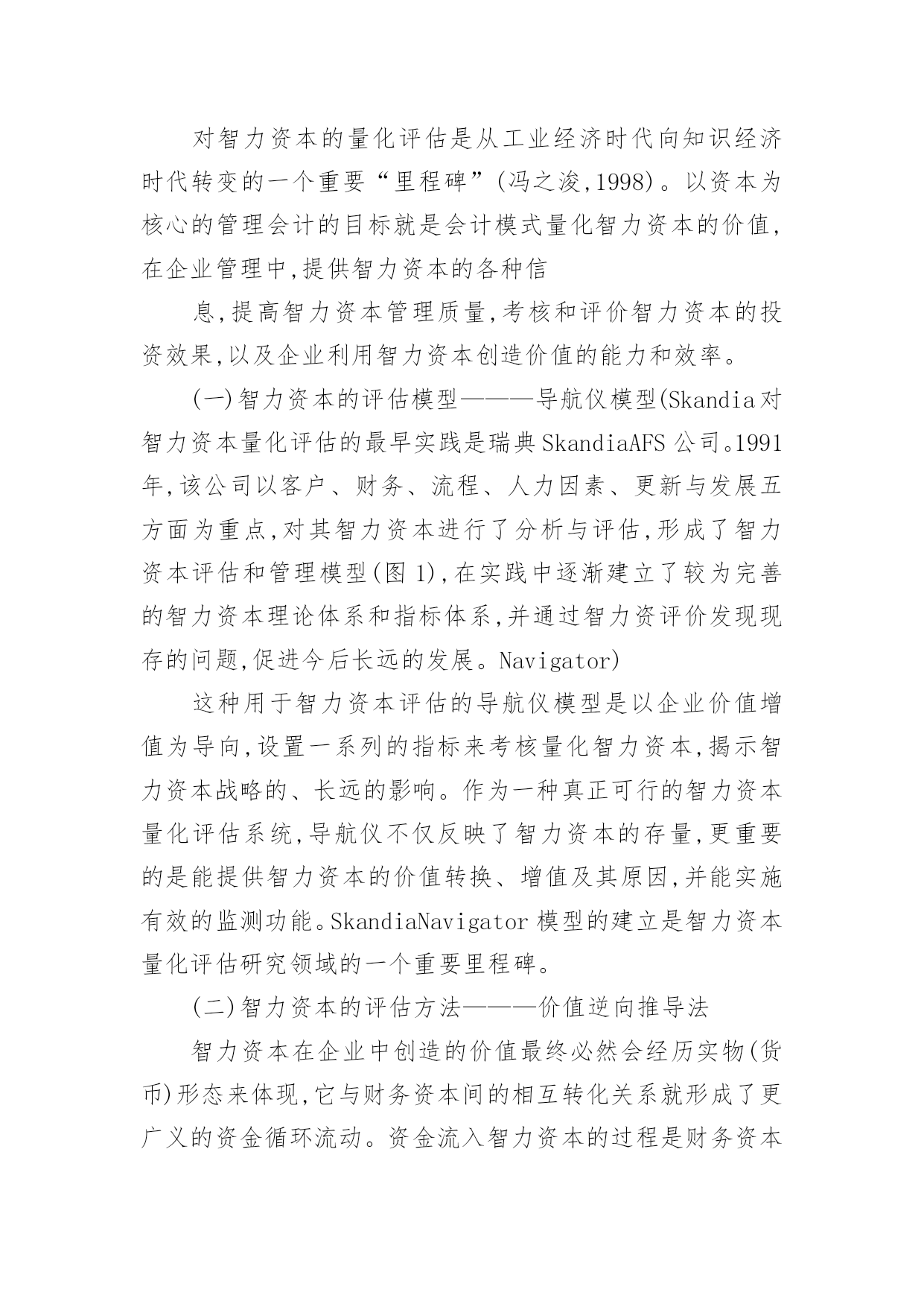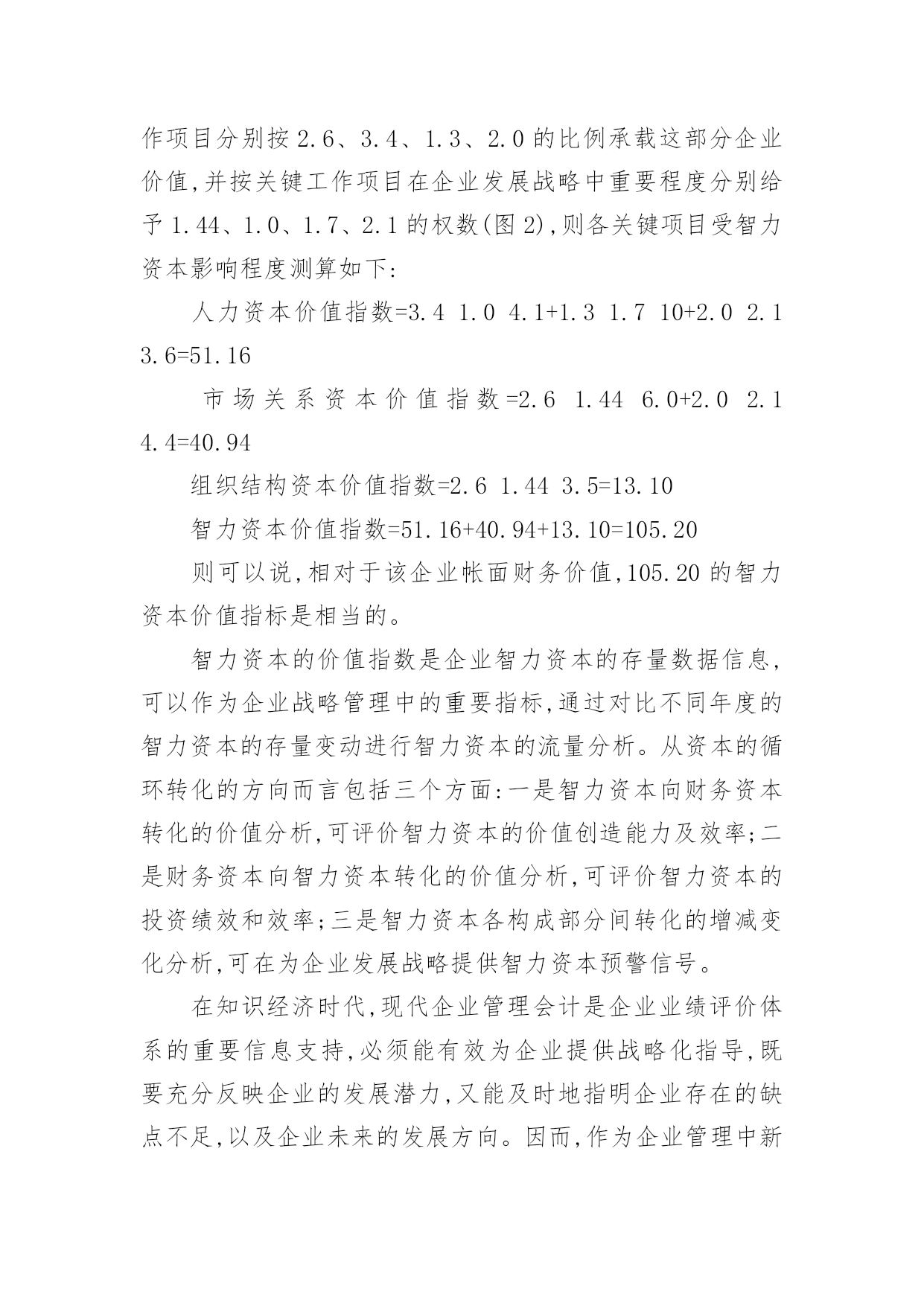 管理会计中智力资本的价值量化评估的讨论经济论文管理会计中智力资本的价值量化评估的讨论经济论文摘要:进入知识经济时代,智力资本作为独立资本形式逐渐被引入企业的战略经营管理,成为企业价值的核心资源。在现代管理会计中,智力资本的量化评估将进一步增强其为企业利益主体提供有效全面的信息支持职能。因此,本文利用智力资本与财务资本的价值循环关系,提出价值逆向推导法来评估智力资本。关键词:知识经济;管理会计;智力资本;价值评估知识经济时代,企业间的竞争核心发生了根本性的转移,作为企业竞争优势的核心资源的智力资本已逐渐地引入企业的管理战略之中,并已被广泛地应用。在现代经济社会中,有关智力资本领域的研究和发展同样给现代会计研究带来了新的挑战和机遇,它天生的活力和创新价值不仅冲击了传统的会计模式,并且作为管理会计中一个新要素拓展了会计学研究领域和方向。一、知识经济下,智力资本是企业价值的核心资源“知识经济是建立在知识和经验的生产、分配和使用上的经济”,是指以高技术产业为第一产业支柱,以智力资源为首要依托的可持续发展的经济。在知识经济中,企业的价值根本不再直接取决于物质资源、货币资本和硬件设备的数量、规模等,而是依赖于人才的智慧积累和创新,从而达到知识的转化和智力资本价值的实现。在知识经济中,智力资本是相对于传统的物质资本而言的,它是一种潜在的、无形的、动态的、能够带来企业价值增值的非物质资源。有关智力资本的定义,先从二个智力资本等式来认识(智力资本=市场价值-帐面价值,企业=无形资产+智力资本),这能体现智力资本存在及能被界定和价值量化的本质。瑞典第一大保险和金融服务公司是这样定义智力资本的:它是企业所拥有的对企业市场竞争力做出贡献的专业知识、应用经验、组织技术、客户关系和职业技巧及跨文化技能等企业的集体知识。着名学者圣特。昂格提出,企业的智力资本,是企业在价值创造过程中借以获取超额收益的各种知识资源的有机综合体,是企业取得持续竞争优势的源泉。一般地除知识产权资本外还包括人力资本、市场关系(顾客)资本、组织结构资本三个延伸部分,智力资本正是通过其各组成部分的相互作用和共同整合推动企业发展,成为创造和实现企业价值的核心资源。在知识经济中,企业对智力资本的需求越来越大,相对于财务资本,智力资本在企业价值增值的贡献中所占比例更大。按照新古典经济学的.稀缺理论,智力资本应该获得与财务资本共同参与分离企业剩余控制权和索取权的平等地位。随着信息技术的革命,财务资本投资者总是以风险最小化原则进行投资转换,不断减少承担的风险;而智力资本所有者由于智力资本的专用性则日渐成为企业风险的承担者。在企业经营管理中,两种资本的所有者间还存在着委托———代理关系,作为委托方的财务资本投资者控制代理人的最佳契约就是让智力资本所有者拥有企业的部分剩余控制权。因而,企业的所有制结构也就自然地从“财务资本雇佣智力资本”的方式转变为“智力资本与财务资本相合作”的方式。由此可以说,智力资本即知识和智慧,将是企业发展和经济增长的原动力,而作为智力资本载体的人才取代了资金成为这个时代最稀缺的资源,将成为发展知识经济不可缺少的最基本因素。美国微软公司、英特尔公司、网景公司的发展奇迹,充分说明了人的智慧和创新在现代经济社会中的核心作用与价值体现。二、人力资本是管理会计中崭新的、能动的要素管理会计是为企业的内部信息使用者提供管理决策有用信息需要的会计。由于传统的成本性经营模式,相应地传统管理会计通常是以成本预算和控制为工具,强调以“利润最大化”为目标,仅运用企业内部已发生的财会数据和事件进行分析、提供决策信息,这种传统的管理会计模式很大程度上已不能有效地提高会计信息质量,满足企业管理决策的要求。20世纪80年代以来,战略管理理念应用于管理会计的理论实践,使管理会计冲破了财务会计信息支持的局限,充分结合和利用了企业内部和外部、财务与非财务的信息,提高了会计信息的管理价值。在知识经济时代,智力资本作为真正反映企业价值的核心资产,以其流动性和自我增值积累的资本特性,充分发挥了人才或是人力资源在企业经济活动中创造价值的作用。因而对于一个企业来说,有效地管理企业的智力资本更有助于反映企业的真实价值,有效地管理企业智力资本就要做到对智力资本的有效量化评估。企业的智力资本对企业的贡献,在通过一系列行为和活动后,转化为以资金形态存在的财务资本,最终体现为企业的利润。这为人才的智力资本的量化评估提供了理论基础。尽管智力资本的价值创造能力不容置疑,也存在被量化评估可行性的理论基础,但在实际操作中,智力资本中诸如客户关系、企业商誉等细分项目,由于其主观性而难以简单地将其价值划入资产负债表中。传统会计报表模式对资产价值数据化的客观要求,不适合智力资本的价值特性。因而,智力资本的引入将打破传统会计的核算模式。现代管理会