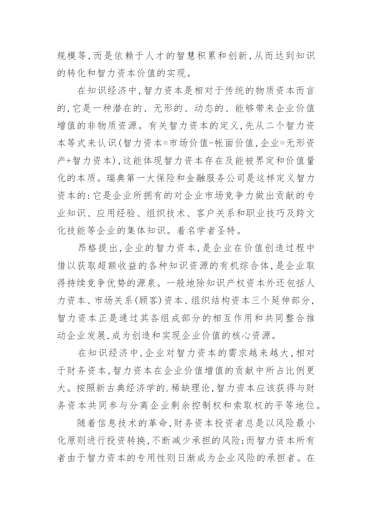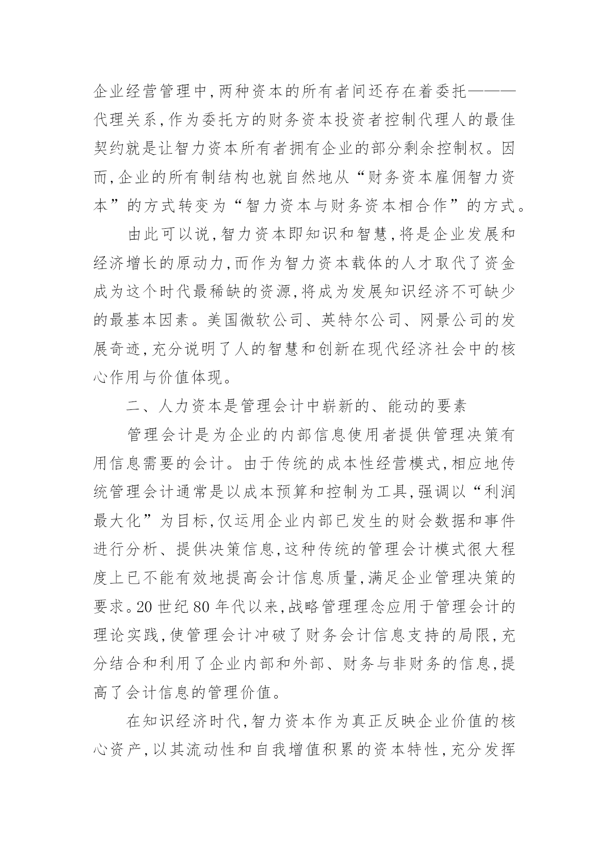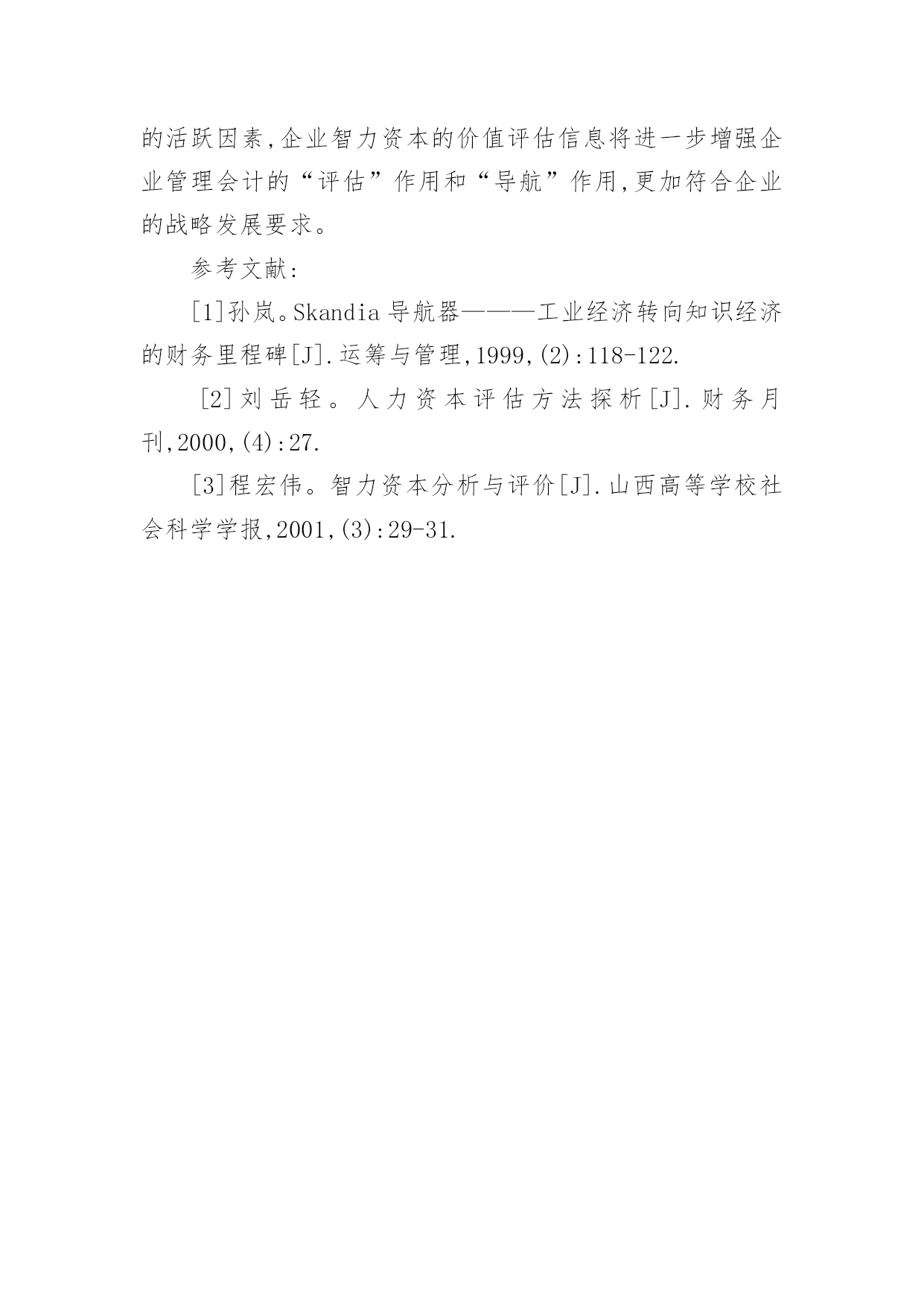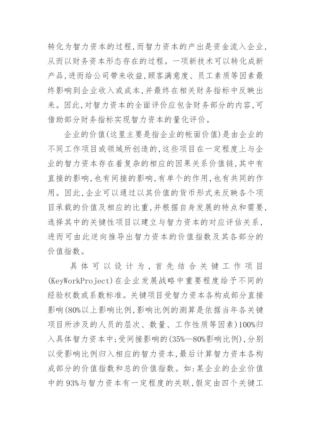 管理会计中智力资本的价值量化评估的讨论经济论文管理会计中智力资本的价值量化评估的讨论经济论文摘要:进入知识经济时代,智力资本作为独立资本形式逐渐被引入企业的战略经营管理,成为企业价值的核心资源。在现代管理会计中,智力资本的量化评估将进一步增强其为企业利益主体提供有效全面的信息支持职能。因此,本文利用智力资本与财务资本的价值循环关系,提出价值逆向推导法来评估智力资本。关键词:知识经济;管理会计;智力资本;价值评估知识经济时代,企业间的竞争核心发生了根本性的转移,作为企业竞争优势的核心资源的智力资本已逐渐地引入企业的管理战略之中,并已被广泛地应用。在现代经济社会中,有关智力资本领域的研究和发展同样给现代会计研究带来了新的挑战和机遇,它天生的活力和创新价值不仅冲击了传统的会计模式,并且作为管理会计中一个新要素拓展了会计学研究领域和方向。一、知识经济下,智力资本是企业价值的核心资源“知识经济是建立在知识和经验的生产、分配和使用上的经济”,是指以高技术产业为第一产业支柱,以智力资源为首要依托的可持续发展的经济。在知识经济中,企业的价值根本不再直接取决于物质资源、货币资本和硬件设备的数量、规模等,而是依赖于人才的智慧积累和创新,从而达到知识的转化和智力资本价值的实现。在知识经济中,智力资本是相对于传统的物质资本而言的,它是一种潜在的、无形的、动态的、能够带来企业价值增值的非物质资源。有关智力资本的定义,先从二个智力资本等式来认识(智力资本=市场价值-帐面价值,企业=无形资产+智力资本),这能体现智力资本存在及能被界定和价值量化的本质。瑞典第一大保险和金融服务公司是这样定义智力资本的:它是企业所拥有的对企业市场竞争力做出贡献的专业知识、应用经验、组织技术、客户关系和职业技巧及跨文化技能等企业的集体知识。着名学者圣特。昂格提出,企业的智力资本,是企业在价值创造过程中借以获取超额收益的各种知识资源的有机综合体,是企业取得持续竞争优势的源泉。一般地除知识产权资本外还包括人力资本、市场关系(顾客)资本、组织结构资本三个延伸部分,智力资本正是通过其各组成部分的相互作用和共同整合推动企业发展,成为创造和实现企业价值的核心资源。在知识经济中,企业对智力资本的需求越来越大,相对于财务资本,智力资本在企业价值增值的贡献中所占比例更大。按照新古典经济学的.稀缺理论,智力资本应该获得与财务资本共同参与分离企业剩余控制权和索取权的平等地位。随着信息技术的革命,财务资本投资者总是以风险最小化原则进行投资转换,不断减少承担的风险;而智力资本所有者由于智力资本的专用性则日渐成为企业风险的承担者。在企业经营管理中,两种资本的所有者间还存在着委托———代理关系,作为委托方的财务资本投资者控制代理人的最佳契约就是让智力资本所有者拥有企业的部分剩余控制权。因而,企业的所有制结构也就自然地从“财务资本雇佣智力资本”的方式转变为“智力资本与财务资本相合作”的方式。由此可以说,智力资本即知识和智慧,将是企业发展和经济增长的原动力,而作为智力资本载体的人才取代了资金成为这个时代最稀缺的资源,将成为发展知识经济不可缺少的最基本因素。美国微软公司、英特尔公司、网景公司的发展奇迹,充分说明了人的智慧和创新在现代经济社会中的核心作用与价值体现。二、人力资本是管理会计中崭新的、能动的要素管理会计是为企业的内部信息使用者提供管理决策有用信息需要的会计。由于传统的成本性经营模式,相应地传统管理会计通常是以成本预算和控制为工具,强调以“利润最大化”为目标,仅运用企业内部已发生的财会数据和事件进行分析、提供决策信息,这种传统的管理会计模式很大程度上已不能有效地提高会计信息质量,满足企业管理决策的要求。20世纪80年代以来,战略管理理念应用于管理会计的理论实践,使管理会计冲破了财务会计信息支持的局限,充分结合和利用了企业内部和外部、财务与非财务的信息,提高了会计信息的管理价值。在知识经济时代,智力资本作为真正反映企业价值的核心资产,以其流动性和自我增值积累的资本特性,充分发挥了人才或是人力资源在企业经济活动中创造价值的作用。因而对于一个企业来说,有效地管理企业的智力资本更有助于反映企业的真实价值,有效地管理企业智力资本就要做到对智力资本的有效量化评估。企业的智力资本对企业的贡献,在通过一系列行为和活动后,转化为以资金形态存在的财务资本,最终体现为企业的利润。这为人才的智力资本的量化评估提供了理论基础。尽管智力资本的价值创造能力不容置疑,也存在被量化评估可行性的理论基础,但在实际操作中,智力资本中诸如客户关系、企业商誉等细分项目,由于其主观性而难以简单地将其价值划入资产负债表中。传统会计报表模式对资产价值数据化的客观要求,不适合智力资本的价值特性。因而,智力资本的引入将打破传统会计的核算模式。现代管理会