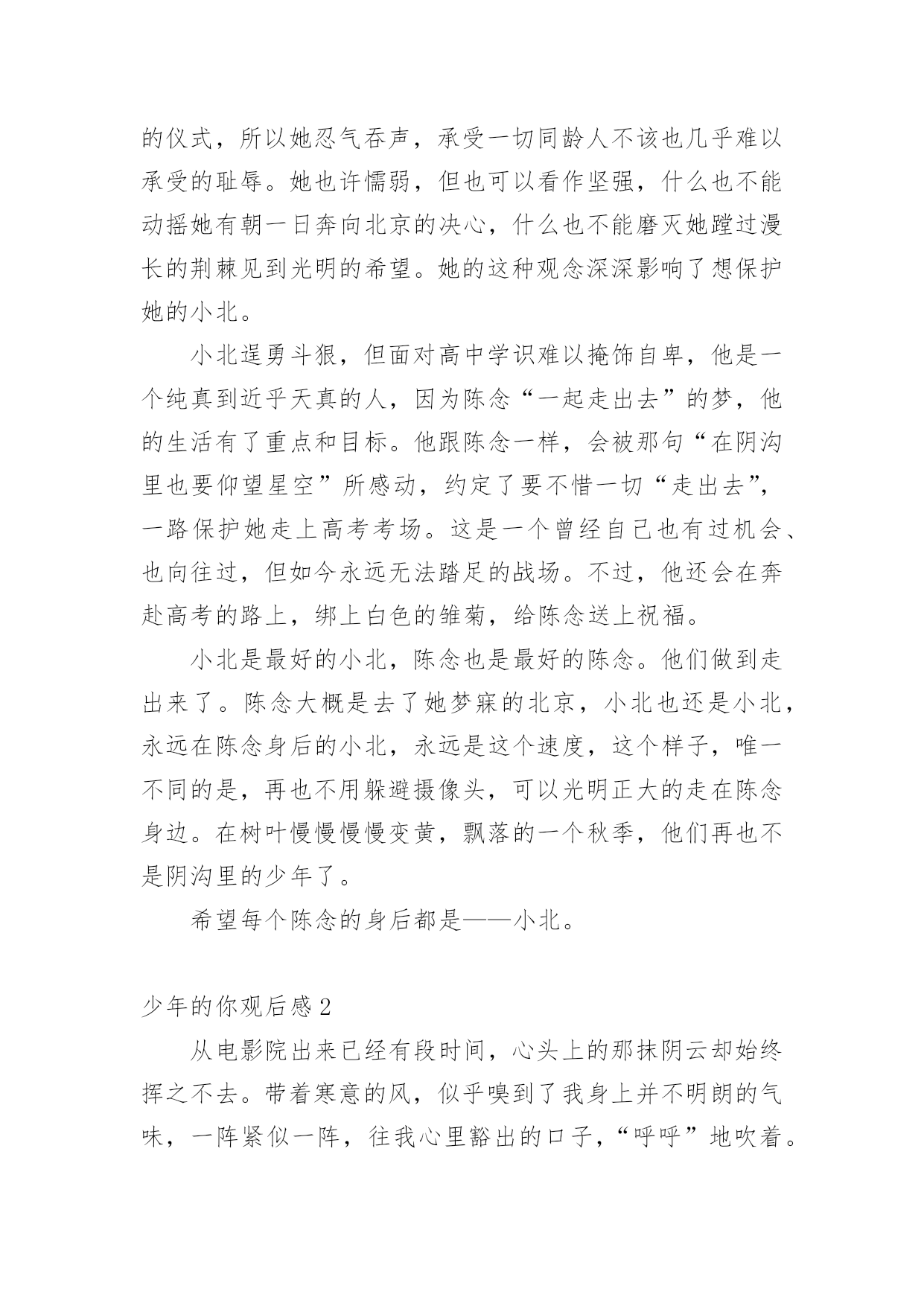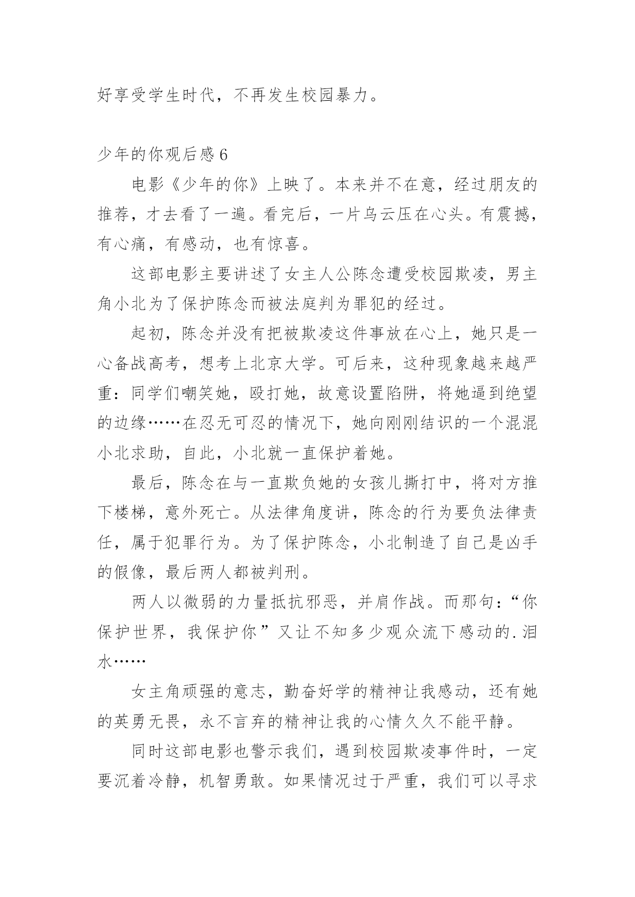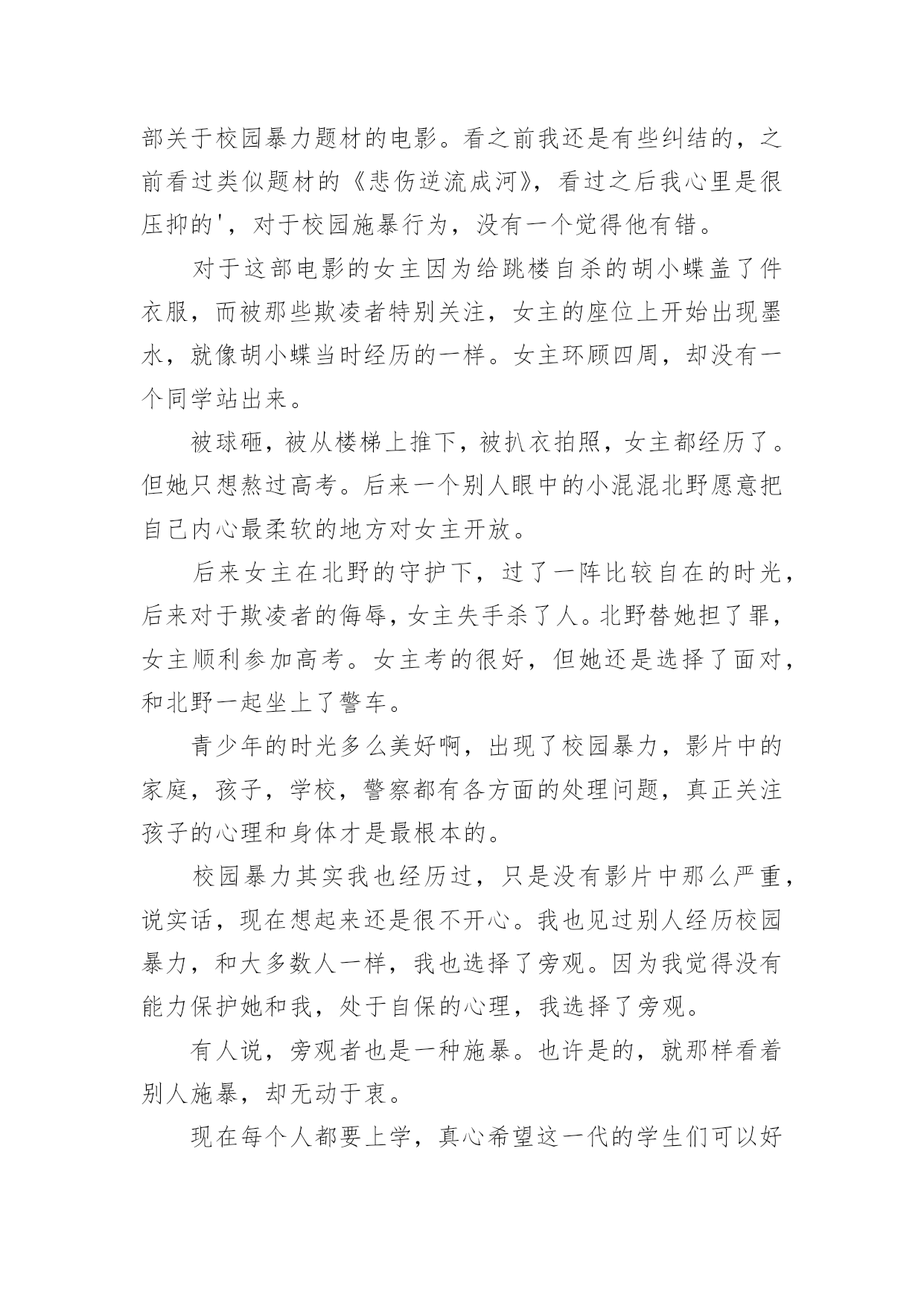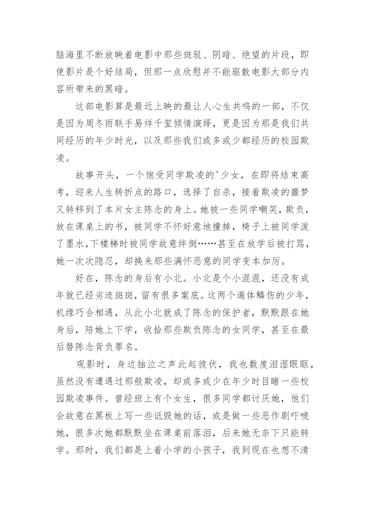 少年的你观后感当观看完一部影视作品后,这次观看让你有什么体会呢?写一份观后感,记录收获与付出。可能你现在毫无头绪吧,下面是小编收集整理的少年的你观后感,欢迎大家借鉴与参考,希望对大家有所帮助。少年的你观后感1因为一个恶俗的吻,两个本该永不相交的少年开始了不一样的人生。她叫陈念,他叫刘北山,大家喊他小北哥,陈念喊他——小北。石缝下破土而生的白色雏菊亦是少年不甘沉寂的青春,战胜阴沟里的黑暗才能做一枚守护你的月亮。少年时代里最美好的是什么,是小北对陈念“你往前走,我一定在你身后”的'保护,是“携风踏浪,陪伴同行”的陪伴,是“擎星北顾,遂光不惧”的支持。陈念原本一直是紧绷的,不安的,眼神惶惶,像不知道该往哪里逃命的小野兽。哪怕是在家做作业,都随时准备着躲避催债的人,但穿过隧道,阳光洒落下来,就是小北的家,虽然破败,却是陈念的安全屋。她松弛下来,终显露出一点少女的温柔青涩。在那儿她不用担心走到半路被推倒,不用害怕那些恶作剧,有个人对她说:“你保护世界,我保护你。”在陈念眼里,高考录取是从“少年”到“大人”最重要的仪式,所以她忍气吞声,承受一切同龄人不该也几乎难以承受的耻辱。她也许懦弱,但也可以看作坚强,什么也不能动摇她有朝一日奔向北京的决心,什么也不能磨灭她蹚过漫长的荆棘见到光明的希望。她的这种观念深深影响了想保护她的小北。小北逞勇斗狠,但面对高中学识难以掩饰自卑,他是一个纯真到近乎天真的人,因为陈念“一起走出去”的梦,他的生活有了重点和目标。他跟陈念一样,会被那句“在阴沟里也要仰望星空”所感动,约定了要不惜一切“走出去”,一路保护她走上高考考场。这是一个曾经自己也有过机会、也向往过,但如今永远无法踏足的战场。不过,他还会在奔赴高考的路上,绑上白色的雏菊,给陈念送上祝福。小北是最好的小北,陈念也是最好的陈念。他们做到走出来了。陈念大概是去了她梦寐的北京,小北也还是小北,永远在陈念身后的小北,永远是这个速度,这个样子,唯一不同的是,再也不用躲避摄像头,可以光明正大的走在陈念身边。在树叶慢慢慢慢变黄,飘落的一个秋季,他们再也不是阴沟里的少年了。希望每个陈念的身后都是——小北。少年的你观后感2从电影院出来已经有段时间,心头上的那抹阴云却始终挥之不去。带着寒意的风,似乎嗅到了我身上并不明朗的气味,一阵紧似一阵,往我心里豁出的口子,“呼呼”地吹着。脑海里不断放映着电影中那些斑驳、阴暗、绝望的片段,即使影片是个好结局,但那一点欣慰并不能驱散电影大部分内容所带来的黑暗。这部电影算是最近上映的最让人心生共鸣的一部,不仅是因为周冬雨联手易烊千玺倾情演绎,更是因为那是我们共同经历的年少时光,以及那些我们或多或少都经历的校园欺凌。故事开头,一个饱受同学欺凌的'少女,在即将结束高考,迎来人生转折点的路口,选择了自杀,接着欺凌的噩梦又转移到了本片女主陈念的身上。她被一些同学嘲笑,欺负,放在课桌上的书,被同学不怀好意地撞掉,椅子上被同学泼了墨水,下楼梯时被同学故意绊倒……甚至在放学后被打骂,她一次次隐忍,却换来那些满怀恶意的同学变本加厉。好在,陈念的身后有小北。小北是个小混混,还没有成年就已经劣迹斑斑,留有很多案底。这两个遍体鳞伤的少年,机缘巧合相遇,从此小北就成了陈念的保护者,默默跟在她身后,陪她上下学,收拾那些欺负陈念的女同学,甚至在最后替陈念背负罪名。观影时,身边抽泣之声此起彼伏,我也数度泪湿眼眶,虽然没有遭遇过那般欺凌,却或多或少在年少时目睹一些校园欺凌事件。曾经班上有个女生,很多同学都讨厌她,他们会故意在黑板上写一些诋毁她的话,或是做一些恶作剧吓唬她,很多次她都默默坐在课桌前落泪,后来她无奈下只能转学。那时,我们都是上着小学的小孩子,我到现在也想不清楚,为什么那么小的孩子,人性之中会有欺凌的“恶”呢?人之初,真的性本善吗?近年来,校园欺凌案件屡见不鲜,严重的被曝光,而那些不严重却依然会给饱受欺凌的孩子留下一生阴影的事件,还有多少呢?校园本该充满阳光和欢笑,少男少女们,也本该心思纯洁,性情纯真,善良友好,何以变成欺凌的“恶魔”,这值得每一个人深思。最后,在那些阳光照射不到的角落里,希望有个小北在身后护着你,也是这一次,愿你归来不再年少。少年的你观后感3《少年的你》这部电影被火了,无论是演技还是剧情都非常受观众欢迎,是一部男女老少都值得观看的一部戏,虽然整个剧情中非常的压抑以及沉重,但这些问题就是在展现着我们如今社会状态,而男主易烊千玺在本剧中饰演小北更是演活了小说,他把那份对陈念的爱像是隐藏着,又像是不敢动!如今这部电影票房已经是破2亿了,而且今天还是第二天,往后数量更是不可预测,易烊千玺这次总算是突破了自己,因为小北这个人设真的很不好演,更何况易烊千玺还是一个新演员,不管在表情上还是细节上他却处理都非常好,尤其是荧幕初吻献给影后周冬雨时,他自称没什么