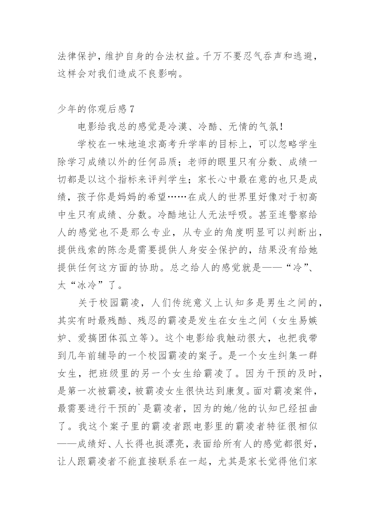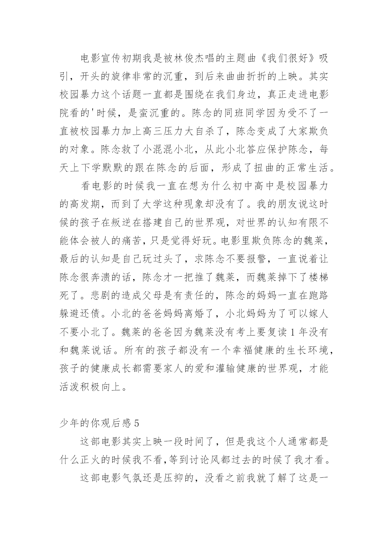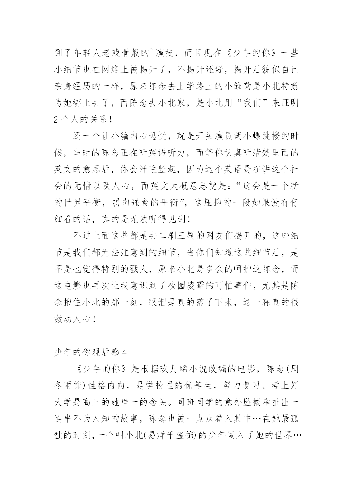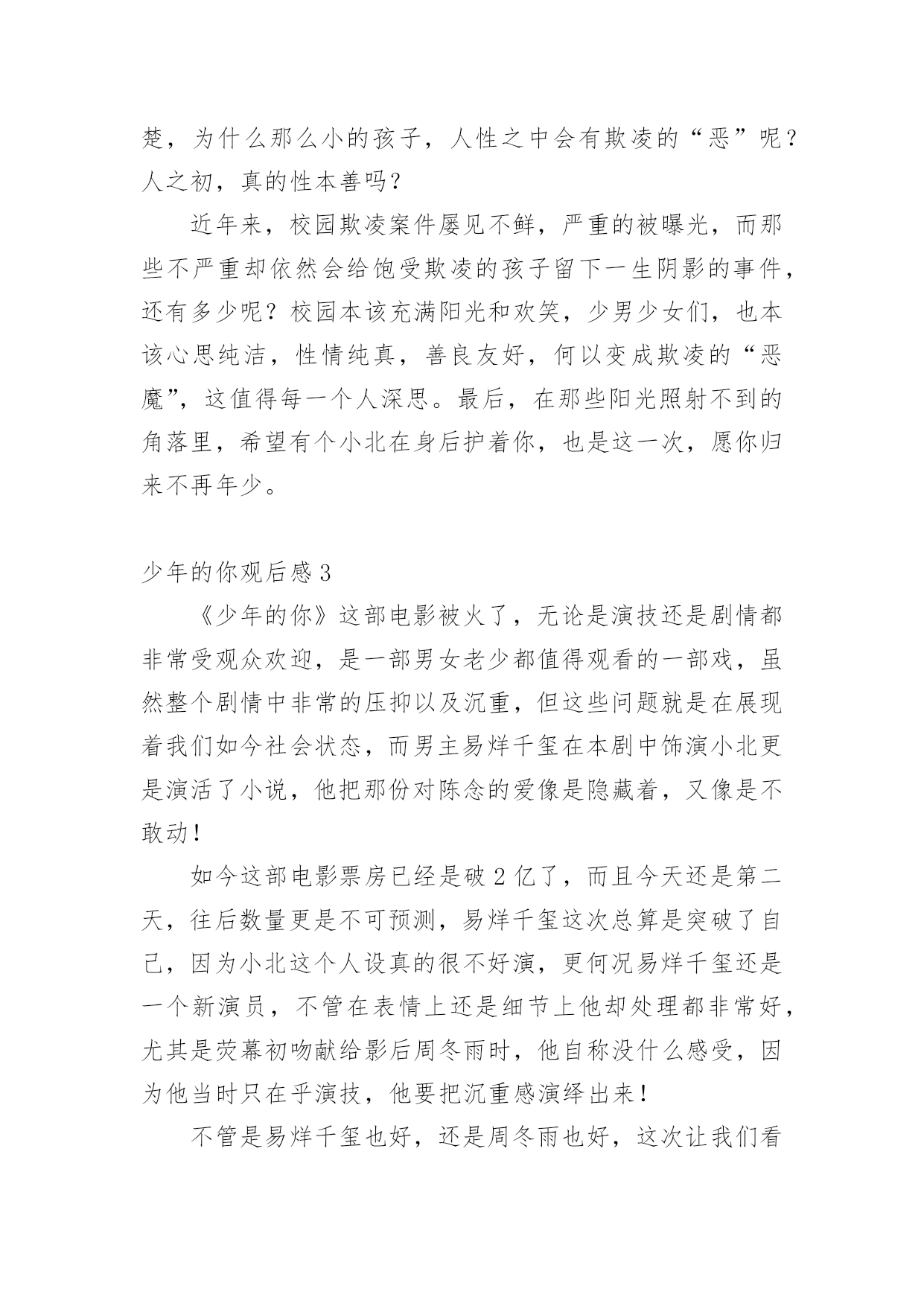 少年的你观后感当观看完一部影视作品后,这次观看让你有什么体会呢?写一份观后感,记录收获与付出。可能你现在毫无头绪吧,下面是小编收集整理的少年的你观后感,欢迎大家借鉴与参考,希望对大家有所帮助。少年的你观后感1因为一个恶俗的吻,两个本该永不相交的少年开始了不一样的人生。她叫陈念,他叫刘北山,大家喊他小北哥,陈念喊他——小北。石缝下破土而生的白色雏菊亦是少年不甘沉寂的青春,战胜阴沟里的黑暗才能做一枚守护你的月亮。少年时代里最美好的是什么,是小北对陈念“你往前走,我一定在你身后”的'保护,是“携风踏浪,陪伴同行”的陪伴,是“擎星北顾,遂光不惧”的支持。陈念原本一直是紧绷的,不安的,眼神惶惶,像不知道该往哪里逃命的小野兽。哪怕是在家做作业,都随时准备着躲避催债的人,但穿过隧道,阳光洒落下来,就是小北的家,虽然破败,却是陈念的安全屋。她松弛下来,终显露出一点少女的温柔青涩。在那儿她不用担心走到半路被推倒,不用害怕那些恶作剧,有个人对她说:“你保护世界,我保护你。”在陈念眼里,高考录取是从“少年”到“大人”最重要的仪式,所以她忍气吞声,承受一切同龄人不该也几乎难以承受的耻辱。她也许懦弱,但也可以看作坚强,什么也不能动摇她有朝一日奔向北京的决心,什么也不能磨灭她蹚过漫长的荆棘见到光明的希望。她的这种观念深深影响了想保护她的小北。小北逞勇斗狠,但面对高中学识难以掩饰自卑,他是一个纯真到近乎天真的人,因为陈念“一起走出去”的梦,他的生活有了重点和目标。他跟陈念一样,会被那句“在阴沟里也要仰望星空”所感动,约定了要不惜一切“走出去”,一路保护她走上高考考场。这是一个曾经自己也有过机会、也向往过,但如今永远无法踏足的战场。不过,他还会在奔赴高考的路上,绑上白色的雏菊,给陈念送上祝福。小北是最好的小北,陈念也是最好的陈念。他们做到走出来了。陈念大概是去了她梦寐的北京,小北也还是小北,永远在陈念身后的小北,永远是这个速度,这个样子,唯一不同的是,再也不用躲避摄像头,可以光明正大的走在陈念身边。在树叶慢慢慢慢变黄,飘落的一个秋季,他们再也不是阴沟里的少年了。希望每个陈念的身后都是——小北。少年的你观后感2从电影院出来已经有段时间,心头上的那抹阴云却始终挥之不去。带着寒意的风,似乎嗅到了我身上并不明朗的气味,一阵紧似一阵,往我心里豁出的口子,“呼呼”地吹着。脑海里不断放映着电影中那些斑驳、阴暗、绝望的片段,即使影片是个好结局,但那一点欣慰并不能驱散电影大部分内容所带来的黑暗。这部电影算是最近上映的最让人心生共鸣的一部,不仅是因为周冬雨联手易烊千玺倾情演绎,更是因为那是我们共同经历的年少时光,以及那些我们或多或少都经历的校园欺凌。故事开头,一个饱受同学欺凌的'少女,在即将结束高考,迎来人生转折点的路口,选择了自杀,接着欺凌的噩梦又转移到了本片女主陈念的身上。她被一些同学嘲笑,欺负,放在课桌上的书,被同学不怀好意地撞掉,椅子上被同学泼了墨水,下楼梯时被同学故意绊倒……甚至在放学后被打骂,她一次次隐忍,却换来那些满怀恶意的同学变本加厉。好在,陈念的身后有小北。小北是个小混混,还没有成年就已经劣迹斑斑,留有很多案底。这两个遍体鳞伤的少年,机缘巧合相遇,从此小北就成了陈念的保护者,默默跟在她身后,陪她上下学,收拾那些欺负陈念的女同学,甚至在最后替陈念背负罪名。观影时,身边抽泣之声此起彼伏,我也数度泪湿眼眶,虽然没有遭遇过那般欺凌,却或多或少在年少时目睹一些校园欺凌事件。曾经班上有个女生,很多同学都讨厌她,他们会故意在黑板上写一些诋毁她的话,或是做一些恶作剧吓唬她,很多次她都默默坐在课桌前落泪,后来她无奈下只能转学。那时,我们都是上着小学的小孩子,我到现在也想不清楚,为什么那么小的孩子,人性之中会有欺凌的“恶”呢?人之初,真的性本善吗?近年来,校园欺凌案件屡见不鲜,严重的被曝光,而那些不严重却依然会给饱受欺凌的孩子留下一生阴影的事件,还有多少呢?校园本该充满阳光和欢笑,少男少女们,也本该心思纯洁,性情纯真,善良友好,何以变成欺凌的“恶魔”,这值得每一个人深思。最后,在那些阳光照射不到的角落里,希望有个小北在身后护着你,也是这一次,愿你归来不再年少。少年的你观后感3《少年的你》这部电影被火了,无论是演技还是剧情都非常受观众欢迎,是一部男女老少都值得观看的一部戏,虽然整个剧情中非常的压抑以及沉重,但这些问题就是在展现着我们如今社会状态,而男主易烊千玺在本剧中饰演小北更是演活了小说,他把那份对陈念的爱像是隐藏着,又像是不敢动!如今这部电影票房已经是破2亿了,而且今天还是第二天,往后数量更是不可预测,易烊千玺这次总算是突破了自己,因为小北这个人设真的很不好演,更何况易烊千玺还是一个新演员,不管在表情上还是细节上他却处理都非常好,尤其是荧幕初吻献给影后周冬雨时,他自称没什么