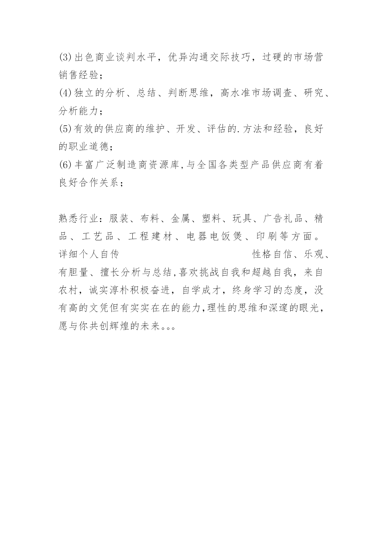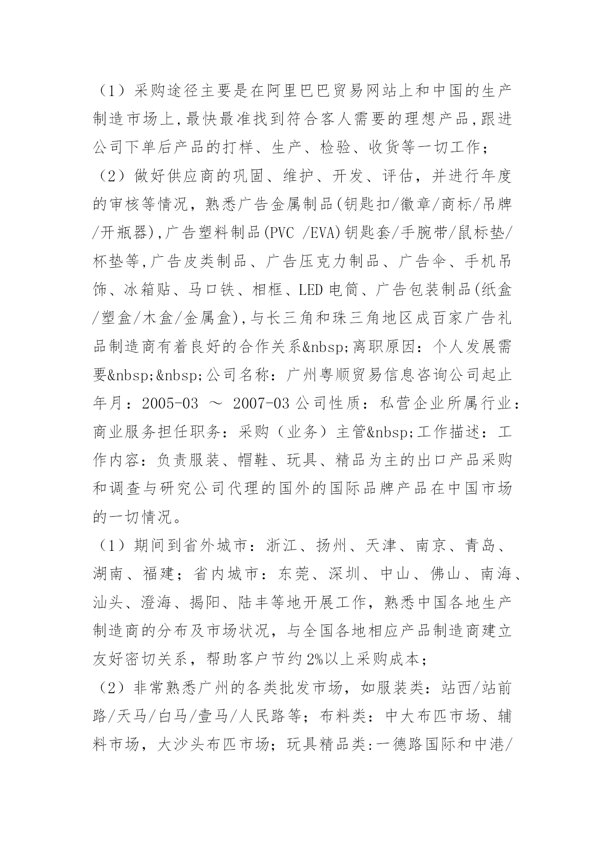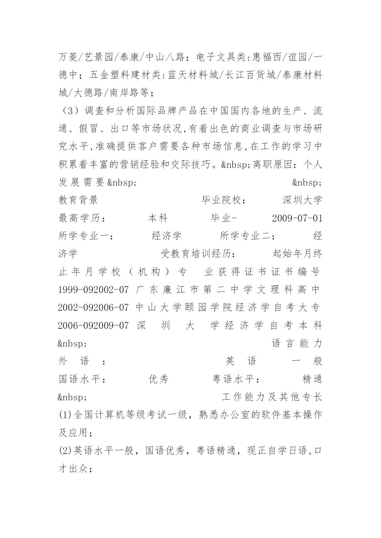 经济学专业个人简历的表格经济学专业个人简历的表格个人基本简历姓名:-国籍:中国无照片目前所在地:广州民族:汉族户口所在地:湛江身材:171cm?66kg婚姻状况:未婚年龄:26岁培训认证: 诚信徽章: 求职意向及工作经历人才类型:普通求职?应聘职位:市场销售/营销类:营销主管/品牌主管采购专员采购主管贸易类贸易专员工作年限:3职称:无职称求职类型:全职可到职-一个星期月薪要求:2000--3500希望工作地区:广州个人工作经历:公司名称:广州钧柏贸易出口有限公司起止年月:2007-03~2008-01公司性质:私营企业所属行业:广告,策划,营销担任职务:采购主管 工作描述:工作的内容:负责公司客户需要的广告礼品、精品、工艺品、饰品、文具用品、包装盒等产品的出口采购及对供应商的巩固、维护、开发、评估、审核等。(1)采购途径主要是在阿里巴巴贸易网站上和中国的生产制造市场上,最快最准找到符合客人需要的理想产品,跟进公司下单后产品的打样、生产、检验、收货等一切工作;(2)做好供应商的巩固、维护、开发、评估,并进行年度的审核等情况,熟悉广告金属制品(钥匙扣/徽章/商标/吊牌/开瓶器),广告塑料制品(PVC/EVA)钥匙套/手腕带/鼠标垫/杯垫等,广告皮类制品、广告压克力制品、广告伞、手机吊饰、冰箱贴、马口铁、相框、LED电筒、广告包装制品(纸盒/塑盒/木盒/金属盒),与长三角和珠三角地区成百家广告礼品制造商有着良好的合作关系 离职原因:个人发展需要 公司名称:广州粤顺贸易信息咨询公司起止年月:2005-03~2007-03公司性质:私营企业所属行业:商业服务担任职务:采购(业务)主管 工作描述:工作内容:负责服装、帽鞋、玩具、精品为主的出口产品采购和调查与研究公司代理的国外的国际品牌产品在中国市场的一切情况。(1)期间到省外城市:浙江、扬州、天津、南京、青岛、湖南、福建;省内城市:东莞、深圳、中山、佛山、南海、汕头、澄海、揭阳、陆丰等地开展工作,熟悉中国各地生产制造商的分布及市场状况,与全国各地相应产品制造商建立友好密切关系,帮助客户节约2%以上采购成本;(2)非常熟悉广州的各类批发市场,如服装类:站西/站前路/天马/白马/壹马/人民路等;布料类:中大布匹市场、辅料市场,大沙头布匹市场;玩具精品类:一德路国际和中港/万菱/艺景园/泰康/中山八路;电子文具类:惠福西/谊园/一德中;五金塑料建材类:蓝天材料城/长江百货城/泰康材料城/大德路/南岸路等;(3)调查和分析国际品牌产品在中国国内各地的生产、流通、假冒、出口等市场状况,有着出色的商业调查与市场研究水平,准确提供客户需要各种市场信息,在工作的学习中积累着丰富的营销经验和交际技巧。 离职原因:个人发展需要 教育背景毕业院校:深圳大学最高学历:本科毕业-2009-07-01所学专业一:经济学所学专业二:经济学受教育培训经历:起始年月终止年月学校(机构)专业获得证书证书编号1999-092002-07广东廉江市第二中学文理科高中2002-092006-07中山大学颐园学院经济学自考大专2006-092009-07深圳大学经济学自考本科 语言能力外语:英语一般国语水平:优秀粤语水平:精通 工作能力及其他专长(1)全国计算机等级考试一级,熟悉办公室的软件基本操作及应用;(2)英语水平一般,国语优秀,粤语精通,现正自学日语,口才出众;(3)出色商业谈判水平,优异沟通交际技巧,过硬的市场营销售经验;(4)独立的分析、总结、判断思维,高水准市场调查、研究、分析能力;(5)有效的供应商的维护、开发、评估的.方法和经验,良好的职业道德;(6)丰富广泛制造商资源库,与全国各类型产品供应商有着良好合作关系;熟悉行业:服装、布料、金属、塑料、玩具、广告礼品、精品、工艺品、工程建材、电器电饭煲、印刷等方面。详细个人自传性格自信、乐观、有胆量、擅长分析与总结,喜欢挑战自我和超越自我,来自农村,诚实淳朴积极奋进,自学成才,终身学习的态度,没有高的文凭但有实实在在的能力,理性的思维和深邃的眼光,愿与你共创辉煌的未来。。。
