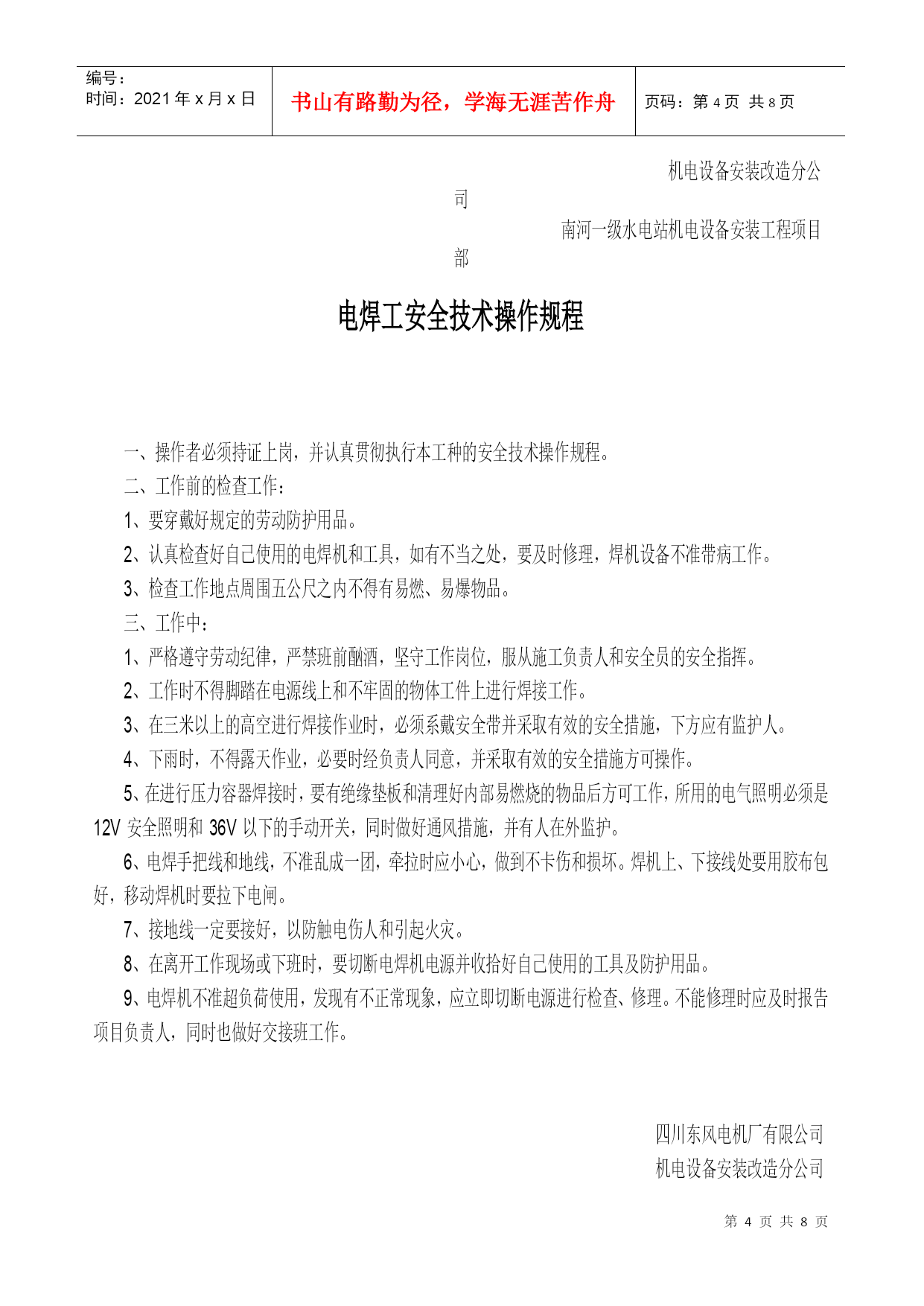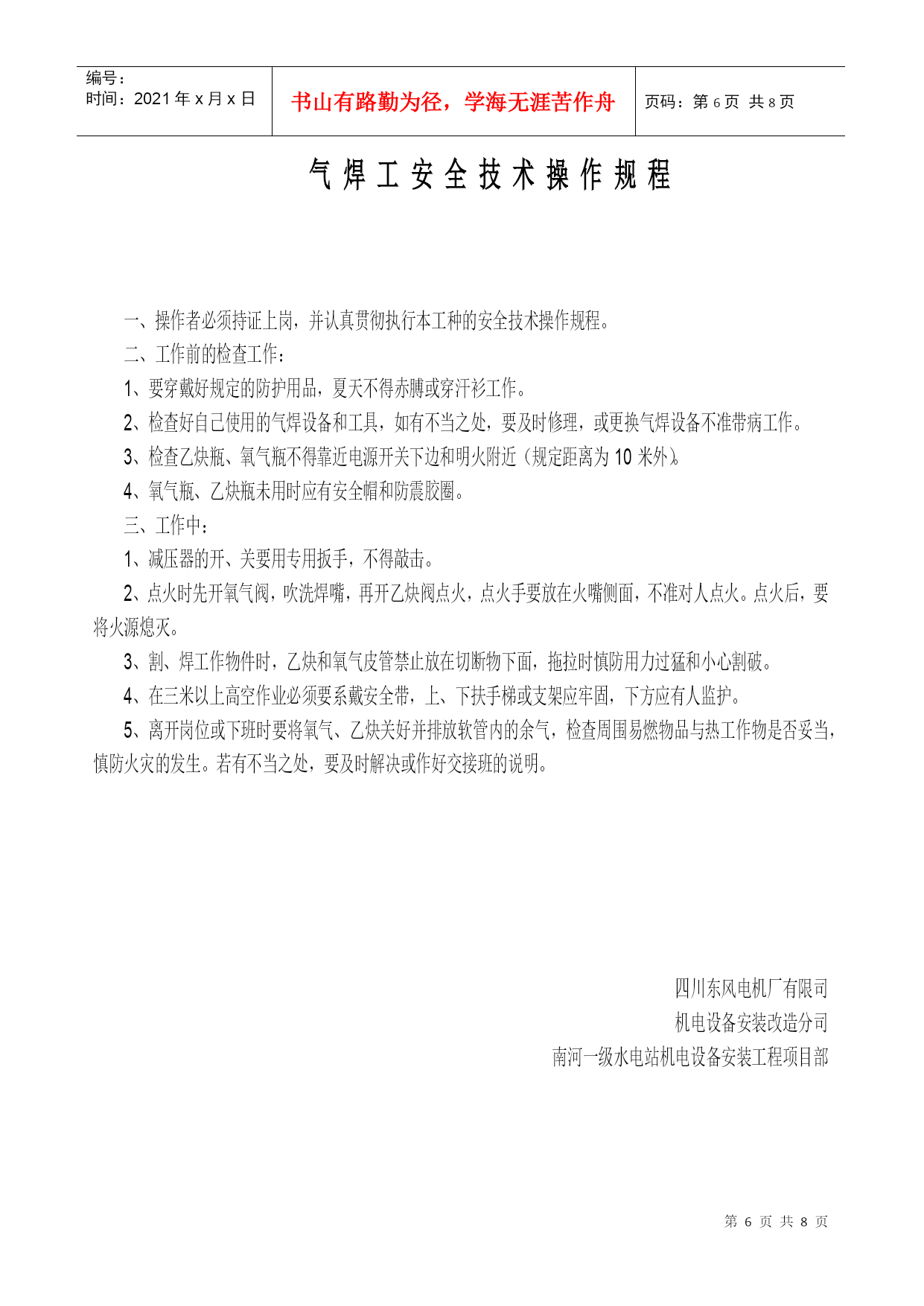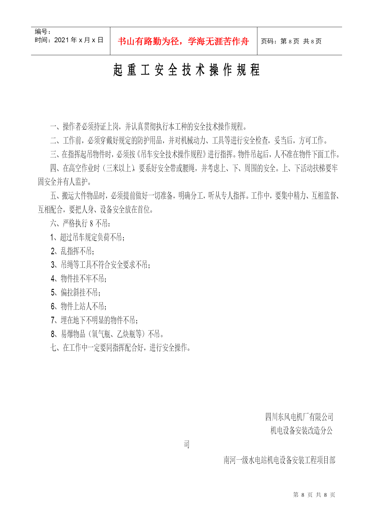 机电设备安装现场安全规则南河一级水电站机电设备安装工程项目部根据国家机电安装和建筑安装工程的有关安全规定,同时结合安装改造分公司对南河一级水电站机电设备安装工程项目部安全要求和安装工程的特点,特制定以下机电设备安装现场的安全规则:一、认真贯彻国家机电安装和建筑安装工作的安全法规,坚持“谁主管,谁负责”的原则,要把安装施工现场的人身、设备安全工作和防火工作放在首位,确实做到“责任重于泰山”。二、切实认真做好机电设备安装现场的施工安全、防火安全和生活安全,现场的安全施工、防火安全和生活安全措施,要落实到每项具体工作中去并指定专人负责管理。三、机电设备安装工程项目经理为现场施工安全、防火安全和生活安全的“第一负责人”,有着不可推卸的责任,应当认真做好员工的安全教育工作和遵守安全法规。四、机电设备安装施工安全、防火安全和员工生活安全是各项工作的头等大事,要求项目经理部负责做好督查、抽查,同时要求按以下内容严格执行;1、施工现场要有醒目的安全条幅和相关工作的警告牌,提高员工的防范意识。2、施工作业中将施工安全和防火安全责任制落实到每位员工,要求各施工组;班前、班后进行一次自检。3、在安装施工作业区域内,尤其是有易燃、易爆的场所严格注意火灾的防范工作,项目经理指派专人负责检查落实。4、保持施工作业现场和生活区域内的环境整洁,有利于员工的身心健康,严禁施工现场抽游烟。施工现场必须开辟专用安全通道,不得以任何理由擅自占用和堵塞。5、施工现场和生活住地严禁不规范的乱拉乱接电源,慎防电气火灾和触电伤人,严禁施工作业中穿拖鞋。6、进行施工作业前每个员工应穿戴好规定的劳动保护用品,避免不必要的伤害。7、机电设备安装施工现场严禁焚烧杂物及垃圾。严防火灾隐患。8、机电设备安装高空作业人员必须系戴安全带,慎防高空坠落事故的发生,严禁下方有人施工并安排专人巡视。起吊、搬运、安装超大工件时,必须由起重工挂绳指挥。9、认真做好现场施工所需物资的仓储,保管工作,并有防偷、防盗、防火灾的安全措施,根据具体情况必要时派专人守护。10、特殊工种作业人员必须持证上岗,无证人员严禁从事特种作业。特殊工种作业人员必须认真贯彻执行本工种的安全技术操作规程,做到“安全第一、预防为主”的方针。11、一旦发生人身设备事故,现场员工应采取积极自救措施,并做好员工有组织、有秩序撤离和疏散工作。现场目击者做好旁证工作,以便事故的分析及整改措施的制定。上述安全规则应做到精心组织、精心安排,把施工安全和防火安全工作做好做扎实,杜绝各类人身、设备事故和火灾事故的发生,为施工创造良好的工作环境并保证员工的健康权利。四川东风电机厂有限公司机电设备安装改造分公司南河一级水电站机电设备安装工程项目部编号:时间:2021年x月x日书山有路勤为径,学海无涯苦作舟页码:第PAGE8页共NUMPAGES8页第PAGE\*MERGEFORMAT8页共NUMPAGES\*MERGEFORMAT8页安装钳工(机械调试员)安全技术操作规程认真贯彻执行本工种的安全技术操作规程。工作前的检查工作:按本工种的规定戴好劳动防护用品。要进行工作现场周围和使用工具的安全检查。自行使用的工具不能带飞刺,对易损的工具应即时修复,防止误伤他人。工作中:严格遵守劳动纪律,严禁班前酗酒,坚守工作岗位,服从施工负责人和安全员的安全指挥。使用钻削工具时,严禁戴手套,对特殊重大物件起吊、搬运、安装时,要有起重工配合进行。使用手拉葫芦、千斤顶等起重工具时必须挂好、垫平、放牢靠,两人以上工作,要听从一人指挥。使用手电钻、手砂轮(电动)要检查无漏电、安全防护罩齐全、妥当后,方可工作。使用完毕应轻放,不得随意乱丢,以防人为的破坏损耗。高空作业时,必须将安全带挂固牢靠。所携带的工具物件要有防止坠落的措施。工作时下方严禁站人并要有“严禁通行”的标识。所用登云梯要放牢靠,防止滑动,下方要有人监督、配合。严格遵守劳动纪律,多人同时工作时,不准随意脱离工作岗位和打闹说笑。保持工作场地清洁卫生,保证安全绿色通道畅通无阻,认真做好文明生产和安全生产。离开工作现场或下班时,要切断使用机具的电源并收拾好自己使用的工具和防护用品。四川东风电机厂有限司机电设备安装改造分司南河一级水电站机电设备安装工程项目部安装电工(电气调试员)安全技术操作规程一、施工现场配备的机器设备必须制定专人负责维护保养,并有不可缺少的防护装置。二、高、低压电路的装置的鉴别规定:1、一导线对地电压在250伏特以上者为高压装置,250伏特以下为低压装置。2、凡在36伏特以下者为安全电压。三、工作前准备:1、穿戴好规定的防护用品,认真检查防护装置的完整,方可工作