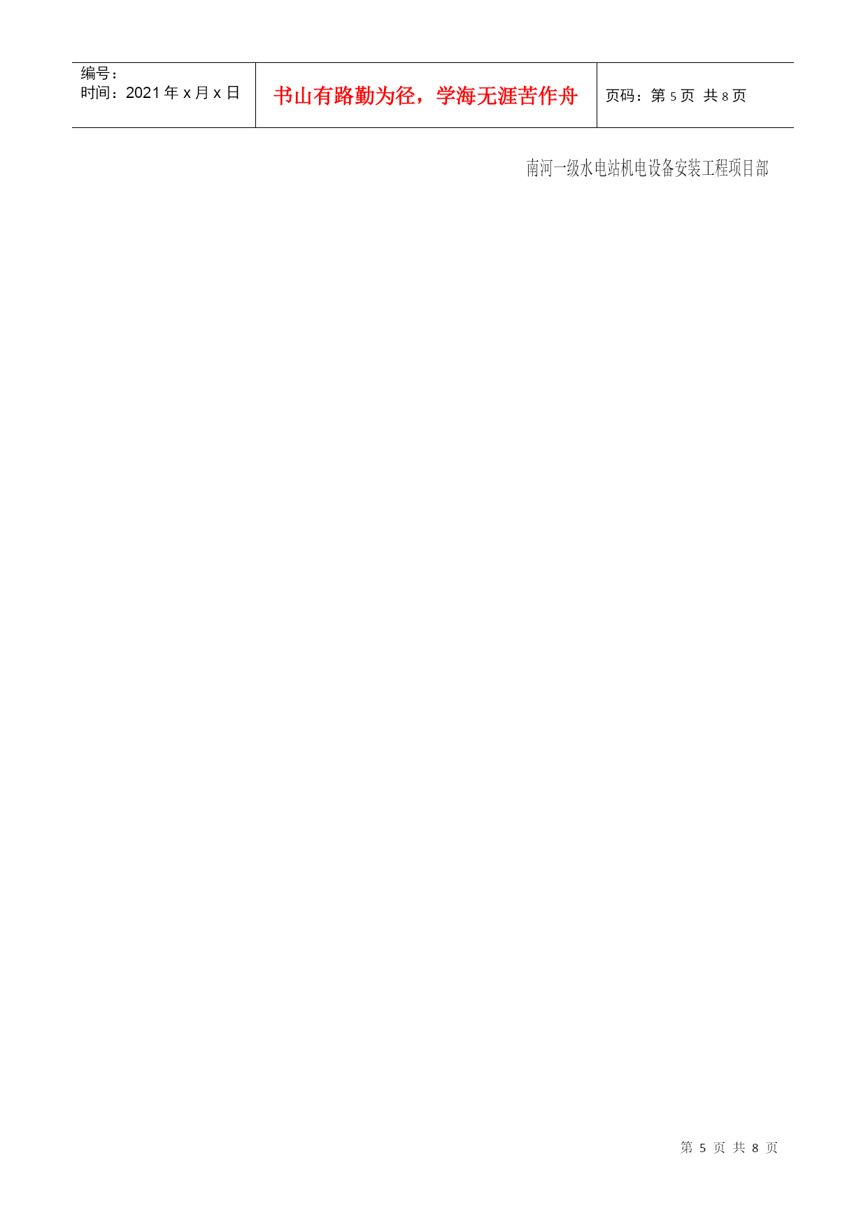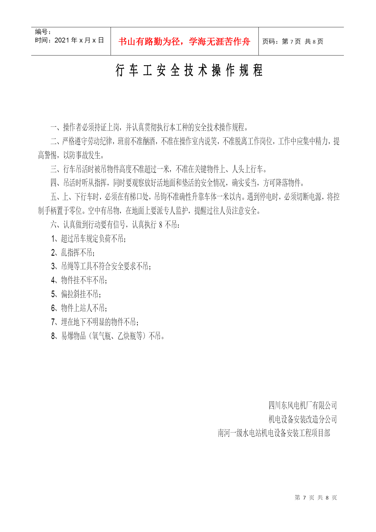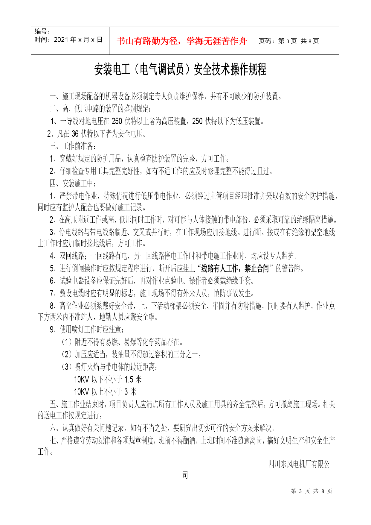 机电设备安装现场安全规则南河一级水电站机电设备安装工程项目部根据国家机电安装和建筑安装工程的有关安全规定,同时结合安装改造分公司对南河一级水电站机电设备安装工程项目部安全要求和安装工程的特点,特制定以下机电设备安装现场的安全规则:一、认真贯彻国家机电安装和建筑安装工作的安全法规,坚持“谁主管,谁负责”的原则,要把安装施工现场的人身、设备安全工作和防火工作放在首位,确实做到“责任重于泰山”。二、切实认真做好机电设备安装现场的施工安全、防火安全和生活安全,现场的安全施工、防火安全和生活安全措施,要落实到每项具体工作中去并指定专人负责管理。三、机电设备安装工程项目经理为现场施工安全、防火安全和生活安全的“第一负责人”,有着不可推卸的责任,应当认真做好员工的安全教育工作和遵守安全法规。四、机电设备安装施工安全、防火安全和员工生活安全是各项工作的头等大事,要求项目经理部负责做好督查、抽查,同时要求按以下内容严格执行;1、施工现场要有醒目的安全条幅和相关工作的警告牌,提高员工的防范意识。2、施工作业中将施工安全和防火安全责任制落实到每位员工,要求各施工组;班前、班后进行一次自检。3、在安装施工作业区域内,尤其是有易燃、易爆的场所严格注意火灾的防范工作,项目经理指派专人负责检查落实。4、保持施工作业现场和生活区域内的环境整洁,有利于员工的身心健康,严禁施工现场抽游烟。施工现场必须开辟专用安全通道,不得以任何理由擅自占用和堵塞。5、施工现场和生活住地严禁不规范的乱拉乱接电源,慎防电气火灾和触电伤人,严禁施工作业中穿拖鞋。6、进行施工作业前每个员工应穿戴好规定的劳动保护用品,避免不必要的伤害。7、机电设备安装施工现场严禁焚烧杂物及垃圾。严防火灾隐患。8、机电设备安装高空作业人员必须系戴安全带,慎防高空坠落事故的发生,严禁下方有人施工并安排专人巡视。起吊、搬运、安装超大工件时,必须由起重工挂绳指挥。9、认真做好现场施工所需物资的仓储,保管工作,并有防偷、防盗、防火灾的安全措施,根据具体情况必要时派专人守护。10、特殊工种作业人员必须持证上岗,无证人员严禁从事特种作业。特殊工种作业人员必须认真贯彻执行本工种的安全技术操作规程,做到“安全第一、预防为主”的方针。11、一旦发生人身设备事故,现场员工应采取积极自救措施,并做好员工有组织、有秩序撤离和疏散工作。现场目击者做好旁证工作,以便事故的分析及整改措施的制定。上述安全规则应做到精心组织、精心安排,把施工安全和防火安全工作做好做扎实,杜绝各类人身、设备事故和火灾事故的发生,为施工创造良好的工作环境并保证员工的健康权利。四川东风电机厂有限公司机电设备安装改造分公司南河一级水电站机电设备安装工程项目部编号:时间:2021年x月x日书山有路勤为径,学海无涯苦作舟页码:第PAGE8页共NUMPAGES8页第PAGE\*MERGEFORMAT8页共NUMPAGES\*MERGEFORMAT8页安装钳工(机械调试员)安全技术操作规程认真贯彻执行本工种的安全技术操作规程。工作前的检查工作:按本工种的规定戴好劳动防护用品。要进行工作现场周围和使用工具的安全检查。自行使用的工具不能带飞刺,对易损的工具应即时修复,防止误伤他人。工作中:严格遵守劳动纪律,严禁班前酗酒,坚守工作岗位,服从施工负责人和安全员的安全指挥。使用钻削工具时,严禁戴手套,对特殊重大物件起吊、搬运、安装时,要有起重工配合进行。使用手拉葫芦、千斤顶等起重工具时必须挂好、垫平、放牢靠,两人以上工作,要听从一人指挥。使用手电钻、手砂轮(电动)要检查无漏电、安全防护罩齐全、妥当后,方可工作。使用完毕应轻放,不得随意乱丢,以防人为的破坏损耗。高空作业时,必须将安全带挂固牢靠。所携带的工具物件要有防止坠落的措施。工作时下方严禁站人并要有“严禁通行”的标识。所用登云梯要放牢靠,防止滑动,下方要有人监督、配合。严格遵守劳动纪律,多人同时工作时,不准随意脱离工作岗位和打闹说笑。保持工作场地清洁卫生,保证安全绿色通道畅通无阻,认真做好文明生产和安全生产。离开工作现场或下班时,要切断使用机具的电源并收拾好自己使用的工具和防护用品。四川东风电机厂有限司机电设备安装改造分司南河一级水电站机电设备安装工程项目部安装电工(电气调试员)安全技术操作规程一、施工现场配备的机器设备必须制定专人负责维护保养,并有不可缺少的防护装置。二、高、低压电路的装置的鉴别规定:1、一导线对地电压在250伏特以上者为高压装置,250伏特以下为低压装置。2、凡在36伏特以下者为安全电压。三、工作前准备:1、穿戴好规定的防护用品,认真检查防护装置的完整,方可工作