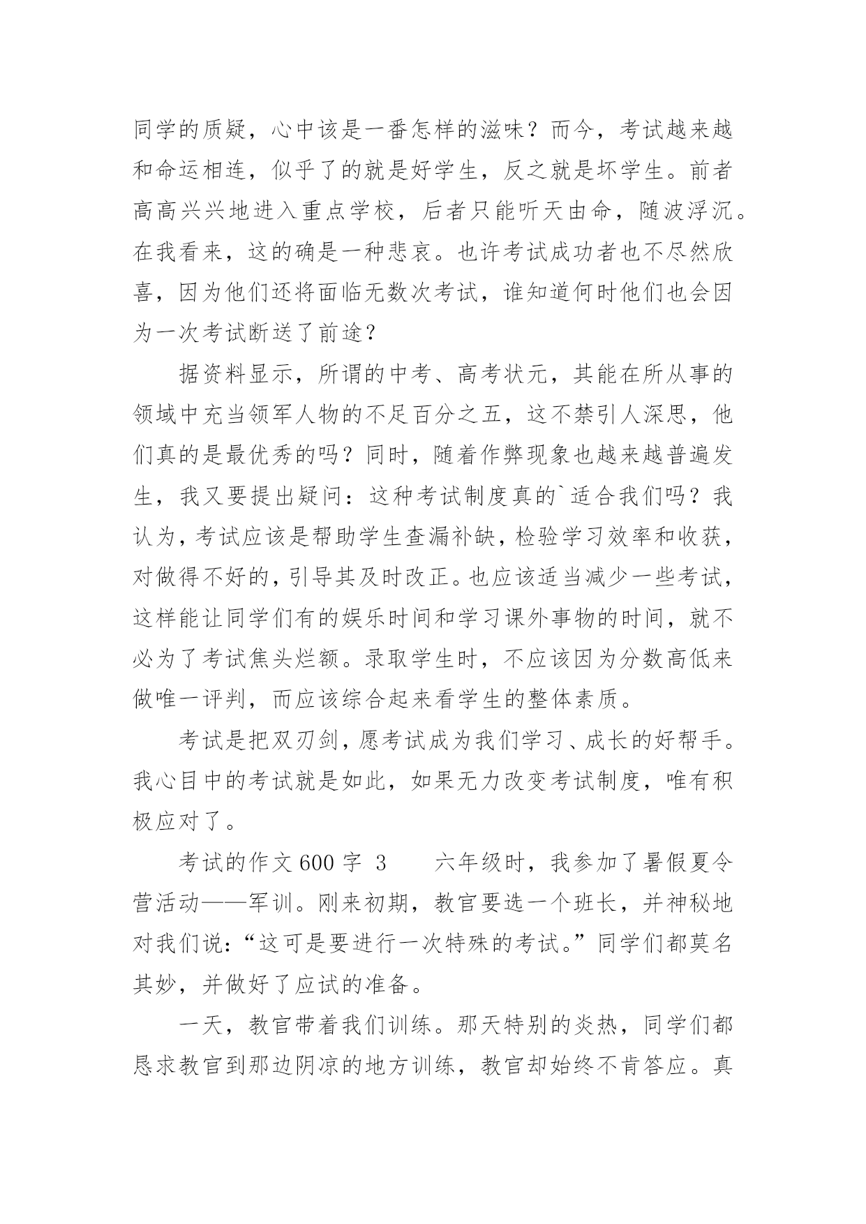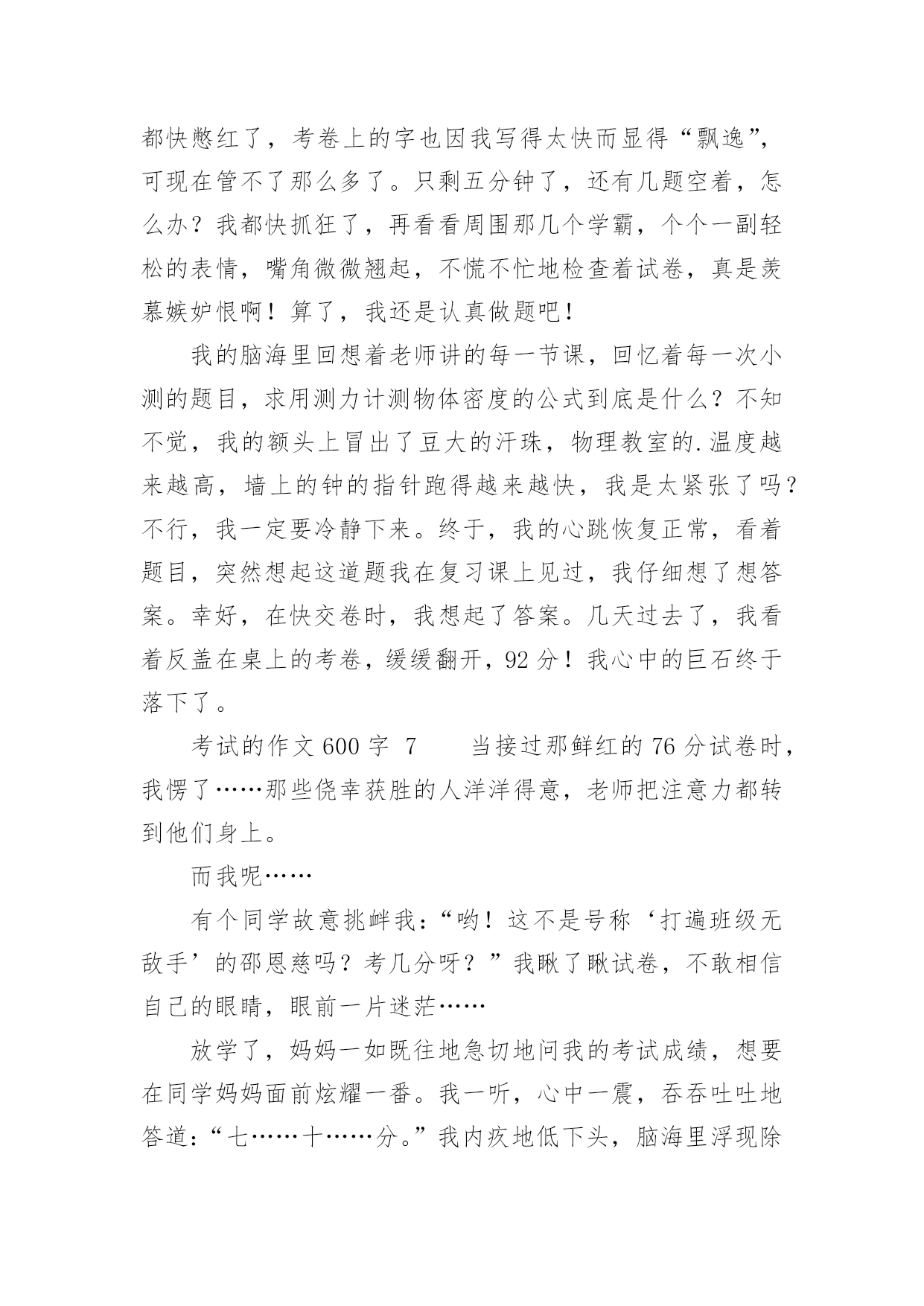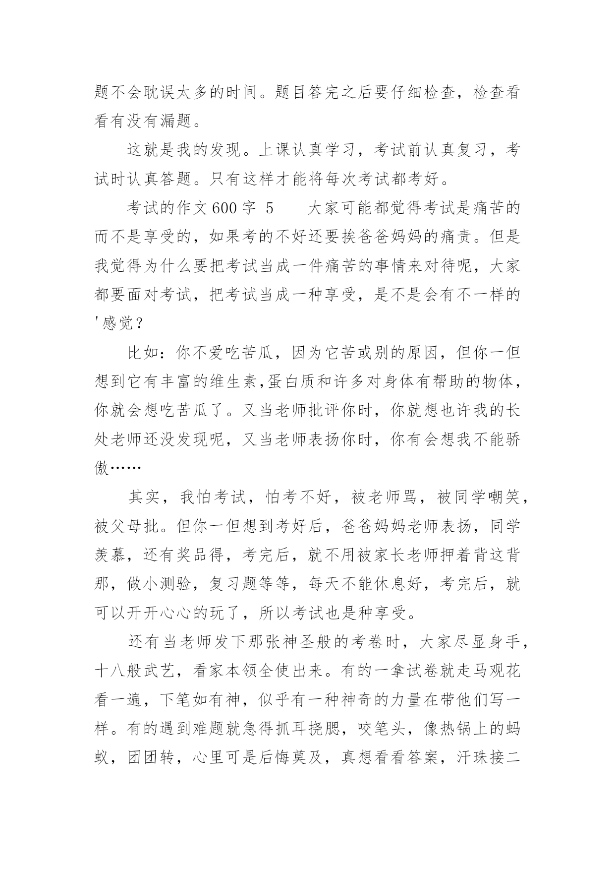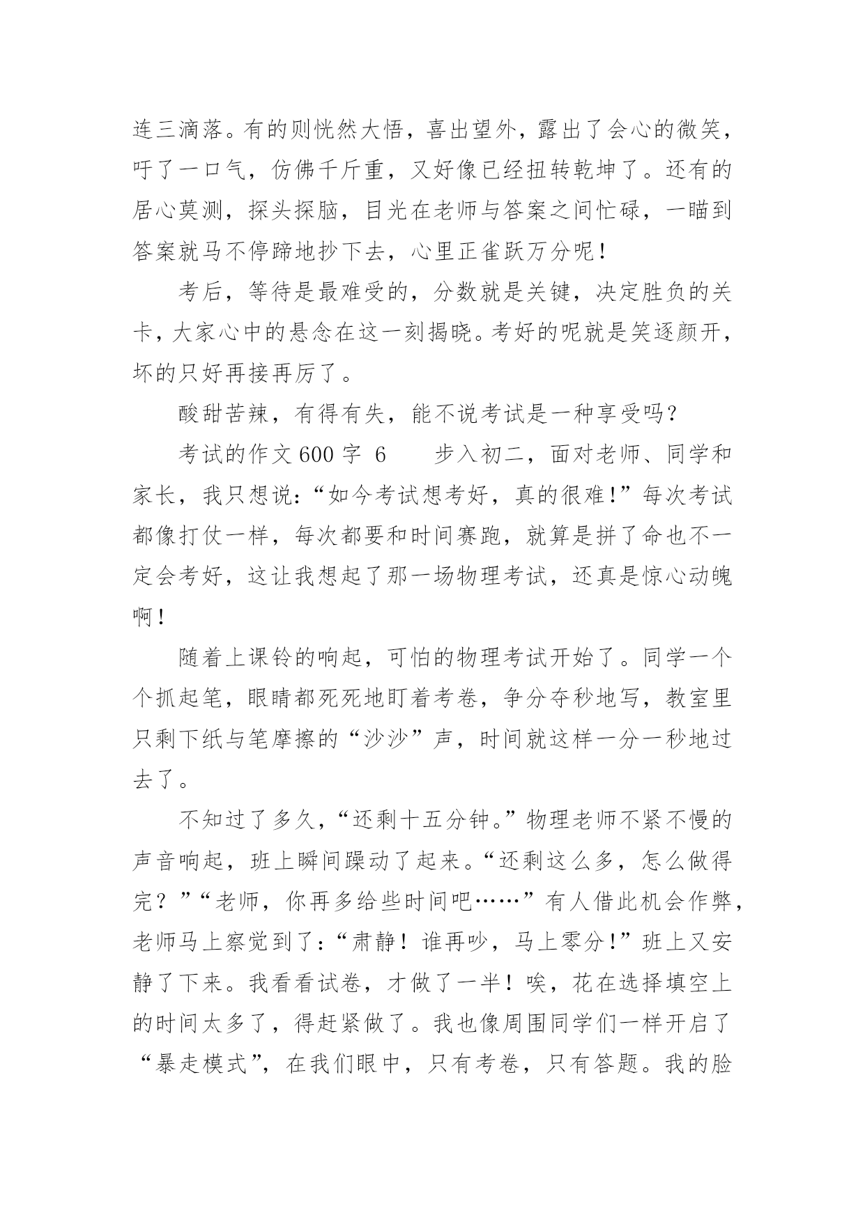 考试的作文600字精选考试的作文600字29篇在学习、工作、生活中,大家对作文都不陌生吧,借助作文可以提高我们的语言组织能力。你知道作文怎样写才规范吗?下面是小编整理的考试的作文600字,欢迎阅读,希望大家能够喜欢。考试的作文600字1在我经历过的人生道路上,遇到了一个头号天敌粗心。粗心与我纠缠不清,有许多次都与它绕在一起,甩也甩不开。到现在,我还是逃不出粗心的魔掌:有时,死里逃生,但伤势严重;有时却被它拽得紧紧的。又有多少次,它害我失去了好成绩,害得我整天心神不宁的。记得那是一次语文考试,大家都加紧复习,不敢有半点马虎。考试开始时,我信心满满的,心里一边想象着好成绩降临在我身上,一边又希望这次不要和粗心碰面了。试卷发下来时,我瞄了几眼,幸好不算太难。我写上名字,开始埋头做题目,做了拼写题,又做组词题,一口气冲到了阅读题。这篇短文我们做过,真是天助我也,简单程度★★★,真是张飞吃豆芽小菜一碟。我没看题目,就刷刷刷地写上答案。OK!我又继续往下写,写完了阅读题,开始了漫长的作文之旅。《写写心里话》给谁写呢?算了,写给胡志豪吧!我又开始奋笔疾书,终于,作文之旅在离交卷2分钟前结束了。交卷完毕后,同学们议论纷纷,有的在讨论题目应该怎么写,有的在垂头丧气地说自己作文没写完,有的'开心,有的悲叹。教室里一片沸腾。我暗自高兴,心想:这次应该考得还好吧!因为那天我头疼,所以星期四晚上回家。叶老师把试卷发给我时,我傻了眼,第一题僵硬写成坚硬,那道自以为最简单的题目,因为没看题目要求,所以亲手葬送了宝贵的2.5分。这一张试卷,粗心没有饶过我,发人深思啊!又有一次,那是放月假的时候。回校时,本以为东西带齐了,便兴冲冲地来到学校。那天晚上,我怎么也找不到数学试卷,仔细想了想,我恍然大悟,原来因为我粗心,忘了把试卷放回书包,导致了这场失误。接下来的一个星期,我天天盼着妈妈送试卷来,天天心神不宁。这一件事,粗心最终还是没饶过我。从一年级到现在已经快四年了,在这个学期里,我要告别粗心,选择细心。我要对外宣誓:我不再粗心!粗心不好!我要让粗心永远离开我!考试的作文600字2考试,具有丰富的底蕴和文化内涵,早在隋朝时,考试规模就初具雏形,在唐朝时得到了飞速发展,并且一直流传至今。考试是发现人才,选拔人才最有效的方法之一,具有非常大的进步意义。可如今,考试似乎成了一块巨石,压得许多学生喘不过气来。考试多,无论是小学,还是中学,总要面临几天一次的测验,一月一次的月考,还有期中,期末等多次重大考试。这可谓是让学生们手忙脚乱,苦不堪言。考试之后带来的结果备受光注,考试了,得到别人的表扬,心中自然欢喜。若是考砸了,便无精打采,扑面而来的是老师和家长的批评,同学的质疑,心中该是一番怎样的滋味?而今,考试越来越和命运相连,似乎了的就是好学生,反之就是坏学生。前者高高兴兴地进入重点学校,后者只能听天由命,随波浮沉。在我看来,这的确是一种悲哀。也许考试成功者也不尽然欣喜,因为他们还将面临无数次考试,谁知道何时他们也会因为一次考试断送了前途?据资料显示,所谓的中考、高考状元,其能在所从事的领域中充当领军人物的不足百分之五,这不禁引人深思,他们真的是最优秀的吗?同时,随着作弊现象也越来越普遍发生,我又要提出疑问:这种考试制度真的`适合我们吗?我认为,考试应该是帮助学生查漏补缺,检验学习效率和收获,对做得不好的,引导其及时改正。也应该适当减少一些考试,这样能让同学们有的娱乐时间和学习课外事物的时间,就不必为了考试焦头烂额。录取学生时,不应该因为分数高低来做唯一评判,而应该综合起来看学生的整体素质。考试是把双刃剑,愿考试成为我们学习、成长的好帮手。我心目中的考试就是如此,如果无力改变考试制度,唯有积极应对了。考试的作文600字3六年级时,我参加了暑假夏令营活动——军训。刚来初期,教官要选一个班长,并神秘地对我们说:“这可是要进行一次特殊的考试。”同学们都莫名其妙,并做好了应试的准备。一天,教官带着我们训练。那天特别的炎热,同学们都恳求教官到那边阴凉的地方训练,教官却始终不肯答应。真奇怪,前几天,教官每天都是带我们到阴凉的地方训练,可最近几天却跟换了一个人似的。终于训练完了,同学们抱怨着拥进宿舍,直奔饮水机。顿时,宿舍里一片混乱,同学们都各不相让,甚至互相争吵了起来:小明皱着眉头指着小宁说:“你真能挤!贪嘴!”“你才是呢!”小宁不甘示弱的'回答道。但是,只有小海没有去。我们奇怪地问他:“还不快去!都快没水了!”“怎么,你不渴吗?”他擦了擦干裂的嘴唇说:“你们先喝吧。待会儿我再喝。”第二天,军营里放假,同学们兴高采烈的一起逛街。正玩得起劲,忽然,后面传来“哎呦!哎呦!……”的声音。我寻声望去,原来是一位老奶奶摔倒在路边上。“走走,看什么看!”同伴嚷道。这时,小海飞速地跑了过去,一边扶