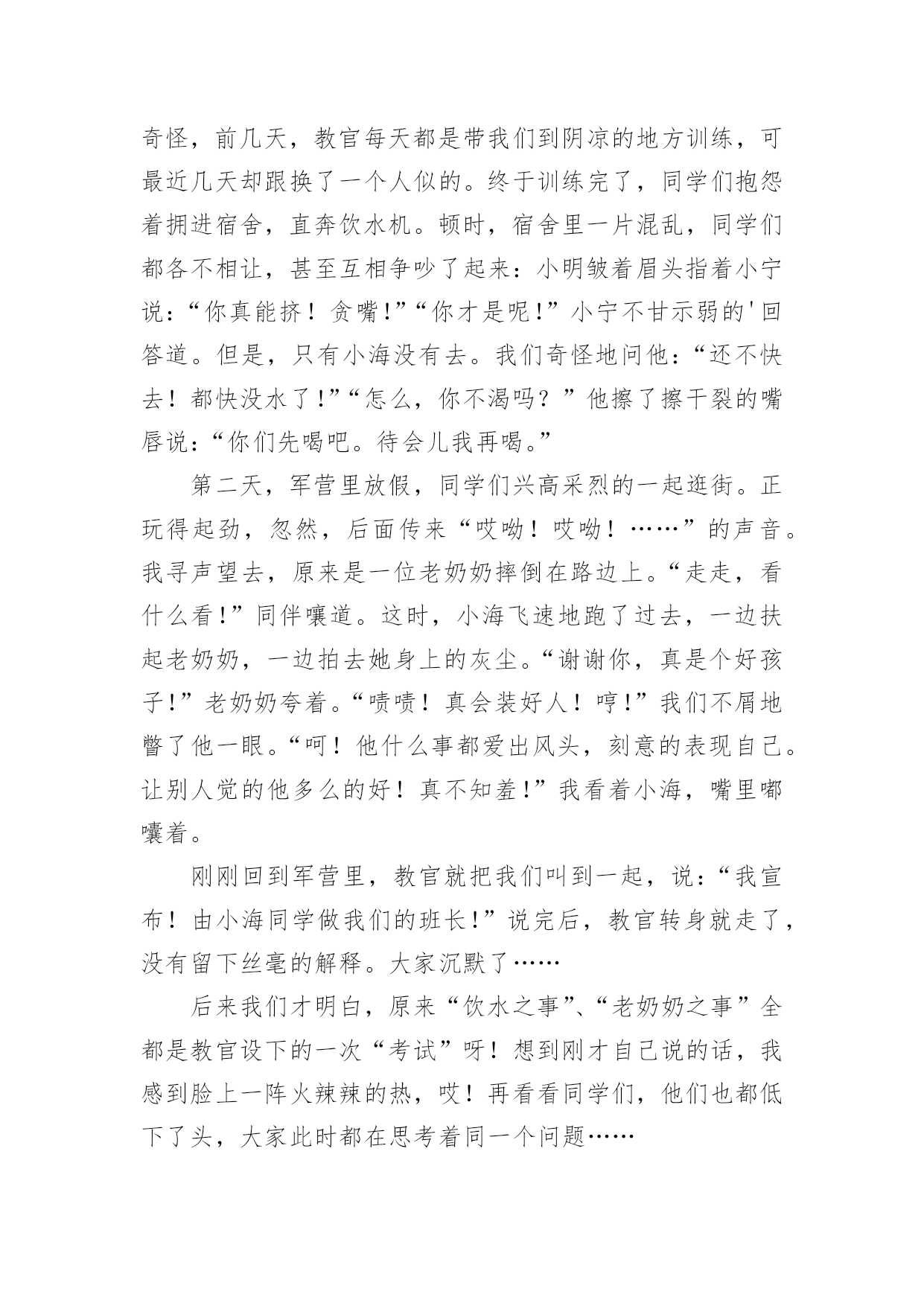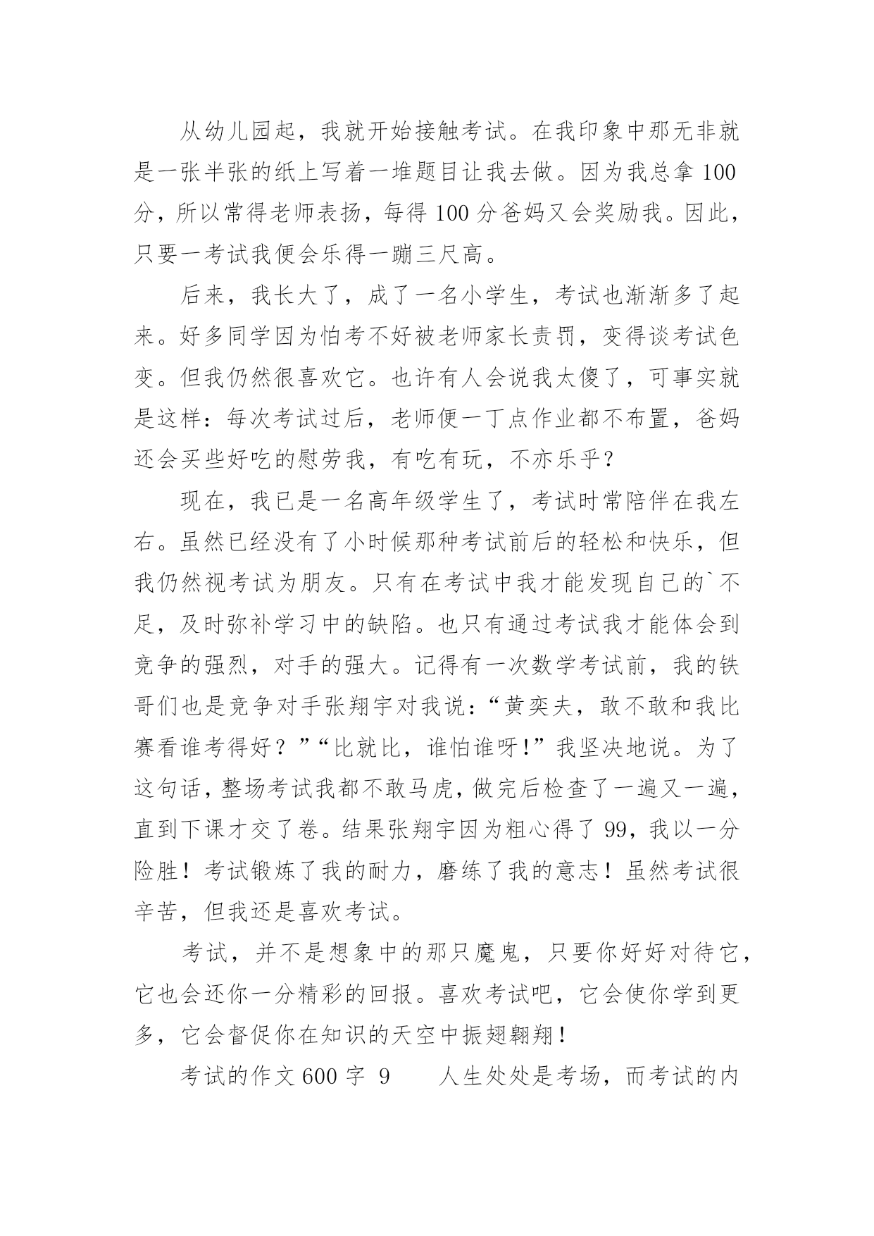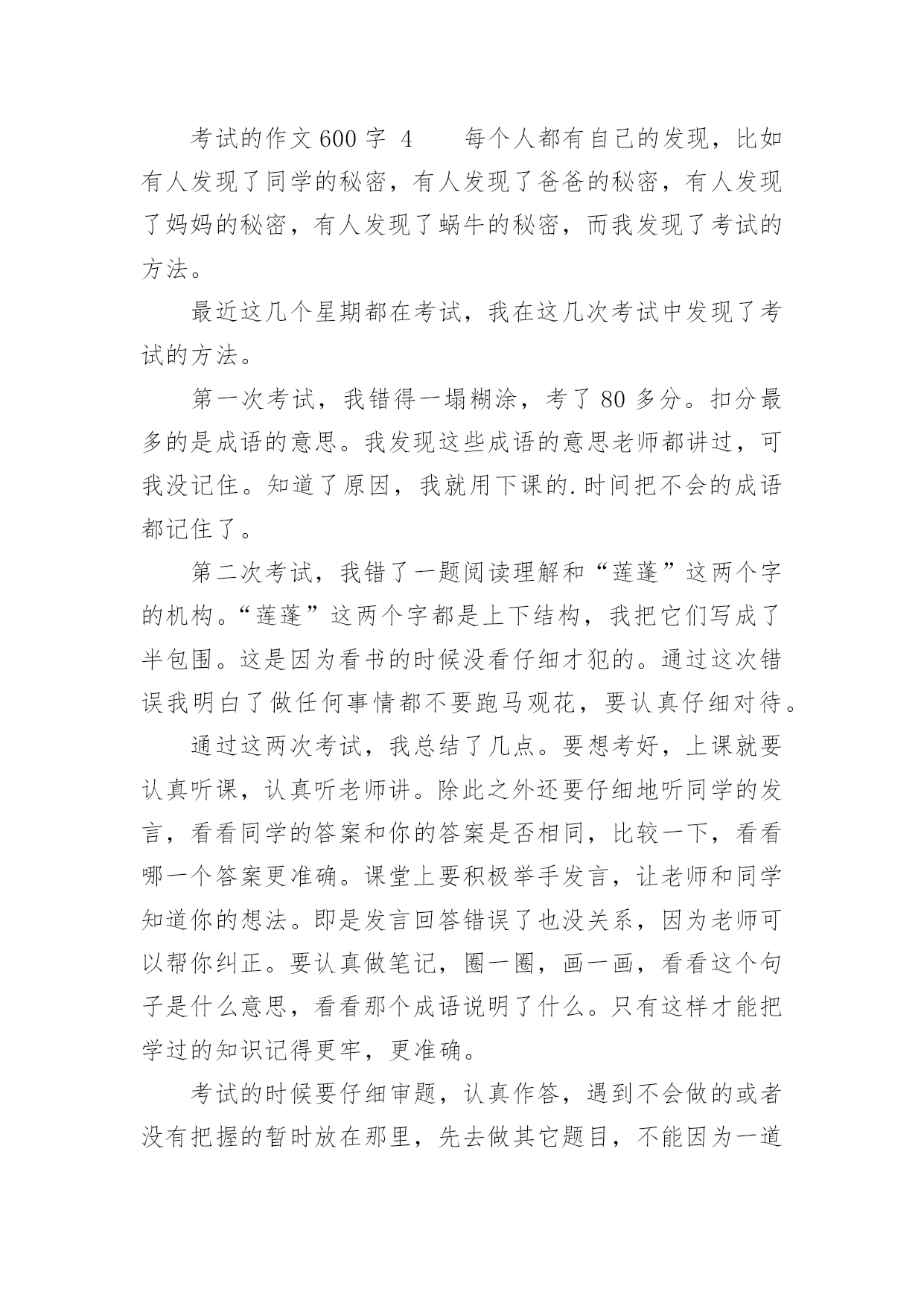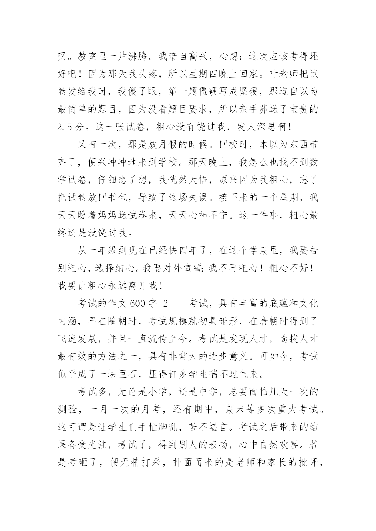 考试的作文600字精选考试的作文600字29篇在学习、工作、生活中,大家对作文都不陌生吧,借助作文可以提高我们的语言组织能力。你知道作文怎样写才规范吗?下面是小编整理的考试的作文600字,欢迎阅读,希望大家能够喜欢。考试的作文600字1在我经历过的人生道路上,遇到了一个头号天敌粗心。粗心与我纠缠不清,有许多次都与它绕在一起,甩也甩不开。到现在,我还是逃不出粗心的魔掌:有时,死里逃生,但伤势严重;有时却被它拽得紧紧的。又有多少次,它害我失去了好成绩,害得我整天心神不宁的。记得那是一次语文考试,大家都加紧复习,不敢有半点马虎。考试开始时,我信心满满的,心里一边想象着好成绩降临在我身上,一边又希望这次不要和粗心碰面了。试卷发下来时,我瞄了几眼,幸好不算太难。我写上名字,开始埋头做题目,做了拼写题,又做组词题,一口气冲到了阅读题。这篇短文我们做过,真是天助我也,简单程度★★★,真是张飞吃豆芽小菜一碟。我没看题目,就刷刷刷地写上答案。OK!我又继续往下写,写完了阅读题,开始了漫长的作文之旅。《写写心里话》给谁写呢?算了,写给胡志豪吧!我又开始奋笔疾书,终于,作文之旅在离交卷2分钟前结束了。交卷完毕后,同学们议论纷纷,有的在讨论题目应该怎么写,有的在垂头丧气地说自己作文没写完,有的'开心,有的悲叹。教室里一片沸腾。我暗自高兴,心想:这次应该考得还好吧!因为那天我头疼,所以星期四晚上回家。叶老师把试卷发给我时,我傻了眼,第一题僵硬写成坚硬,那道自以为最简单的题目,因为没看题目要求,所以亲手葬送了宝贵的2.5分。这一张试卷,粗心没有饶过我,发人深思啊!又有一次,那是放月假的时候。回校时,本以为东西带齐了,便兴冲冲地来到学校。那天晚上,我怎么也找不到数学试卷,仔细想了想,我恍然大悟,原来因为我粗心,忘了把试卷放回书包,导致了这场失误。接下来的一个星期,我天天盼着妈妈送试卷来,天天心神不宁。这一件事,粗心最终还是没饶过我。从一年级到现在已经快四年了,在这个学期里,我要告别粗心,选择细心。我要对外宣誓:我不再粗心!粗心不好!我要让粗心永远离开我!考试的作文600字2考试,具有丰富的底蕴和文化内涵,早在隋朝时,考试规模就初具雏形,在唐朝时得到了飞速发展,并且一直流传至今。考试是发现人才,选拔人才最有效的方法之一,具有非常大的进步意义。可如今,考试似乎成了一块巨石,压得许多学生喘不过气来。考试多,无论是小学,还是中学,总要面临几天一次的测验,一月一次的月考,还有期中,期末等多次重大考试。这可谓是让学生们手忙脚乱,苦不堪言。考试之后带来的结果备受光注,考试了,得到别人的表扬,心中自然欢喜。若是考砸了,便无精打采,扑面而来的是老师和家长的批评,同学的质疑,心中该是一番怎样的滋味?而今,考试越来越和命运相连,似乎了的就是好学生,反之就是坏学生。前者高高兴兴地进入重点学校,后者只能听天由命,随波浮沉。在我看来,这的确是一种悲哀。也许考试成功者也不尽然欣喜,因为他们还将面临无数次考试,谁知道何时他们也会因为一次考试断送了前途?据资料显示,所谓的中考、高考状元,其能在所从事的领域中充当领军人物的不足百分之五,这不禁引人深思,他们真的是最优秀的吗?同时,随着作弊现象也越来越普遍发生,我又要提出疑问:这种考试制度真的`适合我们吗?我认为,考试应该是帮助学生查漏补缺,检验学习效率和收获,对做得不好的,引导其及时改正。也应该适当减少一些考试,这样能让同学们有的娱乐时间和学习课外事物的时间,就不必为了考试焦头烂额。录取学生时,不应该因为分数高低来做唯一评判,而应该综合起来看学生的整体素质。考试是把双刃剑,愿考试成为我们学习、成长的好帮手。我心目中的考试就是如此,如果无力改变考试制度,唯有积极应对了。考试的作文600字3六年级时,我参加了暑假夏令营活动——军训。刚来初期,教官要选一个班长,并神秘地对我们说:“这可是要进行一次特殊的考试。”同学们都莫名其妙,并做好了应试的准备。一天,教官带着我们训练。那天特别的炎热,同学们都恳求教官到那边阴凉的地方训练,教官却始终不肯答应。真奇怪,前几天,教官每天都是带我们到阴凉的地方训练,可最近几天却跟换了一个人似的。终于训练完了,同学们抱怨着拥进宿舍,直奔饮水机。顿时,宿舍里一片混乱,同学们都各不相让,甚至互相争吵了起来:小明皱着眉头指着小宁说:“你真能挤!贪嘴!”“你才是呢!”小宁不甘示弱的'回答道。但是,只有小海没有去。我们奇怪地问他:“还不快去!都快没水了!”“怎么,你不渴吗?”他擦了擦干裂的嘴唇说:“你们先喝吧。待会儿我再喝。”第二天,军营里放假,同学们兴高采烈的一起逛街。正玩得起劲,忽然,后面传来“哎呦!哎呦!……”的声音。我寻声望去,原来是一位老奶奶摔倒在路边上。“走走,看什么看!”同伴嚷道。这时,小海飞速地跑了过去,一边扶
