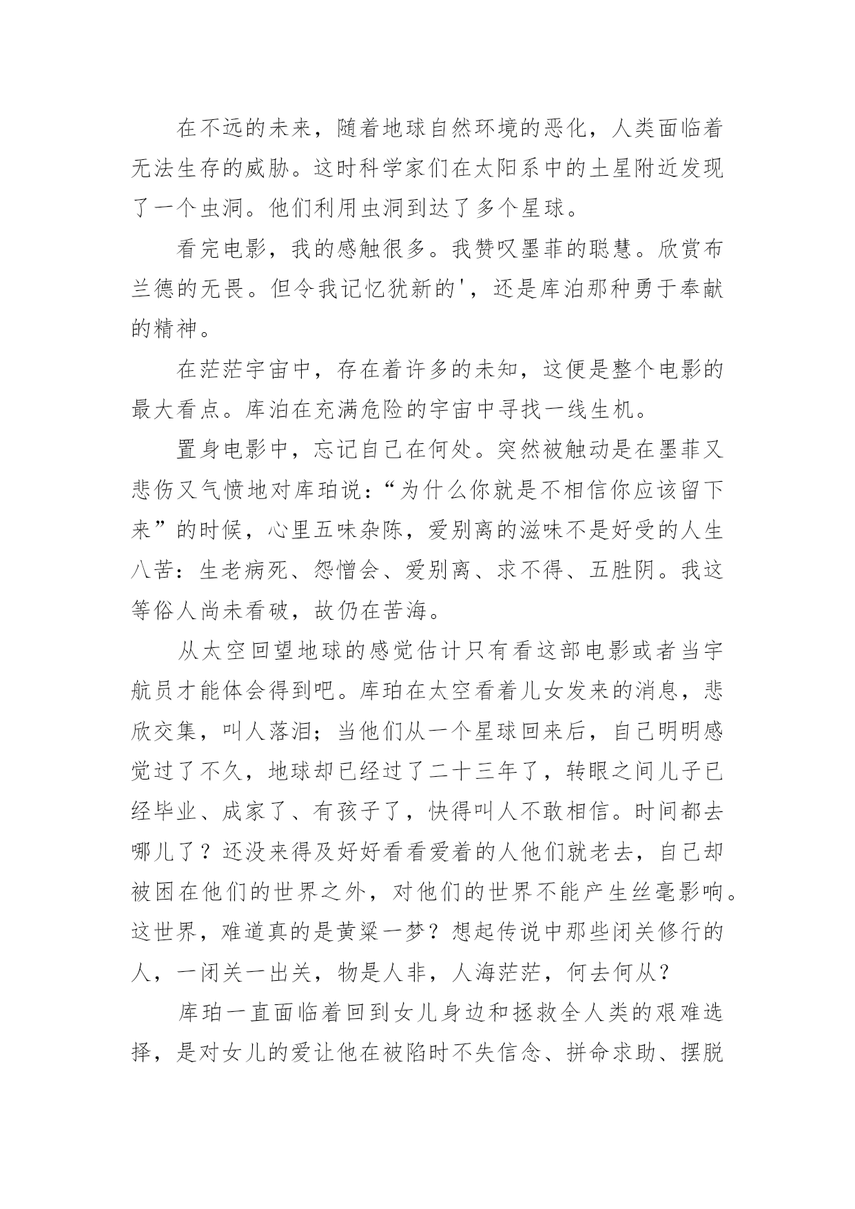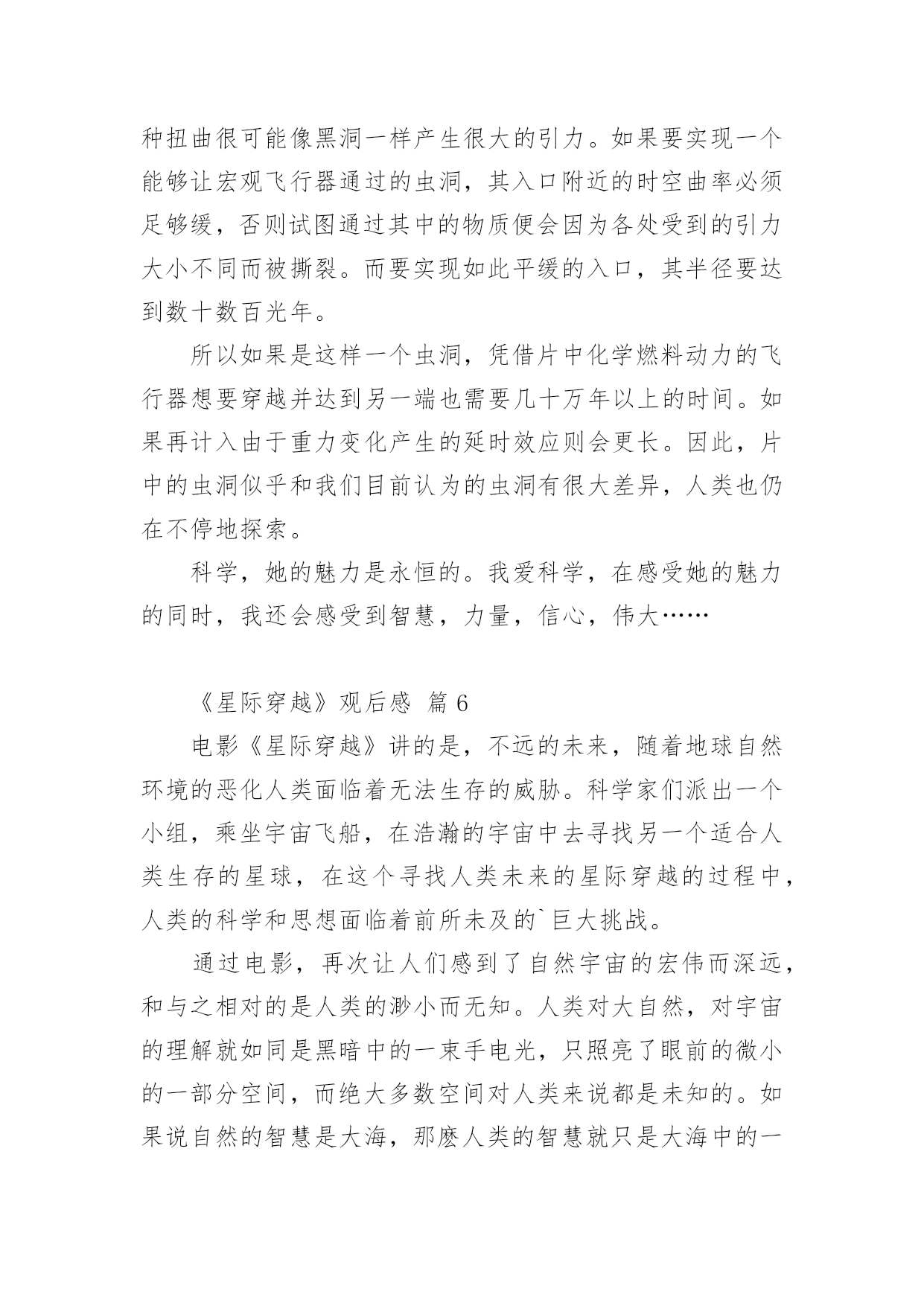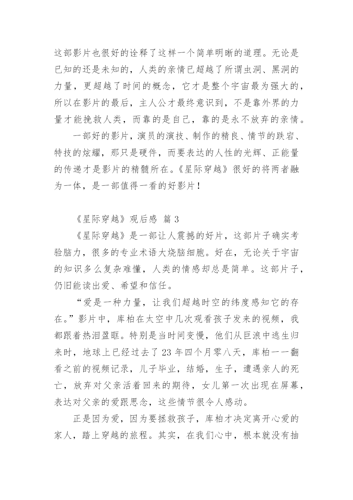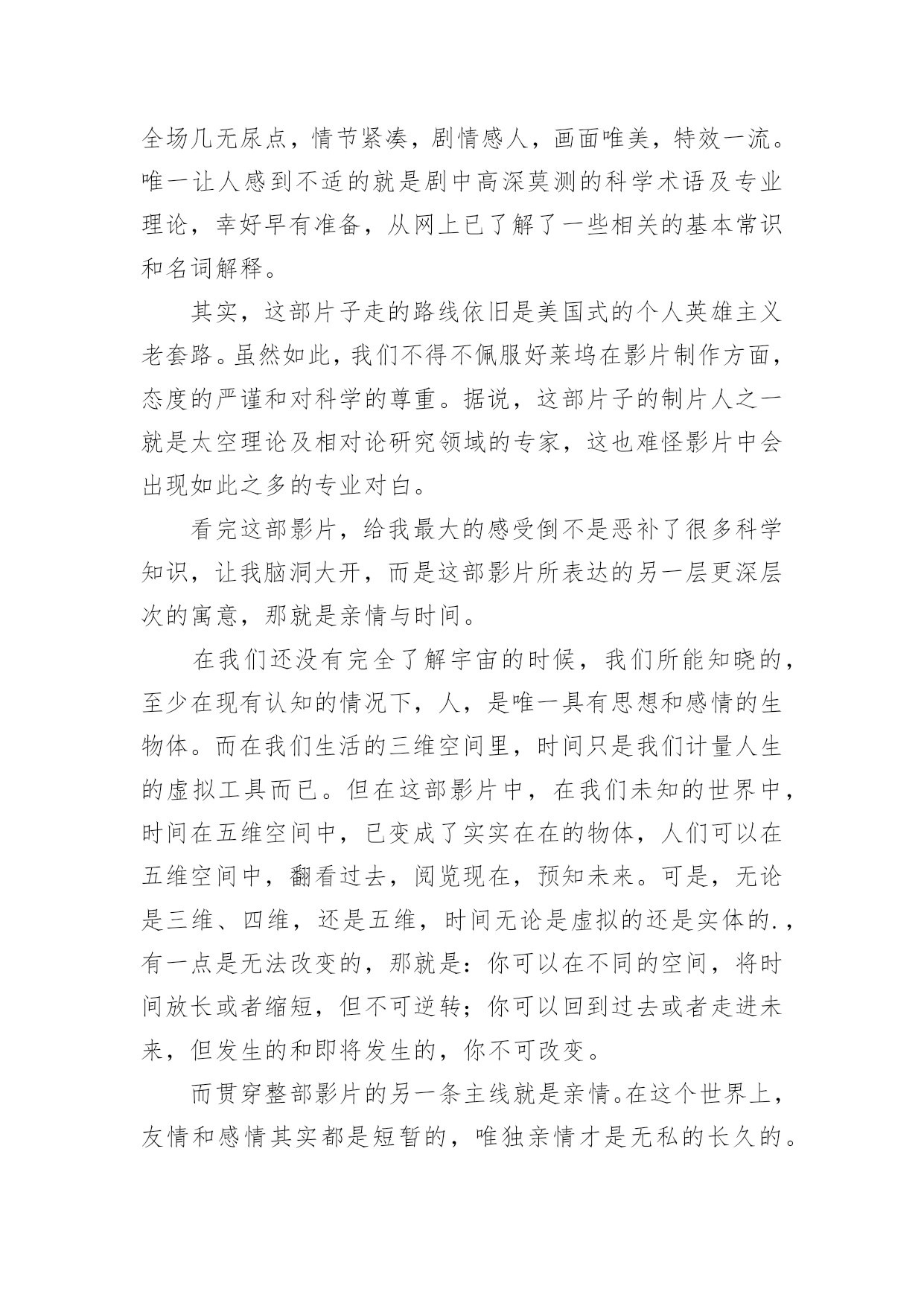 《星际穿越》观后感《星际穿越》观后感14篇当品味完一部影视作品后,这次观看让你有什么领悟呢?这时候,最关键的观后感怎么能落下!可是观后感怎么写才合适呢?下面是小编帮大家整理的《星际穿越》观后感,仅供参考,希望能够帮助到大家。《星际穿越》观后感篇1“我们都身在阴沟里,但仍有人仰望星空。”科幻电影《星际穿越》里出现好几次王尔德的这句诗,这句诗是对这部电影的最佳定义。导演克里斯托弗·诺兰运用自己的艺术手法和智慧把我们引入了一个令人陶醉痴迷的星际探秘穿越之旅。说本片是科幻其实亲情篇也无不可,因为电影里处处洋溢着主角库珀和他女儿墨菲之间的父女亲情。故事发生在未来世界,地球的环境日益恶略,沙尘暴,还有农作物的枯死病,使得人类连温饱都成问题,更严重的是没有如果绿色植物都灭绝了,就不会再光合作用,就没有氧气,人类会灭绝,那个专家教授对库珀说:到了你的女儿这一代,人类就会灭绝。作为父亲,他离开自己的孩子去拯救地球,他说他想的不仅是自己的孩子,还有更多其他家庭的孩子。在结尾处,电影里让库珀在超立方体的五维空间里和墨菲联系,能够穿越时空联系的只有:引力和爱。我是学理科的,也同样被主人公的情感打动。布兰德教授发现在土星附近有一个黑洞,我就很怀疑,为啥太阳系里有黑洞,我们的太阳,火星、土星、地球还相安无事。在黑洞附近有一个虫洞,根据爱因斯坦的广义相对论,虫洞可以使平面上相聚较远的两个点在三维空间里短时间连接,在影片里虫洞的形状不是洞而是一个透明的球,好像根据加州理工学院的教授计算虫洞长度并不是很长只有几十米,可是影片里为了加视觉效果,仿佛走了好长时间。再者这个虫洞仿佛就是为了那个黑洞而生的,从虫洞里一出来就到了黑洞的边缘地带。电影真是无巧不成书啊。黑洞的时间效应使得短短三个小时变成了23年,人类的'命运在大自然面前是那么渺小,仿佛生死就发生在一瞬间。当然,被时间和空间分隔的父女最终还是得以重新相聚,库珀履行了自己回家的诺言,墨菲的理论拯救了人类。对库珀而言,他对于承诺和任务所有的坚持,都是出于爱。航程的灯塔,旅途的终点,始终是女儿所在的地方。《星际穿越》观后感篇2早就从网上看到,最近上映的大片《星际穿越》罕有的被网友一边倒的评价为五星,几个朋友观后也如是说。恰巧朋友的公司有赠票,于是和朋友一同前往院线观看。影片长度近三个小时,用当下最流行的说法,整部影片全场几无尿点,情节紧凑,剧情感人,画面唯美,特效一流。唯一让人感到不适的就是剧中高深莫测的科学术语及专业理论,幸好早有准备,从网上已了解了一些相关的基本常识和名词解释。其实,这部片子走的路线依旧是美国式的个人英雄主义老套路。虽然如此,我们不得不佩服好莱坞在影片制作方面,态度的严谨和对科学的尊重。据说,这部片子的制片人之一就是太空理论及相对论研究领域的专家,这也难怪影片中会出现如此之多的专业对白。看完这部影片,给我最大的感受倒不是恶补了很多科学知识,让我脑洞大开,而是这部影片所表达的另一层更深层次的寓意,那就是亲情与时间。在我们还没有完全了解宇宙的时候,我们所能知晓的,至少在现有认知的情况下,人,是唯一具有思想和感情的生物体。而在我们生活的三维空间里,时间只是我们计量人生的虚拟工具而已。但在这部影片中,在我们未知的世界中,时间在五维空间中,已变成了实实在在的物体,人们可以在五维空间中,翻看过去,阅览现在,预知未来。可是,无论是三维、四维,还是五维,时间无论是虚拟的还是实体的.,有一点是无法改变的,那就是:你可以在不同的空间,将时间放长或者缩短,但不可逆转;你可以回到过去或者走进未来,但发生的和即将发生的,你不可改变。而贯穿整部影片的另一条主线就是亲情。在这个世界上,友情和感情其实都是短暂的,唯独亲情才是无私的长久的。这部影片也很好的诠释了这样一个简单明晰的道理。无论是已知的还是未知的,人类的亲情已超越了所谓虫洞、黑洞的力量,更超越了时间的概念,它才是整个宇宙最为强大的,所以在影片的最后,主人公才最终意识到,不是靠外界的力量才能挽救人类,而靠的是自己,靠的是永不放弃的亲情。一部好的影片,演员的演技、制作的精良、情节的跌宕、特技的炫耀,那只是硬件,而要表达的人性的光辉、正能量的传递才是影片的精髓所在。《星际穿越》很好的将两者融为一体,是一部值得一看的好影片!《星际穿越》观后感篇3《星际穿越》是一部让人震撼的好片,这部片子确实考验脑力,很多的专业术语大烧脑细胞。好在,无论关于宇宙的知识多么复杂难懂,人类的情感却总是简单。这部片子,仍旧能读出爱、希望和信任。“爱是一种力量,让我们超越时空的纬度感知它的存在。”影片中,库柏在太空中几次观看孩子发来的视频,我都跟着热泪盈眶。特别是当时间变慢,他们从巨浪中逃生归来时,地球上已经过去了23年四个月零八天,库柏一一翻看之前的视频记录,儿子毕业,结婚,生子,遭遇亲人的死亡