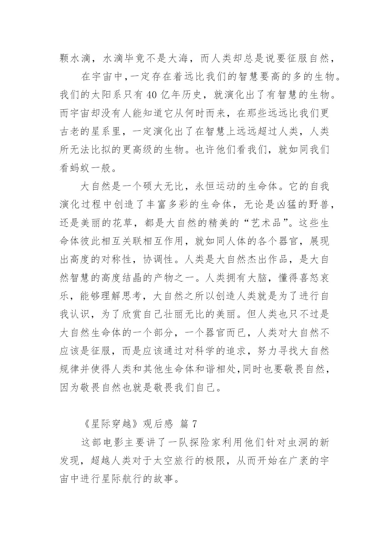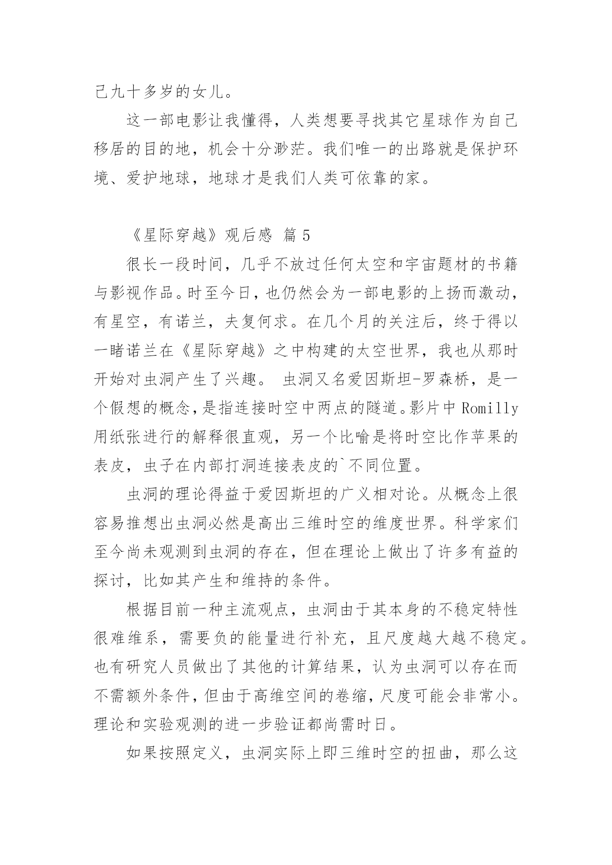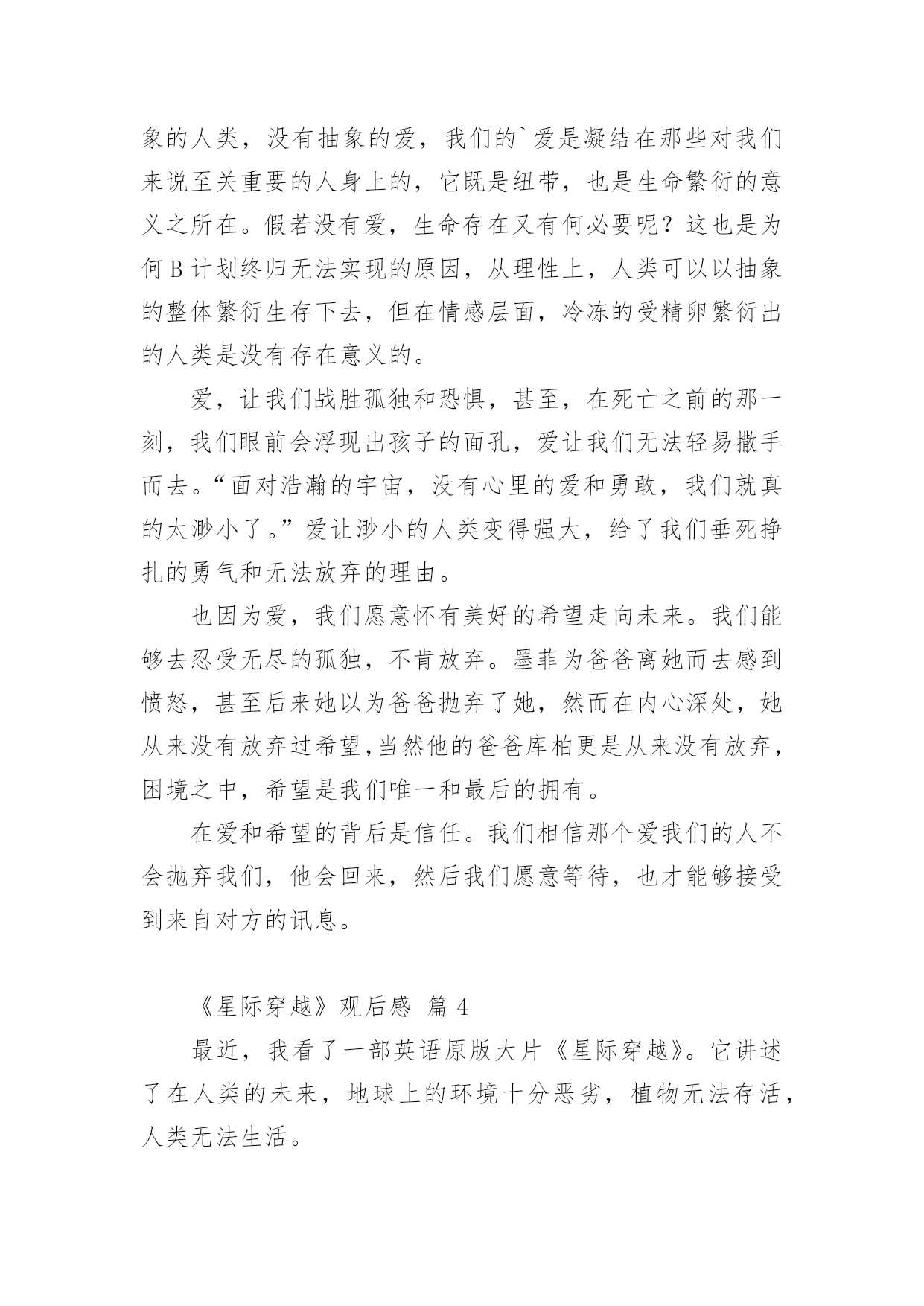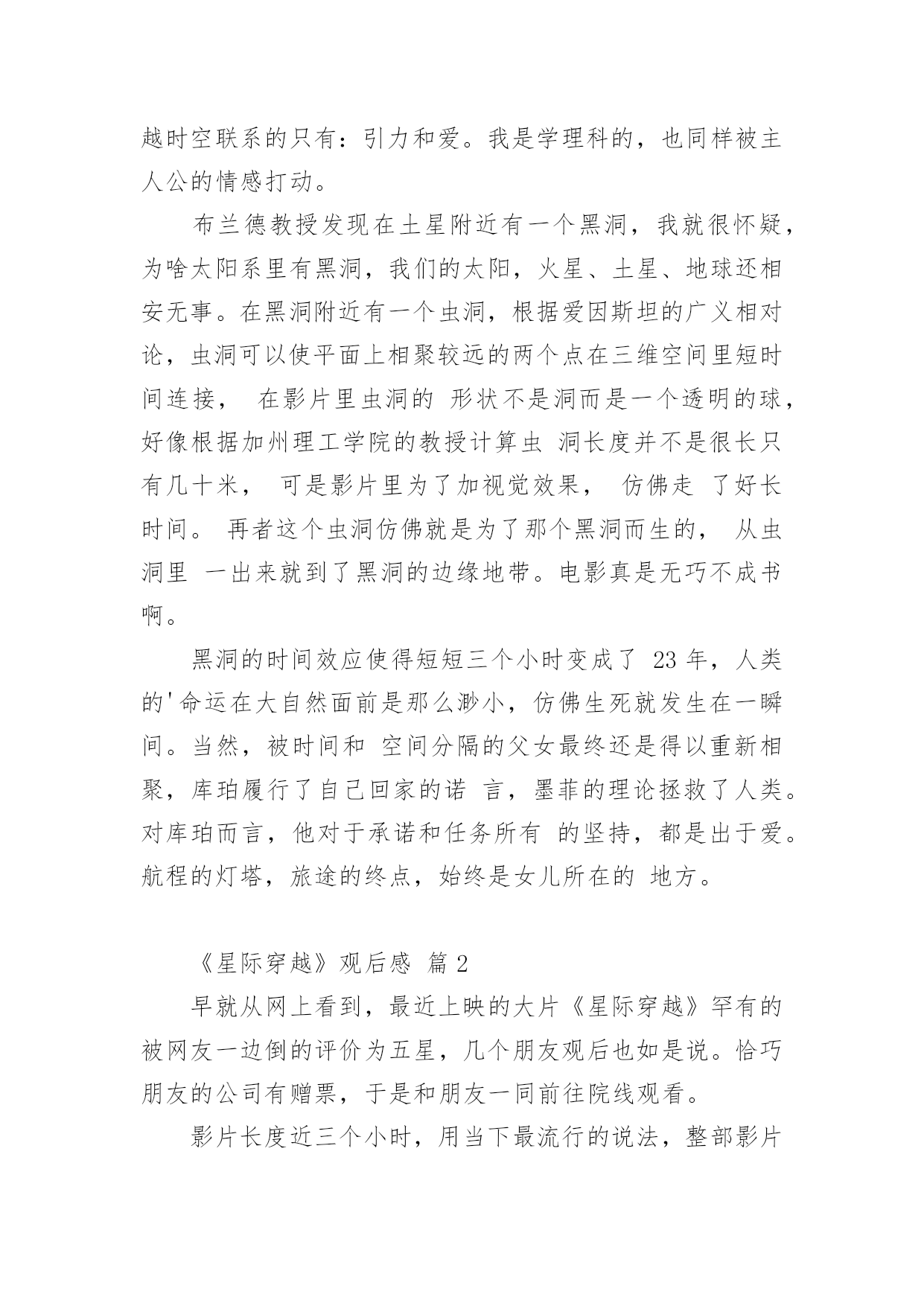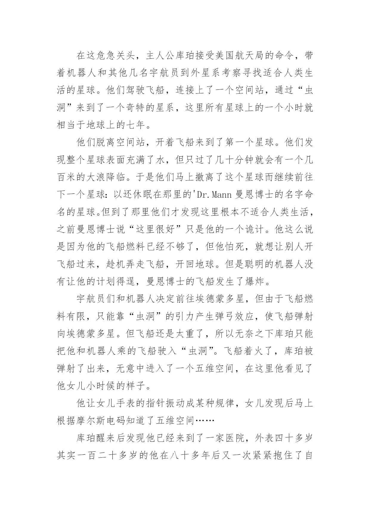 《星际穿越》观后感《星际穿越》观后感14篇当品味完一部影视作品后,这次观看让你有什么领悟呢?这时候,最关键的观后感怎么能落下!可是观后感怎么写才合适呢?下面是小编帮大家整理的《星际穿越》观后感,仅供参考,希望能够帮助到大家。《星际穿越》观后感篇1“我们都身在阴沟里,但仍有人仰望星空。”科幻电影《星际穿越》里出现好几次王尔德的这句诗,这句诗是对这部电影的最佳定义。导演克里斯托弗·诺兰运用自己的艺术手法和智慧把我们引入了一个令人陶醉痴迷的星际探秘穿越之旅。说本片是科幻其实亲情篇也无不可,因为电影里处处洋溢着主角库珀和他女儿墨菲之间的父女亲情。故事发生在未来世界,地球的环境日益恶略,沙尘暴,还有农作物的枯死病,使得人类连温饱都成问题,更严重的是没有如果绿色植物都灭绝了,就不会再光合作用,就没有氧气,人类会灭绝,那个专家教授对库珀说:到了你的女儿这一代,人类就会灭绝。作为父亲,他离开自己的孩子去拯救地球,他说他想的不仅是自己的孩子,还有更多其他家庭的孩子。在结尾处,电影里让库珀在超立方体的五维空间里和墨菲联系,能够穿越时空联系的只有:引力和爱。我是学理科的,也同样被主人公的情感打动。布兰德教授发现在土星附近有一个黑洞,我就很怀疑,为啥太阳系里有黑洞,我们的太阳,火星、土星、地球还相安无事。在黑洞附近有一个虫洞,根据爱因斯坦的广义相对论,虫洞可以使平面上相聚较远的两个点在三维空间里短时间连接,在影片里虫洞的形状不是洞而是一个透明的球,好像根据加州理工学院的教授计算虫洞长度并不是很长只有几十米,可是影片里为了加视觉效果,仿佛走了好长时间。再者这个虫洞仿佛就是为了那个黑洞而生的,从虫洞里一出来就到了黑洞的边缘地带。电影真是无巧不成书啊。黑洞的时间效应使得短短三个小时变成了23年,人类的'命运在大自然面前是那么渺小,仿佛生死就发生在一瞬间。当然,被时间和空间分隔的父女最终还是得以重新相聚,库珀履行了自己回家的诺言,墨菲的理论拯救了人类。对库珀而言,他对于承诺和任务所有的坚持,都是出于爱。航程的灯塔,旅途的终点,始终是女儿所在的地方。《星际穿越》观后感篇2早就从网上看到,最近上映的大片《星际穿越》罕有的被网友一边倒的评价为五星,几个朋友观后也如是说。恰巧朋友的公司有赠票,于是和朋友一同前往院线观看。影片长度近三个小时,用当下最流行的说法,整部影片全场几无尿点,情节紧凑,剧情感人,画面唯美,特效一流。唯一让人感到不适的就是剧中高深莫测的科学术语及专业理论,幸好早有准备,从网上已了解了一些相关的基本常识和名词解释。其实,这部片子走的路线依旧是美国式的个人英雄主义老套路。虽然如此,我们不得不佩服好莱坞在影片制作方面,态度的严谨和对科学的尊重。据说,这部片子的制片人之一就是太空理论及相对论研究领域的专家,这也难怪影片中会出现如此之多的专业对白。看完这部影片,给我最大的感受倒不是恶补了很多科学知识,让我脑洞大开,而是这部影片所表达的另一层更深层次的寓意,那就是亲情与时间。在我们还没有完全了解宇宙的时候,我们所能知晓的,至少在现有认知的情况下,人,是唯一具有思想和感情的生物体。而在我们生活的三维空间里,时间只是我们计量人生的虚拟工具而已。但在这部影片中,在我们未知的世界中,时间在五维空间中,已变成了实实在在的物体,人们可以在五维空间中,翻看过去,阅览现在,预知未来。可是,无论是三维、四维,还是五维,时间无论是虚拟的还是实体的.,有一点是无法改变的,那就是:你可以在不同的空间,将时间放长或者缩短,但不可逆转;你可以回到过去或者走进未来,但发生的和即将发生的,你不可改变。而贯穿整部影片的另一条主线就是亲情。在这个世界上,友情和感情其实都是短暂的,唯独亲情才是无私的长久的。这部影片也很好的诠释了这样一个简单明晰的道理。无论是已知的还是未知的,人类的亲情已超越了所谓虫洞、黑洞的力量,更超越了时间的概念,它才是整个宇宙最为强大的,所以在影片的最后,主人公才最终意识到,不是靠外界的力量才能挽救人类,而靠的是自己,靠的是永不放弃的亲情。一部好的影片,演员的演技、制作的精良、情节的跌宕、特技的炫耀,那只是硬件,而要表达的人性的光辉、正能量的传递才是影片的精髓所在。《星际穿越》很好的将两者融为一体,是一部值得一看的好影片!《星际穿越》观后感篇3《星际穿越》是一部让人震撼的好片,这部片子确实考验脑力,很多的专业术语大烧脑细胞。好在,无论关于宇宙的知识多么复杂难懂,人类的情感却总是简单。这部片子,仍旧能读出爱、希望和信任。“爱是一种力量,让我们超越时空的纬度感知它的存在。”影片中,库柏在太空中几次观看孩子发来的视频,我都跟着热泪盈眶。特别是当时间变慢,他们从巨浪中逃生归来时,地球上已经过去了23年四个月零八天,库柏一一翻看之前的视频记录,儿子毕业,结婚,生子,遭遇亲人的死亡