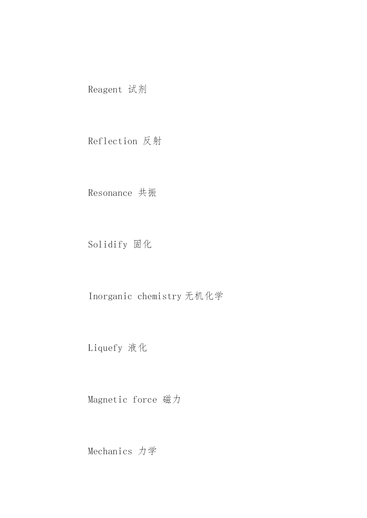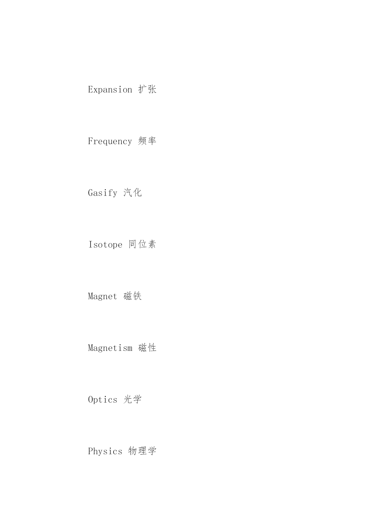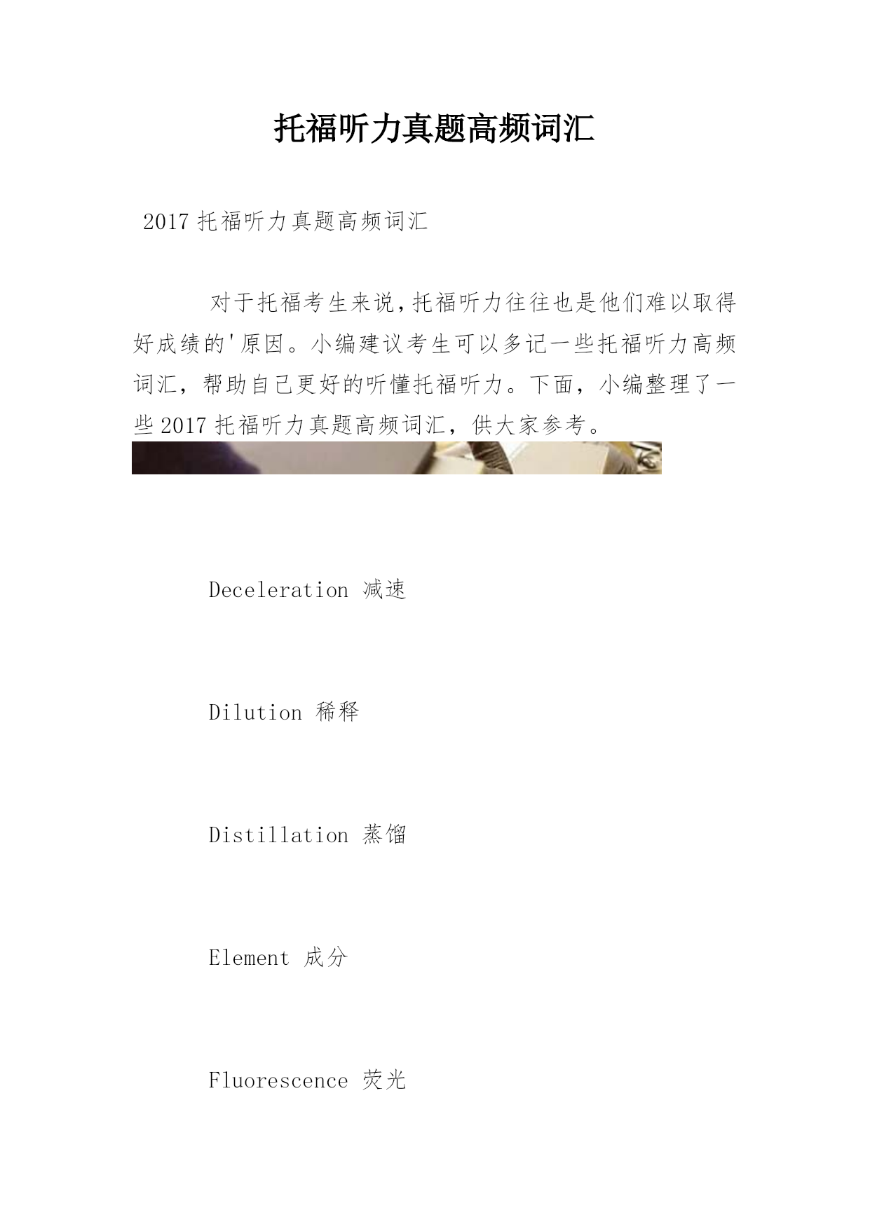 托福听力真题高频词汇2017托福听力真题高频词汇对于托福考生来说,托福听力往往也是他们难以取得好成绩的'原因。小编建议考生可以多记一些托福听力高频词汇,帮助自己更好的听懂托福听力。下面,小编整理了一些2017托福听力真题高频词汇,供大家参考。Deceleration减速Dilution稀释Distillation蒸馏Element成分Fluorescence荧光Vaporize蒸发Voltage电压Ultrasonic超声Uniformmotion统一运动Volt伏特Watt瓦特Accelerationo