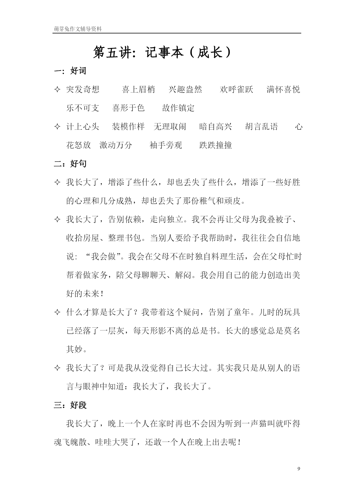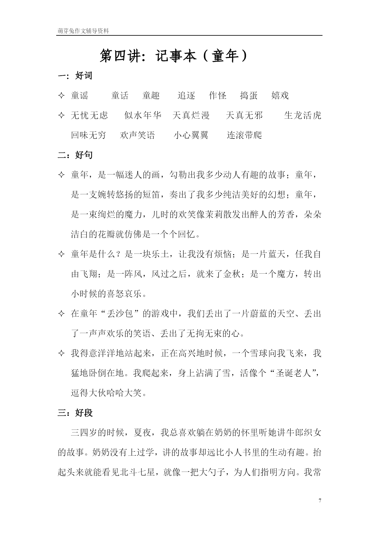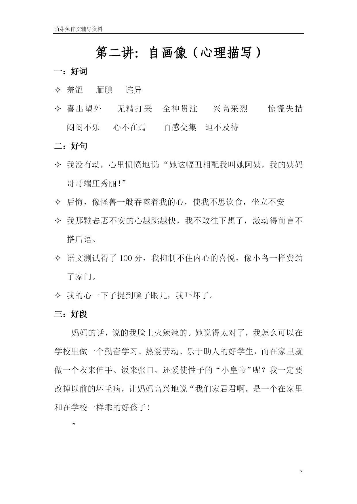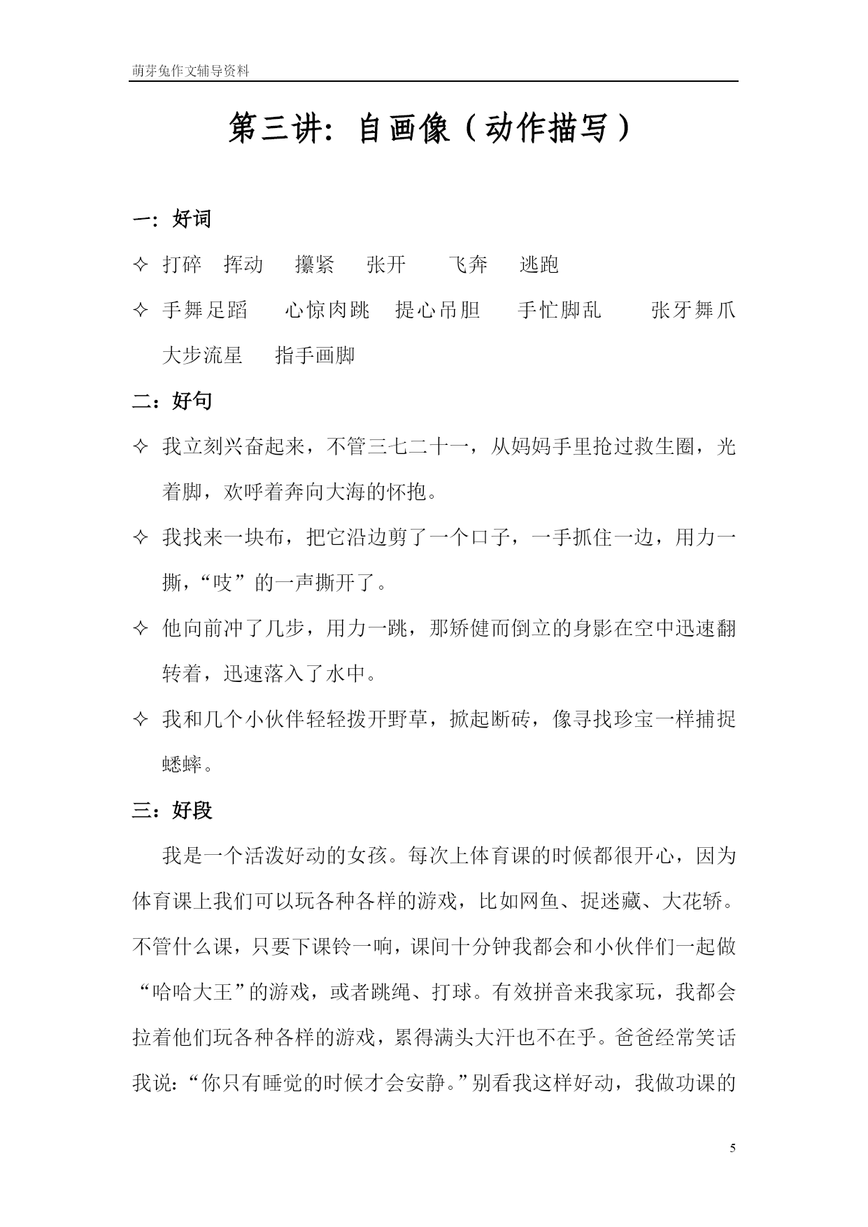 萌芽兔作文辅导资料PAGEPAGE24第一讲:自画像(外貌描写)一:好词平头方脸鸭蛋脸瓜子脸水汪汪圆溜溜虎头虎脑面红耳赤浓眉大眼眉清目秀眉飞色舞大步流星手舞足蹈二:好句我有一张稚气的瓜子脸,平坦的前额,红润的双颊,黑黑的眉毛,你瞧我像不像童话里人见人爱的小红帽?两道弯弯的眉毛下面有一双又黑又亮、又大又圆的眼睛,看起来就像两颗黑珍珠。我长着一双乌黑的大眼睛,总是一眨一眨的。眼睛下面长着非常端正的鼻子,还有一张说话漏风的小嘴。我有一双炯炯有神的大眼睛和一对厚厚的耳垂,别人都说我长大以后有福气。我有一头乌黑发亮的头发和一对浓浓的眉毛,笑起来就眯成了一条线。三:好开头开门见山:我的名字叫文怡,是什么意思呢?大概是爸爸妈妈希望我成为一个文静怡雅的女孩吧!描写开头:有这样一个女孩,她长着一双大大的眼睛,留着一头短短的头发,看起来像一个假小子。但其实她是一个非常脆弱的小女孩,怕受批评,爱哭鼻子——这个女孩就是我。设问句开头;看!镜子里那戴眼睛的小伙子是谁呢?那是我。下课了那个在操场上疯跑的傻小子是谁呀?那就是我。四:好结尾问句结尾:我就是这样一个活泼可爱的小女孩,你愿意和我交朋友吗?引用结尾:俗话说:“山难搬,性难移”,“世上没有两片相同的树叶”。我就是我,世上独一无二的我。总结全文:看!这就是我----留着一头短发,戴着一副眼镜,嘴角总是挂着顽皮的笑。对,这就是我,淘气的我,活泼的我,快乐的我,独一无二的我!_________________________________________________________________________________________________________________________________________________________________________________________________________________________________________________________________________________________________________________________________________________________老师评语:___________________________________________________________________成绩优良中差第二讲:自画像(心理描写)一:好词羞涩腼腆诧异喜出望外无精打采全神贯注兴高采烈惊慌失措闷闷不乐心不在焉百感交集迫不及待二:好句我没有动,心里愤愤地说:“她这幅丑相配我叫她阿姨,我的姨妈哥哥端庄秀丽!”后悔,像怪兽一般吞噬着我的心,使我不思饮食,坐立不安我那颗忐忑不安的心越跳越快,我不敢往下想了,激动得前言不搭后语。语文测试得了100分,我抑制不住内心的喜悦,像小鸟一样费劲了家门。我的心一下子提到嗓子眼儿,我吓坏了。三:好段妈妈的话,说的我脸上火辣辣的。她说得太对了,我怎么可以在学校里做一个勤奋学习、热爱劳动、乐于助人的好学生,而在家里就做一个衣来伸手、饭来张口、还爱使性子的“小皇帝”呢?我一定要改掉以前的坏毛病,让妈妈高兴地说“我们家君君啊,是一个在家里和在学校一样乖的好孩子!”___________________________________________________________________________________________________________________________________________________________________________________________________________________________________________________________________________________________________________________________________________________________________________________________________________________________________________________________________________________________________________________________________________________________________