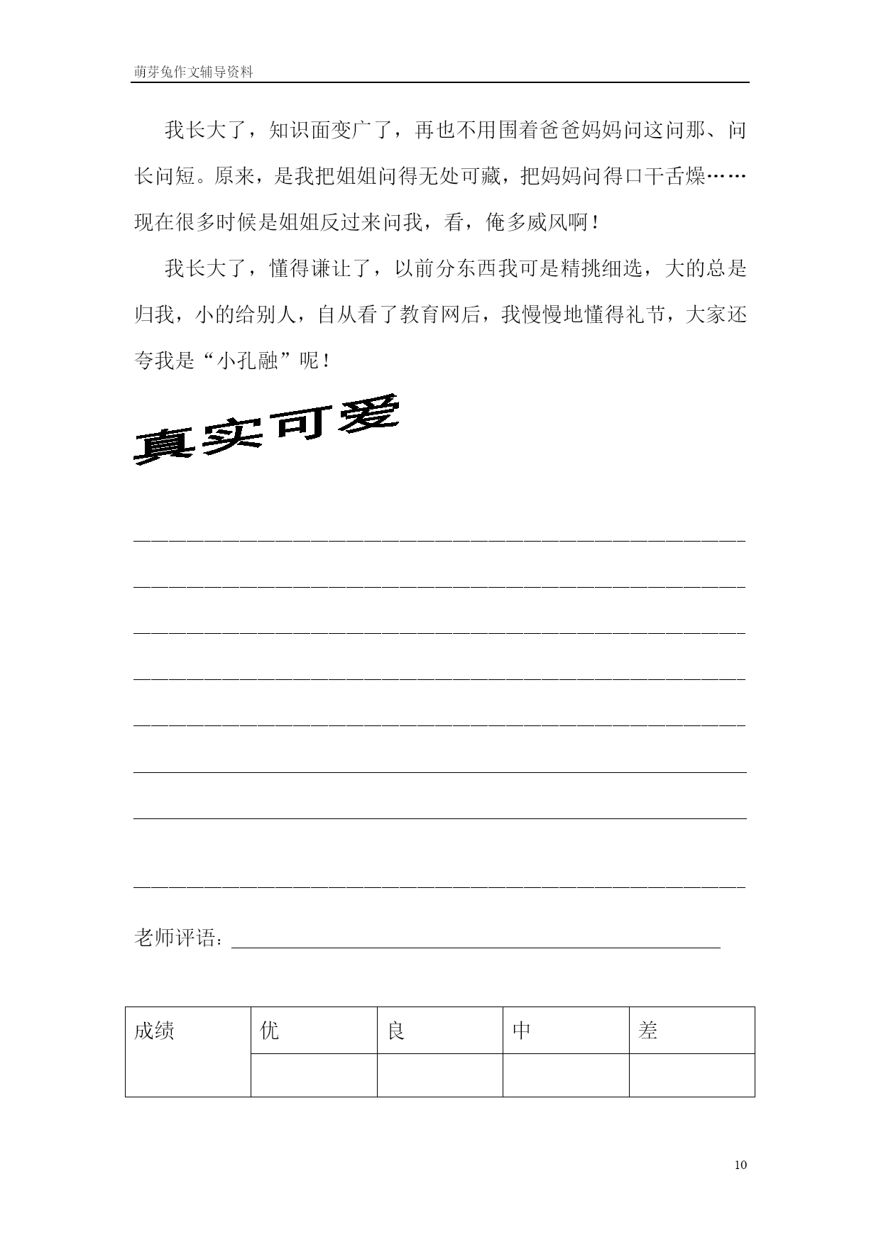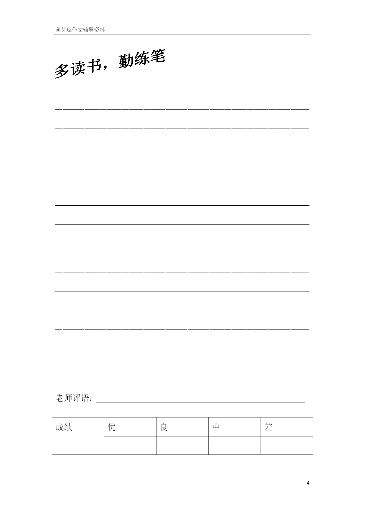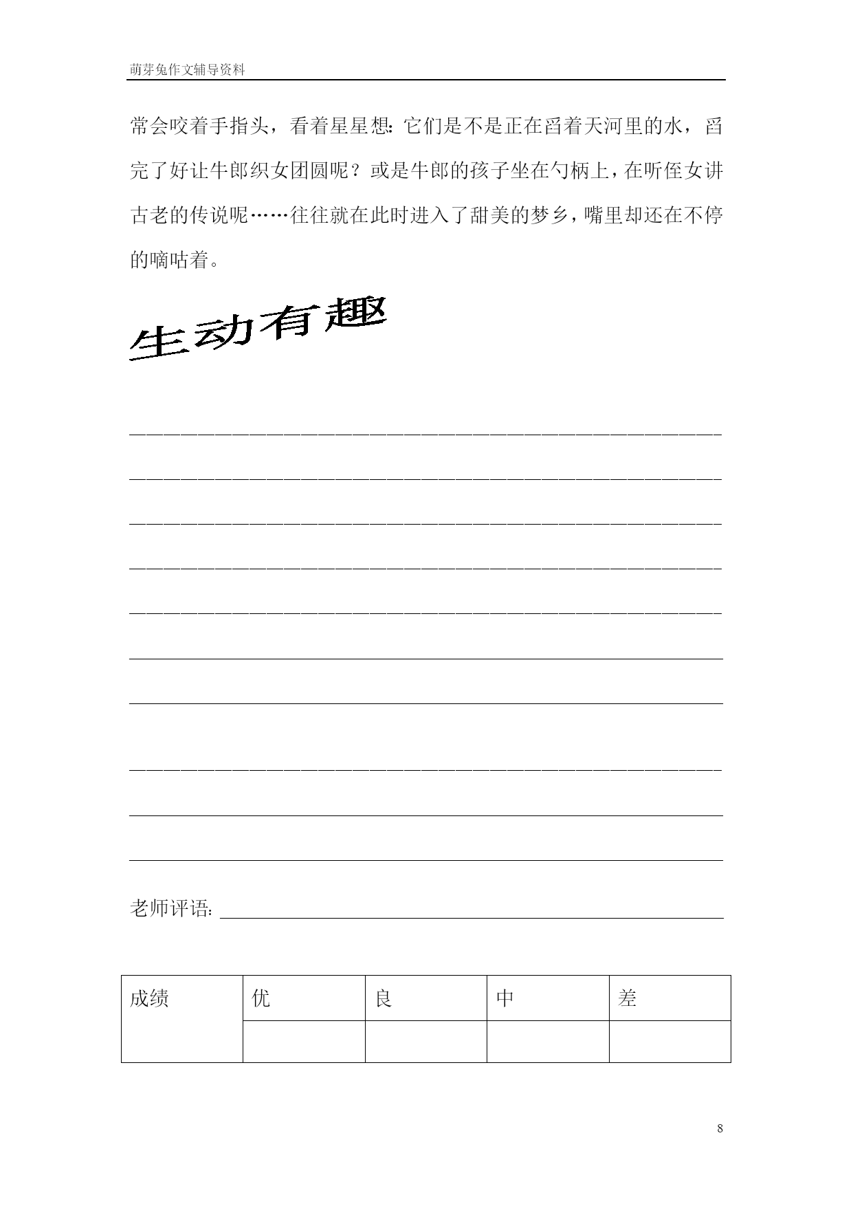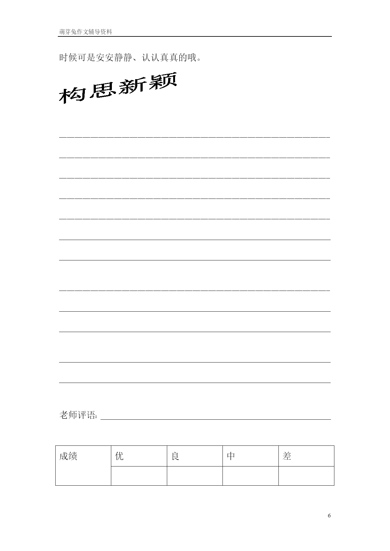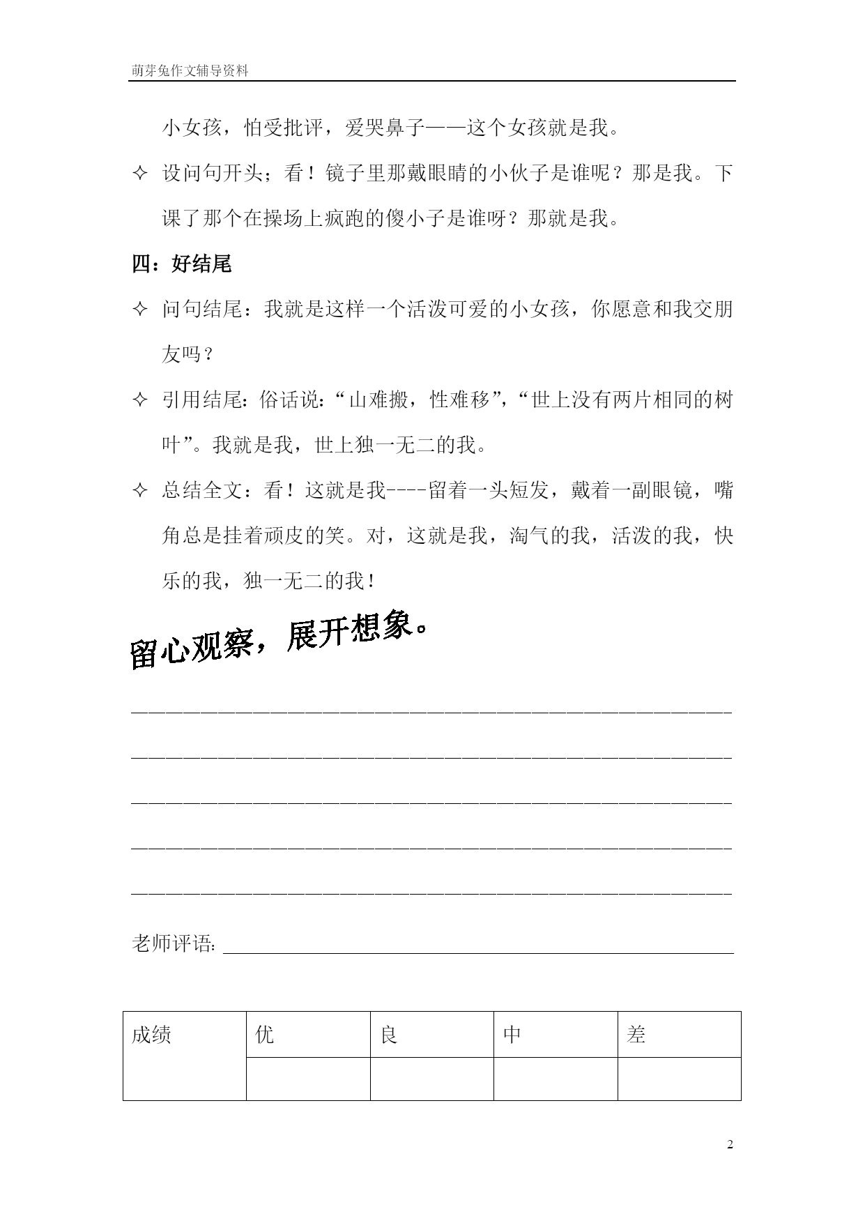 萌芽兔作文辅导资料PAGEPAGE24第一讲:自画像(外貌描写)一:好词平头方脸鸭蛋脸瓜子脸水汪汪圆溜溜虎头虎脑面红耳赤浓眉大眼眉清目秀眉飞色舞大步流星手舞足蹈二:好句我有一张稚气的瓜子脸,平坦的前额,红润的双颊,黑黑的眉毛,你瞧我像不像童话里人见人爱的小红帽?两道弯弯的眉毛下面有一双又黑又亮、又大又圆的眼睛,看起来就像两颗黑珍珠。我长着一双乌黑的大眼睛,总是一眨一眨的。眼睛下面长着非常端正的鼻子,还有一张说话漏风的小嘴。我有一双炯炯有神的大眼睛和一对厚厚的耳垂,别人都说我长大以后有福气。我有一头乌黑发亮的头发和一对浓浓的眉毛,笑起来就眯成了一条线。三:好开头开门见山:我的名字叫文怡,是什么意思呢?大概是爸爸妈妈希望我成为一个文静怡雅的女孩吧!描写开头:有这样一个女孩,她长着一双大大的眼睛,留着一头短短的头发,看起来像一个假小子。但其实她是一个非常脆弱的小女孩,怕受批评,爱哭鼻子——这个女孩就是我。设问句开头;看!镜子里那戴眼睛的小伙子是谁呢?那是我。下课了那个在操场上疯跑的傻小子是谁呀?那就是我。四:好结尾问句结尾:我就是这样一个活泼可爱的小女孩,你愿意和我交朋友吗?引用结尾:俗话说:“山难搬,性难移”,“世上没有两片相同的树叶”。我就是我,世上独一无二的我。总结全文:看!这就是我----留着一头短发,戴着一副眼镜,嘴角总是挂着顽皮的笑。对,这就是我,淘气的我,活泼的我,快乐的我,独一无二的我!_________________________________________________________________________________________________________________________________________________________________________________________________________________________________________________________________________________________________________________________________________________________老师评语:___________________________________________________________________成绩优良中差第二讲:自画像(心理描写)一:好词羞涩腼腆诧异喜出望外无精打采全神贯注兴高采烈惊慌失措闷闷不乐心不在焉百感交集迫不及待二:好句我没有动,心里愤愤地说:“她这幅丑相配我叫她阿姨,我的姨妈哥哥端庄秀丽!”后悔,像怪兽一般吞噬着我的心,使我不思饮食,坐立不安我那颗忐忑不安的心越跳越快,我不敢往下想了,激动得前言不搭后语。语文测试得了100分,我抑制不住内心的喜悦,像小鸟一样费劲了家门。我的心一下子提到嗓子眼儿,我吓坏了。三:好段妈妈的话,说的我脸上火辣辣的。她说得太对了,我怎么可以在学校里做一个勤奋学习、热爱劳动、乐于助人的好学生,而在家里就做一个衣来伸手、饭来张口、还爱使性子的“小皇帝”呢?我一定要改掉以前的坏毛病,让妈妈高兴地说“我们家君君啊,是一个在家里和在学校一样乖的好孩子!”___________________________________________________________________________________________________________________________________________________________________________________________________________________________________________________________________________________________________________________________________________________________________________________________________________________________________________________________________________________________________________________________________________________________________