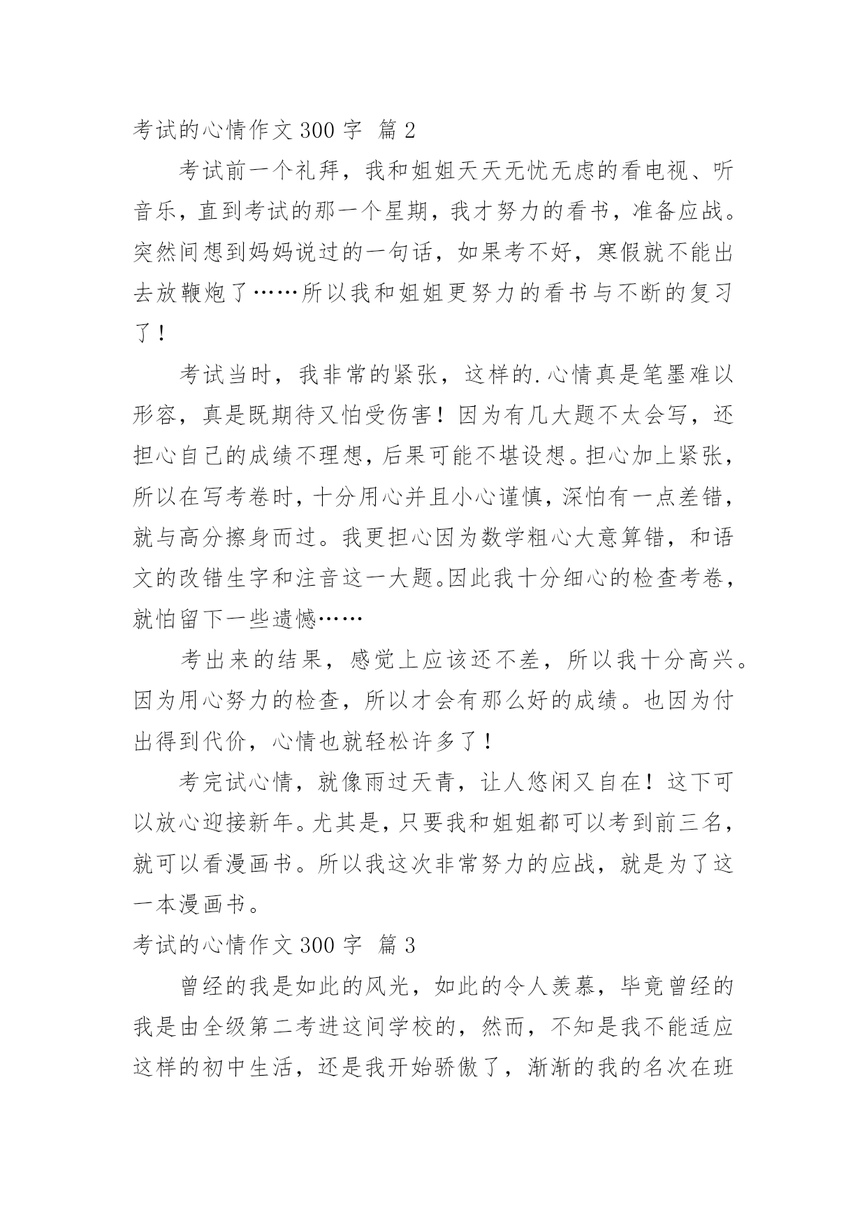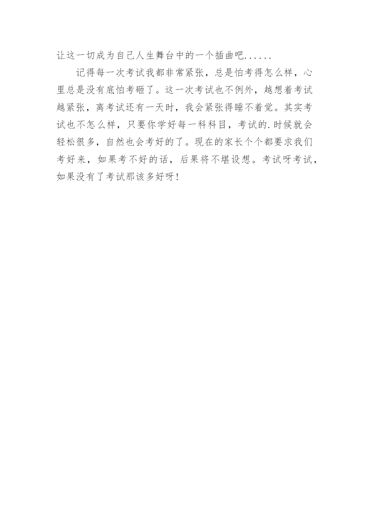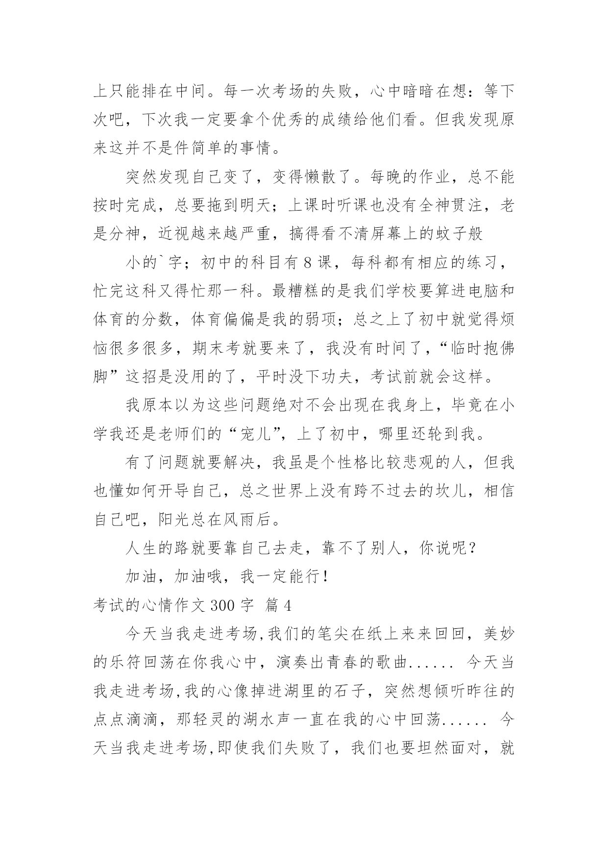 考试的心情作文300字有关考试的心情作文300字4篇在平凡的学习、工作、生活中,大家都尝试过写作文吧,作文根据写作时限的不同可以分为限时作文和非限时作文。相信写作文是一个让许多人都头痛的问题,下面是小编帮大家整理的考试的心情作文300字4篇,欢迎大家分享。考试的心情作文300字篇1月考过后,有的人满意,因为他们考的成绩好;有的人失望,因为他们考的成绩坏。现在,我们就一起来看看我的“考试故事”吧!考试前夕,我急得像热锅上的蚂蚁,赶紧K书,连吃饭、睡觉、洗澡,都想着月考的题目,“平时不烧香,临时抱佛脚”这句话,刚好用在我的身上。考试时,我紧张到桌子在抖,抖到字的形状都变得歪七扭八了!不过,考完了第一节我就轻松多了!考完试后,发考卷当时,我有点害怕,怕我考不好,得不到妈妈的.赞美,因为我长期以来都保持第一名。等到公布考试成绩时,我虽然得到全学期成绩的第一名,但是期末成绩只有得到第三名,真是可惜啊!经过这件事,让我了解考试要获得好成绩的办法只、保持平常心态,才是最好的考试秘诀。不论如何,总算是考完了,终于可以好好喘口气,迎接寒假的来临。期盼来年新的学期,能调适好新的态度,面对下一次的挑战。考试的心情作文300字篇2考试前一个礼拜,我和姐姐天天无忧无虑的看电视、听音乐,直到考试的那一个星期,我才努力的看书,准备应战。突然间想到妈妈说过的一句话,如果考不好,寒假就不能出去放鞭炮了……所以我和姐姐更努力的看书与不断的复习了!考试当时,我非常的紧张,这样的.心情真是笔墨难以形容,真是既期待又怕受伤害!因为有几大题不太会写,还担心自己的成绩不理想,后果可能不堪设想。担心加上紧张,所以在写考卷时,十分用心并且小心谨慎,深怕有一点差错,就与高分擦身而过。我更担心因为数学粗心大意算错,和语文的改错生字和注音这一大题。因此我十分细心的检查考卷,就怕留下一些遗憾……考出来的结果,感觉上应该还不差,所以我十分高兴。因为用心努力的检查,所以才会有那么好的成绩。也因为付出得到代价,心情也就轻松许多了!考完试心情,就像雨过天青,让人悠闲又自在!这下可以放心迎接新年。尤其是,只要我和姐姐都可以考到前三名,就可以看漫画书。所以我这次非常努力的应战,就是为了这一本漫画书。考试的心情作文300字篇3曾经的我是如此的风光,如此的令人羡慕,毕竟曾经的我是由全级第二考进这间学校的,然而,不知是我不能适应这样的初中生活,还是我开始骄傲了,渐渐的我的名次在班上只能排在中间。每一次考场的失败,心中暗暗在想:等下次吧,下次我一定要拿个优秀的成绩给他们看。但我发现原来这并不是件简单的事情。突然发现自己变了,变得懒散了。每晚的作业,总不能按时完成,总要拖到明天;上课时听课也没有全神贯注,老是分神,近视越来越严重,搞得看不清屏幕上的蚊子般小的`字;初中的科目有8课,每科都有相应的练习,忙完这科又得忙那一科。最糟糕的是我们学校要算进电脑和体育的分数,体育偏偏是我的弱项;总之上了初中就觉得烦恼很多很多,期末考就要来了,我没有时间了,“临时抱佛脚”这招是没用的了,平时没下功夫,考试前就会这样。我原本以为这些问题绝对不会出现在我身上,毕竟在小学我还是老师们的“宠儿”,上了初中,哪里还轮到我。有了问题就要解决,我虽是个性格比较悲观的人,但我也懂如何开导自己,总之世界上没有跨不过去的坎儿,相信自己吧,阳光总在风雨后。人生的路就要靠自己去走,靠不了别人,你说呢?加油,加油哦,我一定能行!考试的心情作文300字篇4今天当我走进考场,我们的笔尖在纸上来来回回,美妙的乐符回荡在你我心中,演奏出青春的歌曲......今天当我走进考场,我的心像掉进湖里的石子,突然想倾听昨往的点点滴滴,那轻灵的湖水声一直在我的心中回荡......今天当我走进考场,即使我们失败了,我们也要坦然面对,就让这一切成为自己人生舞台中的一个插曲吧......记得每一次考试我都非常紧张,总是怕考得怎么样,心里总是没有底怕考砸了。这一次考试也不例外,越想着考试越紧张,离考试还有一天时,我会紧张得睡不着觉。其实考试也不怎么样,只要你学好每一科科目,考试的.时候就会轻松很多,自然也会考好的了。现在的家长个个都要求我们考好来,如果考不好的话,后果将不堪设想。考试呀考试,如果没有了考试那该多好呀!
