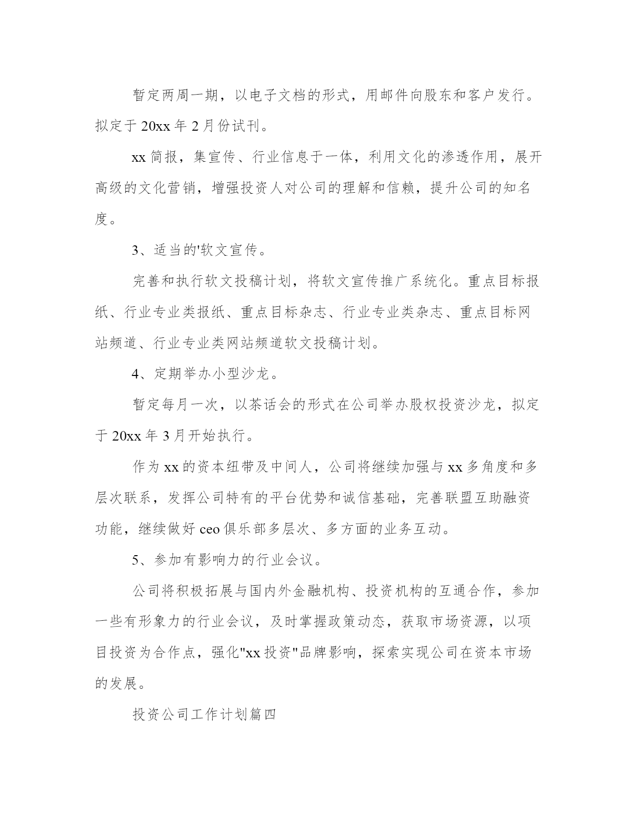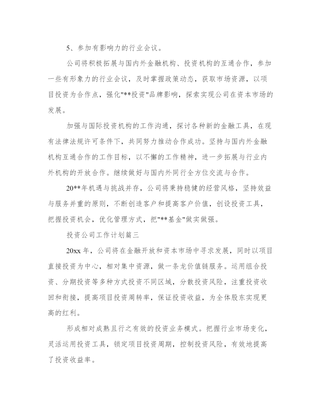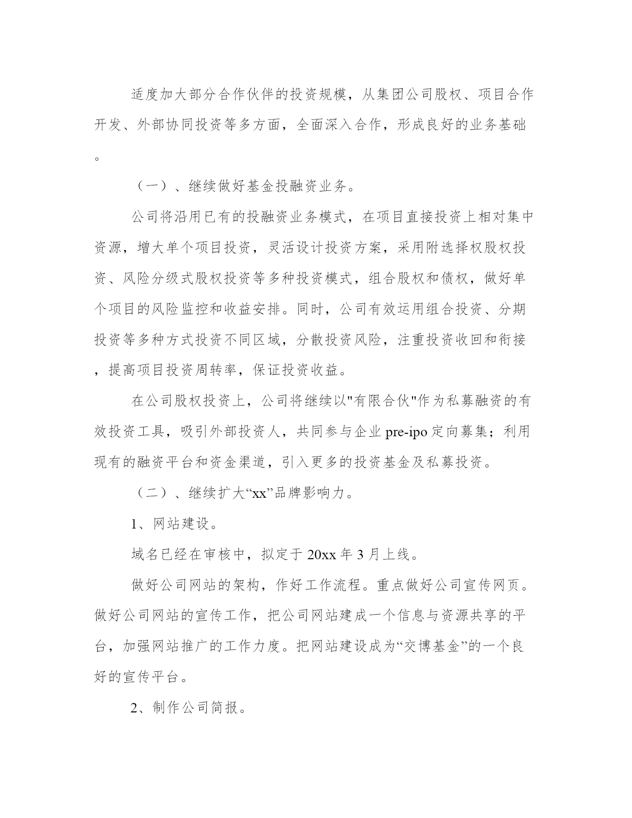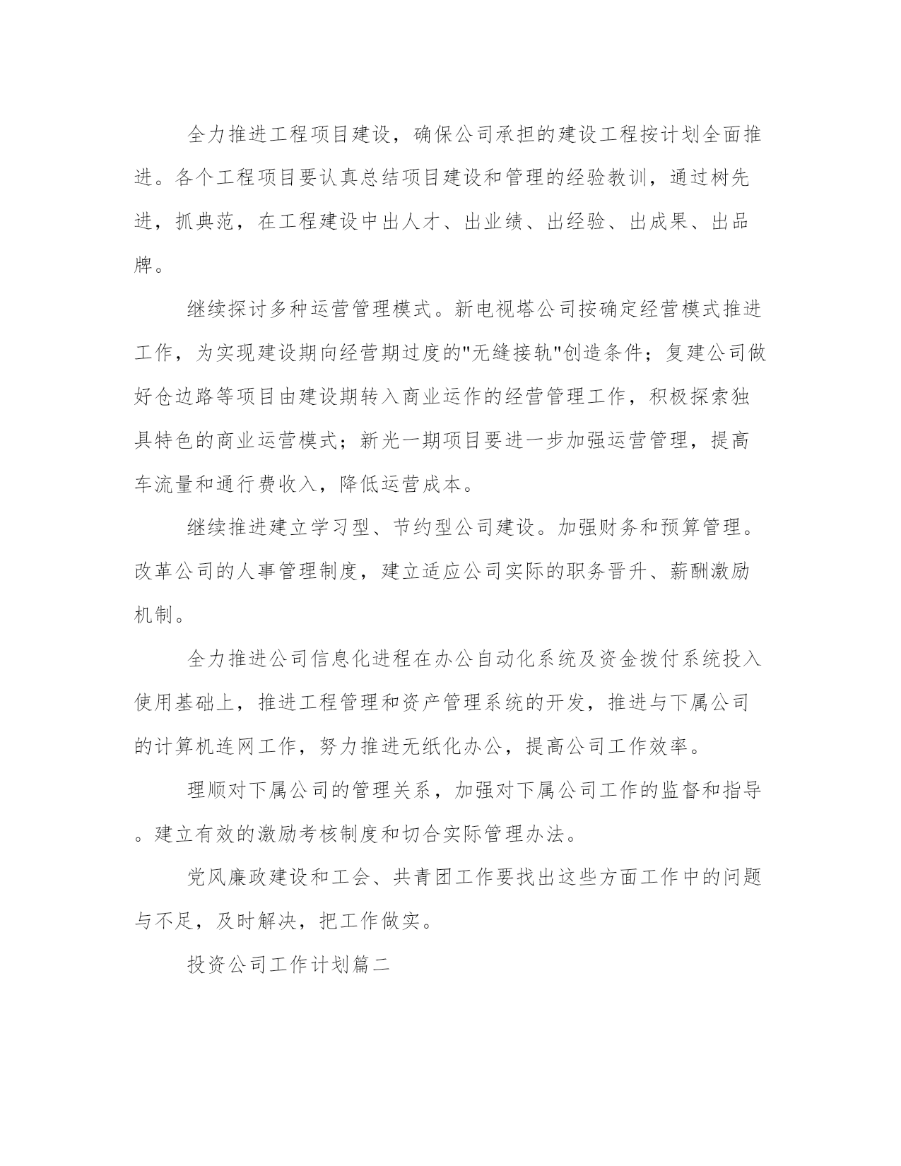 最新投资公司工作计划(大全17篇)计划在我们的生活中扮演着重要的角色,无论是个人生活还是工作领域。计划怎么写才能发挥它最大的作用呢?下面是小编整理的个人今后的计划范文,欢迎阅读分享,希望对大家有所帮助。投资公司工作计划篇一积极配合广州市城市建设投融资体制改革,推进公司融资平台的完善,争取政府提供相适应的资金安排和措施,建立新的还本付息保障机制,培育新的融资能力,多方位、多渠道拓展新的筹融资渠道,推动城建投融资建设的可持续发展。多方位融资,分散风险,解决20xx年项目配套资本金问题,拟发行企业债券28亿元,通过直接融资降低融资成本和政策性风险。把握当前的国家政策走向,积极应对金融形势的变化,继续与各银行建立良好的银企合作关系,按照广州市城建固定资产投资计划的安排,认真做好新增项目的贷款工作及贷款还本付息工作。进一步完善融资和资金拨付的管理,加强资金的计划性和风险性管理,积极将提款、拨款工作做得更细、更好,既保证项目建设资金的及时到位又尽量降低成本。继续推进公司历史遗留问题的解决。从工程结算和形成资产入手,清理好我公司未结算项目,切实解决因工程项目迟迟不结算而导致的超概、利息分摊等历史遣留问题。全力推进工程项目建设,确保公司承担的建设工程按计划全面推进。各个工程项目要认真总结项目建设和管理的经验教训,通过树先进,抓典范,在工程建设中出人才、出业绩、出经验、出成果、出品牌。继续探讨多种运营管理模式。新电视塔公司按确定经营模式推进工作,为实现建设期向经营期过度的"无缝接轨"创造条件;复建公司做好仓边路等项目由建设期转入商业运作的经营管理工作,积极探索独具特色的商业运营模式;新光一期项目要进一步加强运营管理,提高车流量和通行费收入,降低运营成本。继续推进建立学习型、节约型公司建设。加强财务和预算管理。改革公司的人事管理制度,建立适应公司实际的职务晋升、薪酬激励机制。全力推进公司信息化进程在办公自动化系统及资金拨付系统投入使用基础上,推进工程管理和资产管理系统的开发,推进与下属公司的计算机连网工作,努力推进无纸化办公,提高公司工作效率。理顺对下属公司的管理关系,加强对下属公司工作的监督和指导。建立有效的激励考核制度和切合实际管理办法。党风廉政建设和工会、共青团工作要找出这些方面工作中的问题与不足,及时解决,把工作做实。投资公司工作计划篇二20**年,公司将在金融开放和资本市场中寻求发展,同时以项目直接投资为中心,相对集中资源,做一条龙价值链服务。运用组合投资、分期投资等多种方式投资不同区域,分散投资风险,注重投资收回和衔接,提高项目投资周转率,保证投资收益,为全体股东实现更高的红利。形成相对成熟且行之有效的投资业务模式。把握行业市场变化,灵活运用投资工具,锁定项目投资周期,控制投资风险,有效地提高了投资收益率。适度加大部分合作伙伴的投资规模,从集团公司股权、项目合作开发、外部协同投资等多方面,全面深入合作,形成良好的业务基础。公司将沿用已有的投融资业务模式,在项目直接投资上相对集中资源,增大单个项目投资,灵活设计投资方案,采用附选择权股权投资、风险分级式股权投资等多种投资模式,组合股权和债权,做好单个项目的风险监控和收益安排。同时,公司有效运用组合投资、分期投资等多种方式投资不同区域,分散投资风险,注重投资收回和衔接,提高项目投资周转率,保证投资收益。在公司股权投资上,公司将继续以"有限合伙"作为私募融资的有效投资工具,吸引外部投资人,共同参与企业pre-ipo定向募集;利用现有的融资平台和资金渠道,引入更多的投资基金及私募投资。1、网站建设。域名已经在审核中,拟定于20**年3月上线。做好公司网站的架构,作好工作流程。重点做好公司宣传网页。做好公司网站的宣传工作,把公司网站建成一个信息与资源共享的平台,加强网站推广的工作力度。把网站建设成为“交博基金”的一个良好的宣传平台。2、制作公司简报。暂定两周一期,以电子文档的形式,用邮件向股东和客户发行。拟定于20**年2月份试刊。**简报,集宣传、行业信息于一体,利用文化的渗透作用,展开高级的文化营销,增强投资人对公司的理解和信赖,提升公司的知名度。3、适当的软文宣传。完善和执行软文投稿计划,将软文宣传推广系统化。重点目标报纸、行业专业类报纸、重点目标杂志、行业专业类杂志、重点目标网站频道、行业专业类网站频道软文投稿计划。4、定期举办小型沙龙。暂定每月一次,以茶话会的形式在公司举办股权投资沙龙,拟定于20**年3月开始执行。作为**的'资本纽带及中间人,公司将继续加强与**多角度和多层次联系,发挥公司特有的平台优势和诚信基础,完善联盟互助融资功能,继续做好ceo俱乐部多层次、多方面的业务互动。5、参加有影响力的行业会议。公司将积