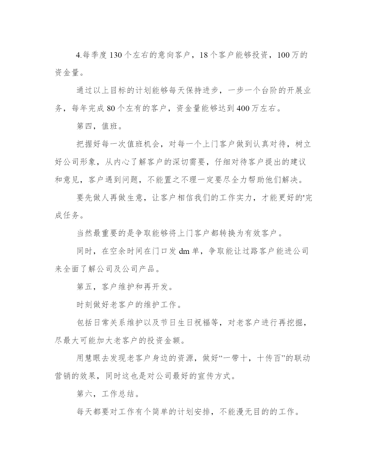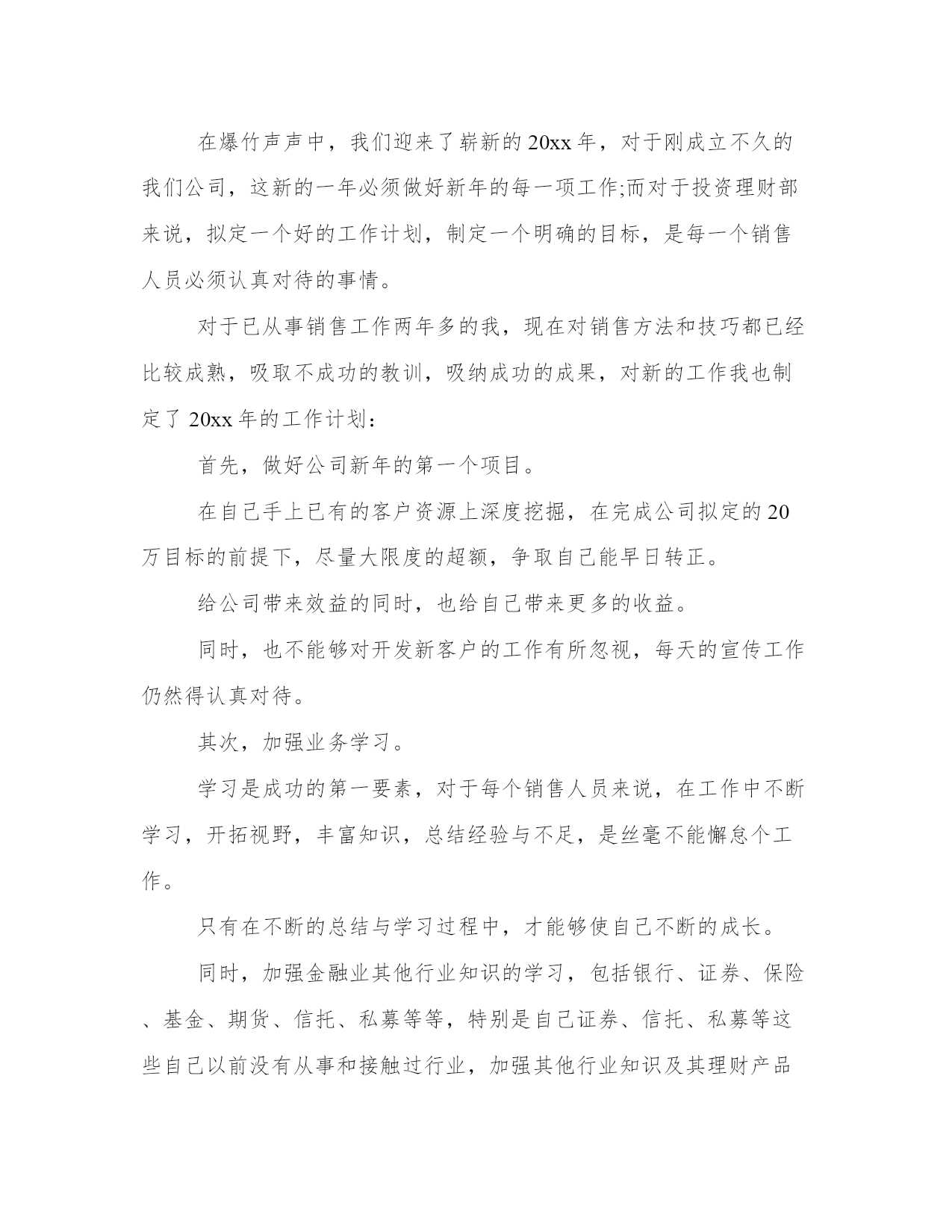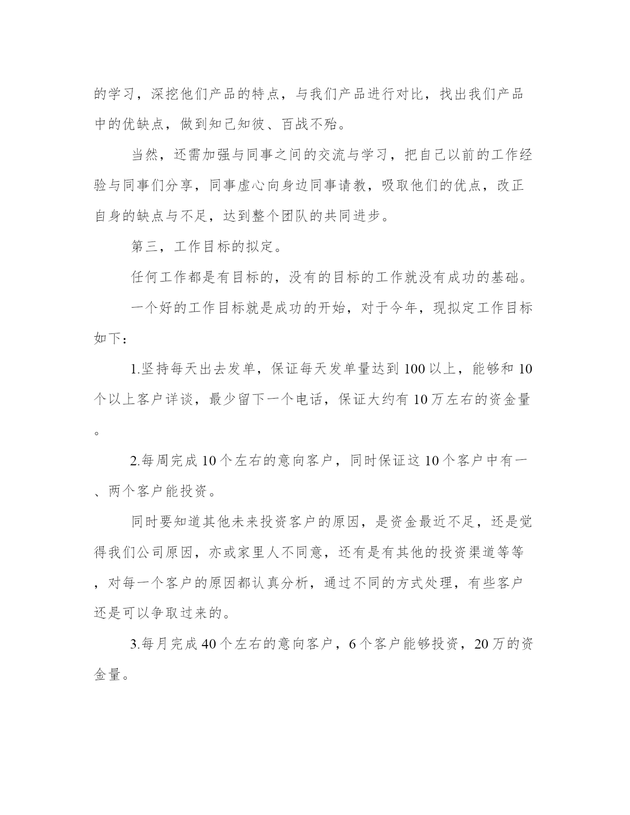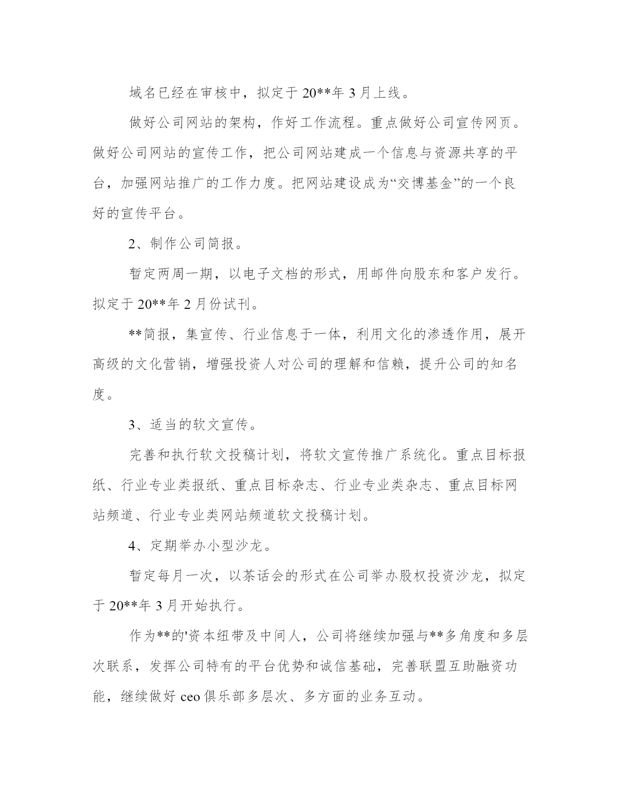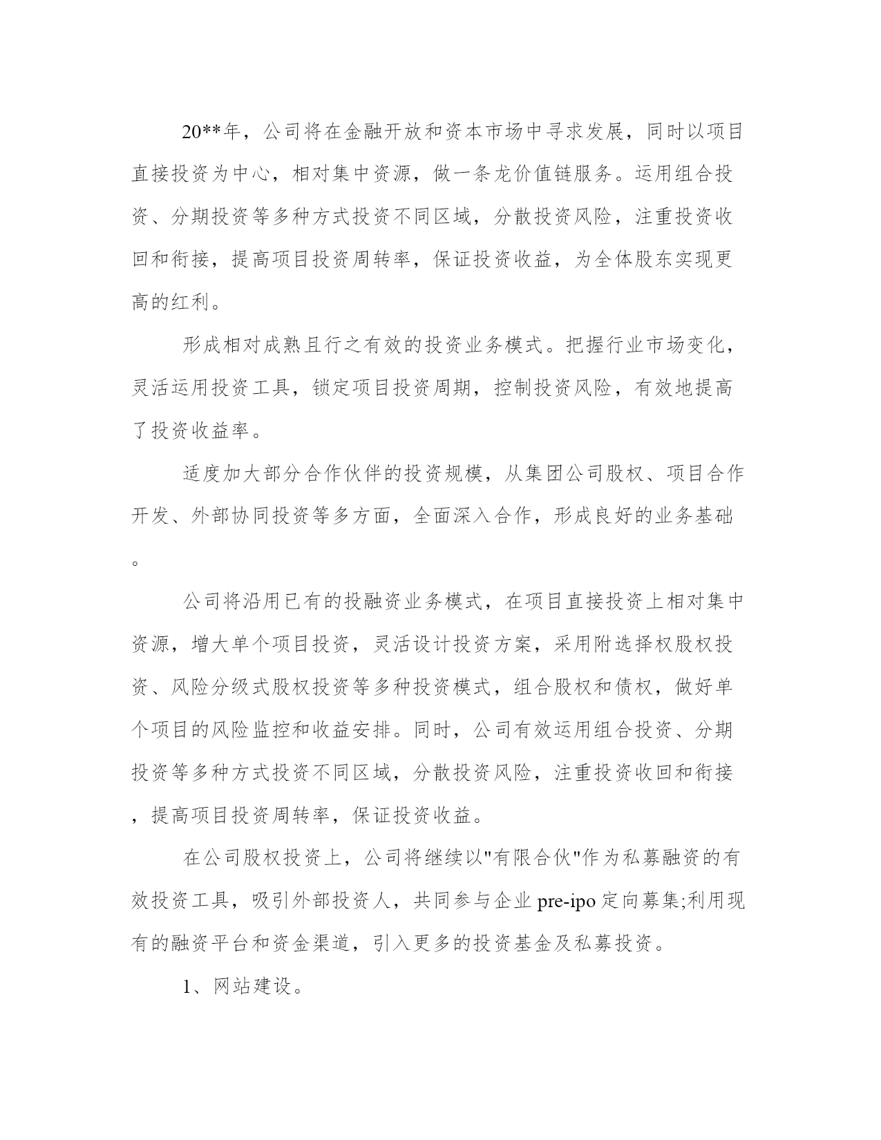 最新投资公司工作计划(大全17篇)计划在我们的生活中扮演着重要的角色,无论是个人生活还是工作领域。计划怎么写才能发挥它最大的作用呢?下面是小编整理的个人今后的计划范文,欢迎阅读分享,希望对大家有所帮助。投资公司工作计划篇一积极配合广州市城市建设投融资体制改革,推进公司融资平台的完善,争取政府提供相适应的资金安排和措施,建立新的还本付息保障机制,培育新的融资能力,多方位、多渠道拓展新的筹融资渠道,推动城建投融资建设的可持续发展。多方位融资,分散风险,解决20xx年项目配套资本金问题,拟发行企业债券28亿元,通过直接融资降低融资成本和政策性风险。把握当前的国家政策走向,积极应对金融形势的变化,继续与各银行建立良好的银企合作关系,按照广州市城建固定资产投资计划的安排,认真做好新增项目的贷款工作及贷款还本付息工作。进一步完善融资和资金拨付的管理,加强资金的计划性和风险性管理,积极将提款、拨款工作做得更细、更好,既保证项目建设资金的及时到位又尽量降低成本。继续推进公司历史遗留问题的解决。从工程结算和形成资产入手,清理好我公司未结算项目,切实解决因工程项目迟迟不结算而导致的超概、利息分摊等历史遣留问题。全力推进工程项目建设,确保公司承担的建设工程按计划全面推进。各个工程项目要认真总结项目建设和管理的经验教训,通过树先进,抓典范,在工程建设中出人才、出业绩、出经验、出成果、出品牌。继续探讨多种运营管理模式。新电视塔公司按确定经营模式推进工作,为实现建设期向经营期过度的"无缝接轨"创造条件;复建公司做好仓边路等项目由建设期转入商业运作的经营管理工作,积极探索独具特色的商业运营模式;新光一期项目要进一步加强运营管理,提高车流量和通行费收入,降低运营成本。继续推进建立学习型、节约型公司建设。加强财务和预算管理。改革公司的人事管理制度,建立适应公司实际的职务晋升、薪酬激励机制。全力推进公司信息化进程在办公自动化系统及资金拨付系统投入使用基础上,推进工程管理和资产管理系统的开发,推进与下属公司的计算机连网工作,努力推进无纸化办公,提高公司工作效率。理顺对下属公司的管理关系,加强对下属公司工作的监督和指导。建立有效的激励考核制度和切合实际管理办法。党风廉政建设和工会、共青团工作要找出这些方面工作中的问题与不足,及时解决,把工作做实。投资公司工作计划篇二20**年,公司将在金融开放和资本市场中寻求发展,同时以项目直接投资为中心,相对集中资源,做一条龙价值链服务。运用组合投资、分期投资等多种方式投资不同区域,分散投资风险,注重投资收回和衔接,提高项目投资周转率,保证投资收益,为全体股东实现更高的红利。形成相对成熟且行之有效的投资业务模式。把握行业市场变化,灵活运用投资工具,锁定项目投资周期,控制投资风险,有效地提高了投资收益率。适度加大部分合作伙伴的投资规模,从集团公司股权、项目合作开发、外部协同投资等多方面,全面深入合作,形成良好的业务基础。公司将沿用已有的投融资业务模式,在项目直接投资上相对集中资源,增大单个项目投资,灵活设计投资方案,采用附选择权股权投资、风险分级式股权投资等多种投资模式,组合股权和债权,做好单个项目的风险监控和收益安排。同时,公司有效运用组合投资、分期投资等多种方式投资不同区域,分散投资风险,注重投资收回和衔接,提高项目投资周转率,保证投资收益。在公司股权投资上,公司将继续以"有限合伙"作为私募融资的有效投资工具,吸引外部投资人,共同参与企业pre-ipo定向募集;利用现有的融资平台和资金渠道,引入更多的投资基金及私募投资。1、网站建设。域名已经在审核中,拟定于20**年3月上线。做好公司网站的架构,作好工作流程。重点做好公司宣传网页。做好公司网站的宣传工作,把公司网站建成一个信息与资源共享的平台,加强网站推广的工作力度。把网站建设成为“交博基金”的一个良好的宣传平台。2、制作公司简报。暂定两周一期,以电子文档的形式,用邮件向股东和客户发行。拟定于20**年2月份试刊。**简报,集宣传、行业信息于一体,利用文化的渗透作用,展开高级的文化营销,增强投资人对公司的理解和信赖,提升公司的知名度。3、适当的软文宣传。完善和执行软文投稿计划,将软文宣传推广系统化。重点目标报纸、行业专业类报纸、重点目标杂志、行业专业类杂志、重点目标网站频道、行业专业类网站频道软文投稿计划。4、定期举办小型沙龙。暂定每月一次,以茶话会的形式在公司举办股权投资沙龙,拟定于20**年3月开始执行。作为**的'资本纽带及中间人,公司将继续加强与**多角度和多层次联系,发挥公司特有的平台优势和诚信基础,完善联盟互助融资功能,继续做好ceo俱乐部多层次、多方面的业务互动。5、参加有影响力的行业会议。公司将积