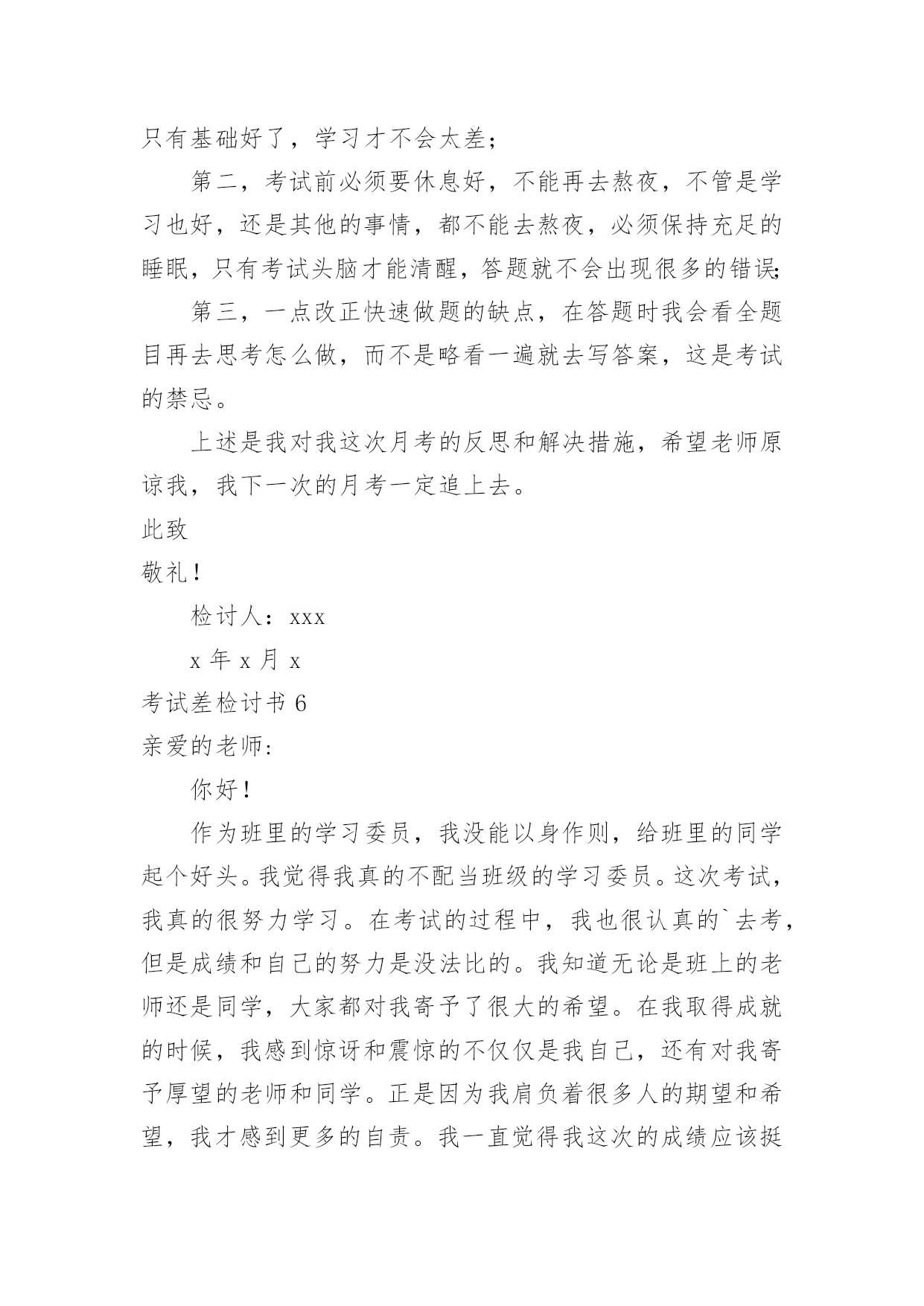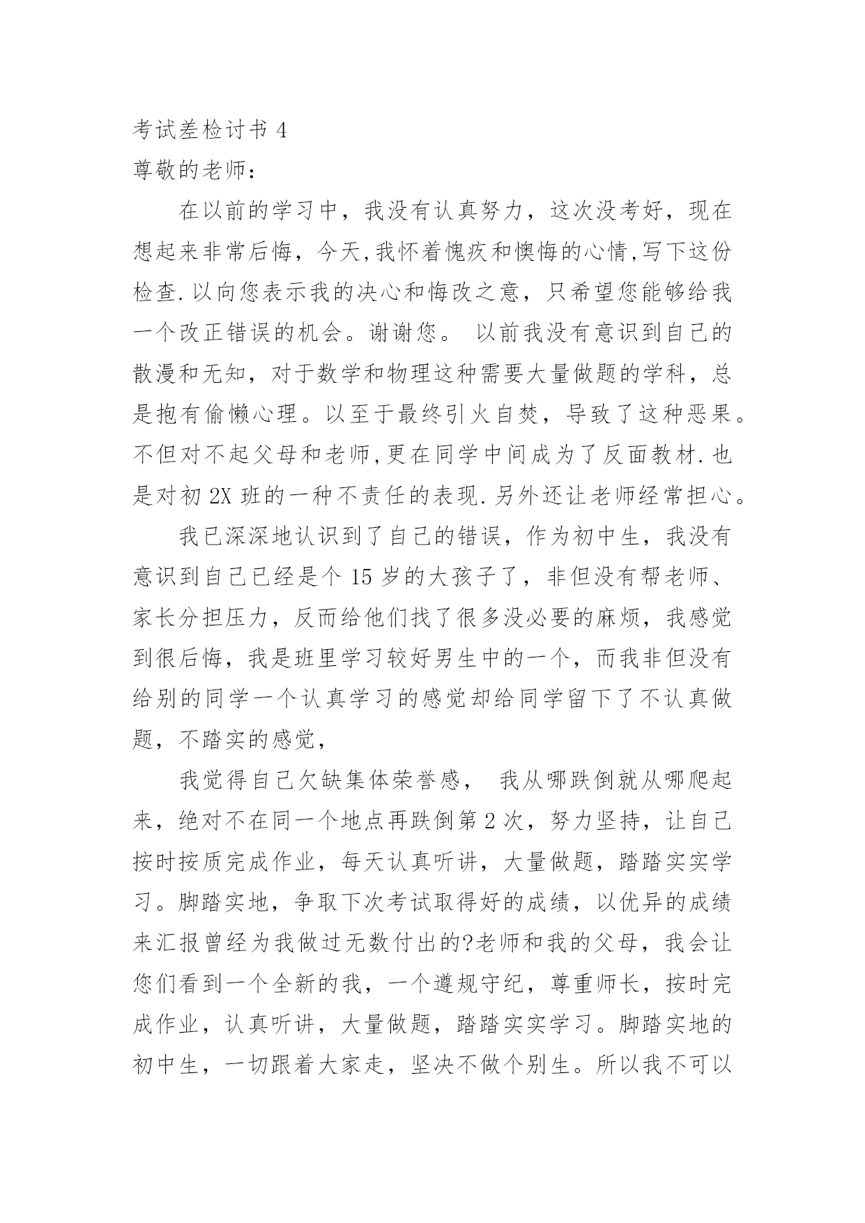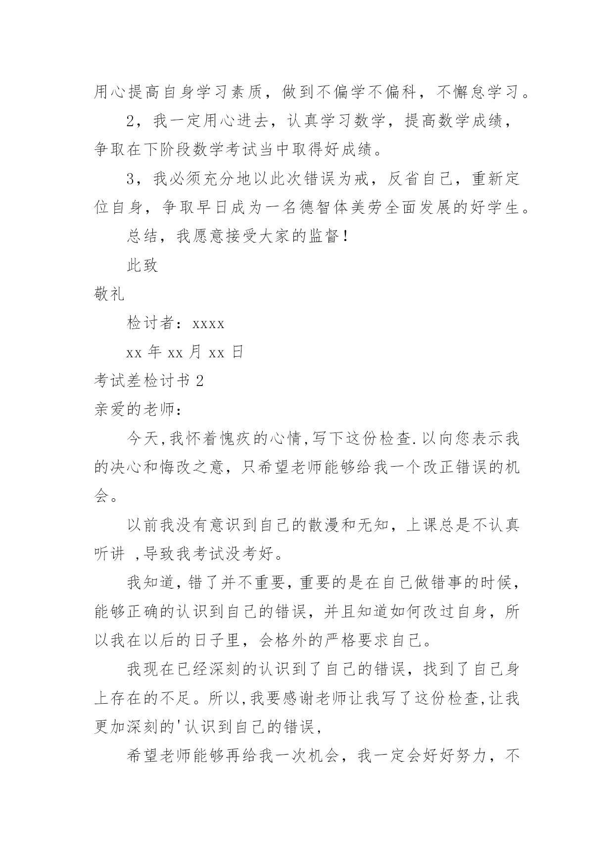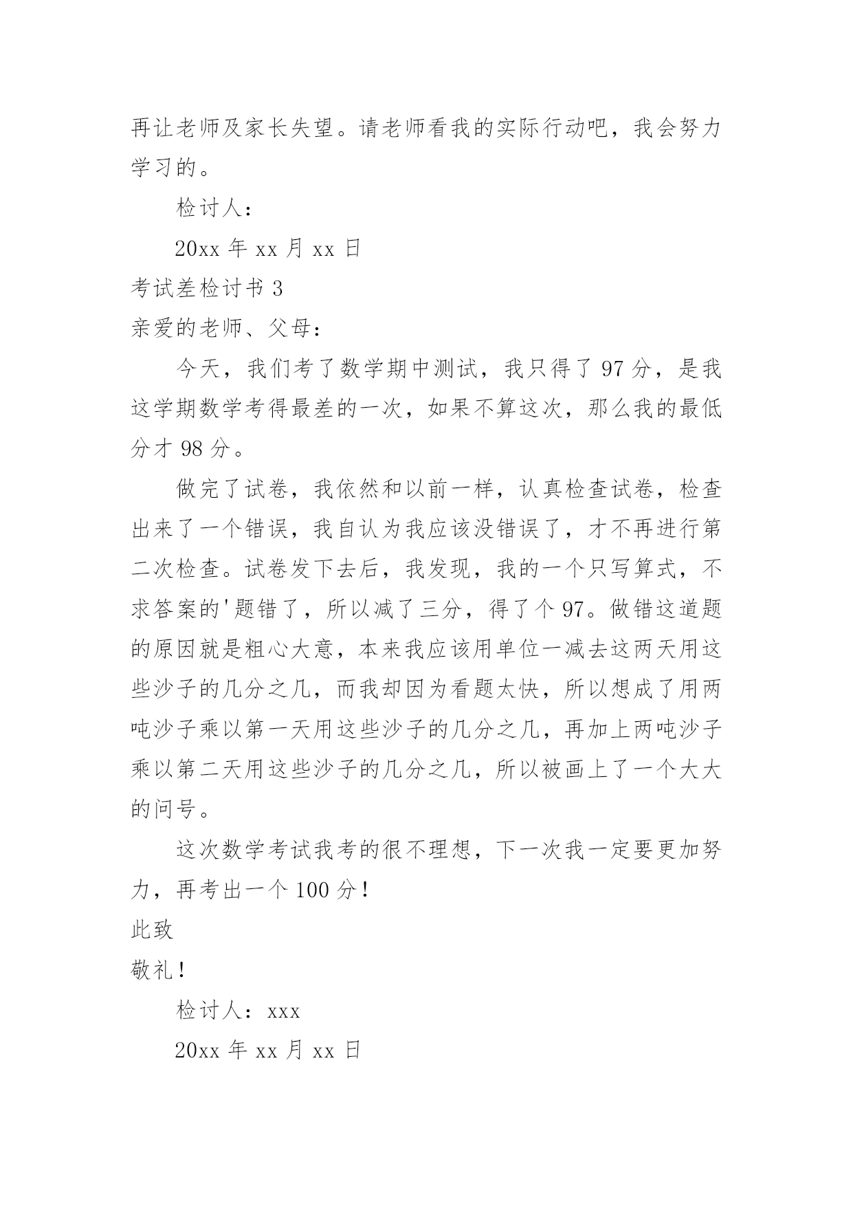 考试差检讨书考试差检讨书15篇在有过错的情况下,为了避免再犯,往往被要求写检讨书来自我检讨,做事不能马虎,写检讨书也应如此。那么问题来了,到底应如何写检讨书呢?下面是小编整理的考试差检讨书,欢迎大家分享。考试差检讨书1尊敬的老师:关于此次数学考试不及格的问题,我在此递交数学考试不及格的检讨书,由此来深刻反省我的错误,向您做出如实保证,并且提出诚恳改正措施,最大程度地弥补错误。回顾错误经过,我在上一阶段数学学习的过程中出现了严重的厌学问题,有一段时间,数学课几乎没有认真地听,导致多门课程的知识点没有掌握。最终导致了此次单元数学考试不及格,得到了全班最低分。面对错误,我感到羞愧万分,此次错误充分地暴露出我思想上存在着放松、懈怠自己的诸多问题。林林总总的问题,归根结底还是我不够成熟,没有充分意识到学习数学的重要性。特此,我向您保证:1,我今后一定提高自己对于数学这门学科的`充分认识,用心提高自身学习素质,做到不偏学不偏科,不懈怠学习。2,我一定用心进去,认真学习数学,提高数学成绩,争取在下阶段数学考试当中取得好成绩。3,我必须充分地以此次错误为戒,反省自己,重新定位自身,争取早日成为一名德智体美劳全面发展的好学生。总结,我愿意接受大家的监督!此致敬礼检讨者:xxxxxx年xx月xx日考试差检讨书2亲爱的老师:今天,我怀着愧疚的心情,写下这份检查.以向您表示我的决心和悔改之意,只希望老师能够给我一个改正错误的机会。以前我没有意识到自己的散漫和无知,上课总是不认真听讲,导致我考试没考好。我知道,错了并不重要,重要的是在自己做错事的时候,能够正确的认识到自己的错误,并且知道如何改过自身,所以我在以后的日子里,会格外的严格要求自己。我现在已经深刻的认识到了自己的错误,找到了自己身上存在的不足。所以,我要感谢老师让我写了这份检查,让我更加深刻的'认识到自己的错误,希望老师能够再给我一次机会,我一定会好好努力,不再让老师及家长失望。请老师看我的实际行动吧,我会努力学习的。检讨人:20xx年xx月xx日考试差检讨书3亲爱的老师、父母:今天,我们考了数学期中测试,我只得了97分,是我这学期数学考得最差的一次,如果不算这次,那么我的最低分才98分。做完了试卷,我依然和以前一样,认真检查试卷,检查出来了一个错误,我自认为我应该没错误了,才不再进行第二次检查。试卷发下去后,我发现,我的一个只写算式,不求答案的'题错了,所以减了三分,得了个97。做错这道题的原因就是粗心大意,本来我应该用单位一减去这两天用这些沙子的几分之几,而我却因为看题太快,所以想成了用两吨沙子乘以第一天用这些沙子的几分之几,再加上两吨沙子乘以第二天用这些沙子的几分之几,所以被画上了一个大大的问号。这次数学考试我考的很不理想,下一次我一定要更加努力,再考出一个100分!此致敬礼!检讨人:xxx20xx年xx月xx日考试差检讨书4尊敬的老师:在以前的学习中,我没有认真努力,这次没考好,现在想起来非常后悔,今天,我怀着愧疚和懊悔的心情,写下这份检查.以向您表示我的决心和悔改之意,只希望您能够给我一个改正错误的机会。谢谢您。以前我没有意识到自己的散漫和无知,对于数学和物理这种需要大量做题的学科,总是抱有偷懒心理。以至于最终引火自焚,导致了这种恶果。不但对不起父母和老师,更在同学中间成为了反面教材.也是对初2X班的一种不责任的表现.另外还让老师经常担心。我已深深地认识到了自己的错误,作为初中生,我没有意识到自己已经是个15岁的大孩子了,非但没有帮老师、家长分担压力,反而给他们找了很多没必要的麻烦,我感觉到很后悔,我是班里学习较好男生中的一个,而我非但没有给别的同学一个认真学习的感觉却给同学留下了不认真做题,不踏实的感觉,我觉得自己欠缺集体荣誉感,我从哪跌倒就从哪爬起来,绝对不在同一个地点再跌倒第2次,努力坚持,让自己按时按质完成作业,每天认真听讲,大量做题,踏踏实实学习。脚踏实地,争取下次考试取得好的成绩,以优异的成绩来汇报曾经为我做过无数付出的?老师和我的父母,我会让您们看到一个全新的我,一个遵规守纪,尊重师长,按时完成作业,认真听讲,大量做题,踏踏实实学习。脚踏实地的初中生,一切跟着大家走,坚决不做个别生。所以我不可以再犯懒惰的错误了,我要积极地看待我所生活,学习过的每一天,给我自己留下一个美好的回忆,给同学和老师留下好的印象,让我在这3年的时间创造出一个另人折服的奇迹。这次,老师跟我谈了许多问题,给我敲响了警钟,使我幡然悔悟,理解到了“播种一个行为,收获一个习惯,播种一个习惯,收获一个性格,播种一个性格,收获一个命运”的道理。受到老师的批评和建议,我十分重视,并从内心上谴责自己,反省自己。要从观念上彻底转变,从自己身上找错误,查不足,深刻的反醒。我知道,错了并不重要,重要的是在自己做错