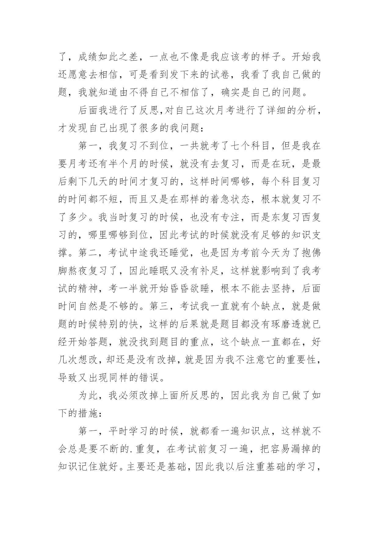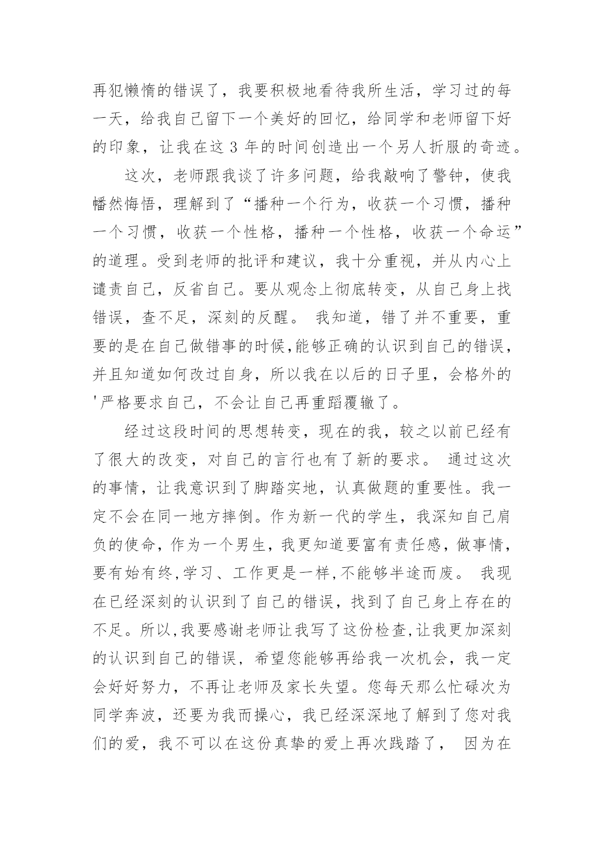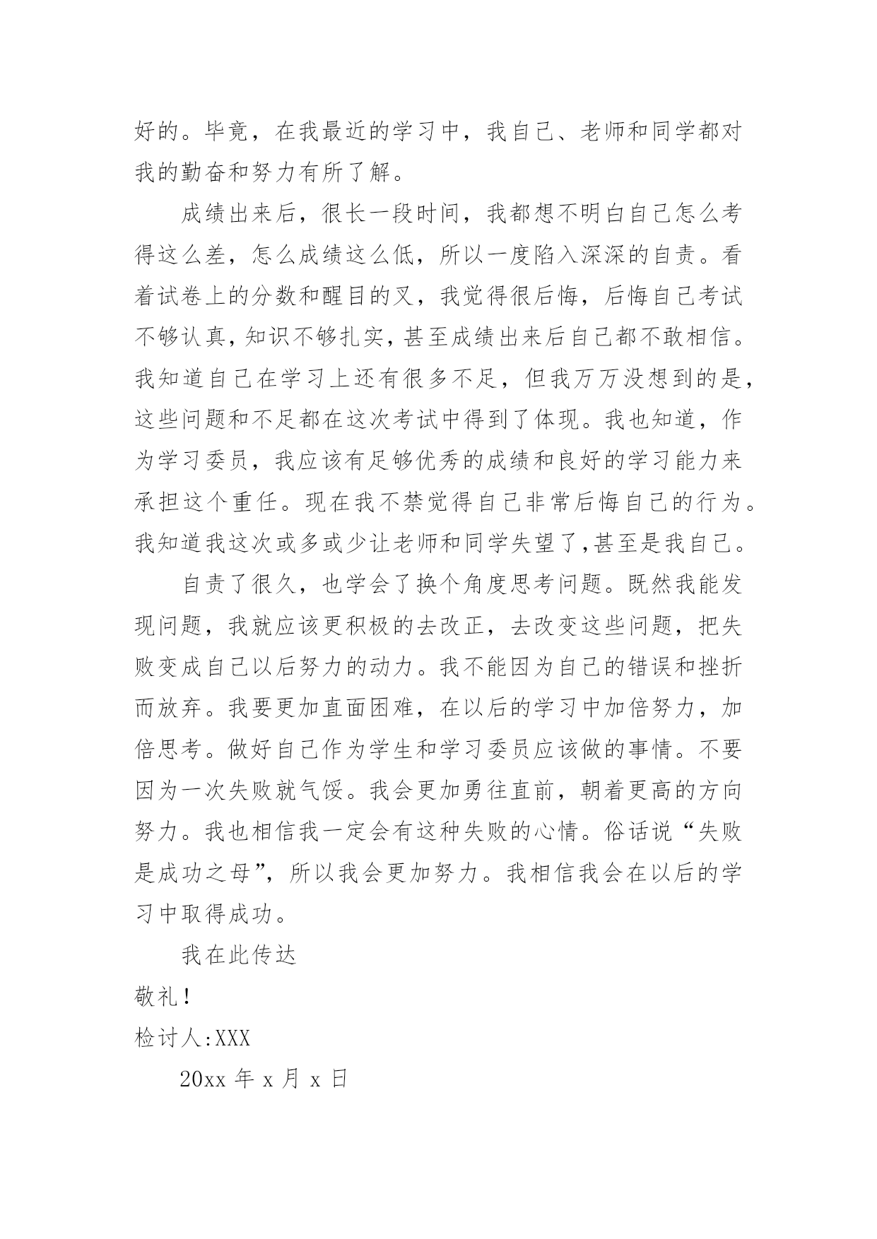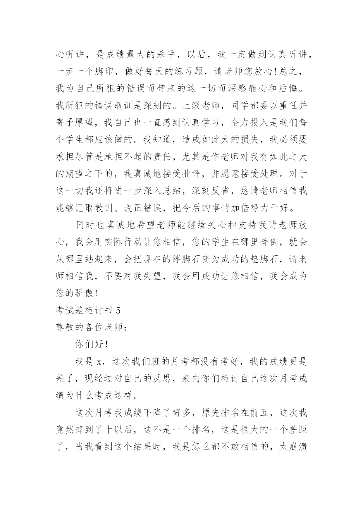 考试差检讨书考试差检讨书15篇在有过错的情况下,为了避免再犯,往往被要求写检讨书来自我检讨,做事不能马虎,写检讨书也应如此。那么问题来了,到底应如何写检讨书呢?下面是小编整理的考试差检讨书,欢迎大家分享。考试差检讨书1尊敬的老师:关于此次数学考试不及格的问题,我在此递交数学考试不及格的检讨书,由此来深刻反省我的错误,向您做出如实保证,并且提出诚恳改正措施,最大程度地弥补错误。回顾错误经过,我在上一阶段数学学习的过程中出现了严重的厌学问题,有一段时间,数学课几乎没有认真地听,导致多门课程的知识点没有掌握。最终导致了此次单元数学考试不及格,得到了全班最低分。面对错误,我感到羞愧万分,此次错误充分地暴露出我思想上存在着放松、懈怠自己的诸多问题。林林总总的问题,归根结底还是我不够成熟,没有充分意识到学习数学的重要性。特此,我向您保证:1,我今后一定提高自己对于数学这门学科的`充分认识,用心提高自身学习素质,做到不偏学不偏科,不懈怠学习。2,我一定用心进去,认真学习数学,提高数学成绩,争取在下阶段数学考试当中取得好成绩。3,我必须充分地以此次错误为戒,反省自己,重新定位自身,争取早日成为一名德智体美劳全面发展的好学生。总结,我愿意接受大家的监督!此致敬礼检讨者:xxxxxx年xx月xx日考试差检讨书2亲爱的老师:今天,我怀着愧疚的心情,写下这份检查.以向您表示我的决心和悔改之意,只希望老师能够给我一个改正错误的机会。以前我没有意识到自己的散漫和无知,上课总是不认真听讲,导致我考试没考好。我知道,错了并不重要,重要的是在自己做错事的时候,能够正确的认识到自己的错误,并且知道如何改过自身,所以我在以后的日子里,会格外的严格要求自己。我现在已经深刻的认识到了自己的错误,找到了自己身上存在的不足。所以,我要感谢老师让我写了这份检查,让我更加深刻的'认识到自己的错误,希望老师能够再给我一次机会,我一定会好好努力,不再让老师及家长失望。请老师看我的实际行动吧,我会努力学习的。检讨人:20xx年xx月xx日考试差检讨书3亲爱的老师、父母:今天,我们考了数学期中测试,我只得了97分,是我这学期数学考得最差的一次,如果不算这次,那么我的最低分才98分。做完了试卷,我依然和以前一样,认真检查试卷,检查出来了一个错误,我自认为我应该没错误了,才不再进行第二次检查。试卷发下去后,我发现,我的一个只写算式,不求答案的'题错了,所以减了三分,得了个97。做错这道题的原因就是粗心大意,本来我应该用单位一减去这两天用这些沙子的几分之几,而我却因为看题太快,所以想成了用两吨沙子乘以第一天用这些沙子的几分之几,再加上两吨沙子乘以第二天用这些沙子的几分之几,所以被画上了一个大大的问号。这次数学考试我考的很不理想,下一次我一定要更加努力,再考出一个100分!此致敬礼!检讨人:xxx20xx年xx月xx日考试差检讨书4尊敬的老师:在以前的学习中,我没有认真努力,这次没考好,现在想起来非常后悔,今天,我怀着愧疚和懊悔的心情,写下这份检查.以向您表示我的决心和悔改之意,只希望您能够给我一个改正错误的机会。谢谢您。以前我没有意识到自己的散漫和无知,对于数学和物理这种需要大量做题的学科,总是抱有偷懒心理。以至于最终引火自焚,导致了这种恶果。不但对不起父母和老师,更在同学中间成为了反面教材.也是对初2X班的一种不责任的表现.另外还让老师经常担心。我已深深地认识到了自己的错误,作为初中生,我没有意识到自己已经是个15岁的大孩子了,非但没有帮老师、家长分担压力,反而给他们找了很多没必要的麻烦,我感觉到很后悔,我是班里学习较好男生中的一个,而我非但没有给别的同学一个认真学习的感觉却给同学留下了不认真做题,不踏实的感觉,我觉得自己欠缺集体荣誉感,我从哪跌倒就从哪爬起来,绝对不在同一个地点再跌倒第2次,努力坚持,让自己按时按质完成作业,每天认真听讲,大量做题,踏踏实实学习。脚踏实地,争取下次考试取得好的成绩,以优异的成绩来汇报曾经为我做过无数付出的?老师和我的父母,我会让您们看到一个全新的我,一个遵规守纪,尊重师长,按时完成作业,认真听讲,大量做题,踏踏实实学习。脚踏实地的初中生,一切跟着大家走,坚决不做个别生。所以我不可以再犯懒惰的错误了,我要积极地看待我所生活,学习过的每一天,给我自己留下一个美好的回忆,给同学和老师留下好的印象,让我在这3年的时间创造出一个另人折服的奇迹。这次,老师跟我谈了许多问题,给我敲响了警钟,使我幡然悔悟,理解到了“播种一个行为,收获一个习惯,播种一个习惯,收获一个性格,播种一个性格,收获一个命运”的道理。受到老师的批评和建议,我十分重视,并从内心上谴责自己,反省自己。要从观念上彻底转变,从自己身上找错误,查不足,深刻的反醒。我知道,错了并不重要,重要的是在自己做错